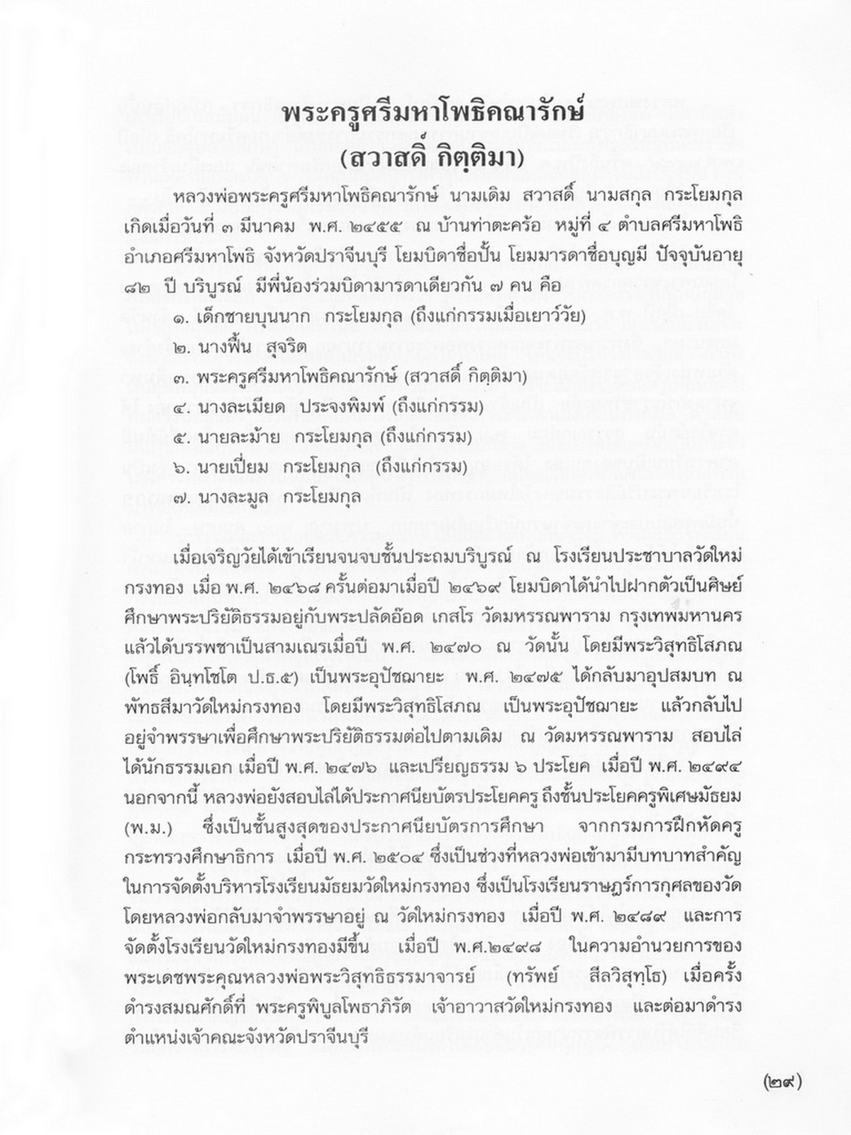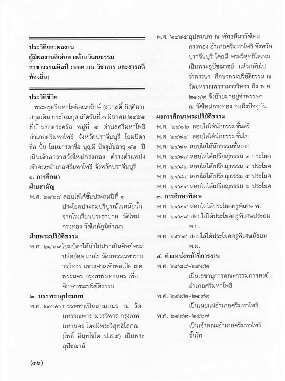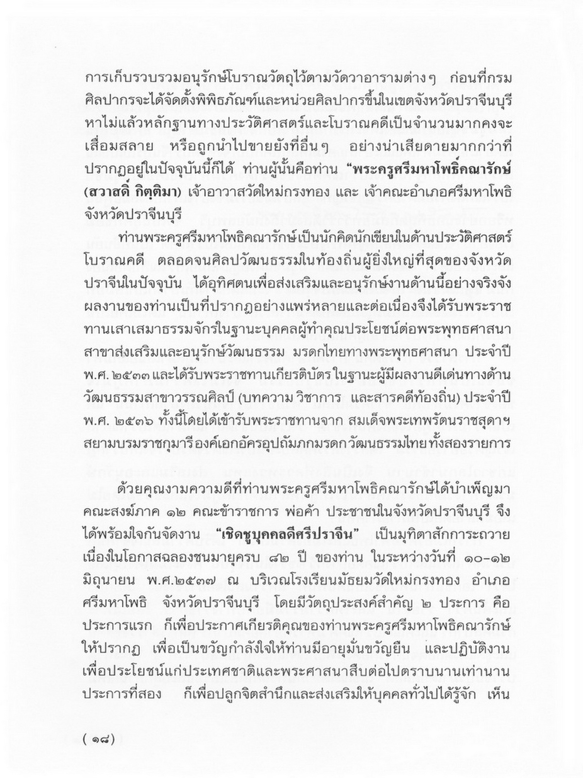 - คณะกรรมการจัดงาน"เชิดชูบุคคลดีศรีปราจีน" จัดพิมพเป็นมุทิตาสักการะเนื่องในโอกาสฉลองชนมายุครบ 82ปีพระครูศรีมหาโพธิคณารักษ์(สวาสดิ์ กิต.ติมา) วันที่ 10-12 มิถุนายน 2537.