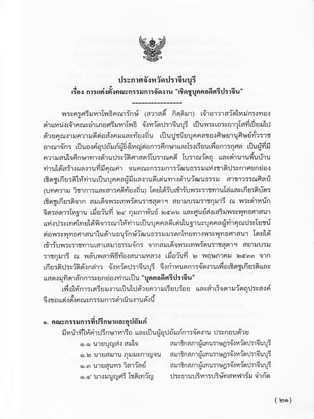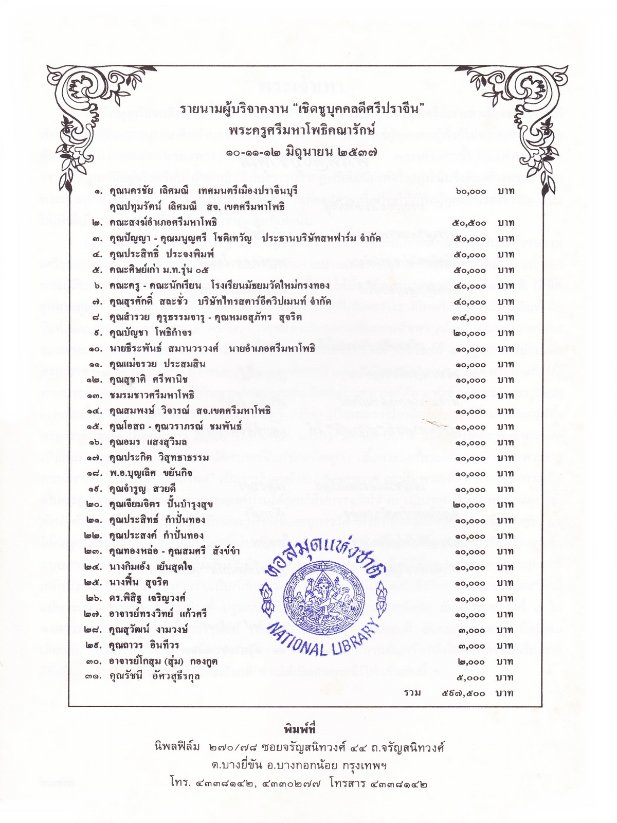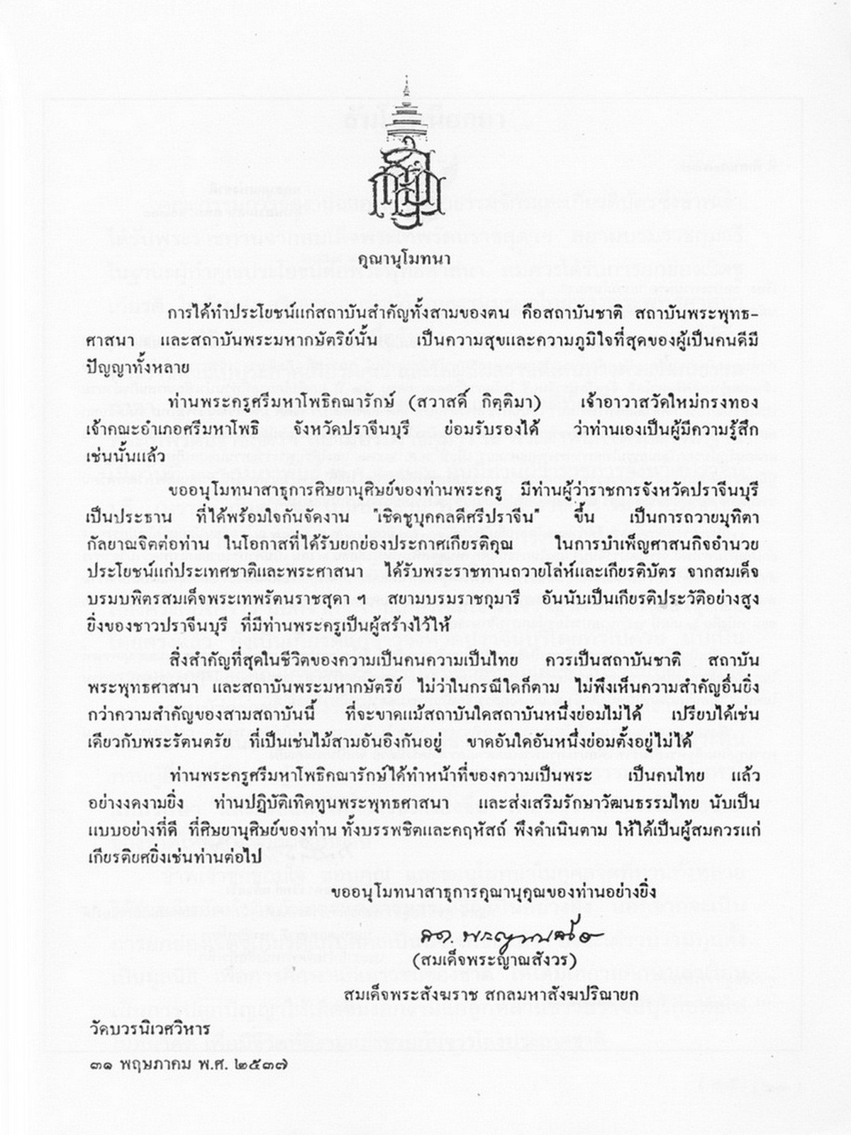 - คณะกรรมการจัดงาน"เชิดชูบุคคลดีศรีปราจีน" จัดพิมพเป็นมุทิตาสักการะเนื่องในโอกาสฉลองชนมายุครบ 82ปีพระครูศรีมหาโพธิคณารักษ์(สวาสดิ์ กิต.ติมา) วันที่ 10-12 มิถุนายน 2537.