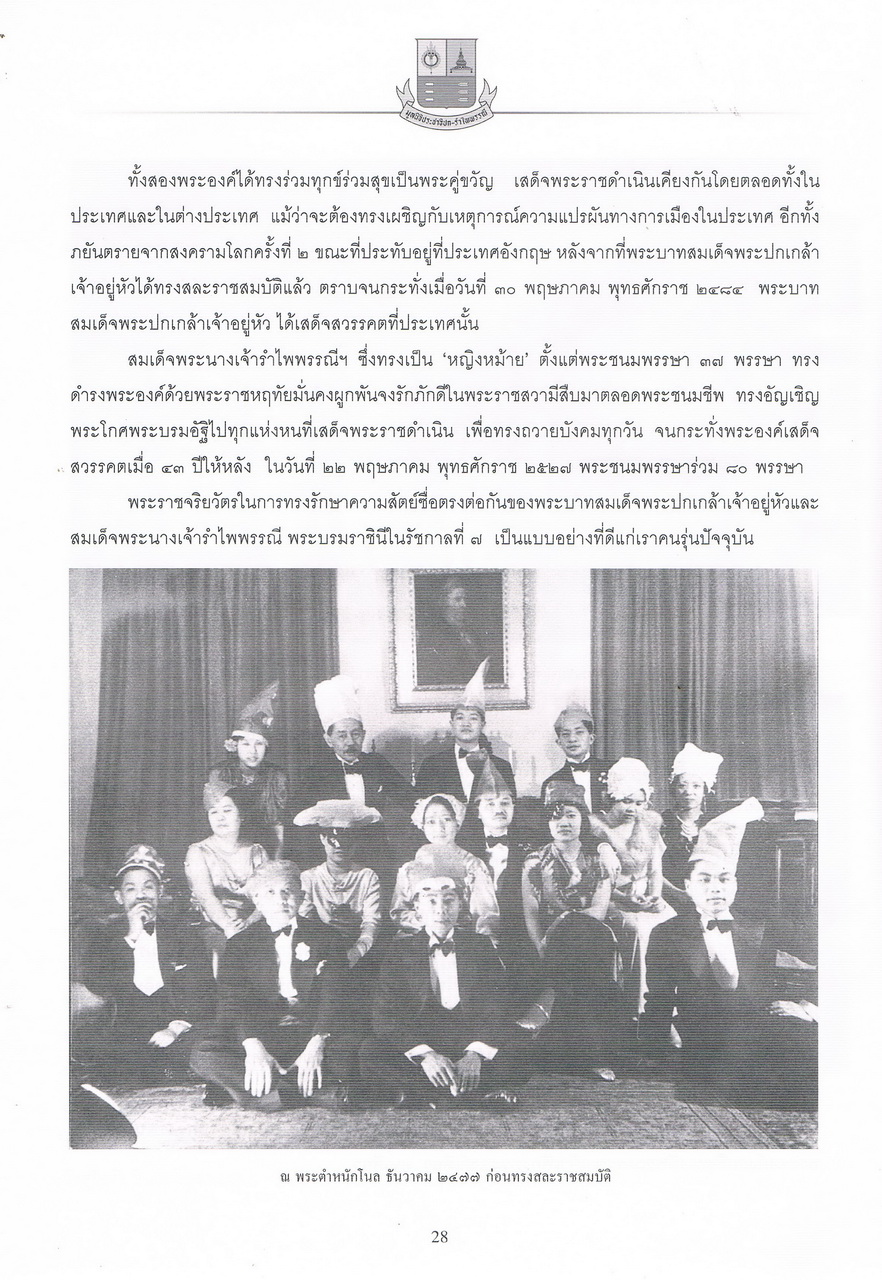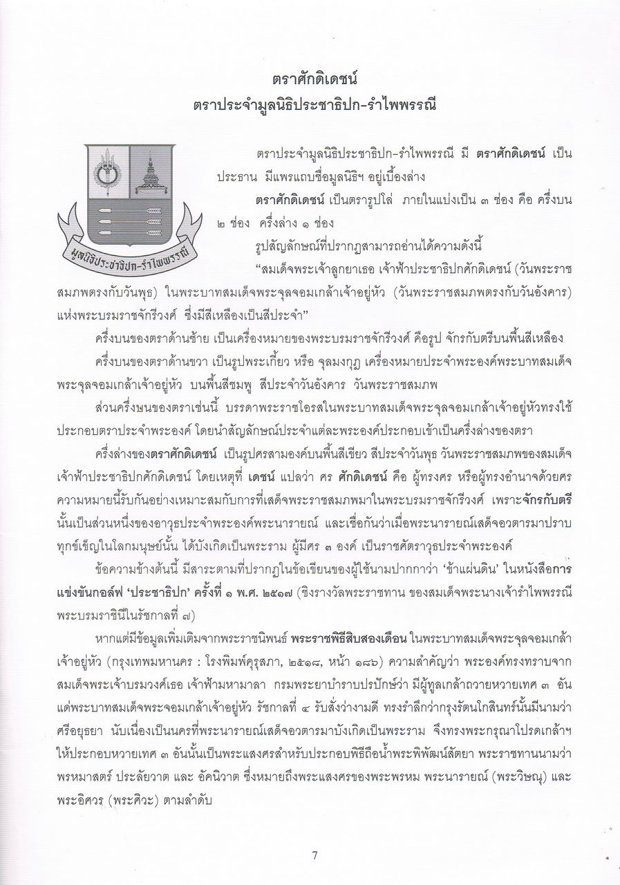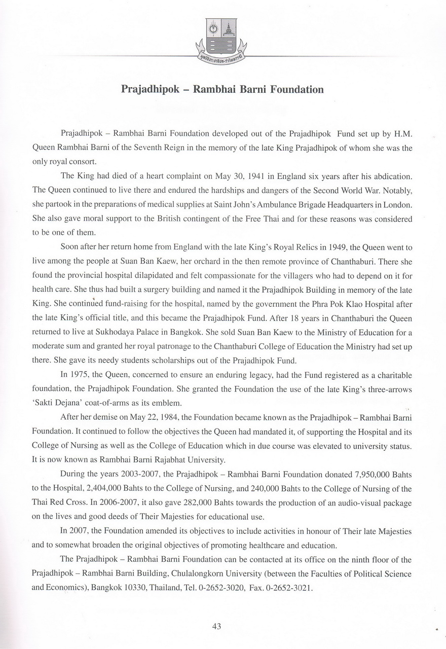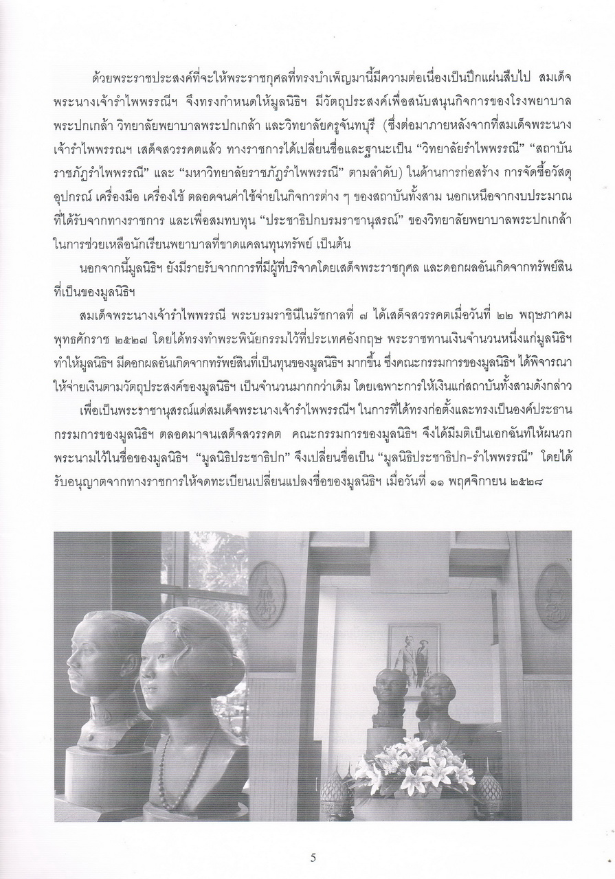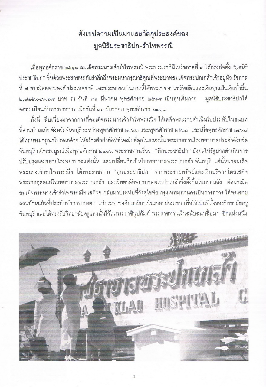 - เป็นหนังสือที่ให้ข้อมูลของมูลนิธิประชาธิปก-รำไพพรรณี โดยเริ่มด้วยเรื่องความเป็นมาและกิจกรรมปี 2546-2550 วัตถุประสงค์ เครื่องหมายของมูลนิธิ รายงานกิจกรรมของมูลนิธิฯ และสุดท้ายเป็นเรื่องเกี่ยวกับพระราชประวัติ พระราชกรณียกิจ และพระเกียรติคุณของพระบาทสมเด็จพระปกเกล้าเจ้าอยู่หัวและสมเด็จพระนางเจ้ารำไพพรรณี พระบรมราชินีในรัชกาลที่ 7
