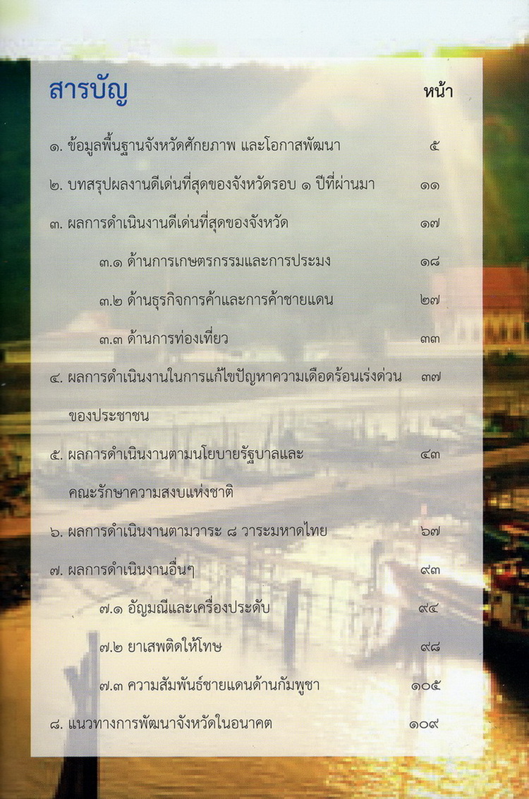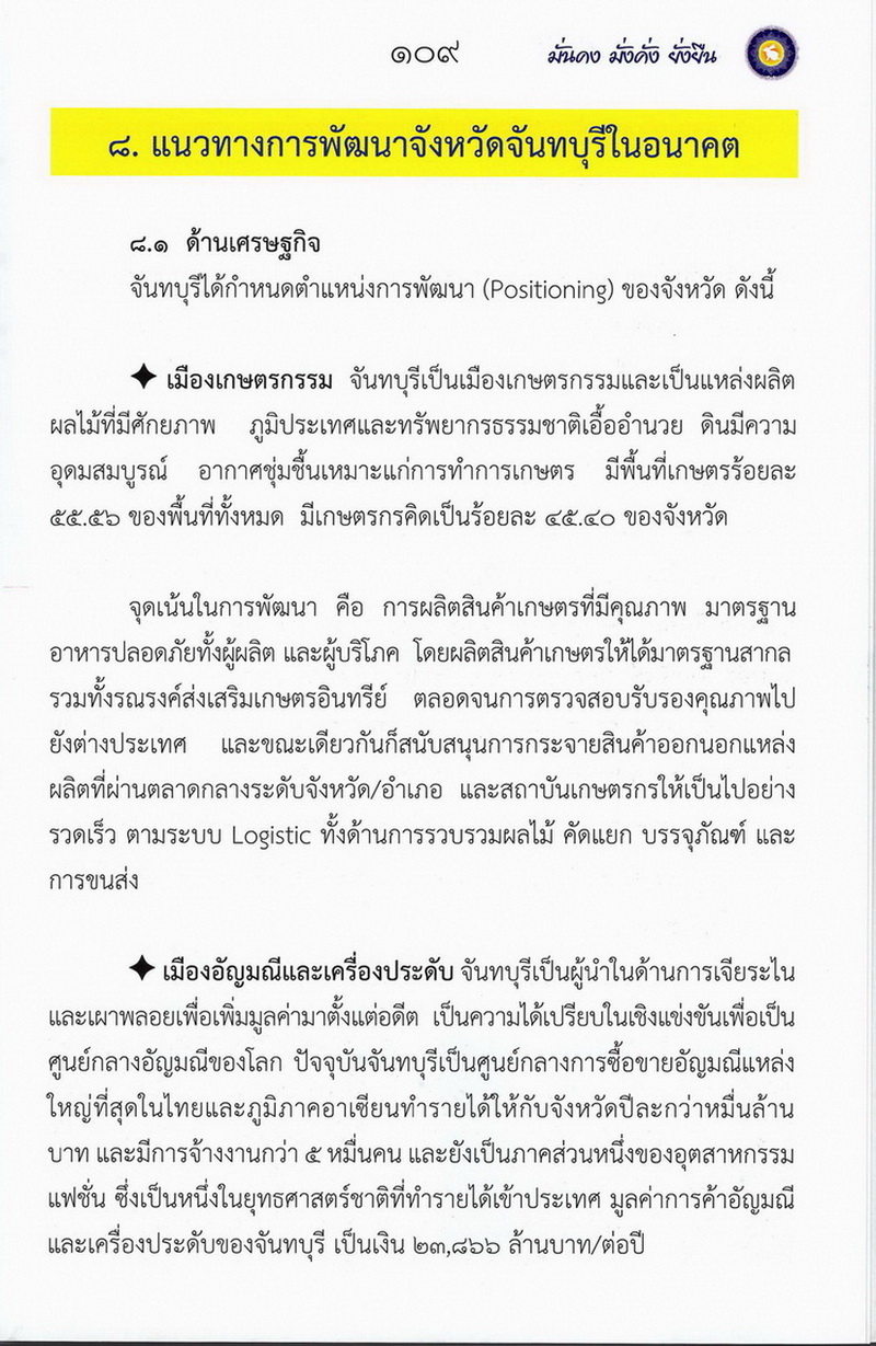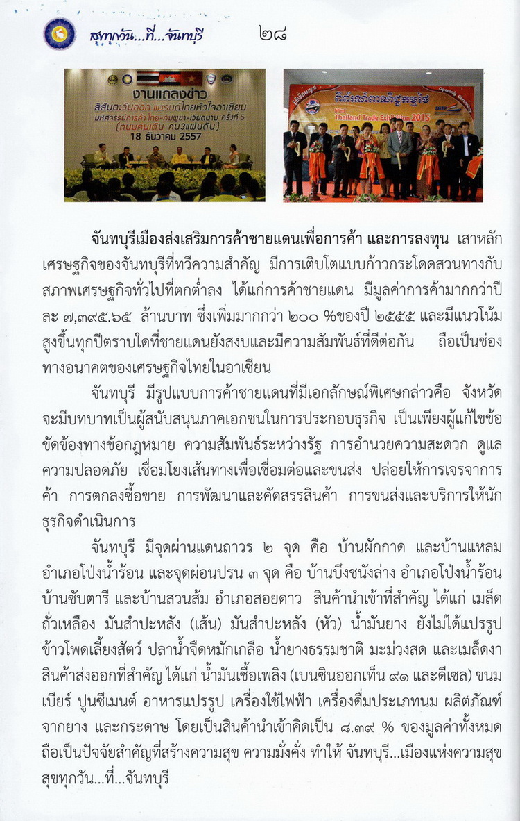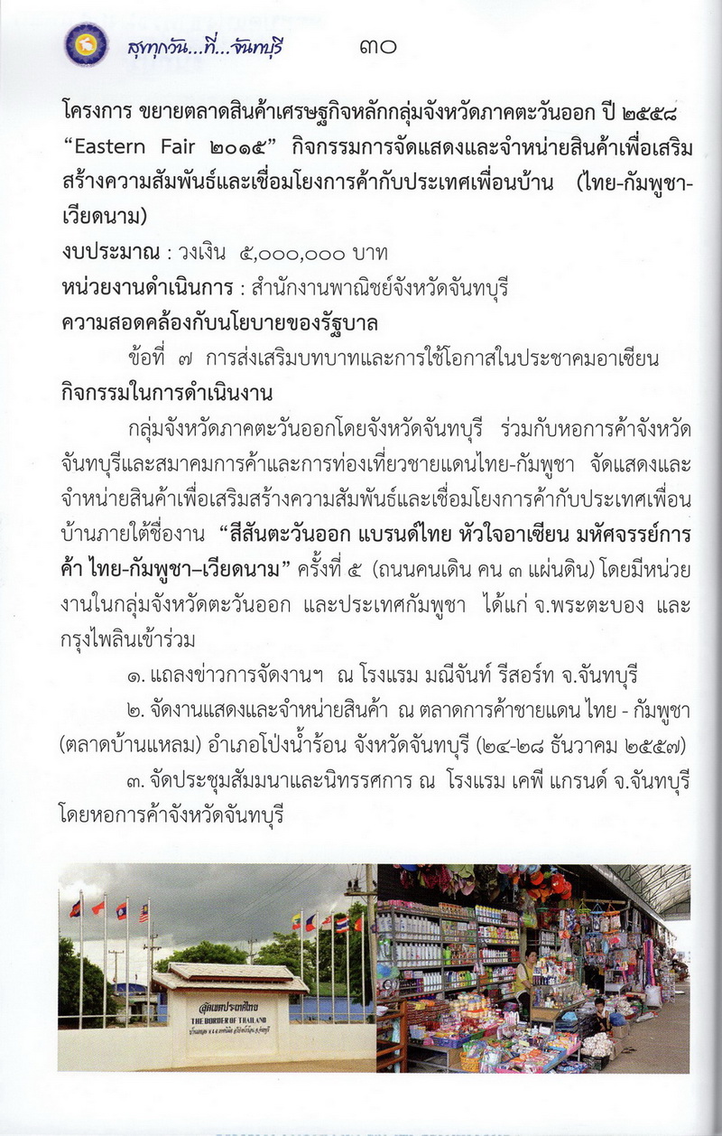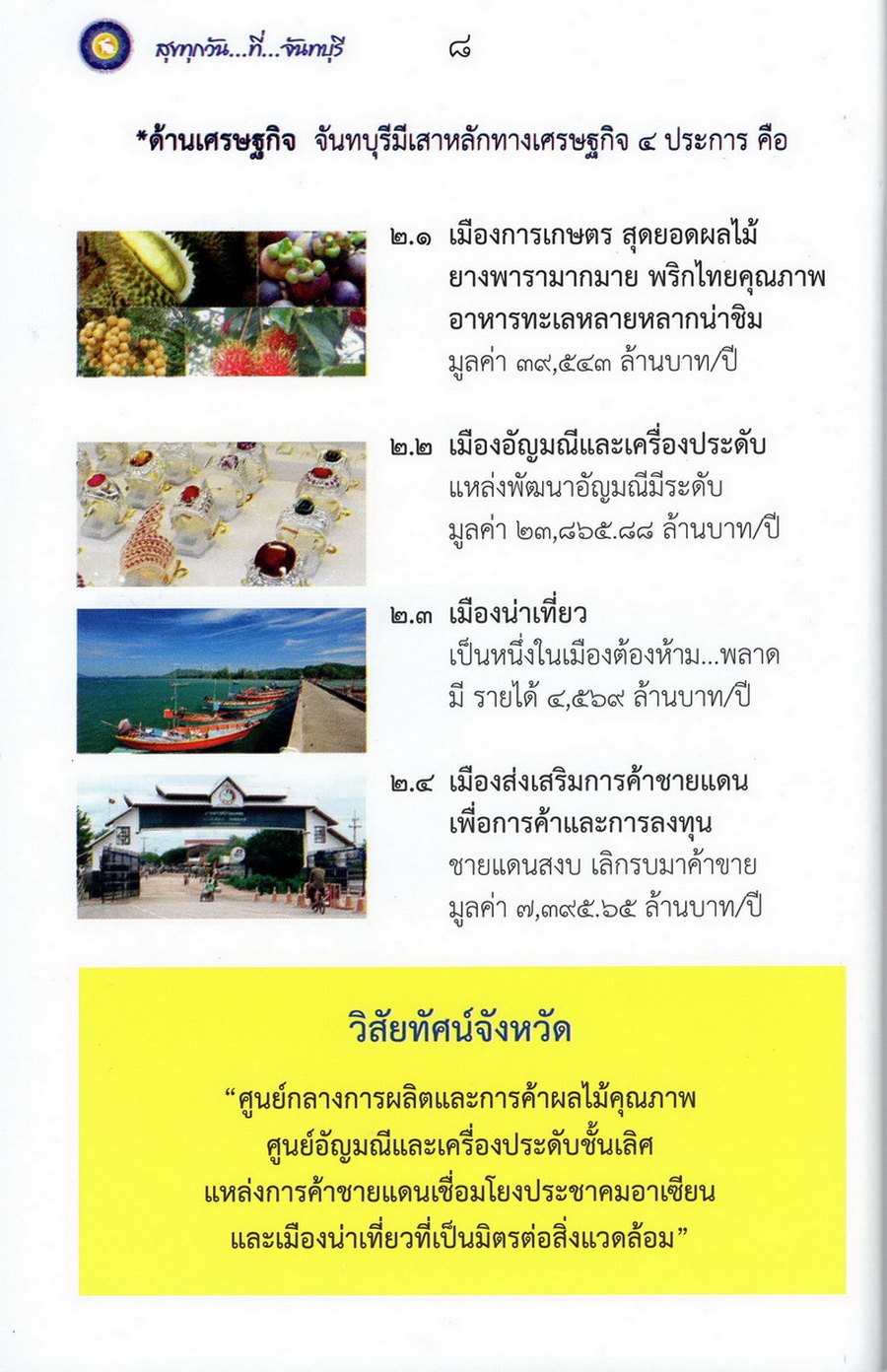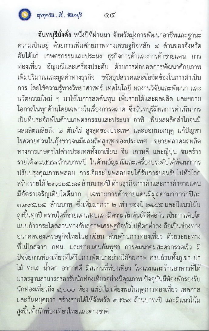 - เป็นหนังสือที่ให้ข้อมูลเกี่ยวกับจังหวัดจันทบุรีในรอบปีที่ผ่านมา (กันยายน 2557 - สิงหาคม 2558) ในด้านคุณภาพชีวิต เศรษฐกิจ ความมั่นคงปลอดภัย ความเป็นอยู่ การเกษตร การท่องเที่ยว อัญมณี และเครื่องประดับ ธุรกิจการค้าและการค้าชายแดน