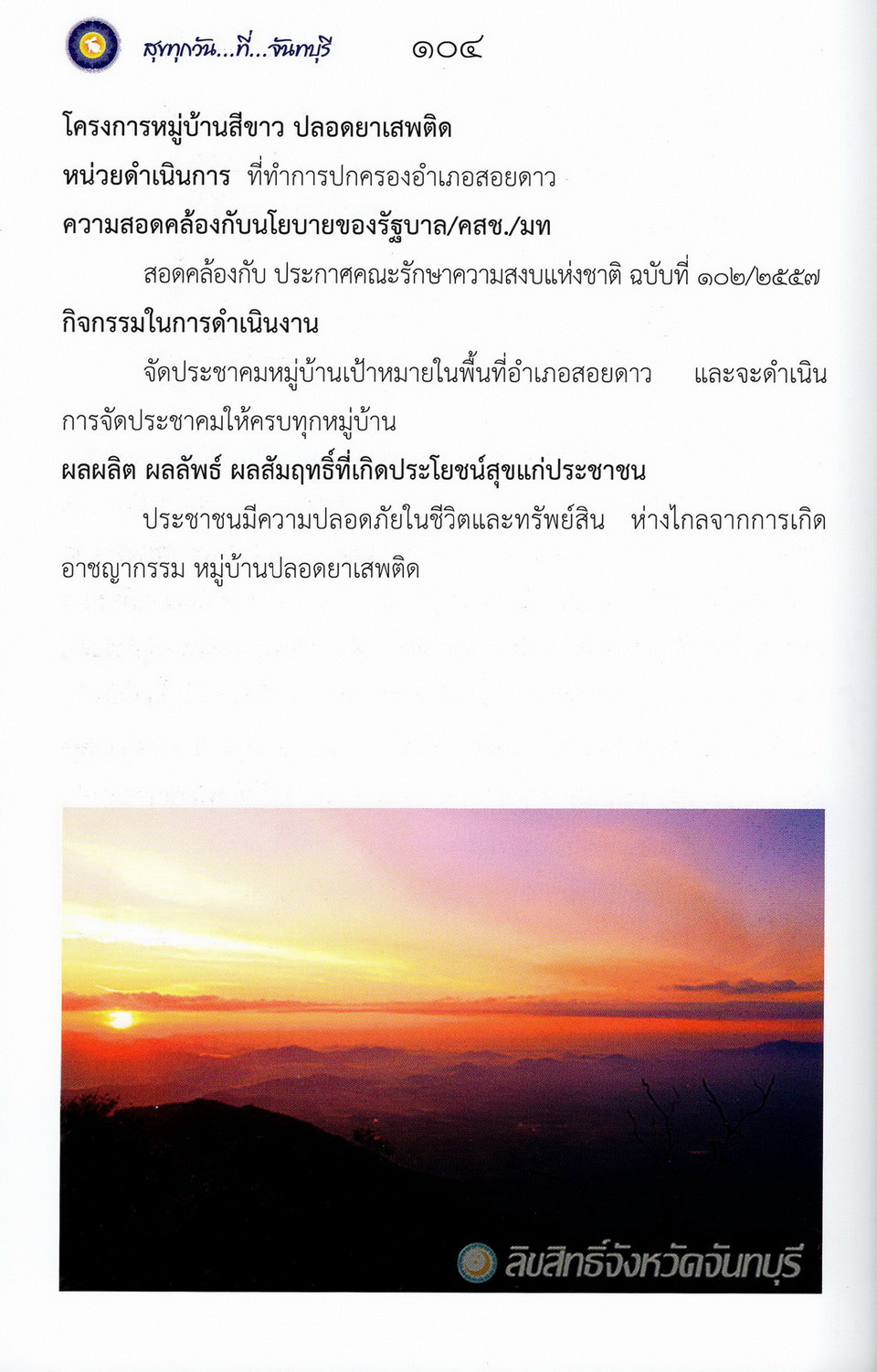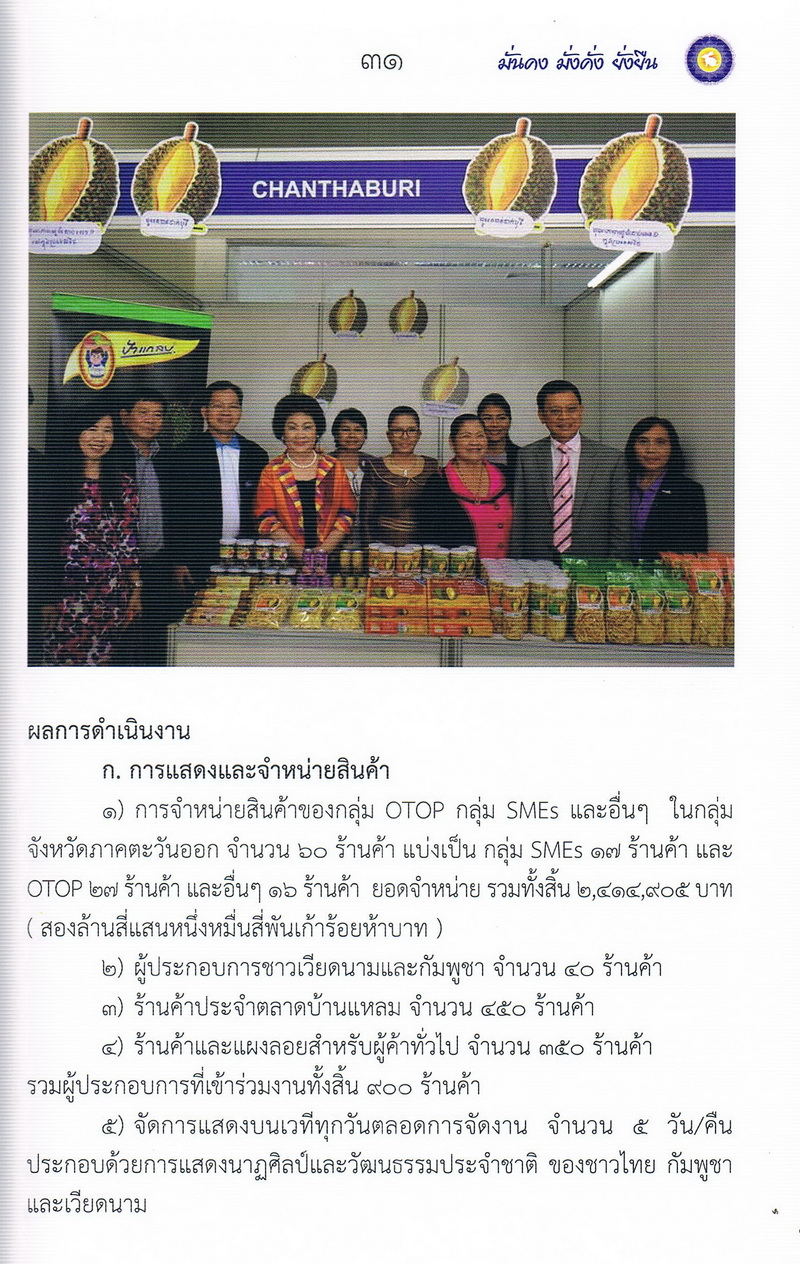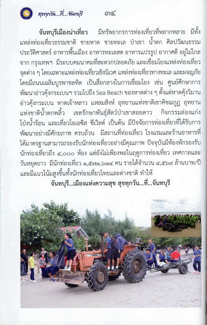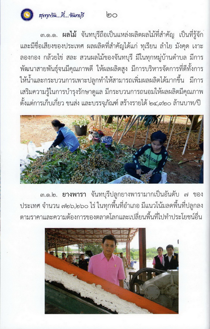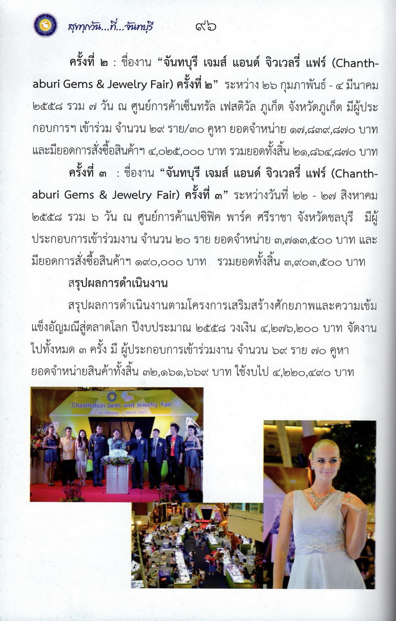 - เป็นหนังสือที่ให้ข้อมูลเกี่ยวกับจังหวัดจันทบุรีในรอบปีที่ผ่านมา (กันยายน 2557 - สิงหาคม 2558) ในด้านคุณภาพชีวิต เศรษฐกิจ ความมั่นคงปลอดภัย ความเป็นอยู่ การเกษตร การท่องเที่ยว อัญมณี และเครื่องประดับ ธุรกิจการค้าและการค้าชายแดน