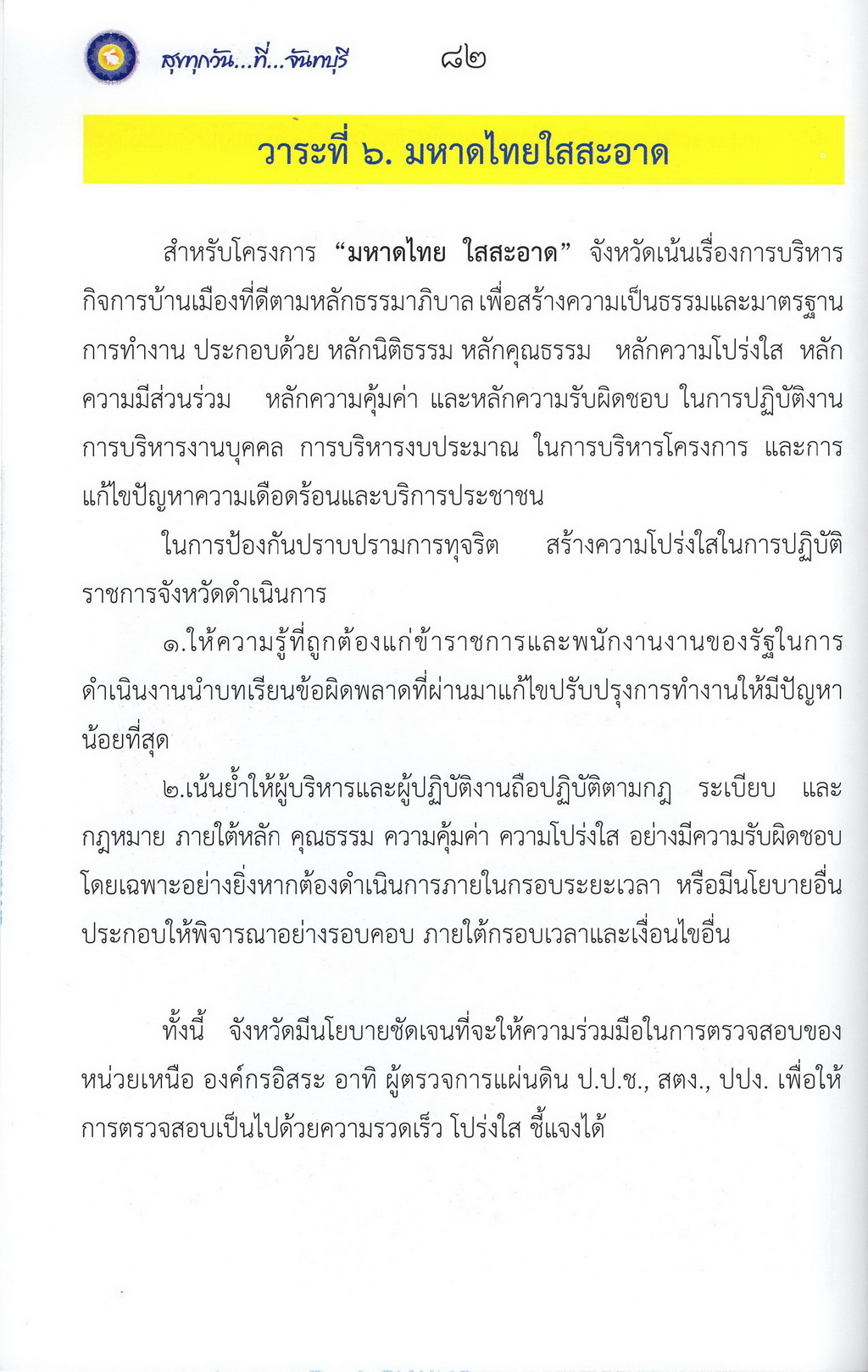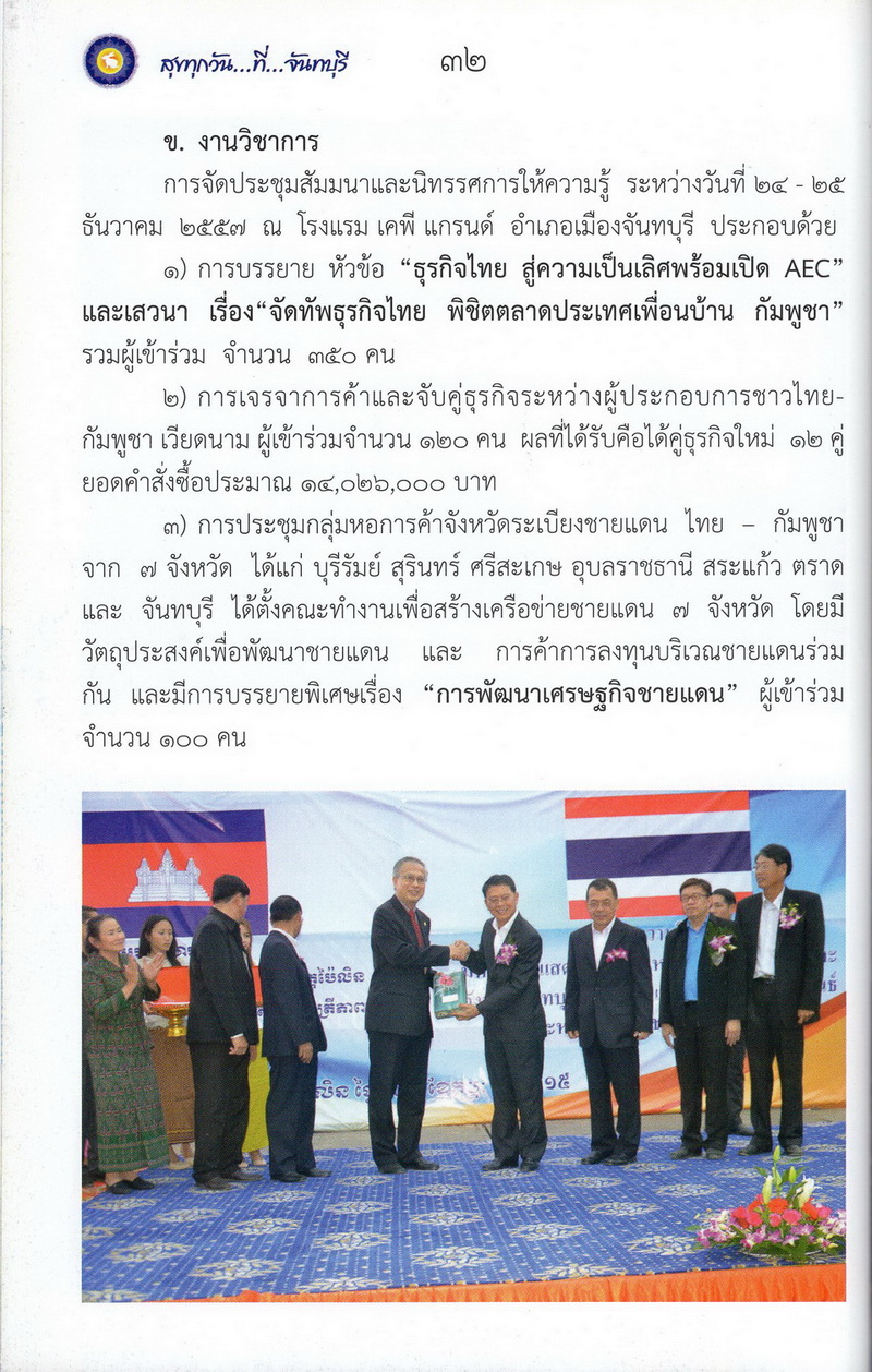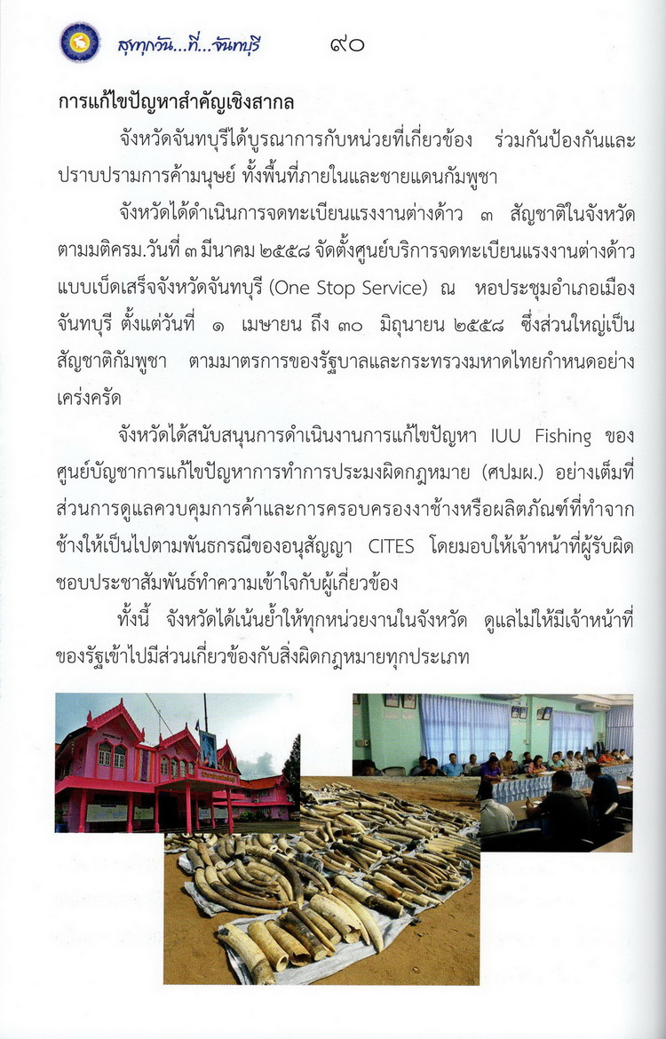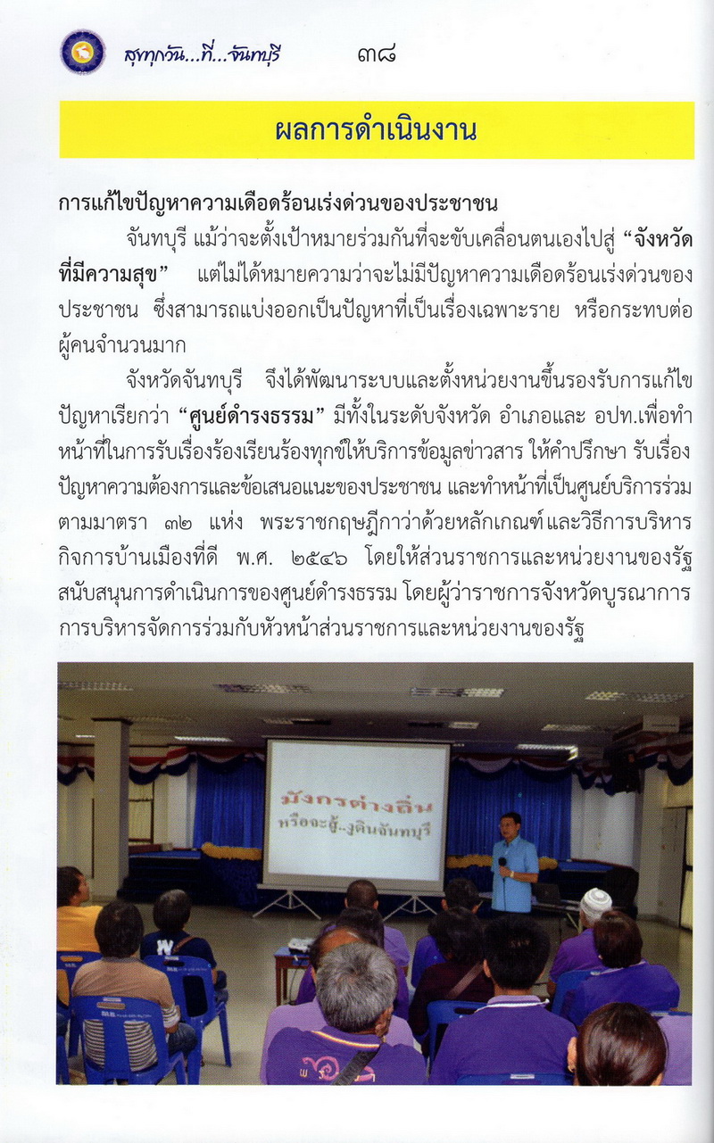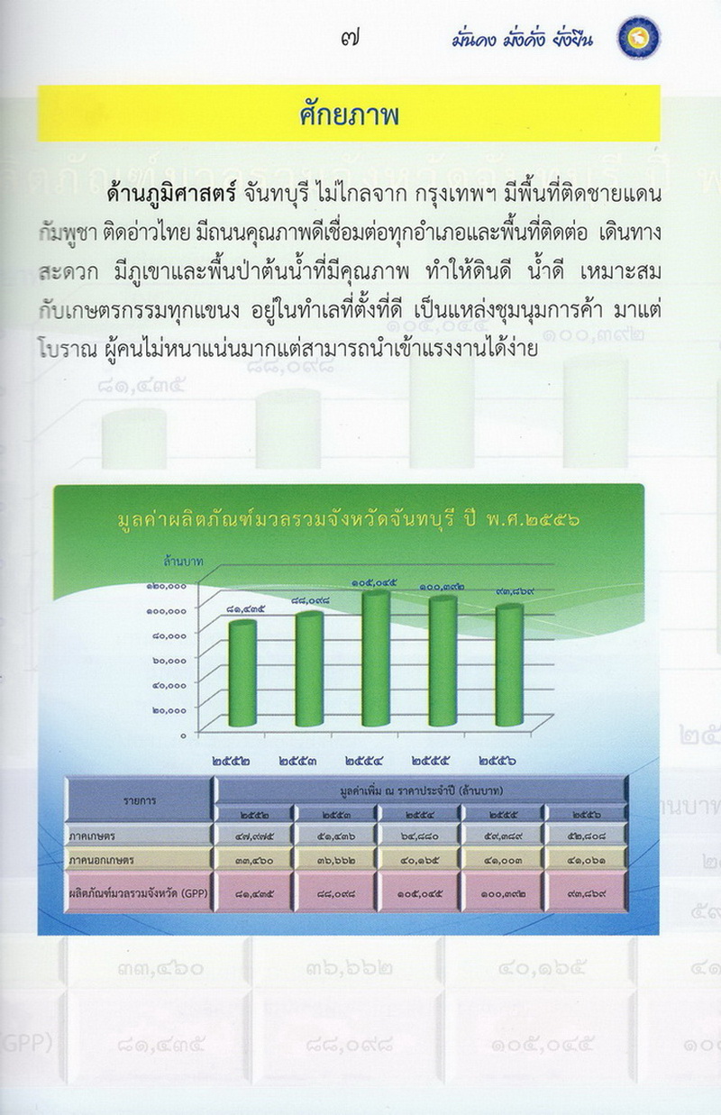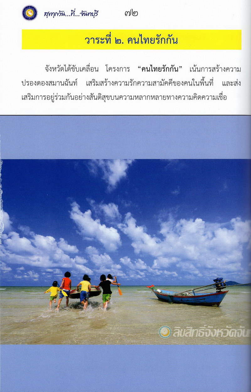 - เป็นหนังสือที่ให้ข้อมูลเกี่ยวกับจังหวัดจันทบุรีในรอบปีที่ผ่านมา (กันยายน 2557 - สิงหาคม 2558) ในด้านคุณภาพชีวิต เศรษฐกิจ ความมั่นคงปลอดภัย ความเป็นอยู่ การเกษตร การท่องเที่ยว อัญมณี และเครื่องประดับ ธุรกิจการค้าและการค้าชายแดน