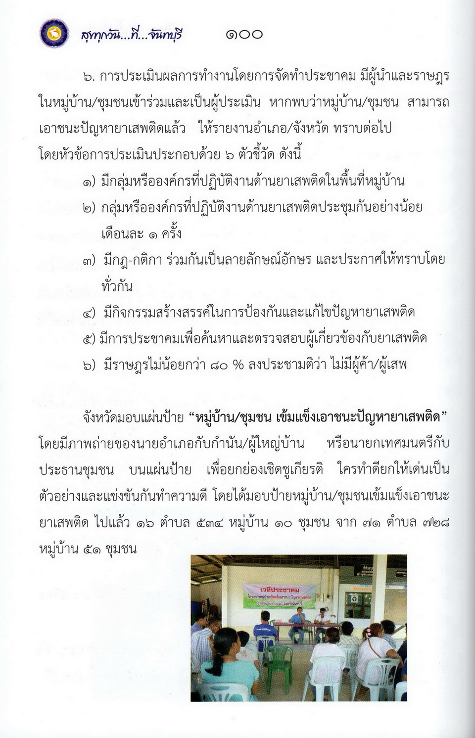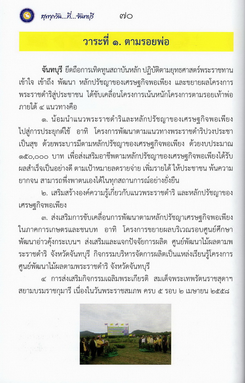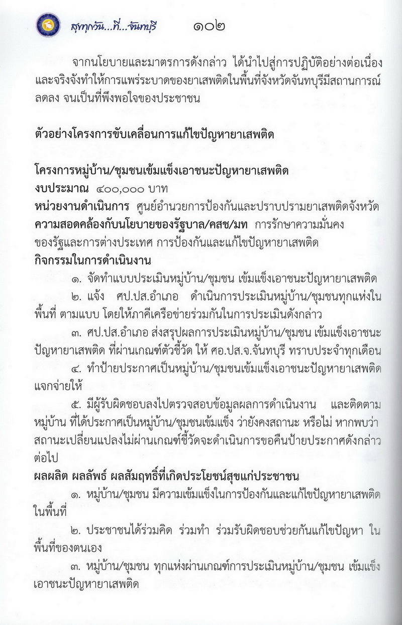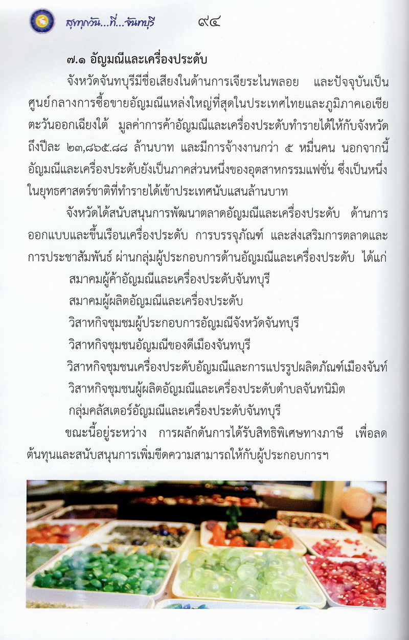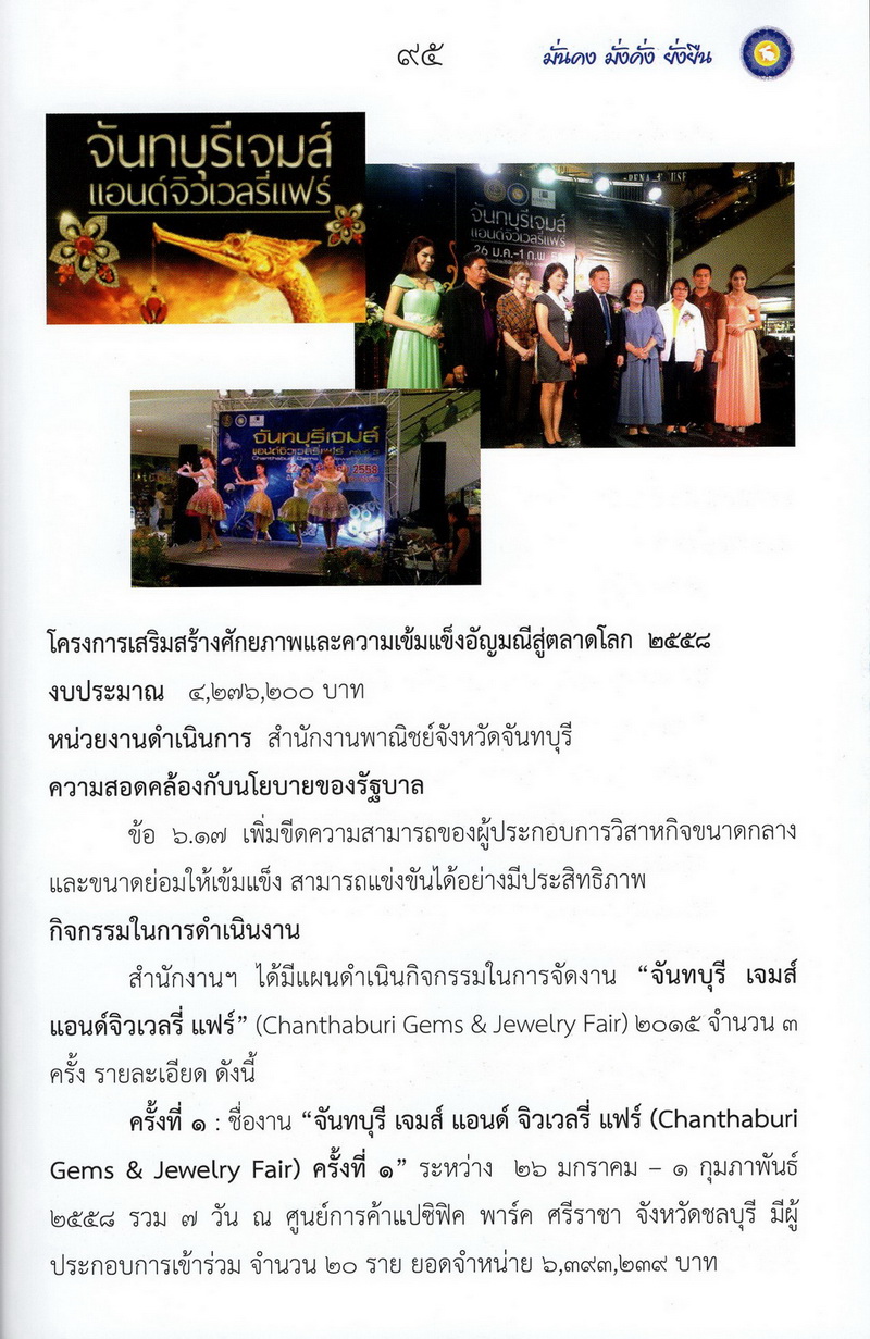- เป็นหนังสือที่ให้ข้อมูลเกี่ยวกับจังหวัดจันทบุรีในรอบปีที่ผ่านมา (กันยายน 2557 - สิงหาคม 2558) ในด้านคุณภาพชีวิต เศรษฐกิจ ความมั่นคงปลอดภัย ความเป็นอยู่ การเกษตร การท่องเที่ยว อัญมณี และเครื่องประดับ ธุรกิจการค้าและการค้าชายแดน