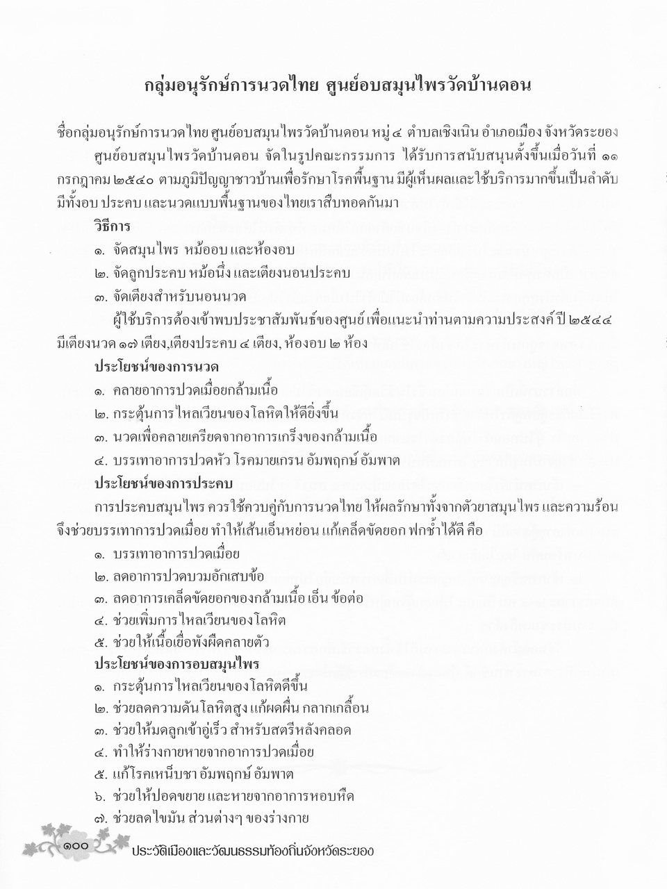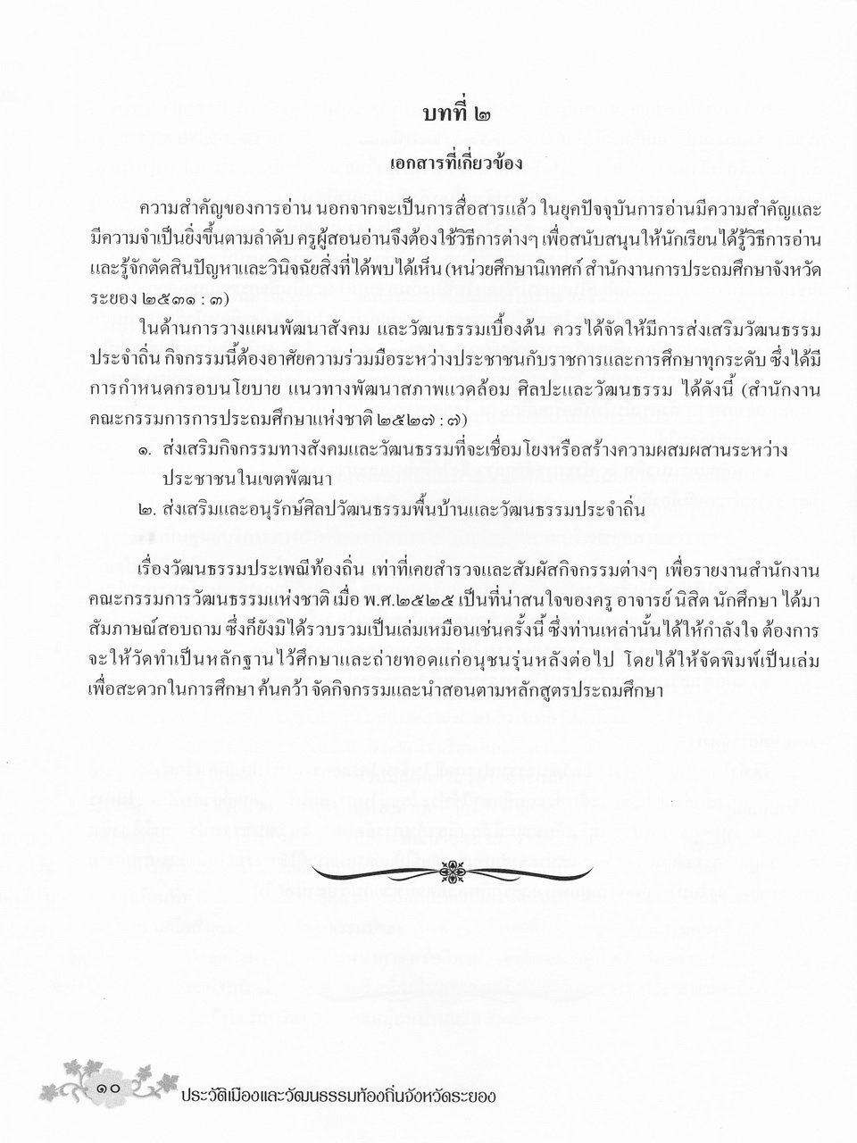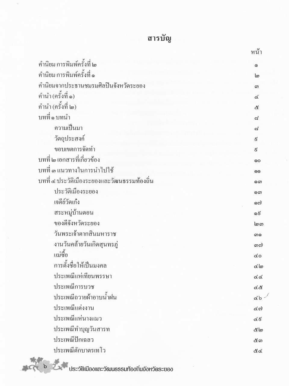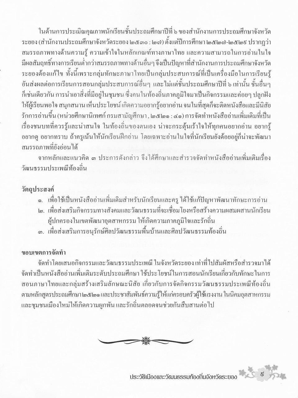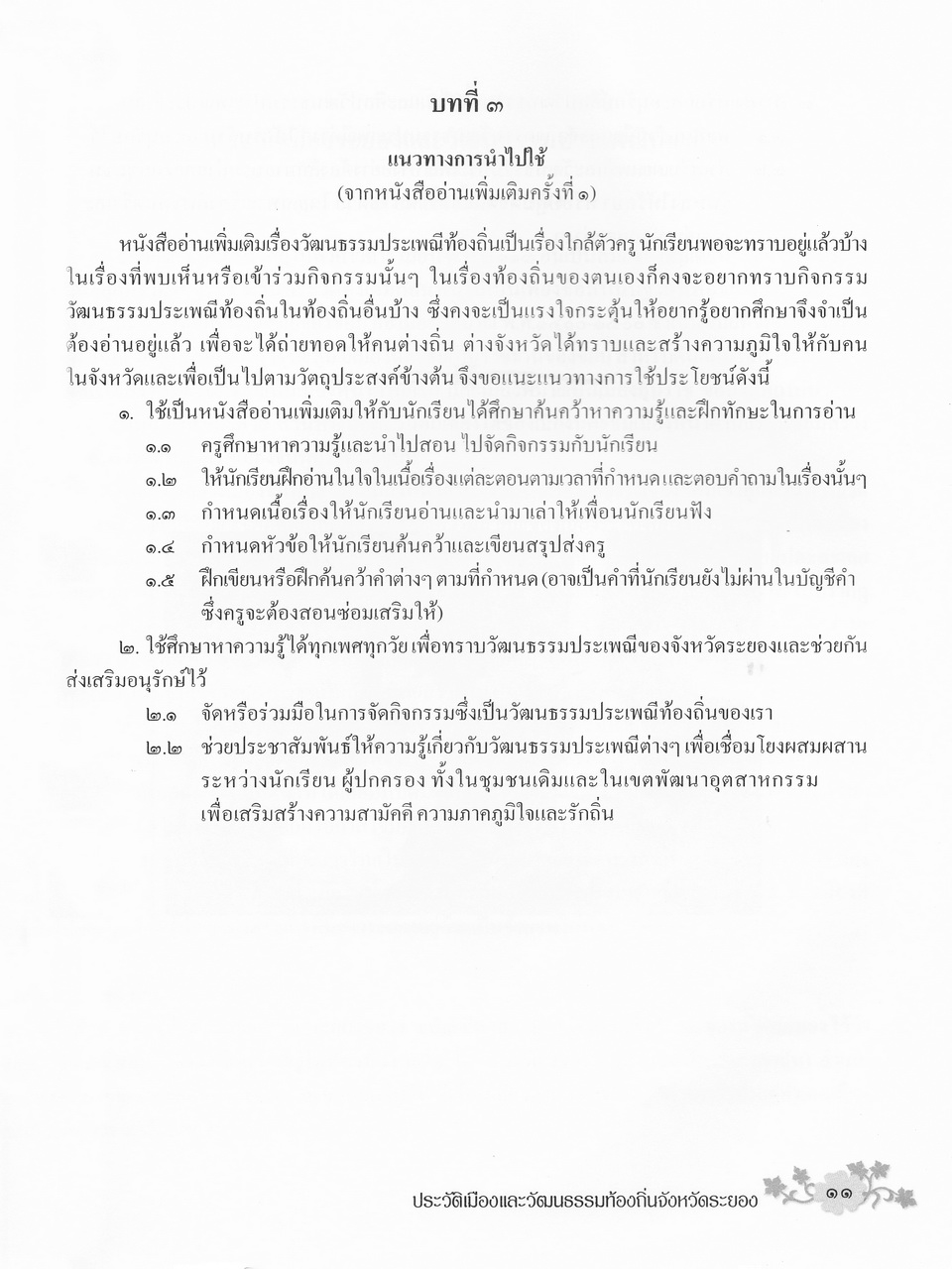 - เนื้อหาแบ่งออกเป็น 4 บท คื่อ บทที่1 บทนำ บทที่2 เอกสารที่เกี่ยวข้อง บทที่3 แนวทางในการนำไปใช้ และบทที่4 ประวัติเมืองระยองและวัฒนธรรมท้องถิ่น