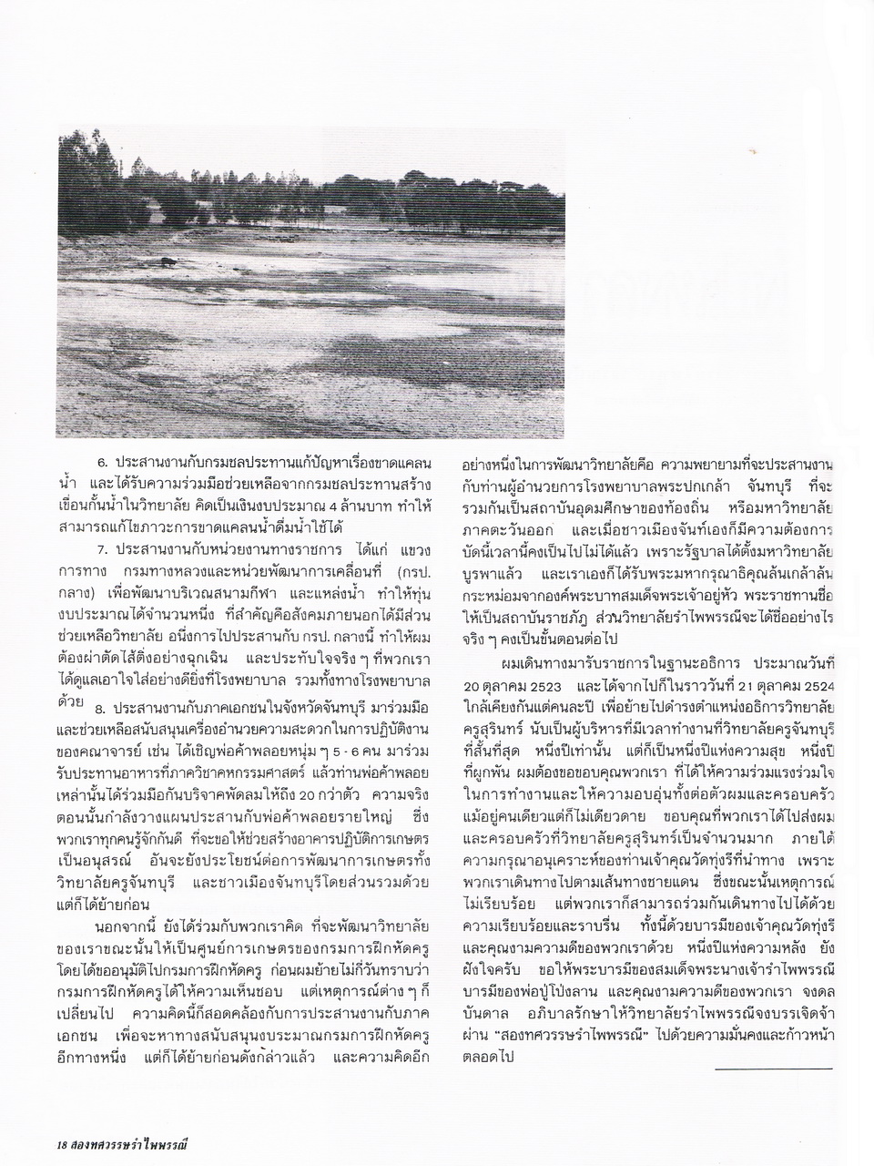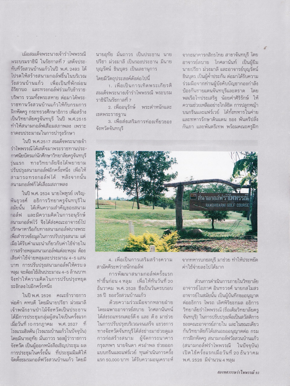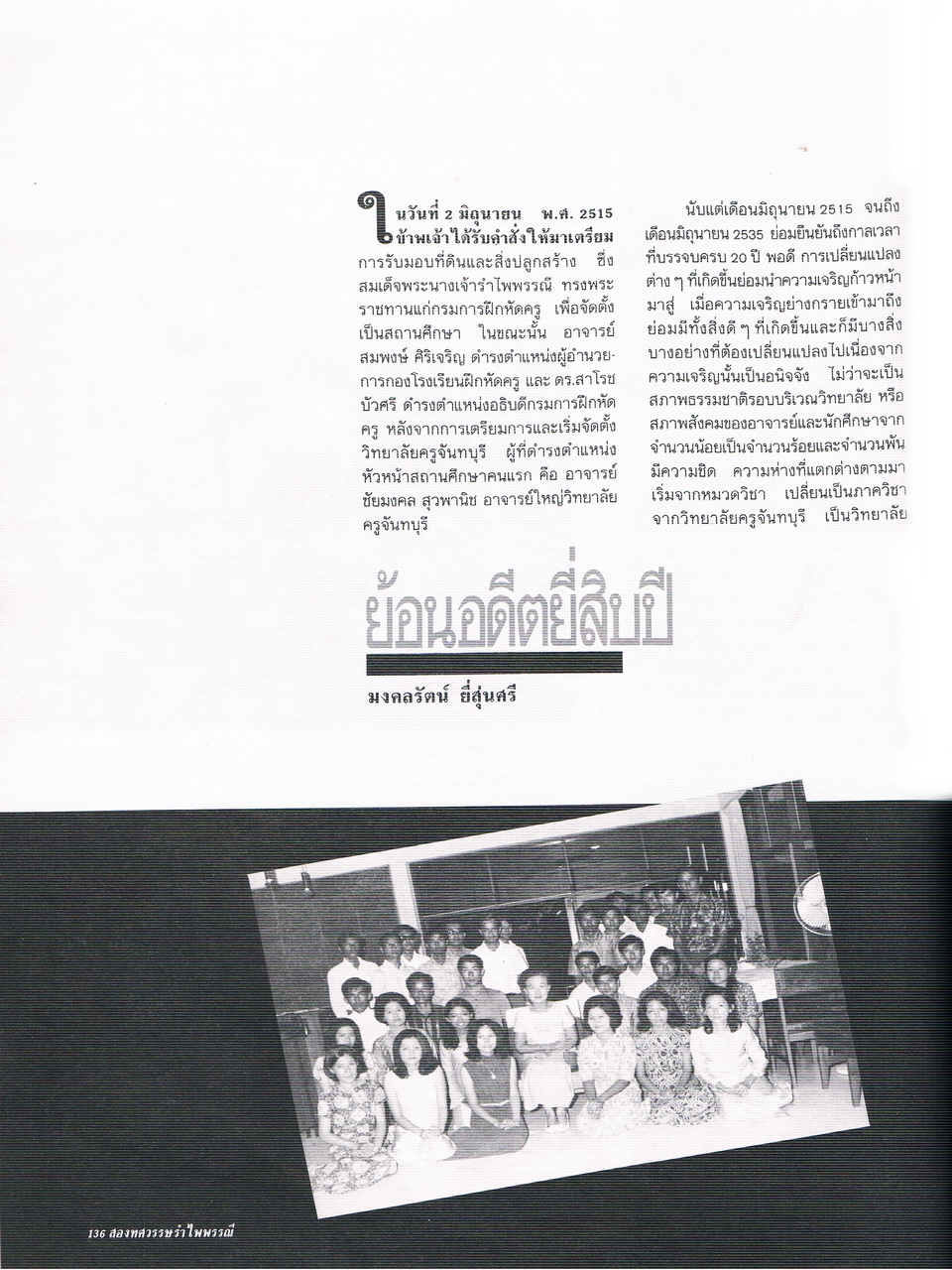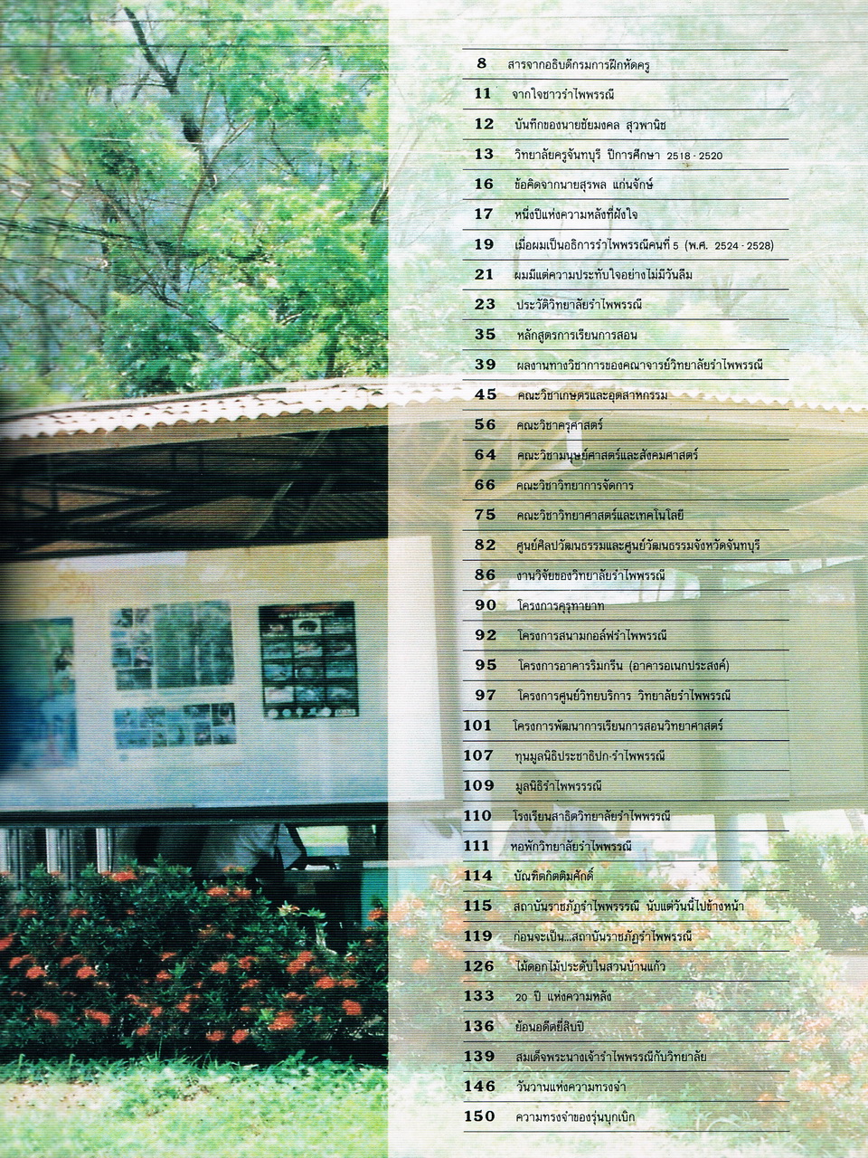 - มีเนื้อหาหลากหลายได้แก่สารจากอธิบดีกรมการฝึกหัดครู จากใจชาวรำไพพรรณี บันทึกของนายชัยมงคล สุวพานิช วิทยาลัยครูจันทบุรี ปีการศึกษา2518-2520 ข้อคิดจากนายสุรพล แก่นจักษ์ หนึ่งปีแห่งความหลังที่ฝั่งใจ เมื่อผมเป็นอธิการบดีรำไพพรรณีคนที่5(2524-2528) ผมมีแต่ความประทับใจอย่างไม่มีวันลืม ประวัติวิทยาลัยรำไพพรรณี หลักสูตรการเรียนการสอน ผลงานทางวิชาการของคณาจารย์วิทยาลัยรำไพพรรณี คณะวิชาเกษตรและอุตสาหกรรม คณะวิทยาศาสตร์ คณะมนุษยศาสตร์และสังคมศาสตร์ คณะวิชาวิทยาการจัดการ คณะวิทยาศาสตร์และเทคโนโลยี ศูนย์ศิลปวัฒนธรรมและศูนย์วัฒนธรรมจังหวัดจันทบุรี งานวิจัยของวิทยาลัยรำไพพรรณี โครงการคุรุทายาท โครงการสนามกอล์ฟรำไพพรรณี โครงการอาคารริมกรีน โครงการศูนย์วิทยบริการ โครงการพัฒนาการเรียนการสอนวิทยาศาสตร์ ทุนมูลนิธิประชาธิปก-รำไพพรรณี มูลนิธิรำไพพรรณี โรงเรียนสาธิตวิทยาลัยรำไพพรรณี หอพัก บัณฑิตกิตติมศักดิ์ สถาบันราชภัฏรำไพพรรณีี นับแต่วันนี้ไปข้างหน้า ก่อนหน้าสถาบันราชภัฏรำไพพรรณี ไม้ดอกไม้ประดับในสวนบ้านแก้ว 20ปีแห่งความหลัง ย้อนอดีต20ปี สมเด็จพระนางเจ้ารำไพพรรณีกับวิทยาลัย วันวานแห่งความทรงจำ ความทรงจำของรุ่นบุกเบิก.