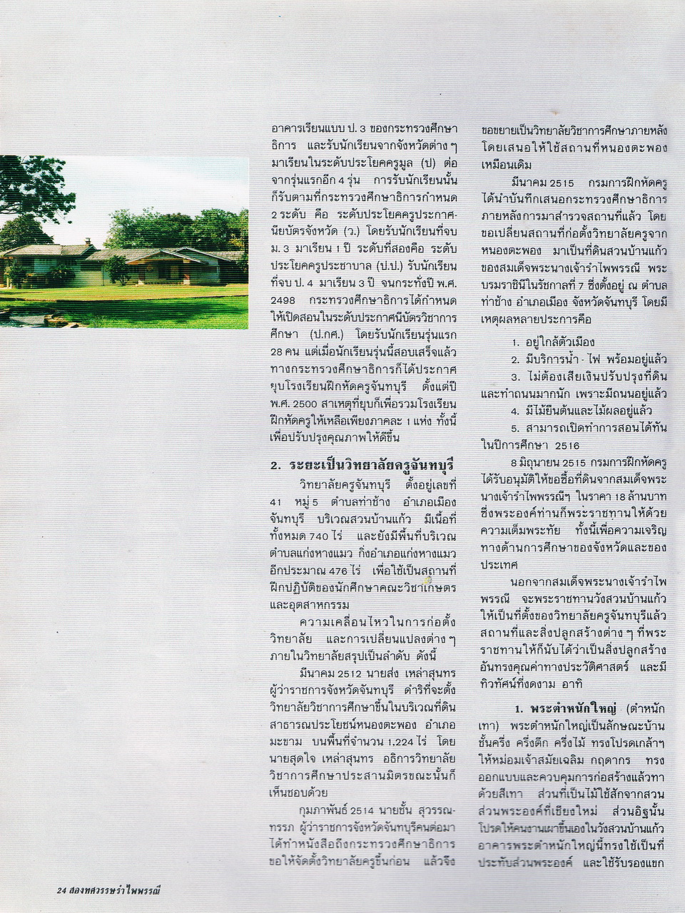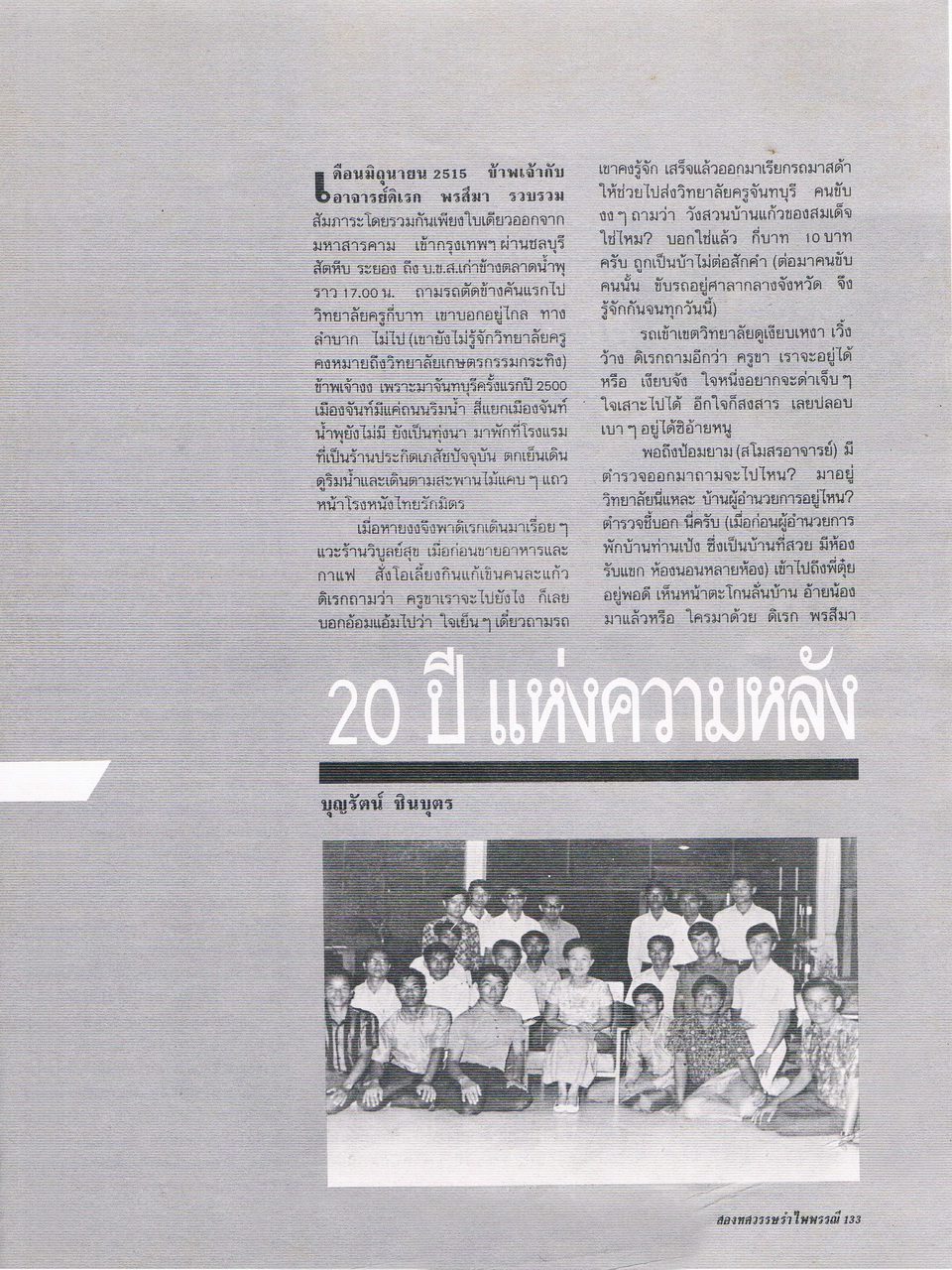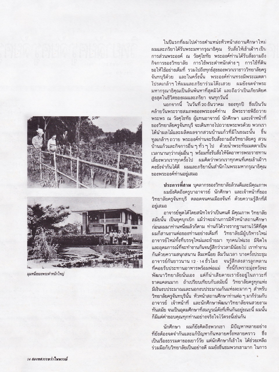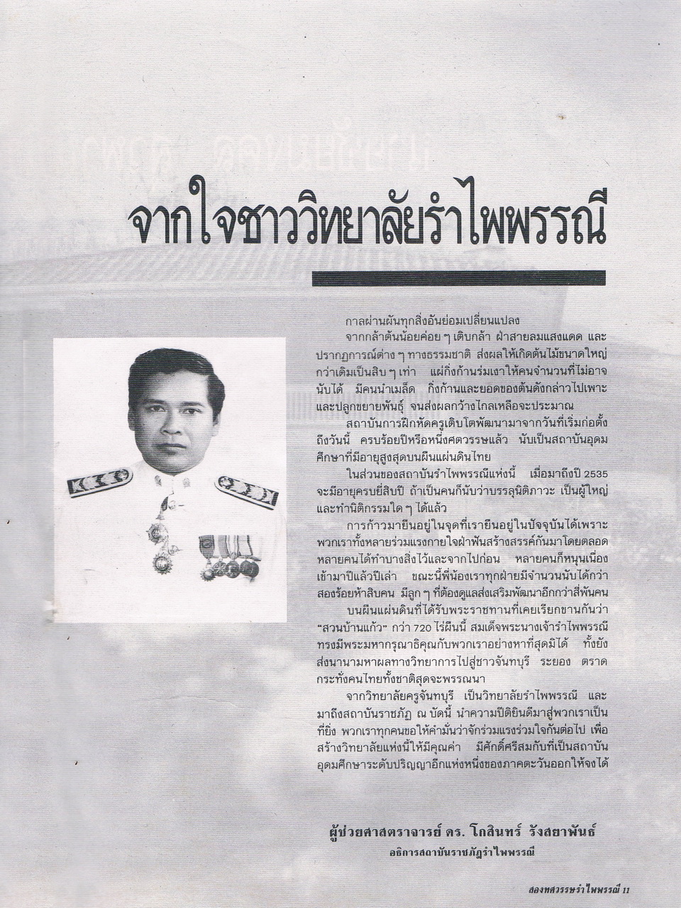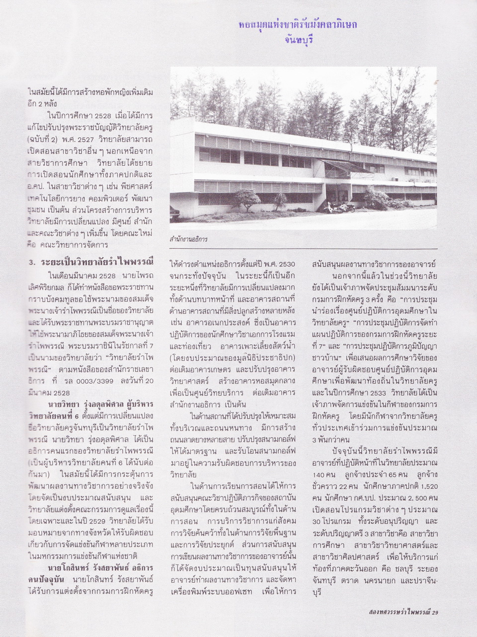 - มีเนื้อหาหลากหลายได้แก่สารจากอธิบดีกรมการฝึกหัดครู จากใจชาวรำไพพรรณี บันทึกของนายชัยมงคล สุวพานิช วิทยาลัยครูจันทบุรี ปีการศึกษา2518-2520 ข้อคิดจากนายสุรพล แก่นจักษ์ หนึ่งปีแห่งความหลังที่ฝั่งใจ เมื่อผมเป็นอธิการบดีรำไพพรรณีคนที่5(2524-2528) ผมมีแต่ความประทับใจอย่างไม่มีวันลืม ประวัติวิทยาลัยรำไพพรรณี หลักสูตรการเรียนการสอน ผลงานทางวิชาการของคณาจารย์วิทยาลัยรำไพพรรณี คณะวิชาเกษตรและอุตสาหกรรม คณะวิทยาศาสตร์ คณะมนุษยศาสตร์และสังคมศาสตร์ คณะวิชาวิทยาการจัดการ คณะวิทยาศาสตร์และเทคโนโลยี ศูนย์ศิลปวัฒนธรรมและศูนย์วัฒนธรรมจังหวัดจันทบุรี งานวิจัยของวิทยาลัยรำไพพรรณี โครงการคุรุทายาท โครงการสนามกอล์ฟรำไพพรรณี โครงการอาคารริมกรีน โครงการศูนย์วิทยบริการ โครงการพัฒนาการเรียนการสอนวิทยาศาสตร์ ทุนมูลนิธิประชาธิปก-รำไพพรรณี มูลนิธิรำไพพรรณี โรงเรียนสาธิตวิทยาลัยรำไพพรรณี หอพัก บัณฑิตกิตติมศักดิ์ สถาบันราชภัฏรำไพพรรณีี นับแต่วันนี้ไปข้างหน้า ก่อนหน้าสถาบันราชภัฏรำไพพรรณี ไม้ดอกไม้ประดับในสวนบ้านแก้ว 20ปีแห่งความหลัง ย้อนอดีต20ปี สมเด็จพระนางเจ้ารำไพพรรณีกับวิทยาลัย วันวานแห่งความทรงจำ ความทรงจำของรุ่นบุกเบิก.