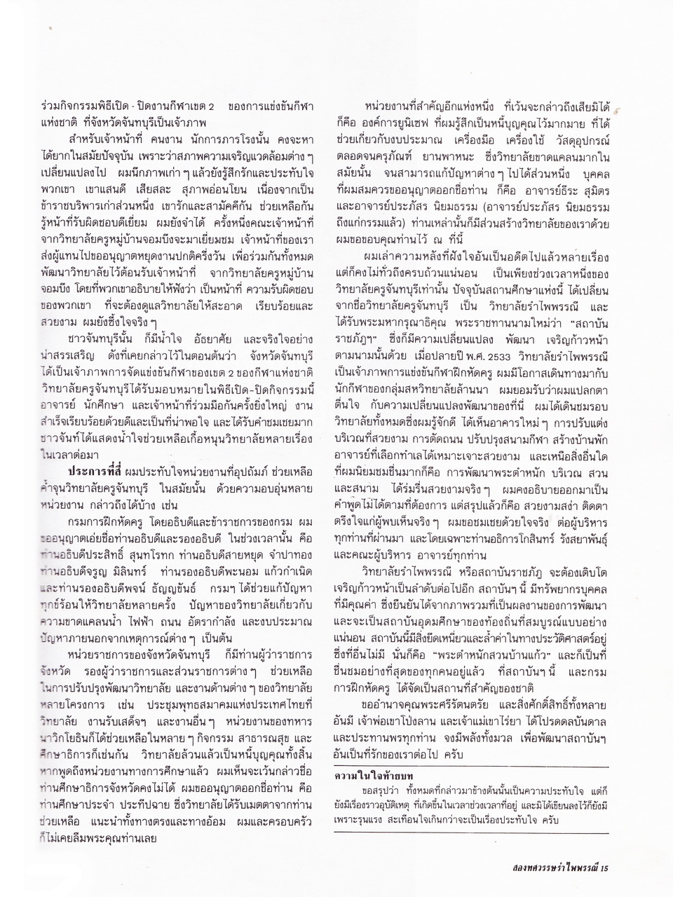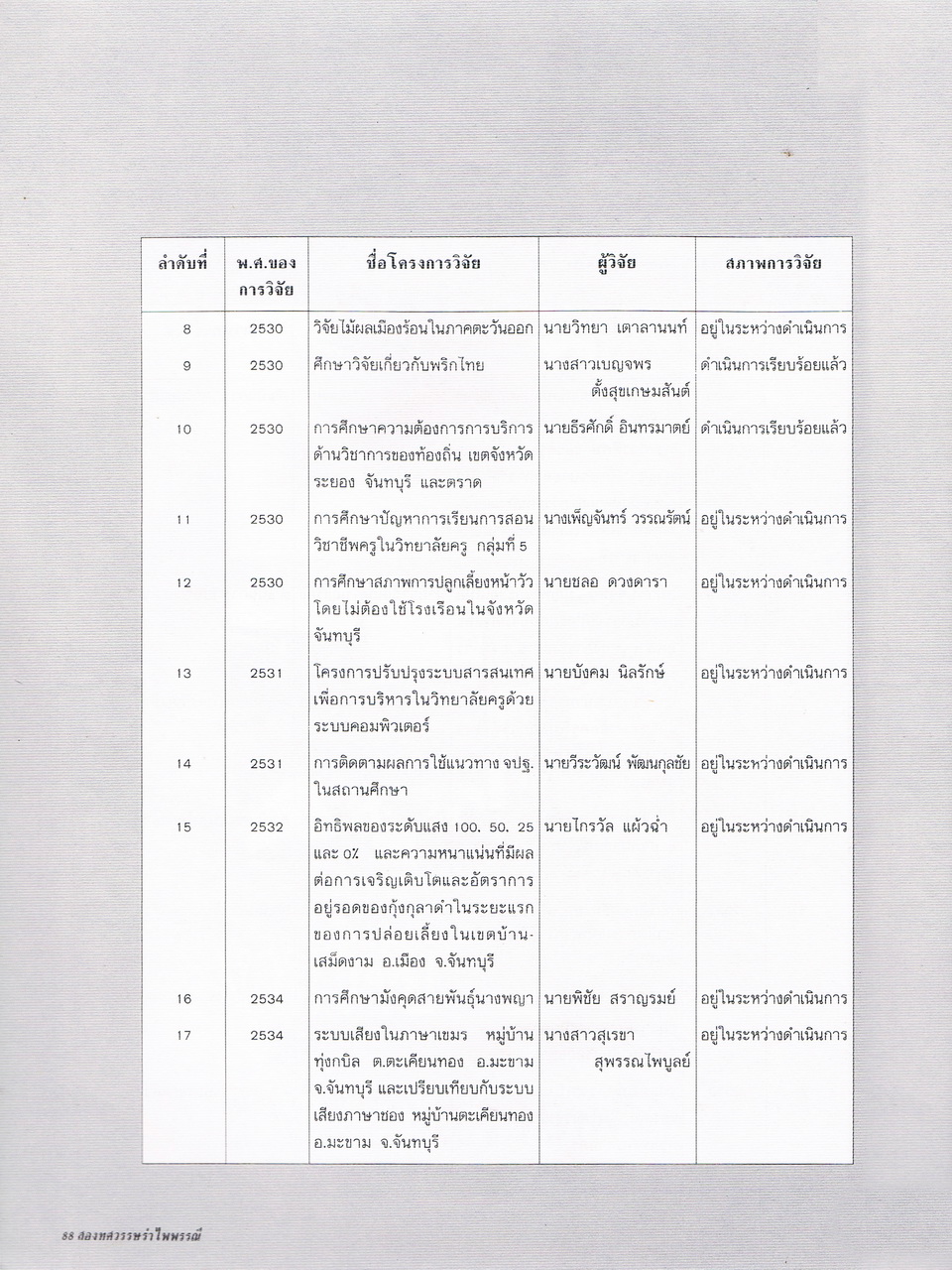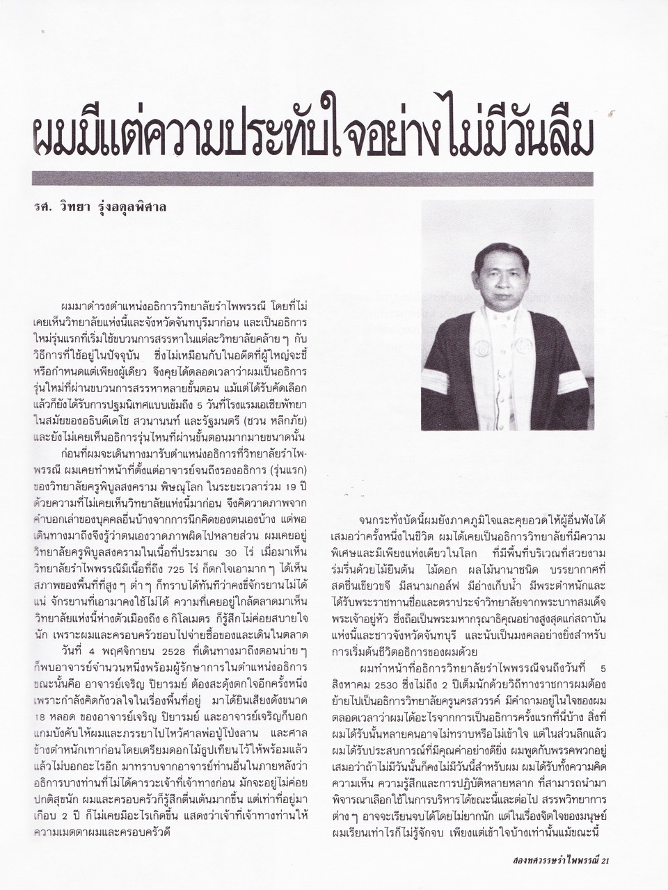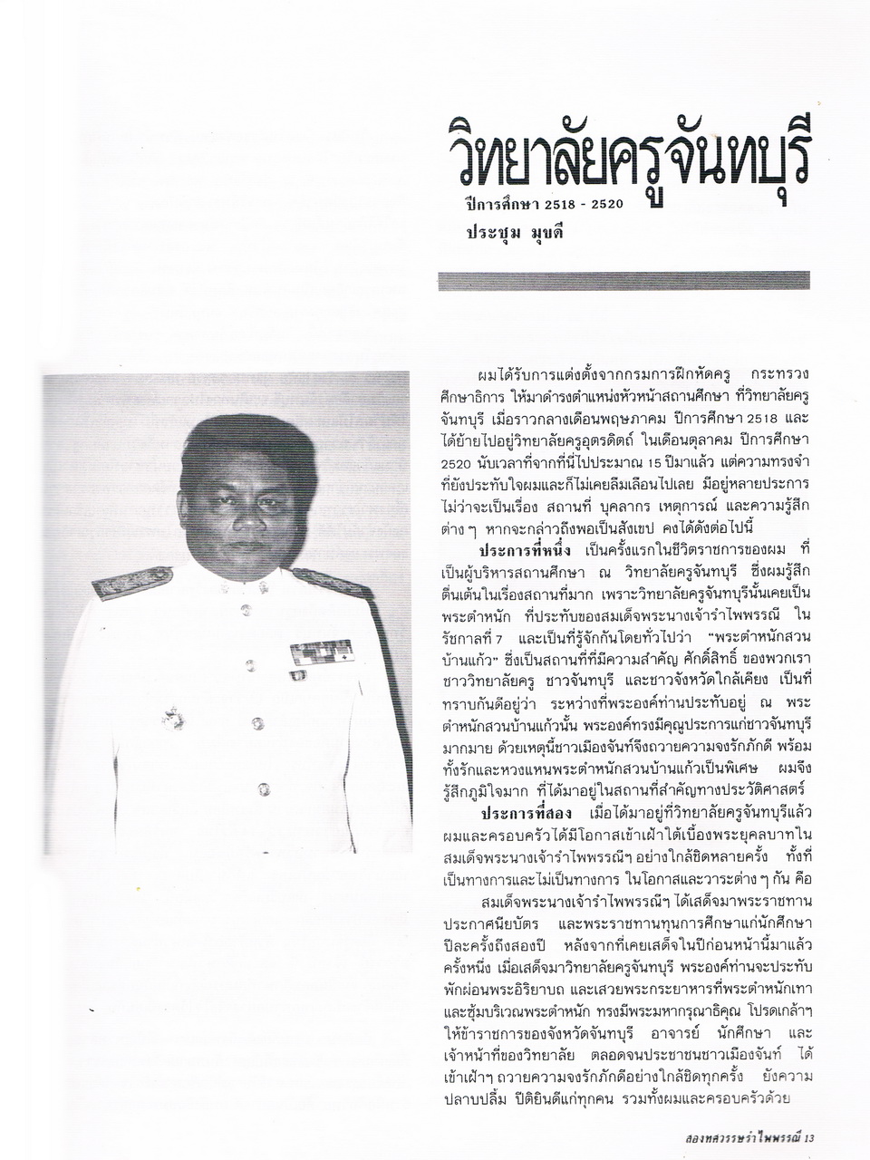 - มีเนื้อหาหลากหลายได้แก่สารจากอธิบดีกรมการฝึกหัดครู จากใจชาวรำไพพรรณี บันทึกของนายชัยมงคล สุวพานิช วิทยาลัยครูจันทบุรี ปีการศึกษา2518-2520 ข้อคิดจากนายสุรพล แก่นจักษ์ หนึ่งปีแห่งความหลังที่ฝั่งใจ เมื่อผมเป็นอธิการบดีรำไพพรรณีคนที่5(2524-2528) ผมมีแต่ความประทับใจอย่างไม่มีวันลืม ประวัติวิทยาลัยรำไพพรรณี หลักสูตรการเรียนการสอน ผลงานทางวิชาการของคณาจารย์วิทยาลัยรำไพพรรณี คณะวิชาเกษตรและอุตสาหกรรม คณะวิทยาศาสตร์ คณะมนุษยศาสตร์และสังคมศาสตร์ คณะวิชาวิทยาการจัดการ คณะวิทยาศาสตร์และเทคโนโลยี ศูนย์ศิลปวัฒนธรรมและศูนย์วัฒนธรรมจังหวัดจันทบุรี งานวิจัยของวิทยาลัยรำไพพรรณี โครงการคุรุทายาท โครงการสนามกอล์ฟรำไพพรรณี โครงการอาคารริมกรีน โครงการศูนย์วิทยบริการ โครงการพัฒนาการเรียนการสอนวิทยาศาสตร์ ทุนมูลนิธิประชาธิปก-รำไพพรรณี มูลนิธิรำไพพรรณี โรงเรียนสาธิตวิทยาลัยรำไพพรรณี หอพัก บัณฑิตกิตติมศักดิ์ สถาบันราชภัฏรำไพพรรณีี นับแต่วันนี้ไปข้างหน้า ก่อนหน้าสถาบันราชภัฏรำไพพรรณี ไม้ดอกไม้ประดับในสวนบ้านแก้ว 20ปีแห่งความหลัง ย้อนอดีต20ปี สมเด็จพระนางเจ้ารำไพพรรณีกับวิทยาลัย วันวานแห่งความทรงจำ ความทรงจำของรุ่นบุกเบิก.