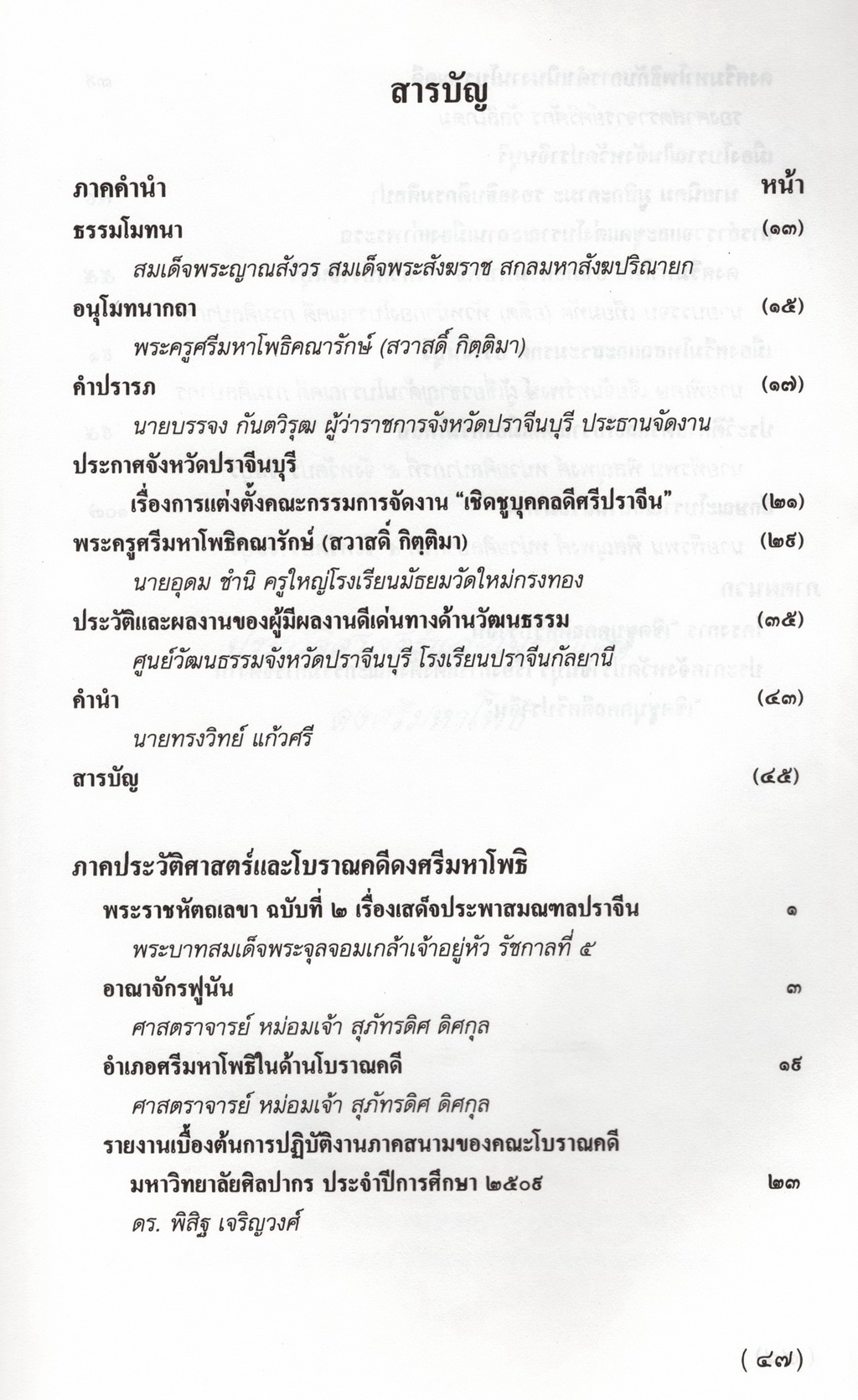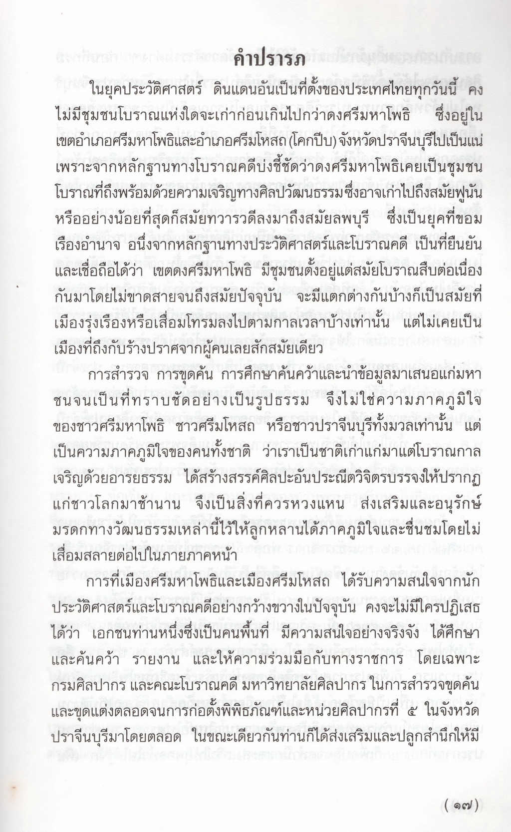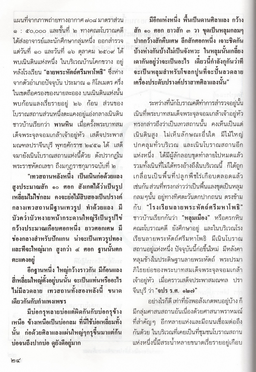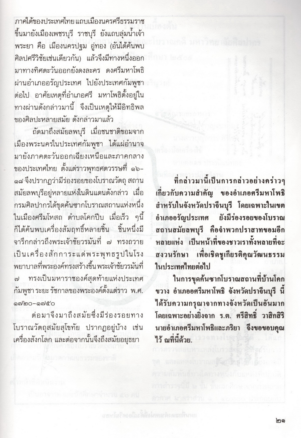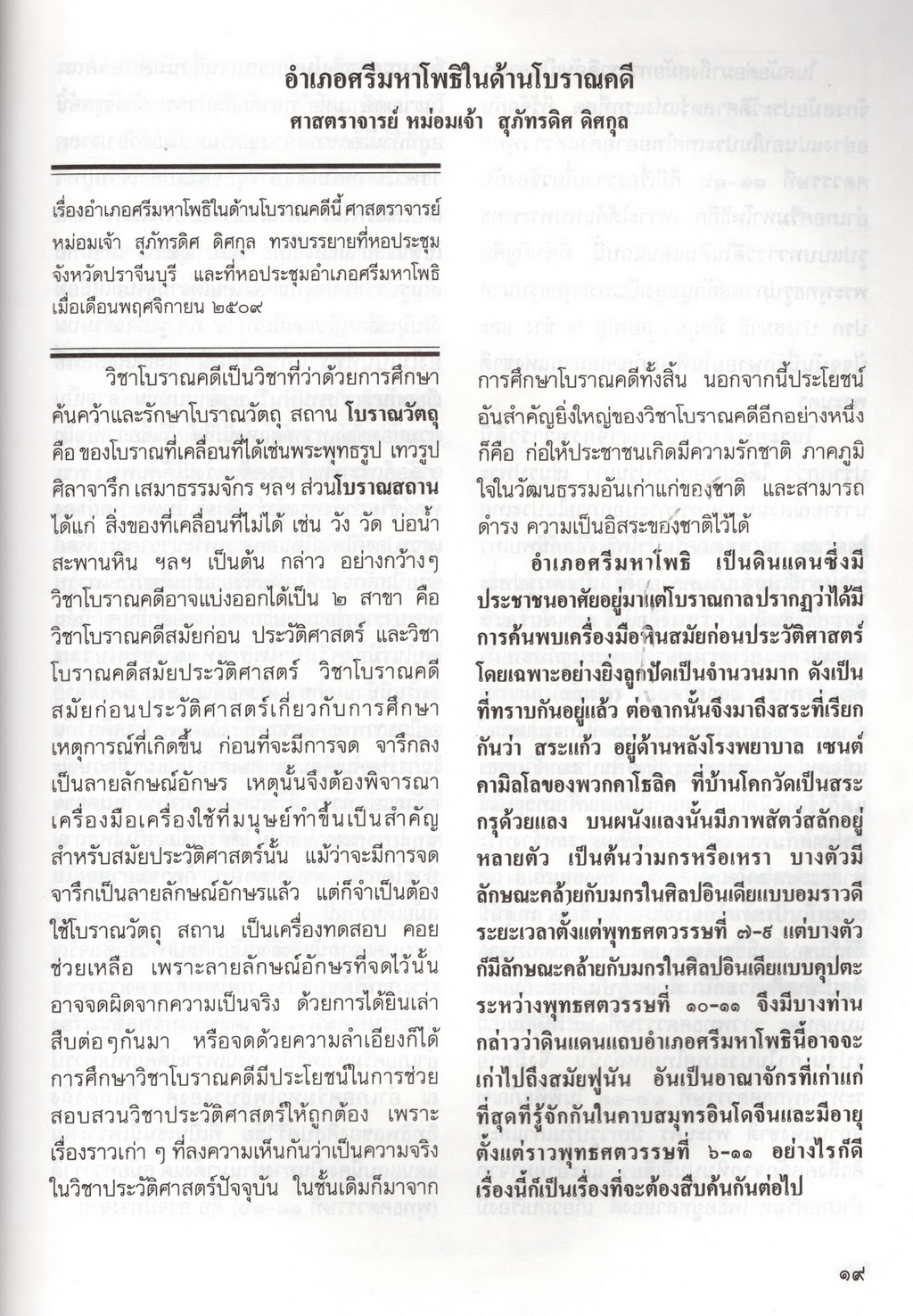 - เป็นหนังสือที่รวบรวมข้อมูลเกี่ยวกับประวัติศาสตร์และโบราณคดีดงศรีมหาโพธิ ได้แก่ พระราชหัตถเลขา ฉบับที่ 2 เรื่อง เสด็จประพาสมณฑลปราจีน อาณาจักรฟูนัน อำเภอศรีมหาโพธิ ในด้านโบราณคดี รายงานเบื้องต้นการปฏิบัติงานภาคสนามของคณะโบราณคดี มหาวิทยาลัยศิลปากร ประจำปีการศึกษา 2509 ดงศรีมหาโพธิกับการดำเนินงานโบราณคดี เมืองโบราณในจังหวัดปราจีนบุรี การสำรวจและขุดต่งโบราณสถาน เมืองเก่าพระรถ ดงศรีมหาโพธิ อำเภอศรีมหาโพธิ จังหวัดปราจีนบุรี เมืองศรีมโหสถ และสระมรกตปราจีนบุรี ประวัติศาสตร์ และโบราณคดี เมืองศรีมดหสถ ลักษณะโบราณสถานสระมรกต ท้ายเล่มเป็นโครงการเชิดชูบุคคลดีศรีปราจีน