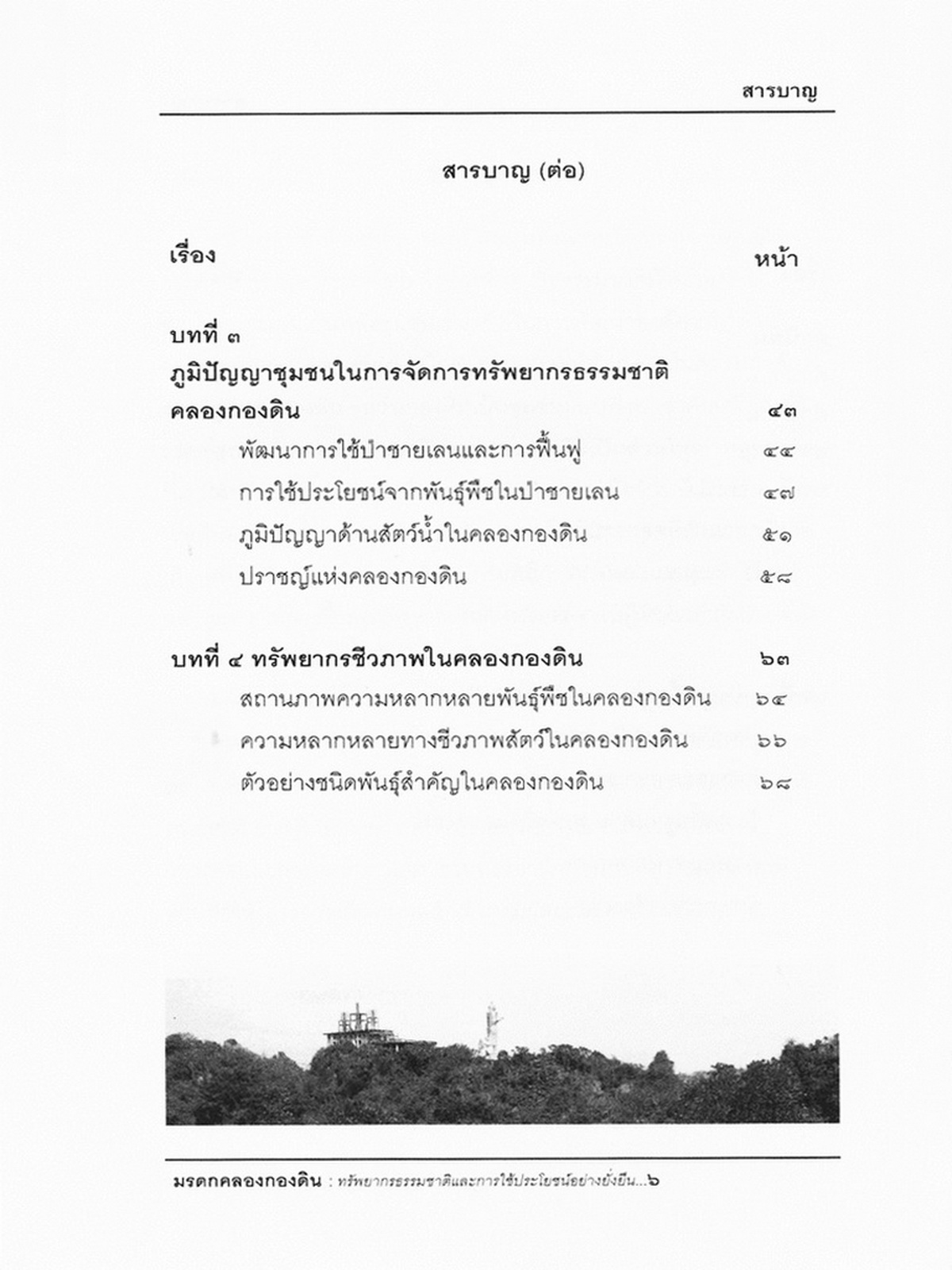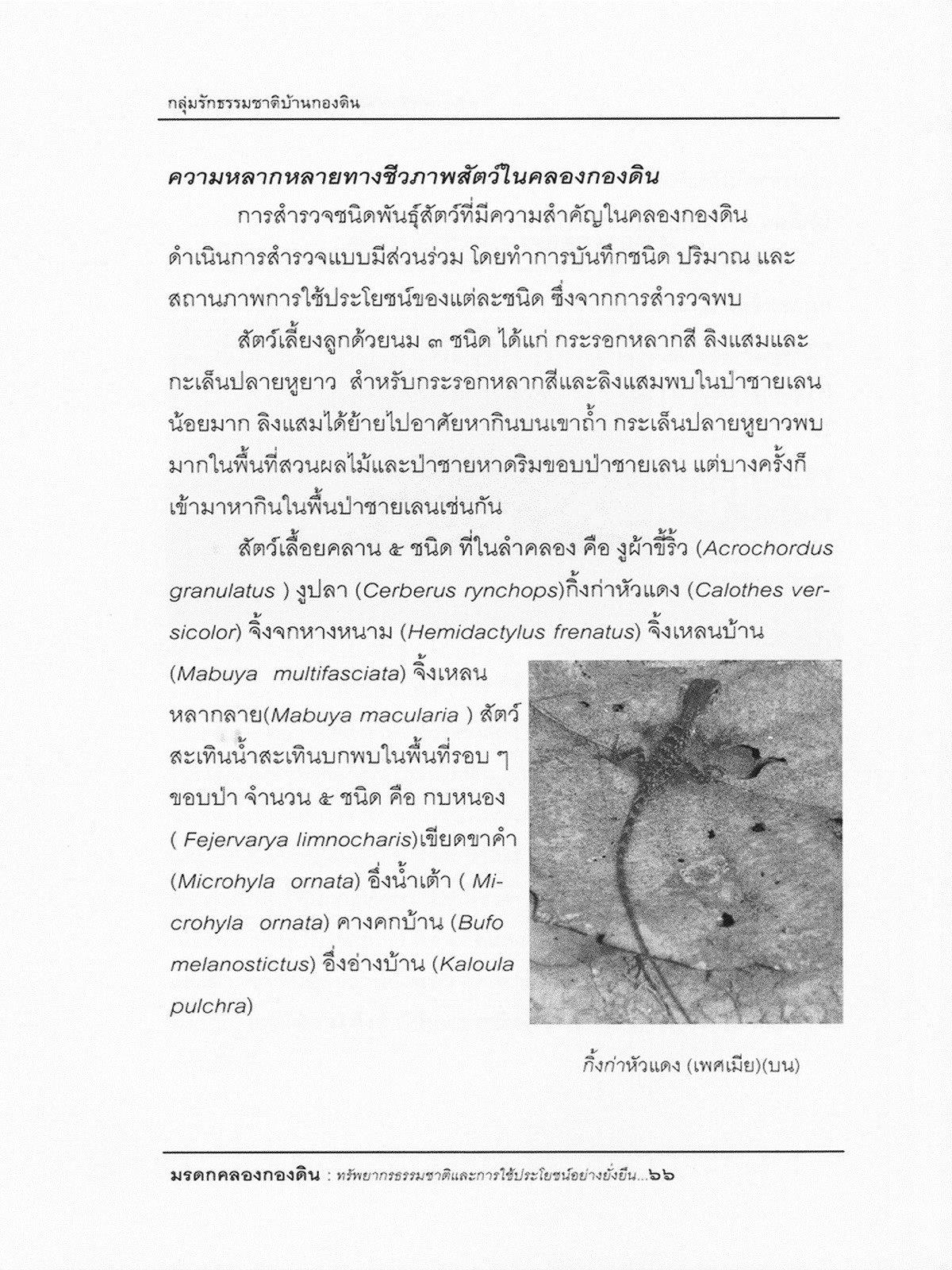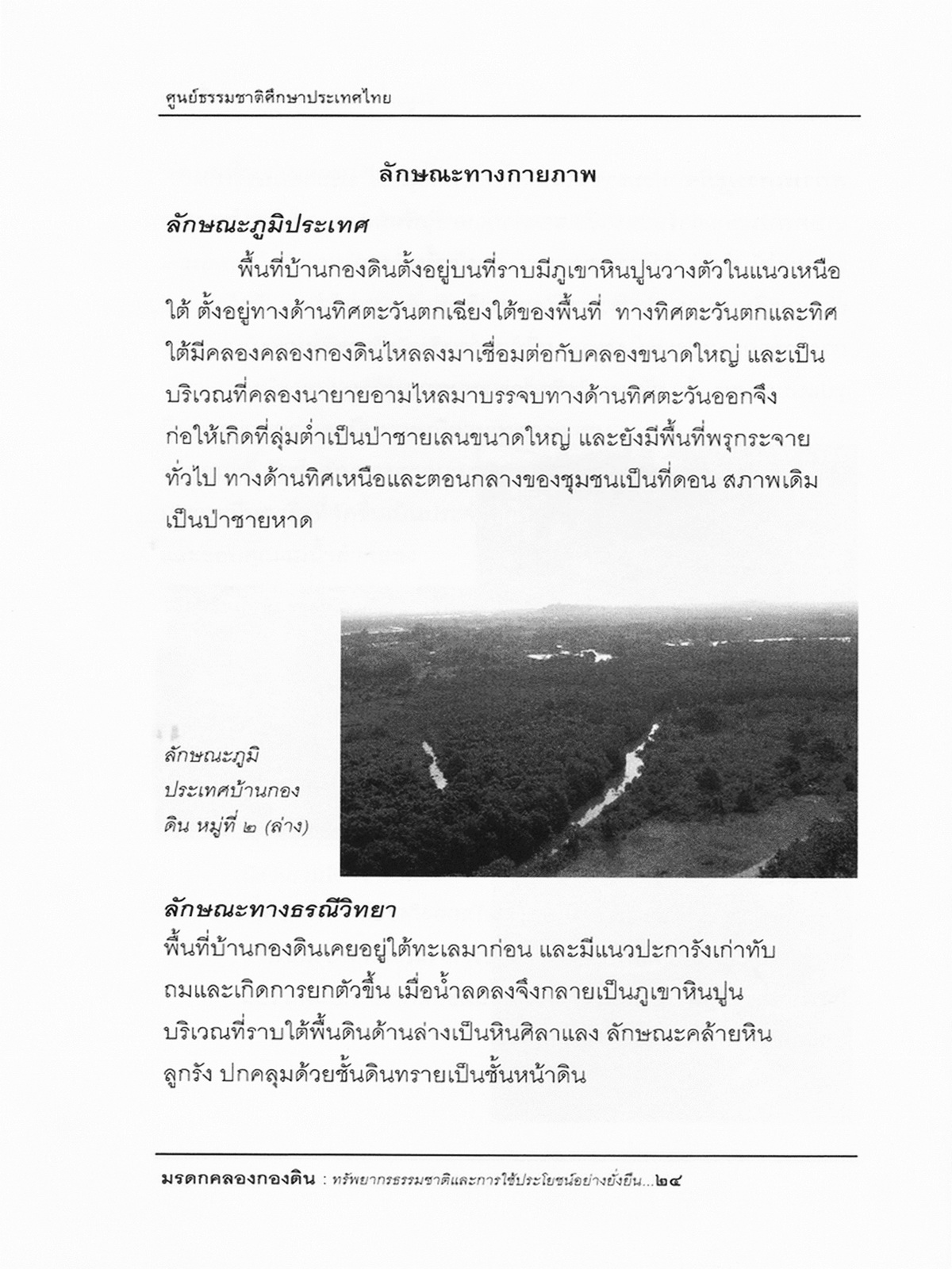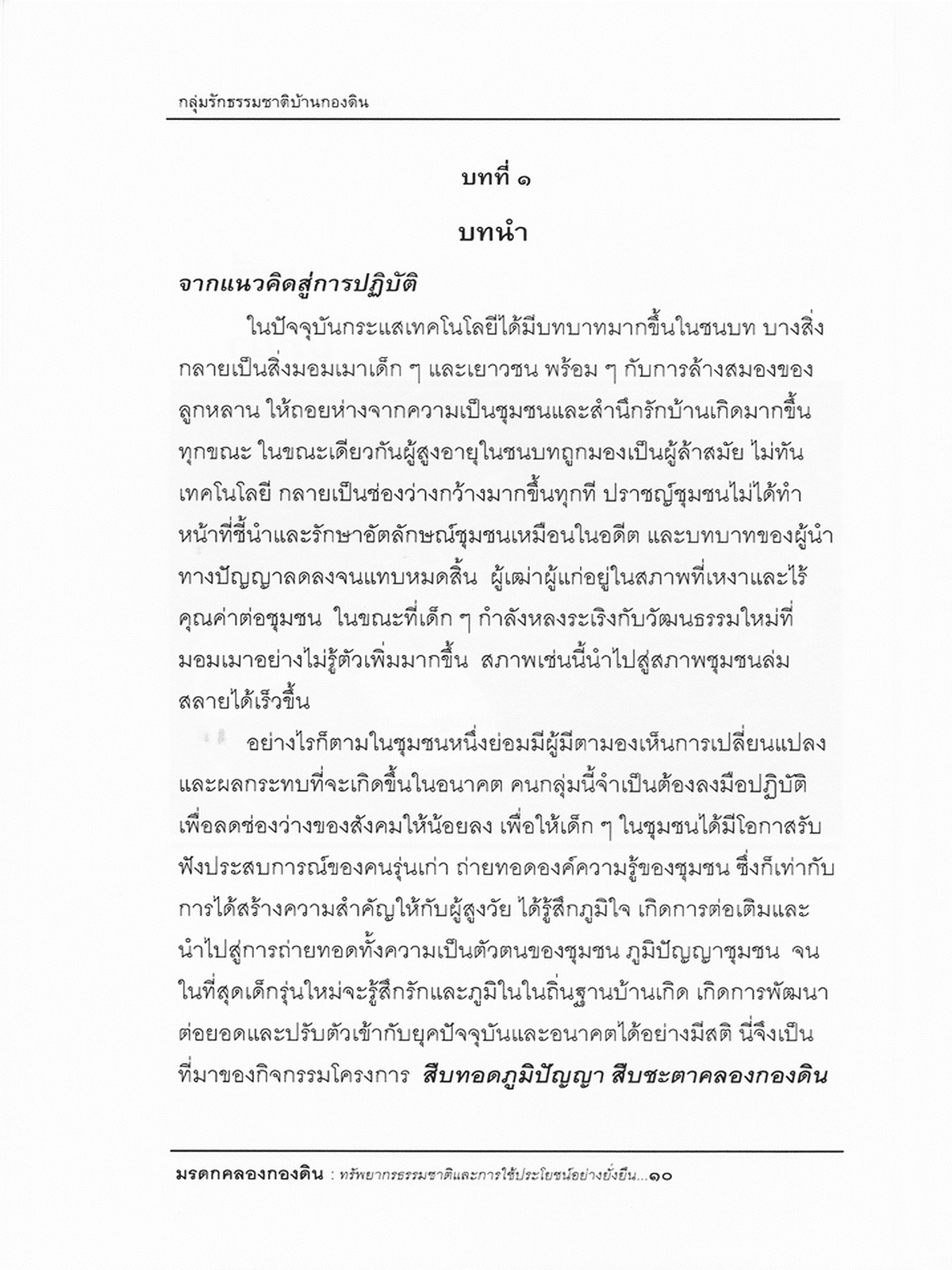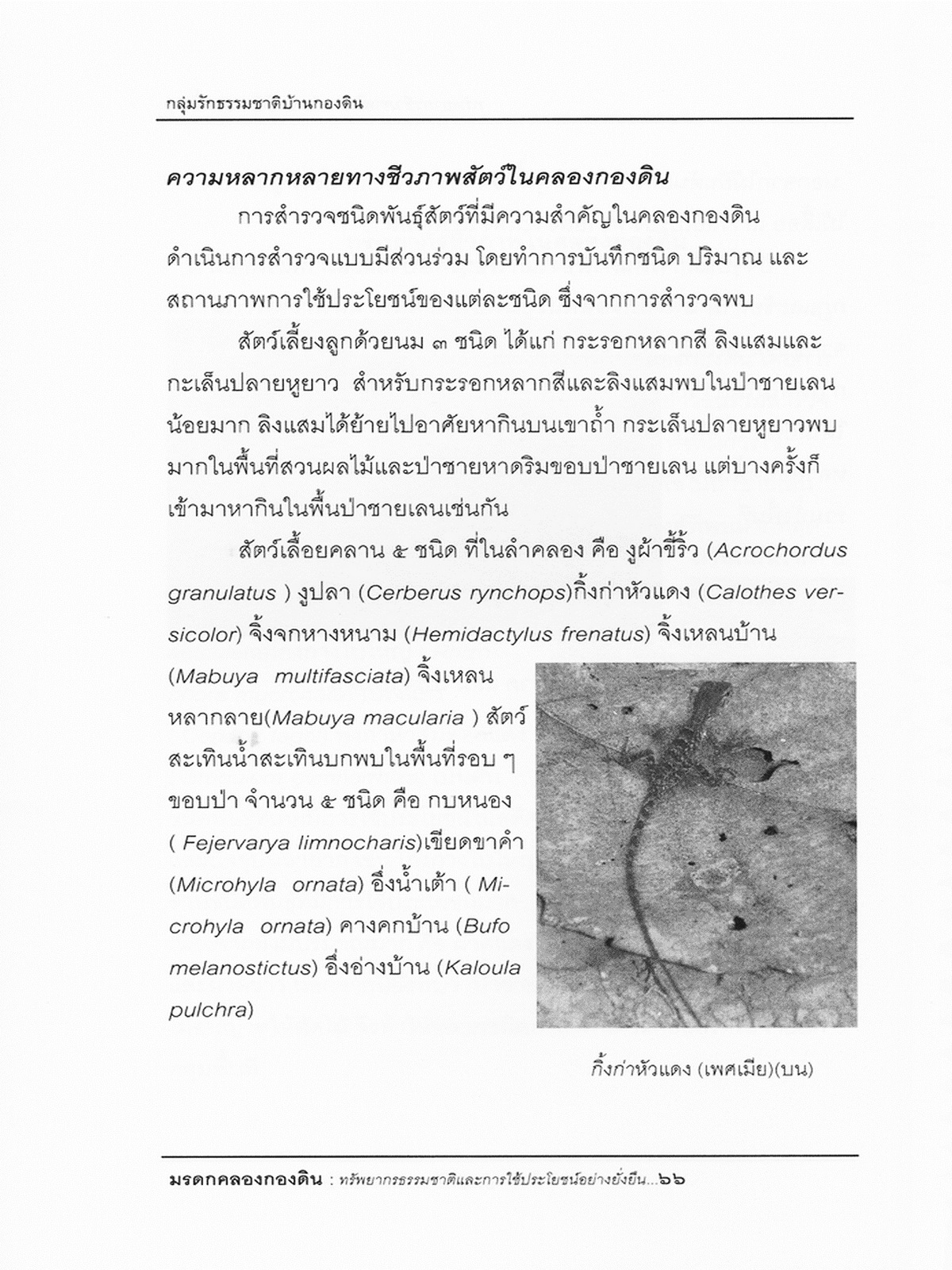 - เนื้อหาแบ่งออกเป็น 5 บท คือบทที่1บทนำ บทที่2ข้อมูลพื้นฐานของบ้านกองดิน บทที่3ภูมิปัญญาชุมชนในการจัดการทรัพยากรธรรมชาติคลองกองดิน บทที่4ทรัพยากรชีวภาพในคลองกองดิน บทที่5 กิจกรรมธรรมชาติ-ศึกษาคลองกองดิน และภาคผนวกเป็นดัชนีภาพและชนิดพันธ์ุ