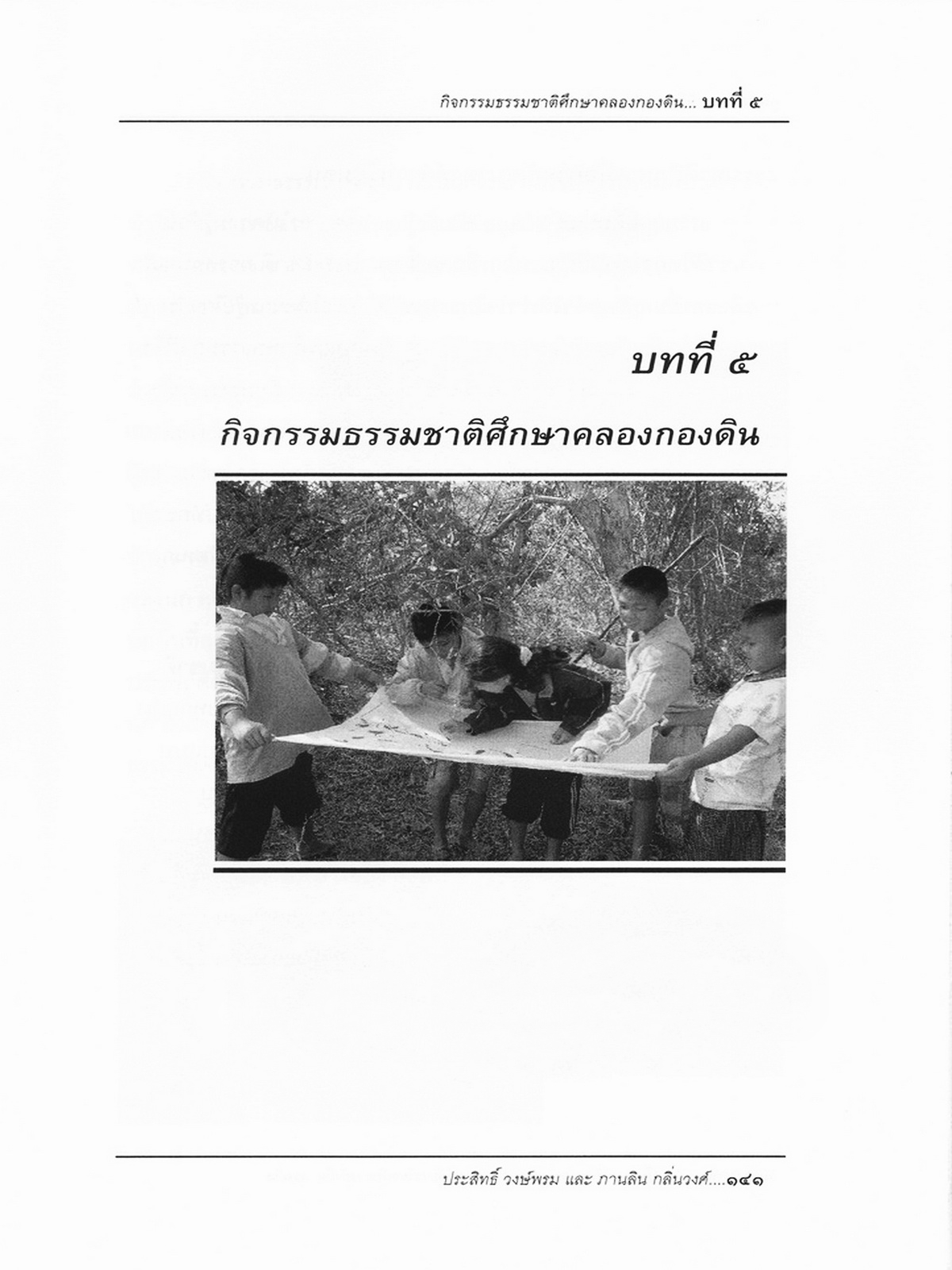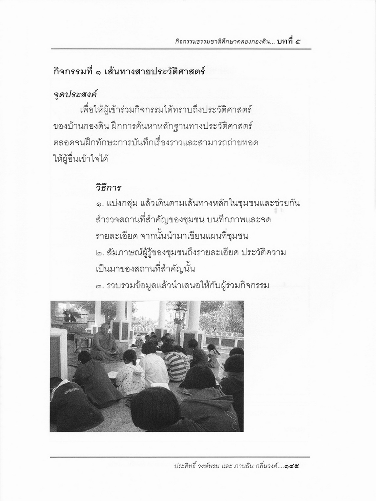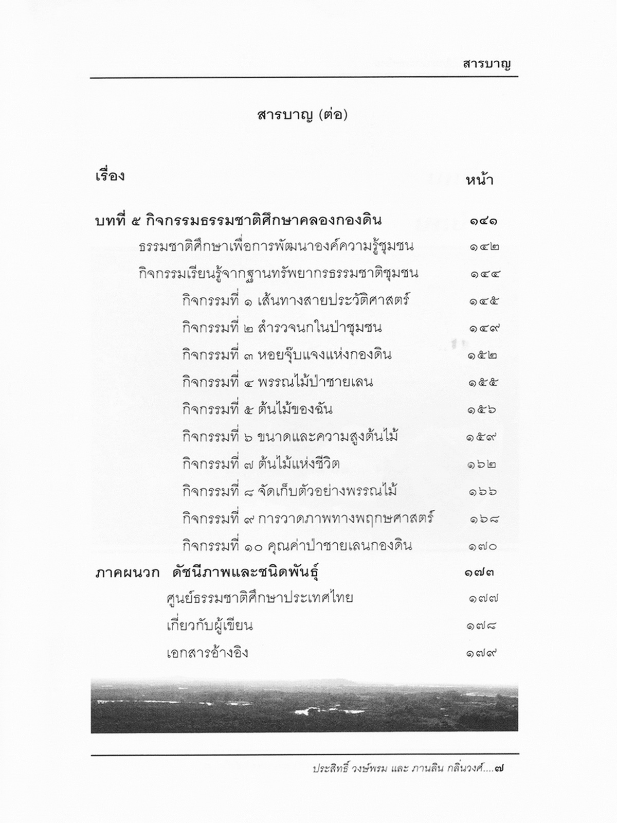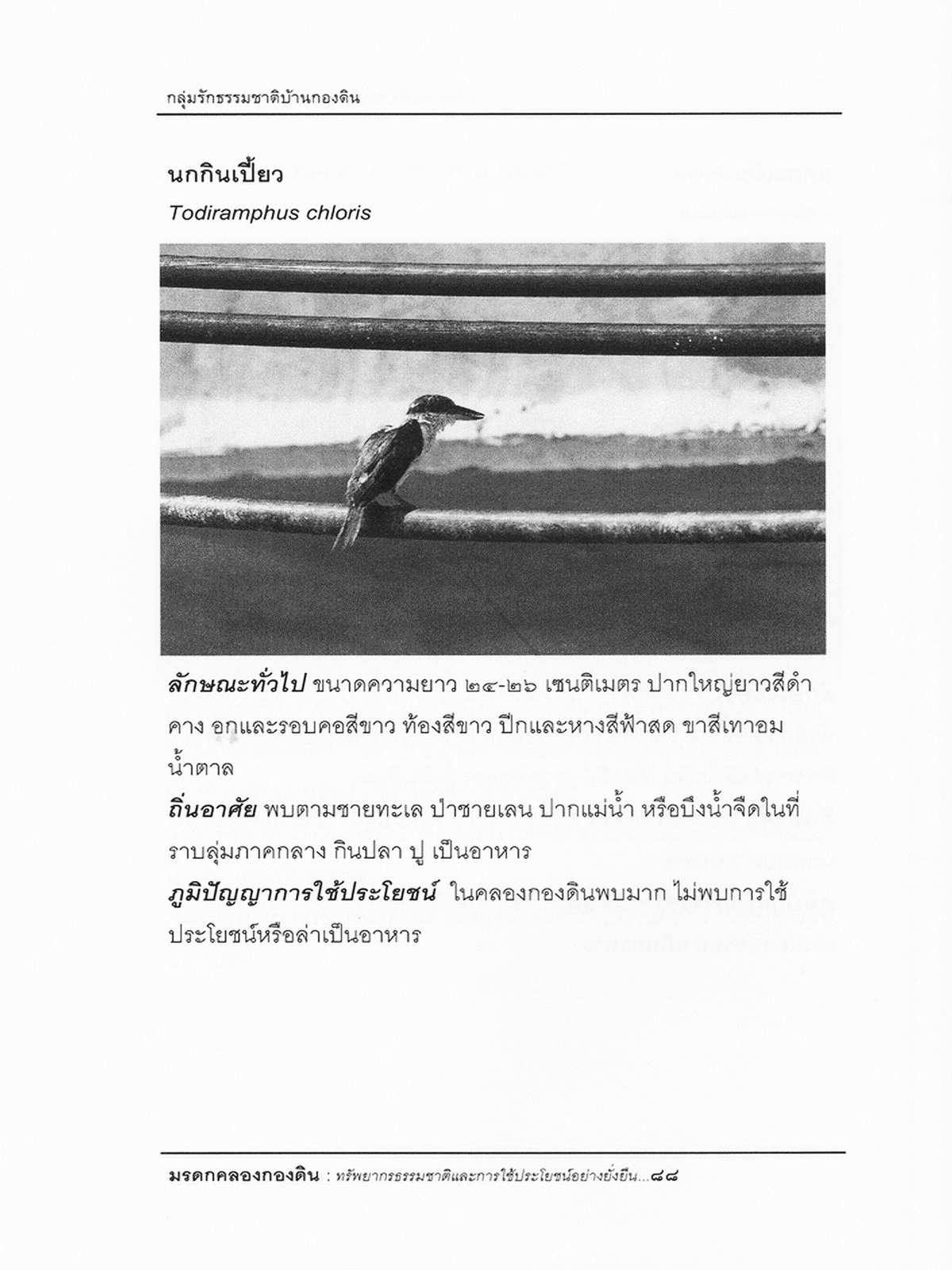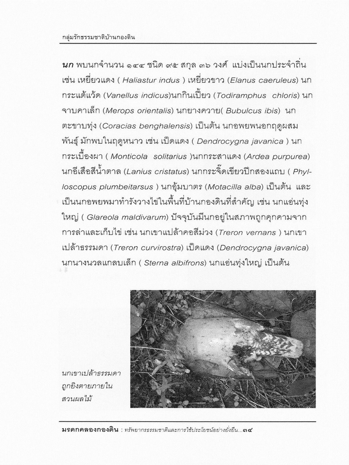 - เนื้อหาแบ่งออกเป็น 5 บท คือบทที่1บทนำ บทที่2ข้อมูลพื้นฐานของบ้านกองดิน บทที่3ภูมิปัญญาชุมชนในการจัดการทรัพยากรธรรมชาติคลองกองดิน บทที่4ทรัพยากรชีวภาพในคลองกองดิน บทที่5 กิจกรรมธรรมชาติ-ศึกษาคลองกองดิน และภาคผนวกเป็นดัชนีภาพและชนิดพันธ์ุ