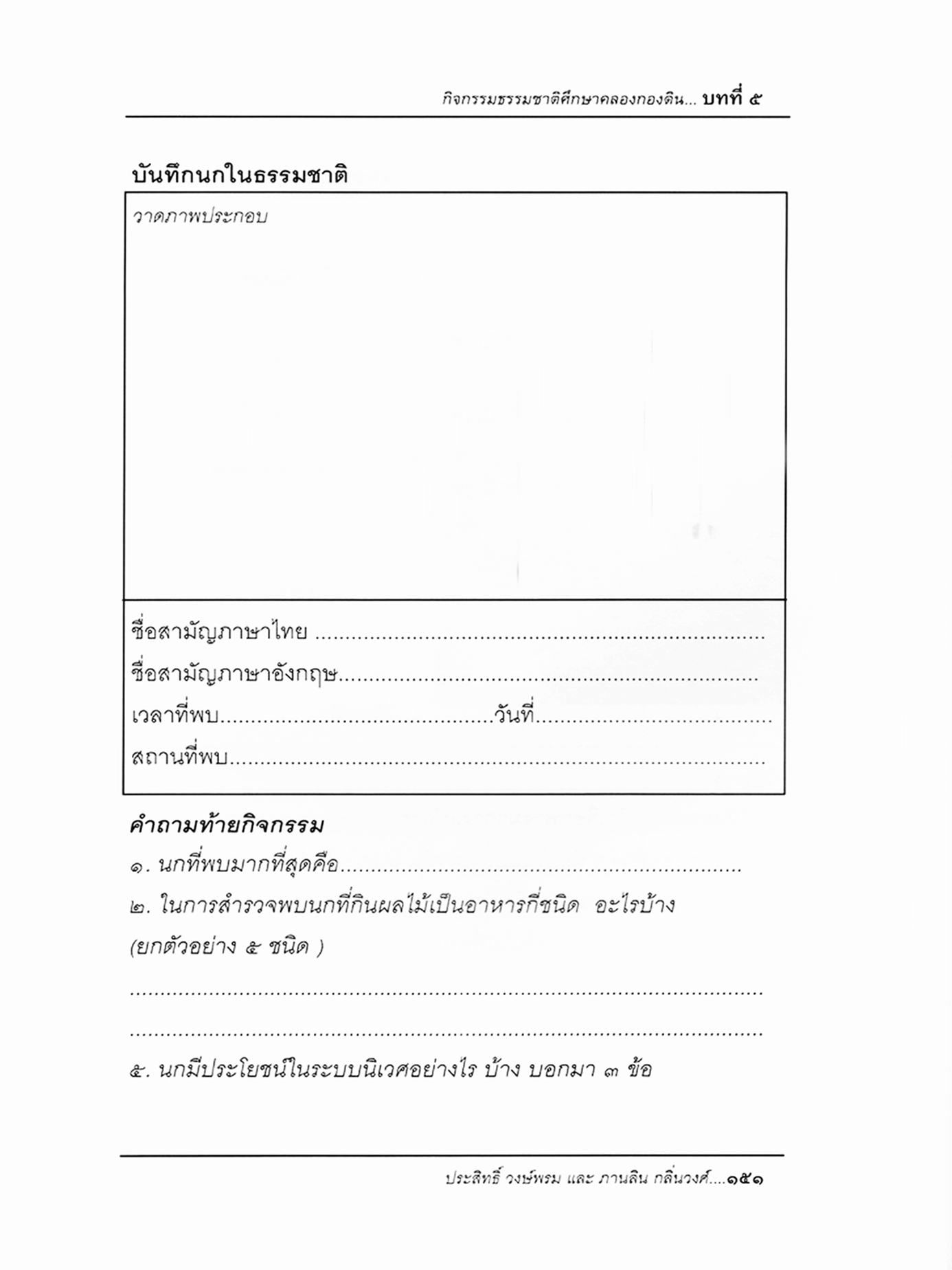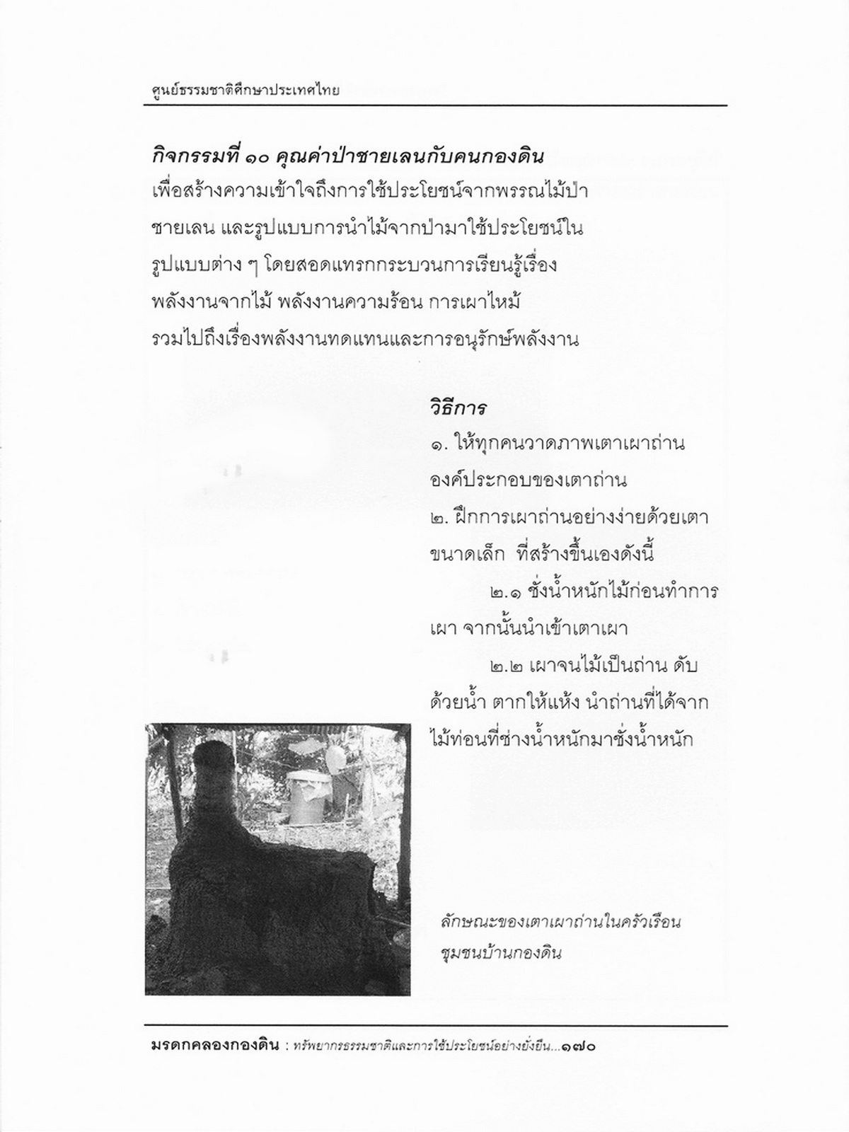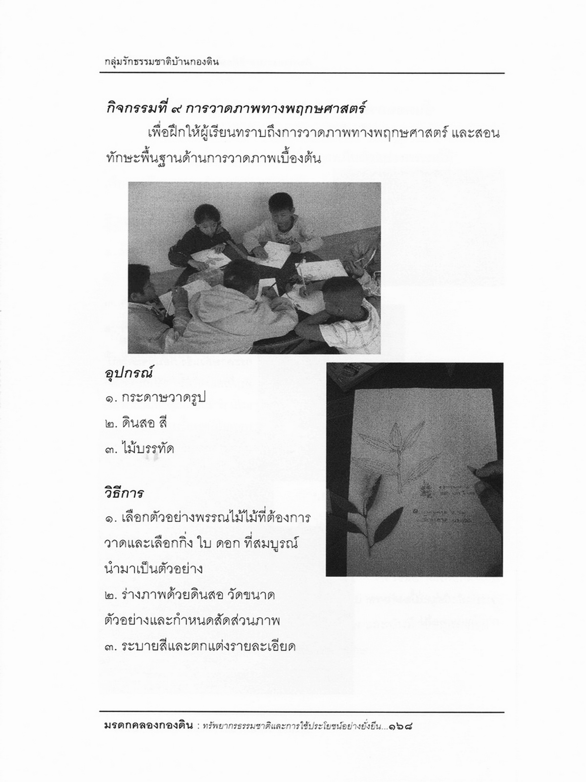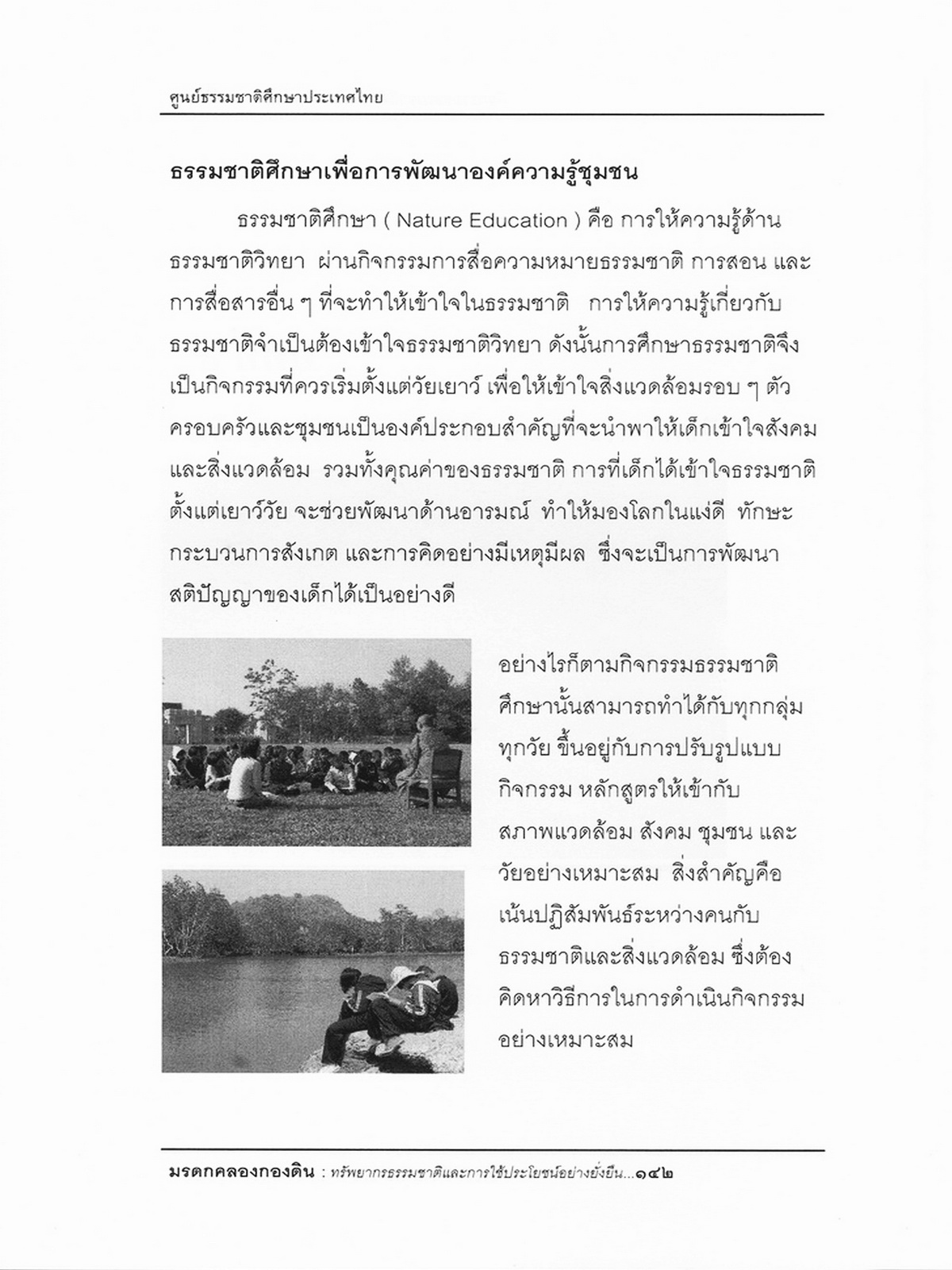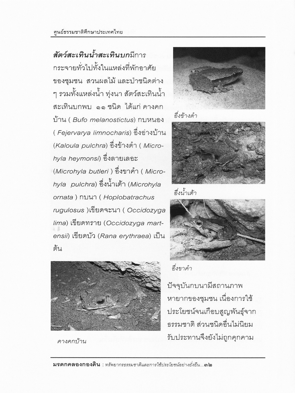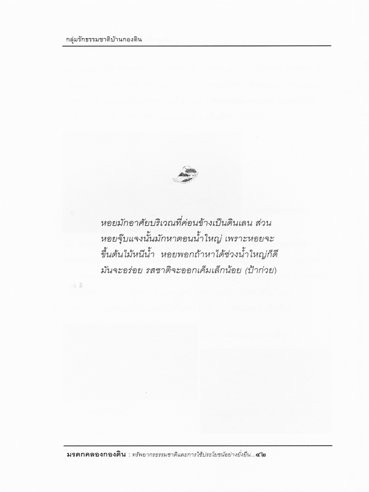 - เนื้อหาแบ่งออกเป็น 5 บท คือบทที่1บทนำ บทที่2ข้อมูลพื้นฐานของบ้านกองดิน บทที่3ภูมิปัญญาชุมชนในการจัดการทรัพยากรธรรมชาติคลองกองดิน บทที่4ทรัพยากรชีวภาพในคลองกองดิน บทที่5 กิจกรรมธรรมชาติ-ศึกษาคลองกองดิน และภาคผนวกเป็นดัชนีภาพและชนิดพันธ์ุ