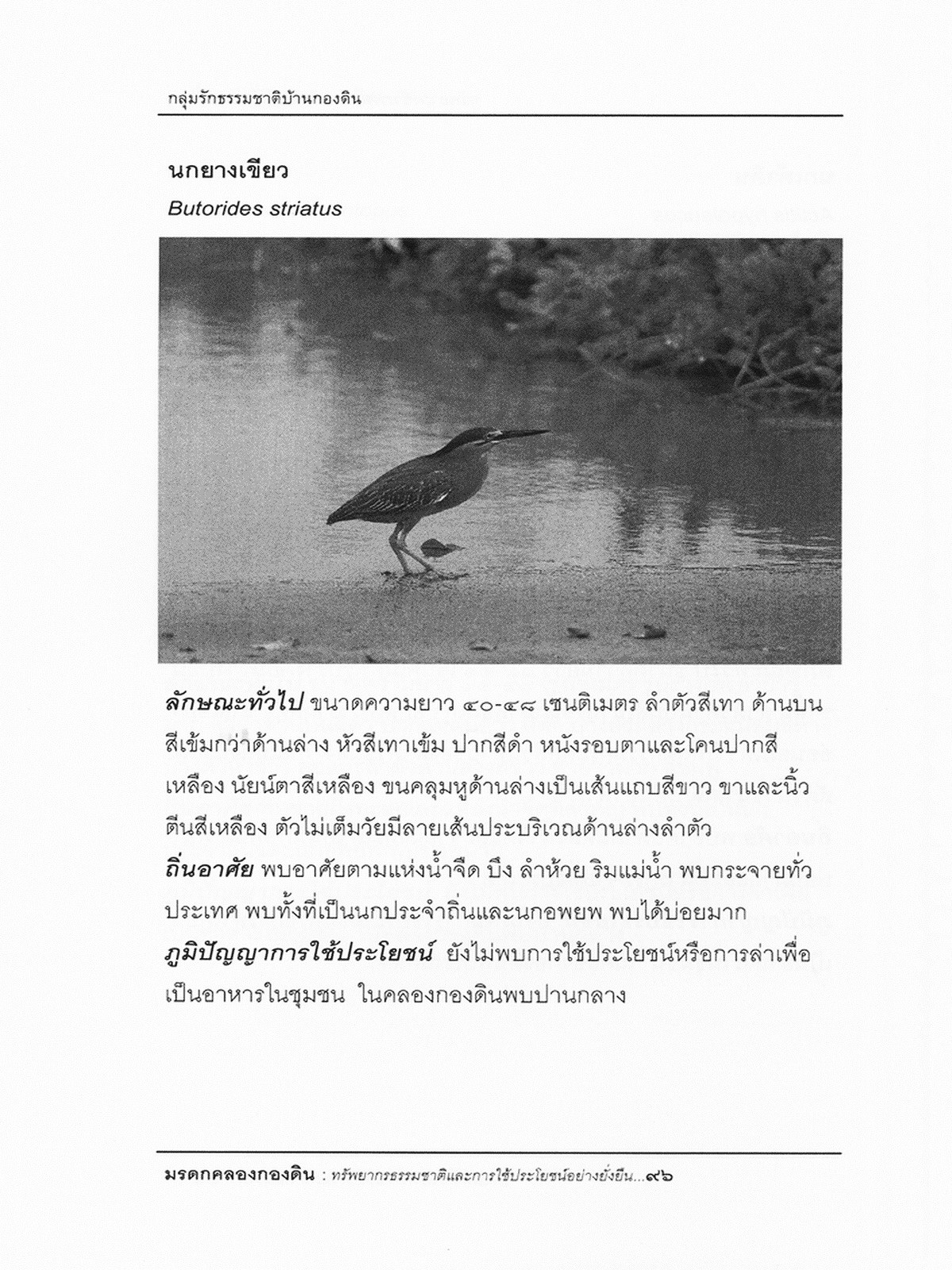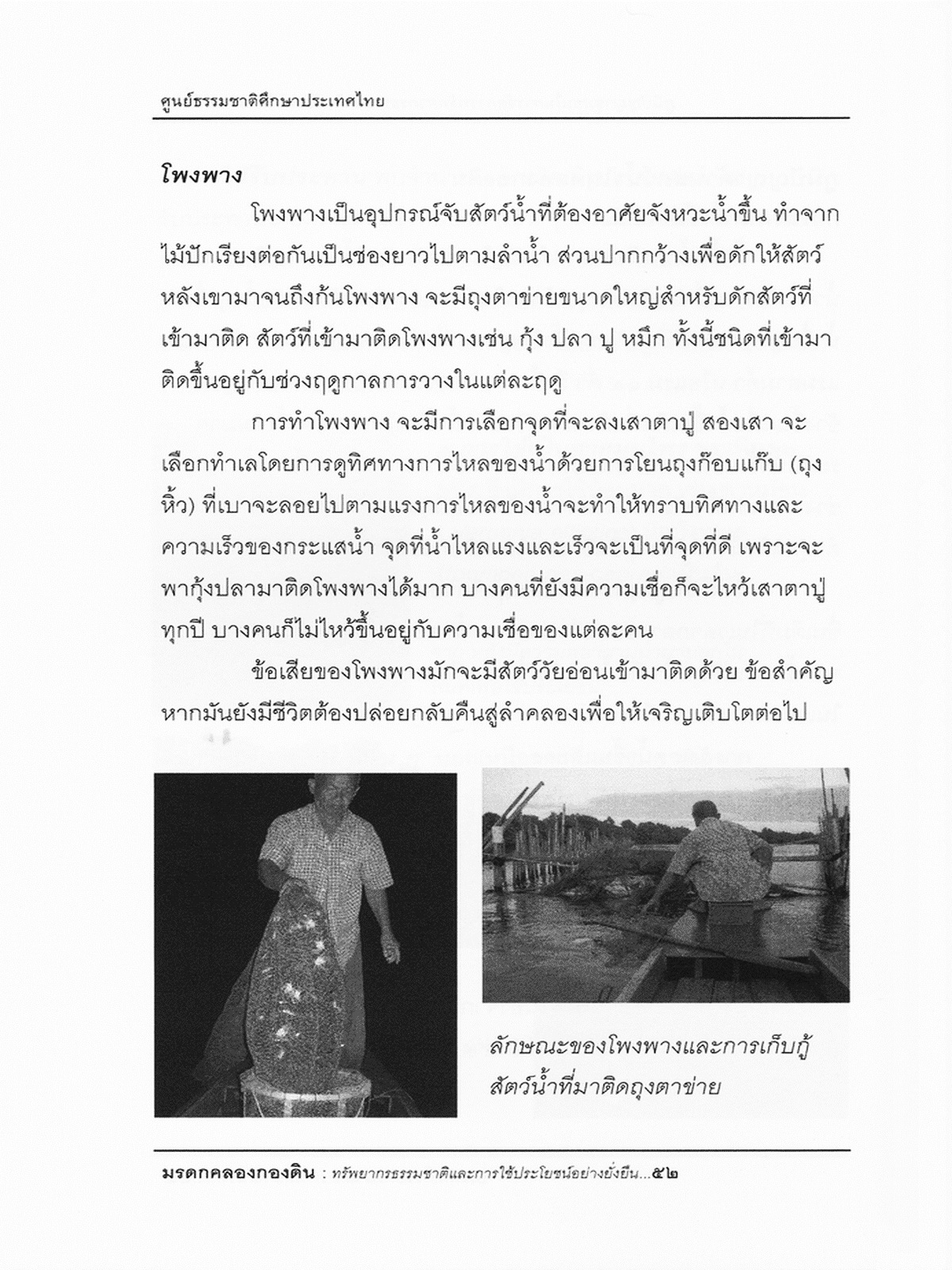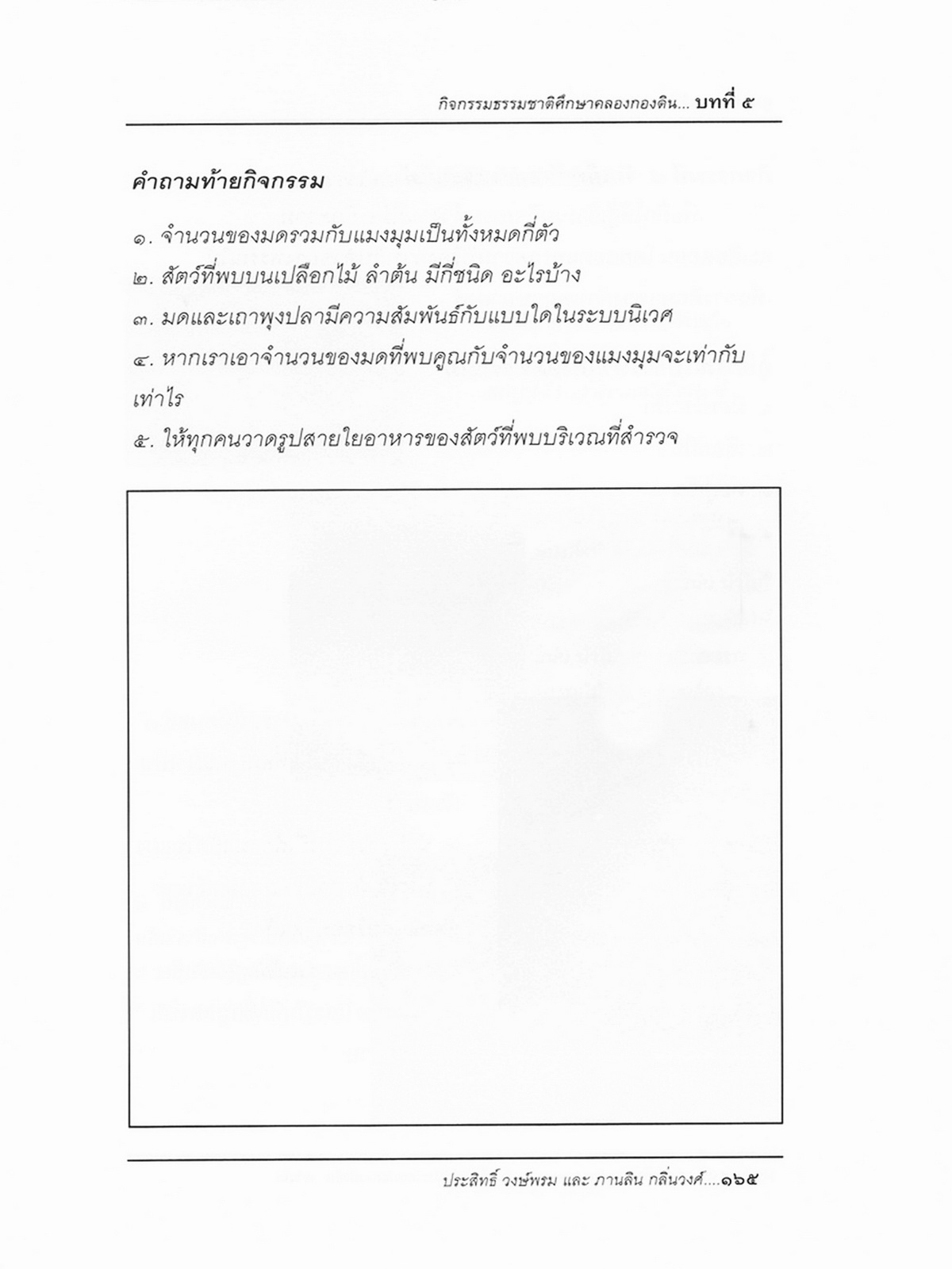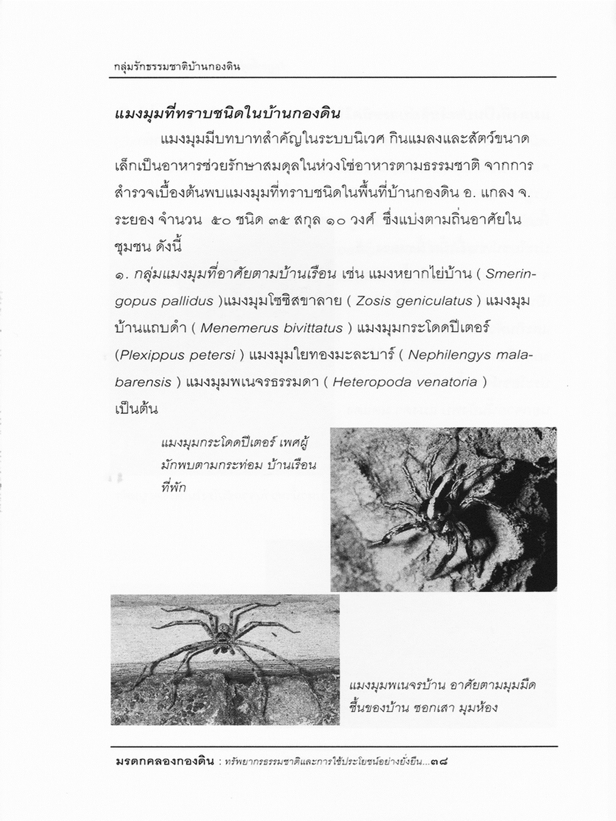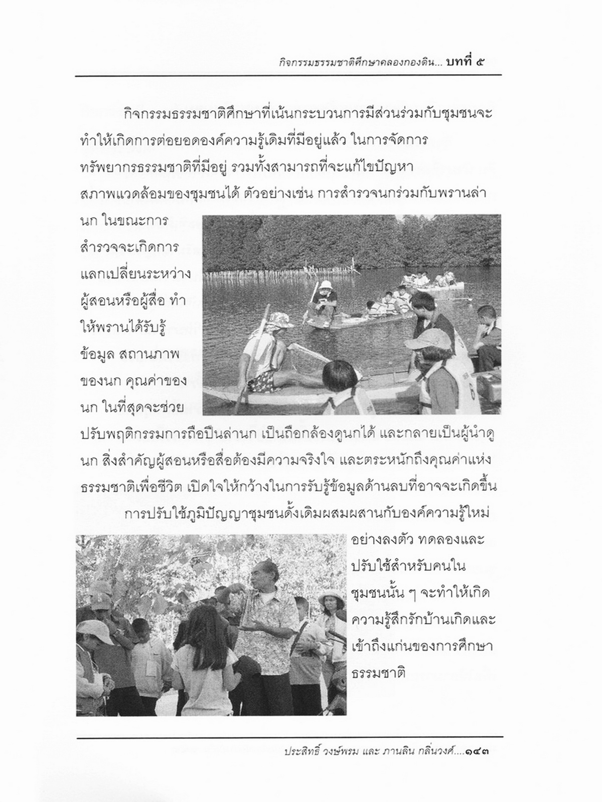 - เนื้อหาแบ่งออกเป็น 5 บท คือบทที่1บทนำ บทที่2ข้อมูลพื้นฐานของบ้านกองดิน บทที่3ภูมิปัญญาชุมชนในการจัดการทรัพยากรธรรมชาติคลองกองดิน บทที่4ทรัพยากรชีวภาพในคลองกองดิน บทที่5 กิจกรรมธรรมชาติ-ศึกษาคลองกองดิน และภาคผนวกเป็นดัชนีภาพและชนิดพันธ์ุ