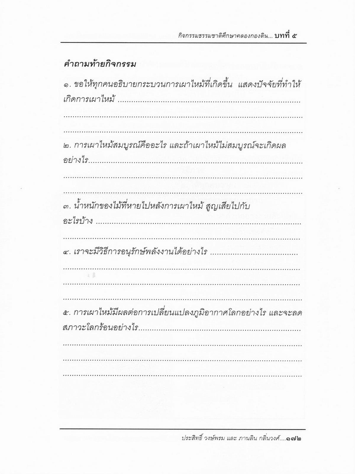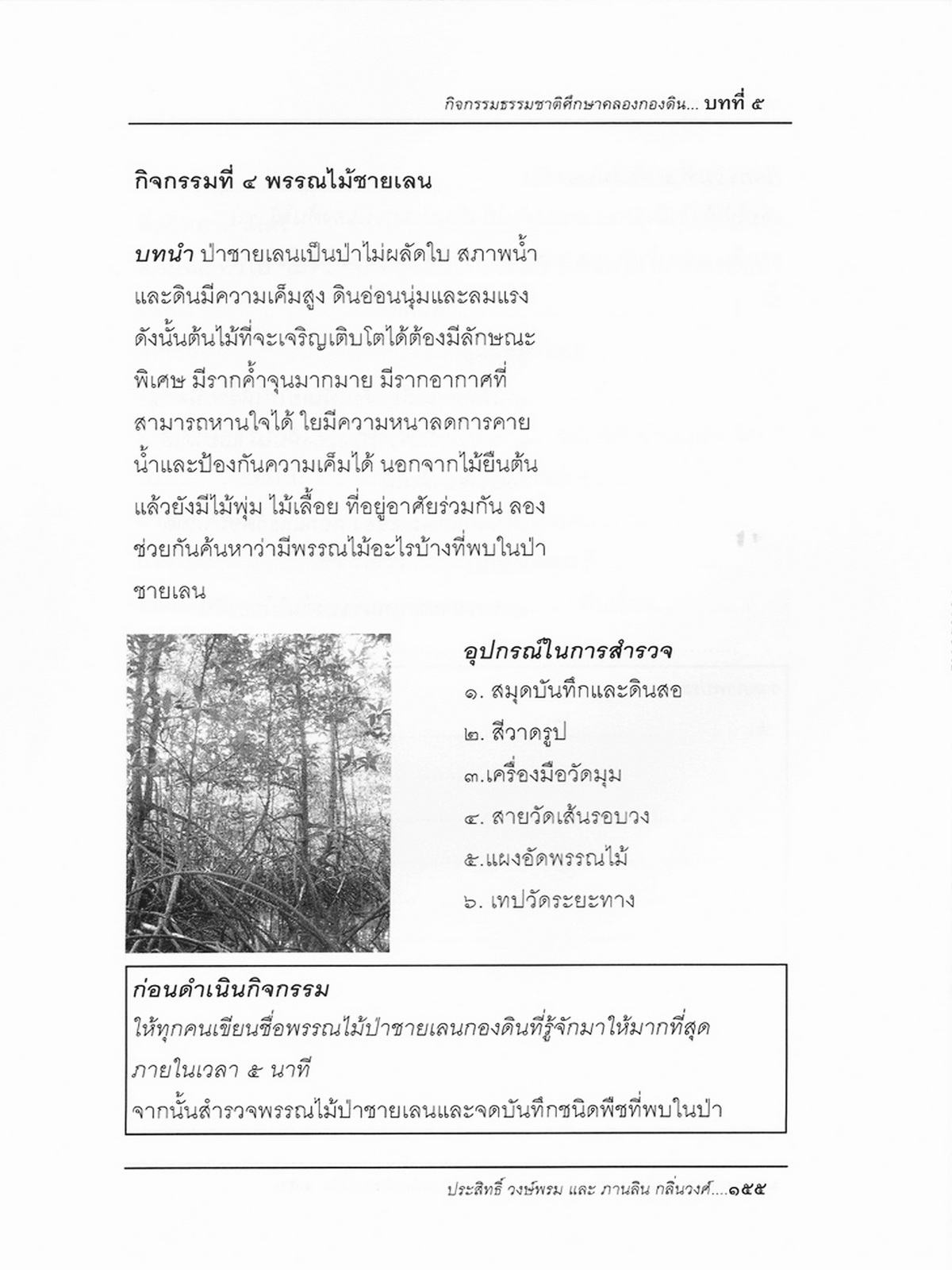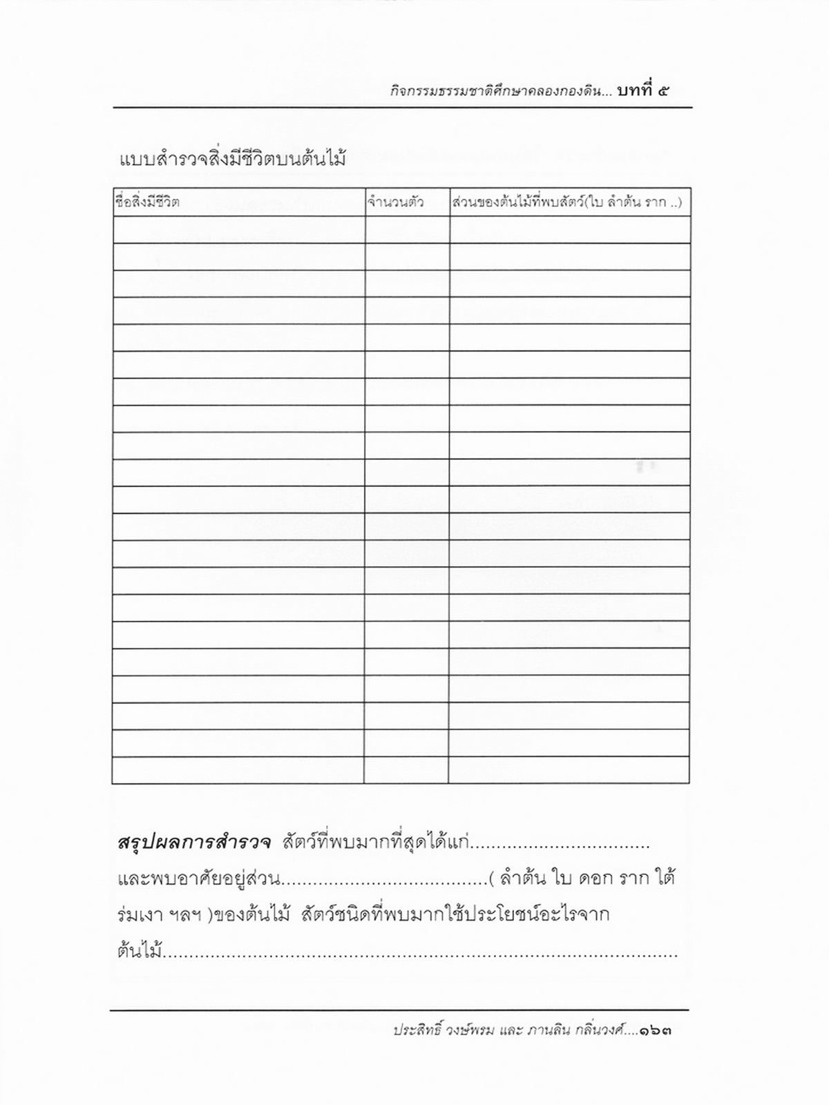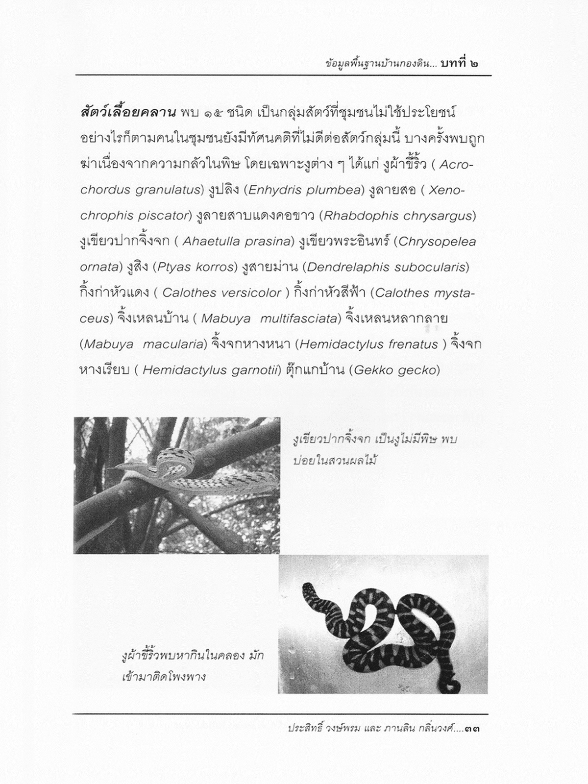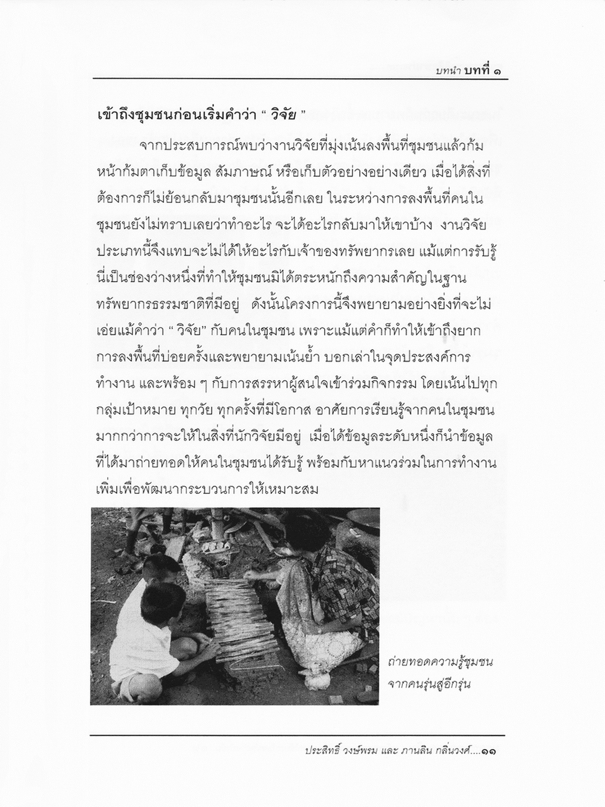 - เนื้อหาแบ่งออกเป็น 5 บท คือบทที่1บทนำ บทที่2ข้อมูลพื้นฐานของบ้านกองดิน บทที่3ภูมิปัญญาชุมชนในการจัดการทรัพยากรธรรมชาติคลองกองดิน บทที่4ทรัพยากรชีวภาพในคลองกองดิน บทที่5 กิจกรรมธรรมชาติ-ศึกษาคลองกองดิน และภาคผนวกเป็นดัชนีภาพและชนิดพันธ์ุ