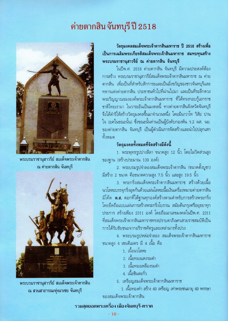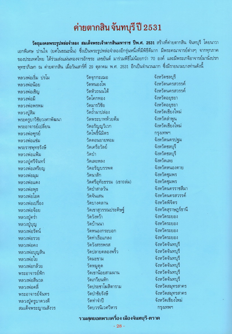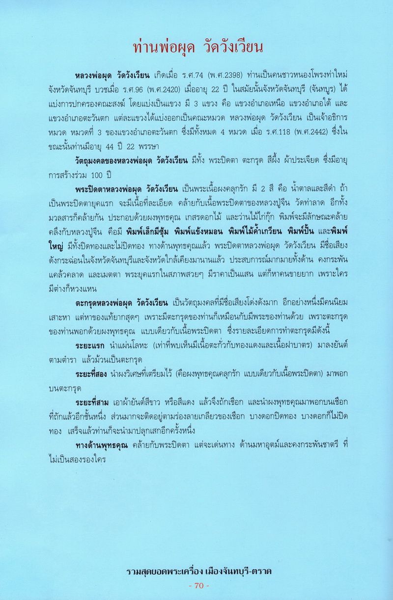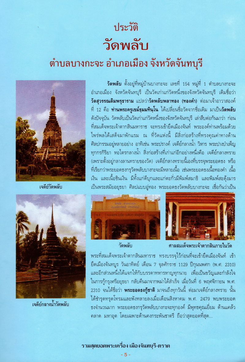 - มีเนื้อหาเกี่ยวกับประวัติจังหวัดจันทบุรี ประวัติวัดพลับ ตำบลบางกะจะ อำเภอเมือง จังหวัดจันทบุรี เหรียญสมเด็จพระเจ้าตากสินมหาราช ปี 2517 ค่ายตากสิน จันทบุรี ปี 2518 ค่ายตากสิน จันทบุรี ปี 2531 พระวิสุทธิธรรมรังสีคัมภีรเมธาจารย์ (ลี ธมมฺธโร) พระยอดธงวัดโบสถืเมืองจันทบุรี ท่านพ่อผุด วัดวังเวียน ท่านพ่อเชย อมโร วัดเขาเจ้าหลาว อำเภอท่าใหม่ จังหวัดจันทบุรี พระครุพิศิษฐ์ ปุญญาทร (จิ่ม) วัดไผ่ล้อม อำเภอท่าใหม่ จังหวัดจันทบุรี พระครุญาณวรกิจ(กล้วย) วัดหมูดุด อำเภอท่าใหม่ จังหวัดจันทบุรี ท่านพ่อใย สุวัฑฒิโก วัดมะขาม อำเภอมะขาม จังหวัดจันทบุรี ท่านพ่อสุ่น วัดแหลมสิงห์ อำเภอแหลมสิงห์ จังหวัดจันทบุรี ท่านพ่คง สุวณโณ วัดวังสรรพรส อำเภอขลุง จังหวัดจันทบุรี ประวัติจังหวัดตราด