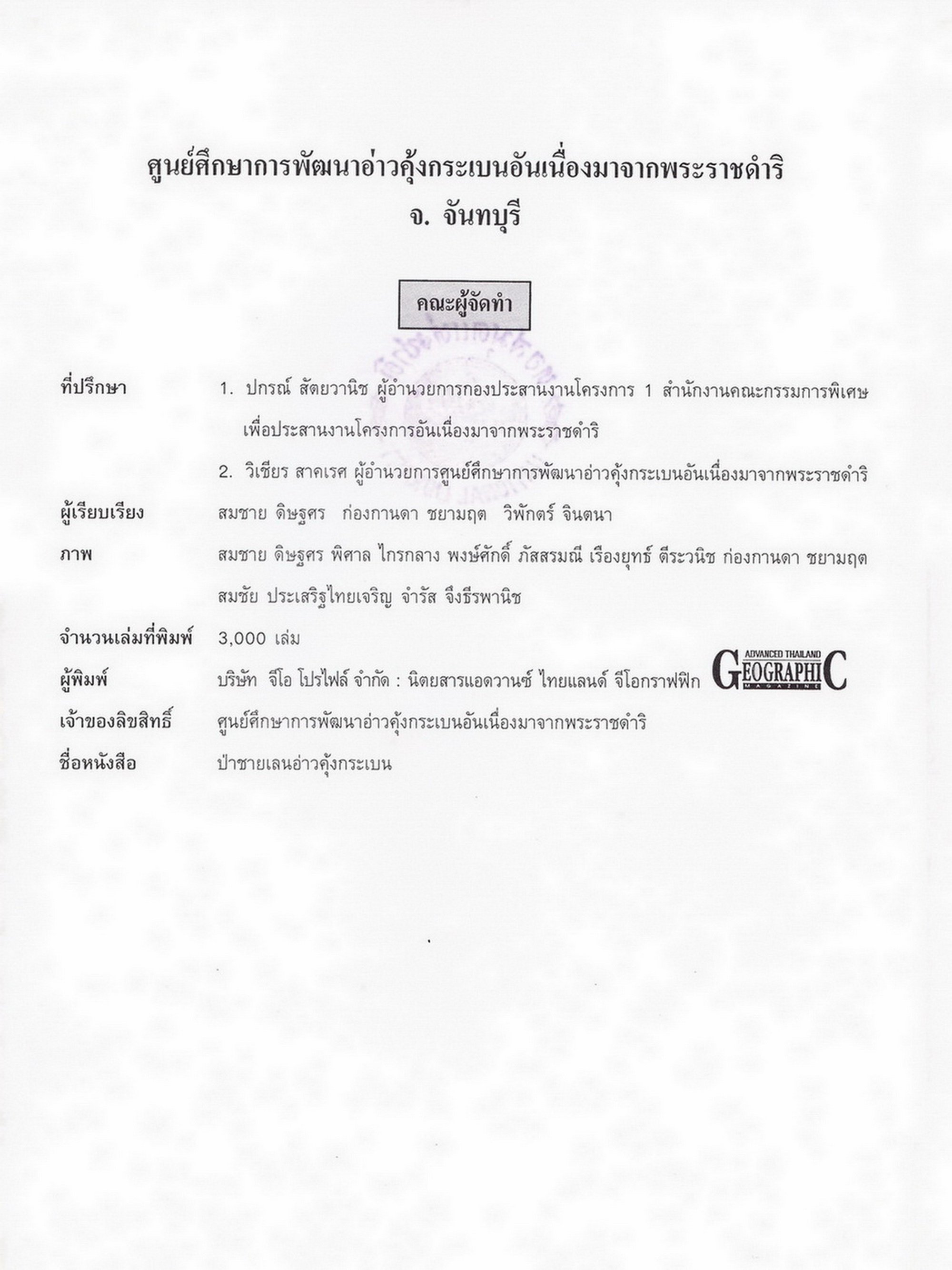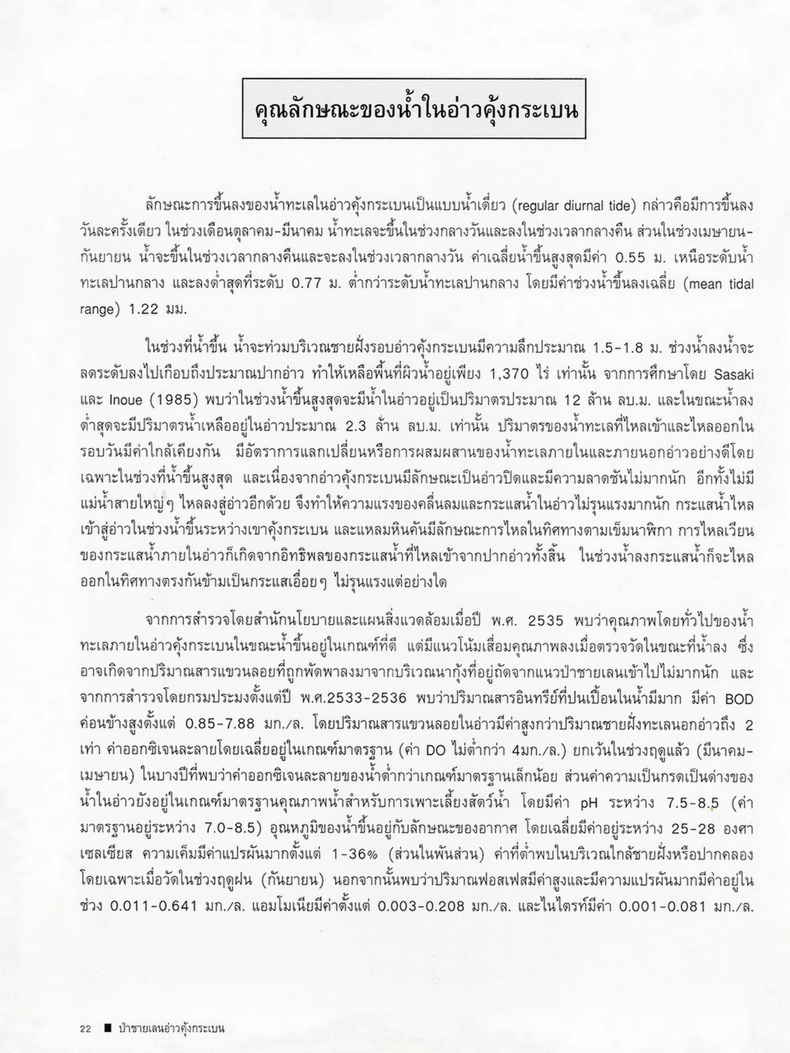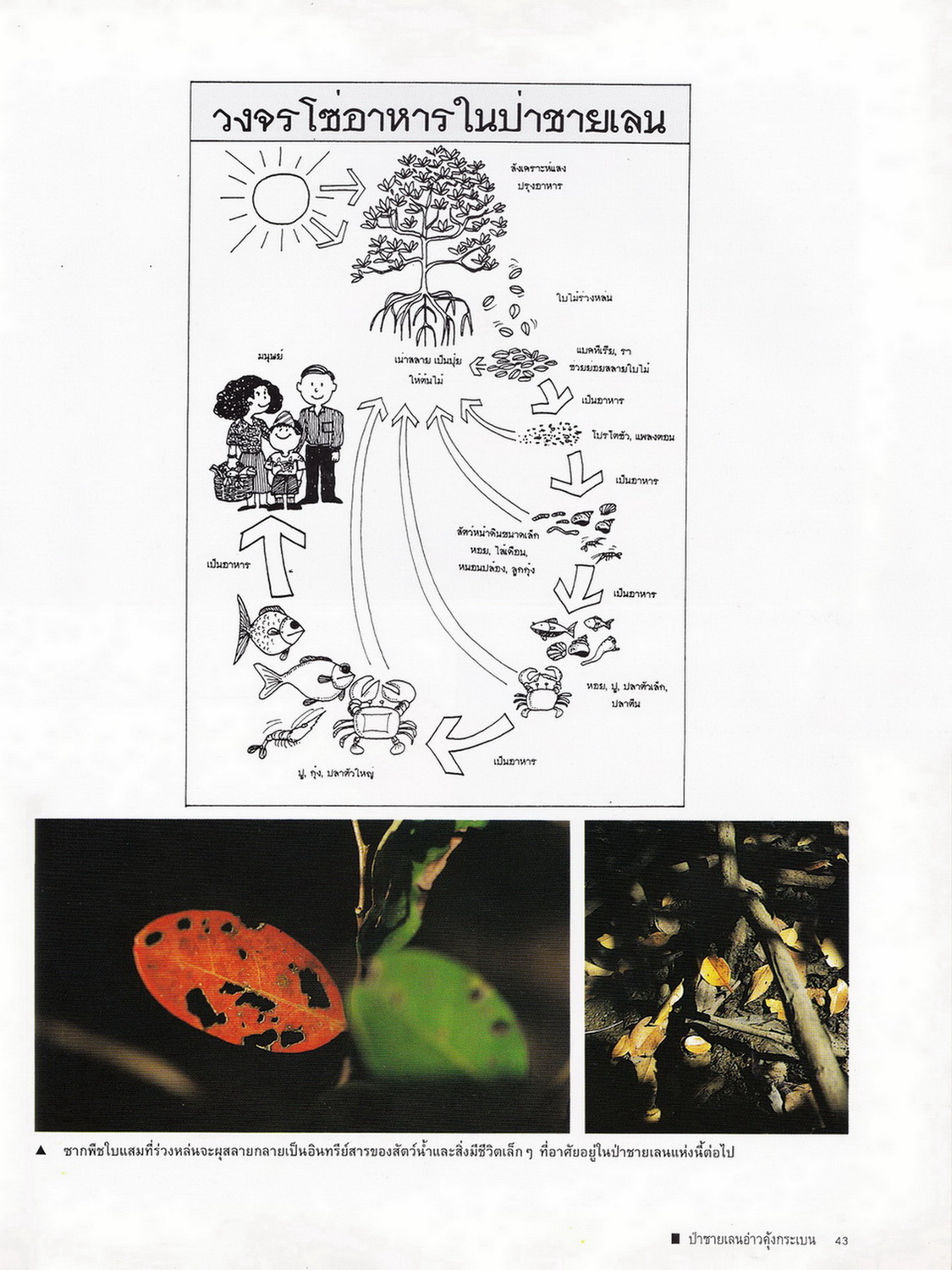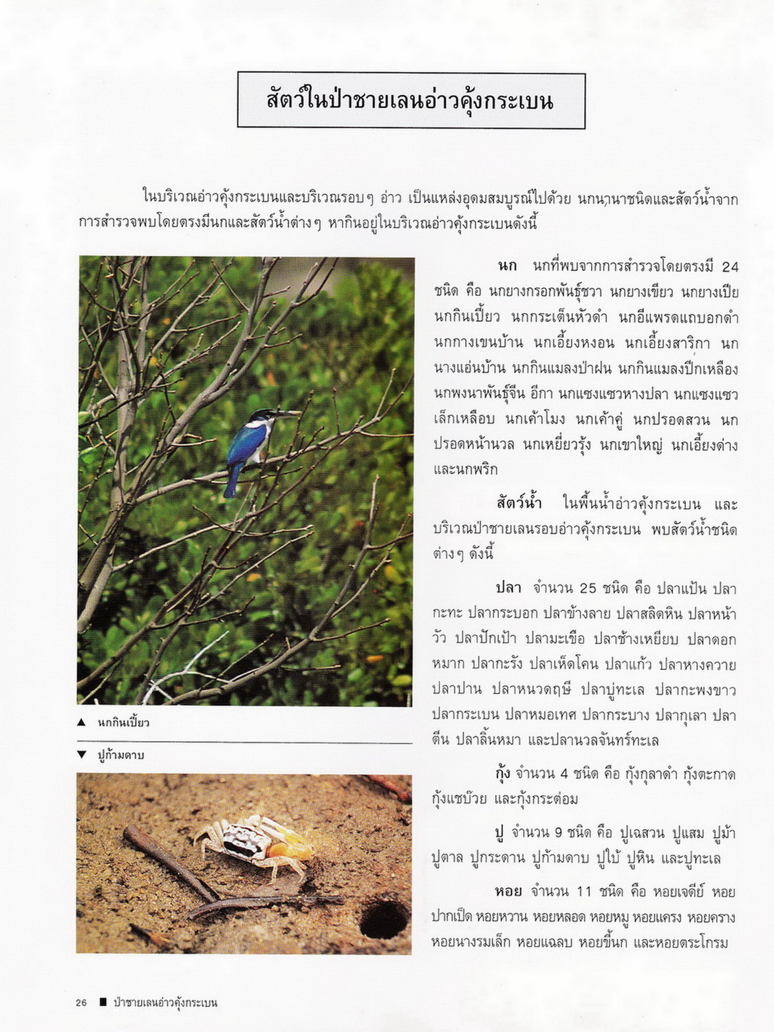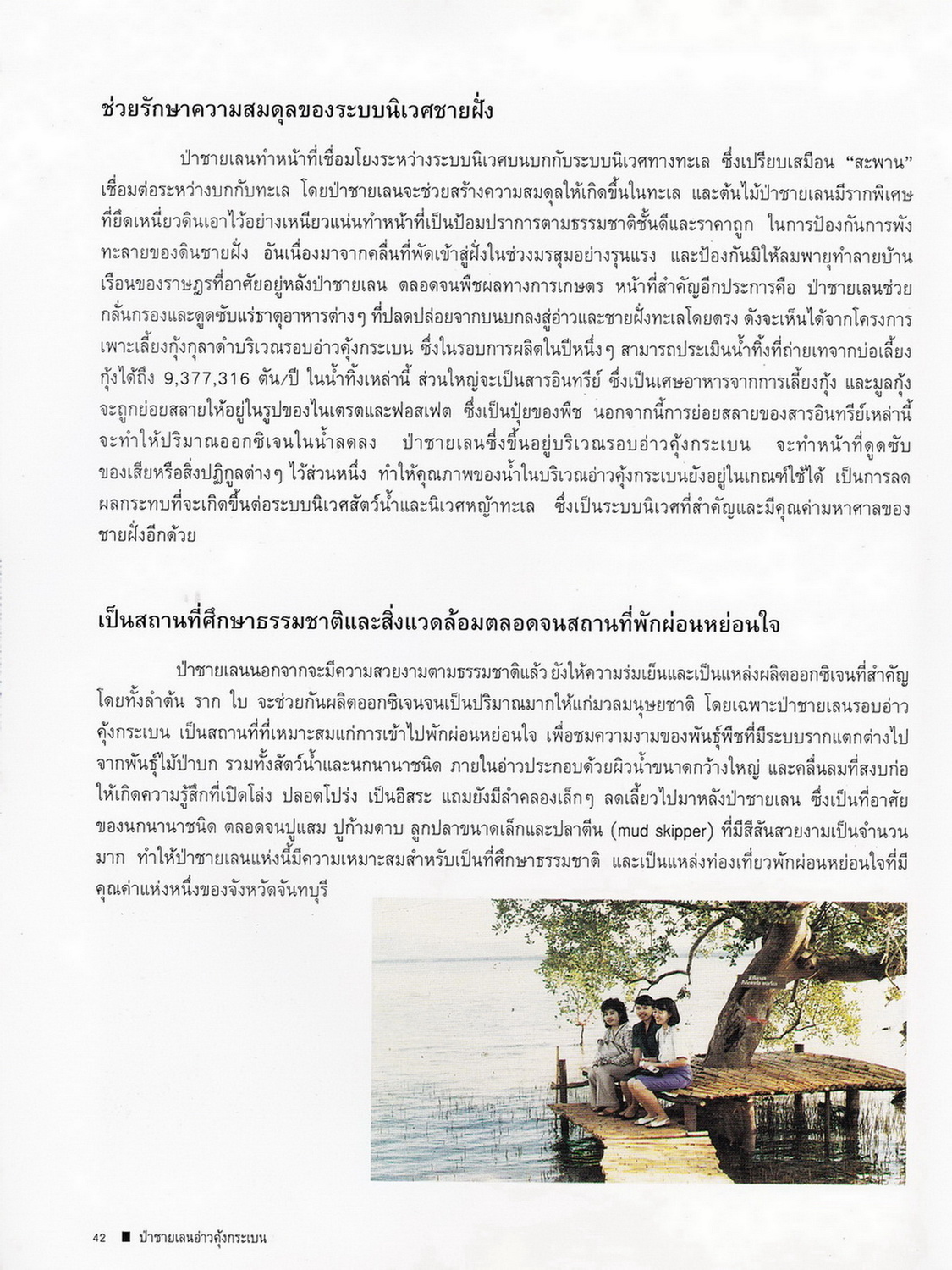 - ให้ข้อมูลของศูนย์ศึกษาการพัฒนาอ่าวคุ้งกระเบนอันเนื่องมาจากพระราชดำริ ในเรื่องความเป็นมา ที่ตั้ง สภาพภูมิประเทศ สภาพภูมิอากาศ ลักษณะโครงสร้างป่าชายเลนอ่าวคุ้งกระเบน คุณลักษณะของดิน -น้ำ -อากาศ สัตว์ พรรณไม้ ความสำคัญและประโยชน์ ปัญหาและผลกระทบ การอนุรักษและการจัดการ ท้ายเล่มมีภาคผนวกเป็นเรื่องพรรณไม้ป่าชายเลนพร้อมภาพถ่ายและภาพลายเส้น