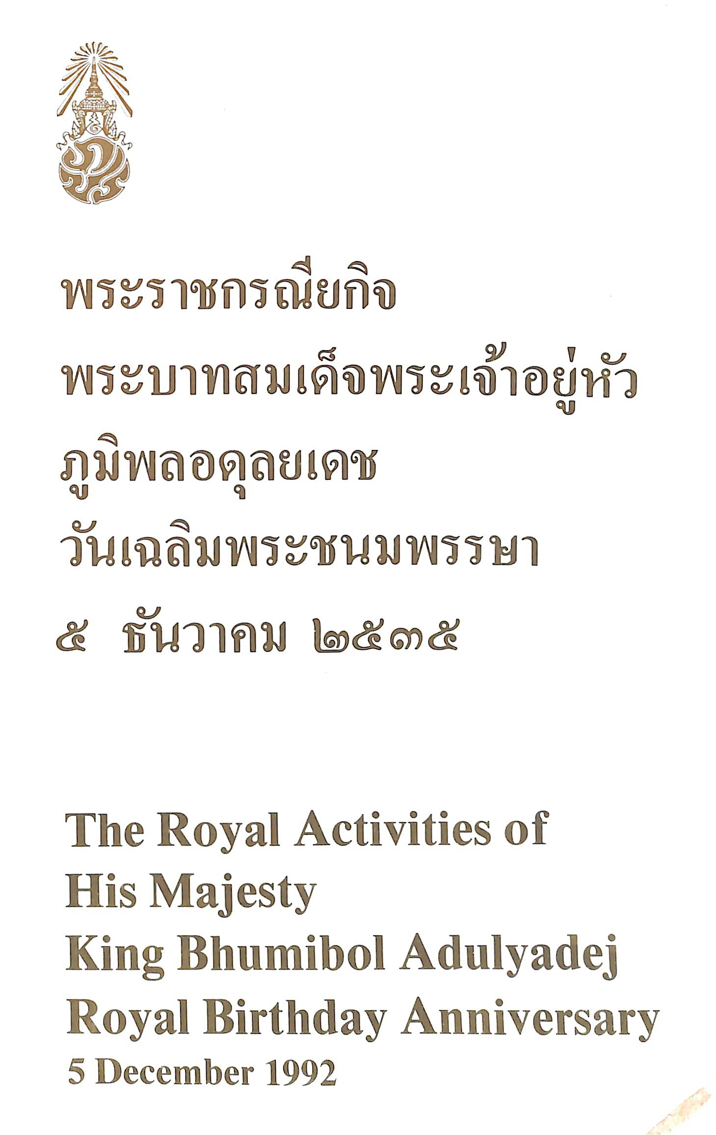 สำนักงานเสริมสร้างเอกลักษณ์ของชาติ สำนักเลขาธิการนายกรัฐมนตรี, “พระราชกรณียกิจ พระบาทสมเด็จพระเจ้าอยู่หัว ภูมิพลอดุลยเดช วันเฉลิมพระชนมพรรษา ๕ ธันวาคม ๒๕๓๕,” D-Library | National Library of Thailand, accessed April 2, 2026, http://164.115.27.97/digital2024/items/show/7273.