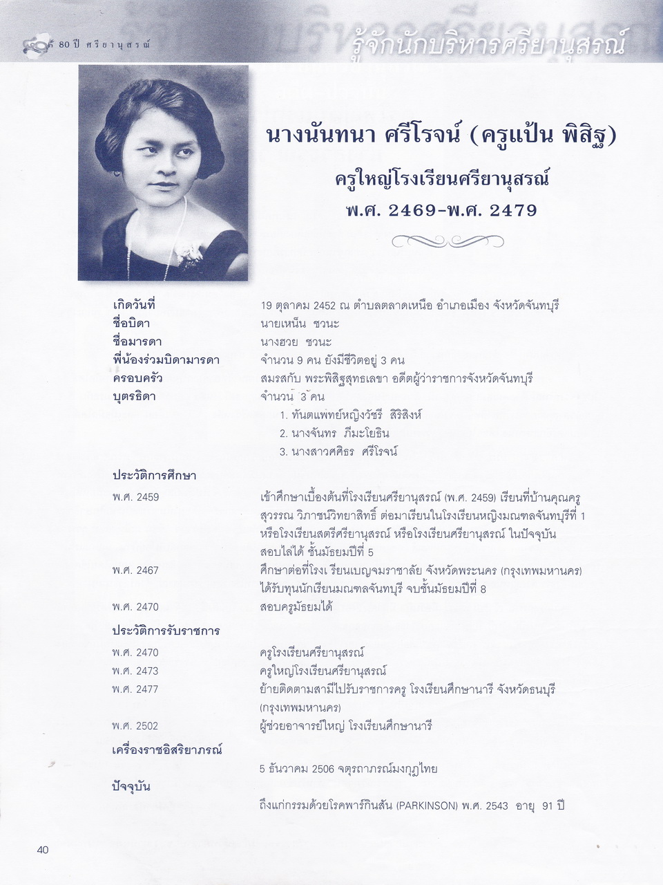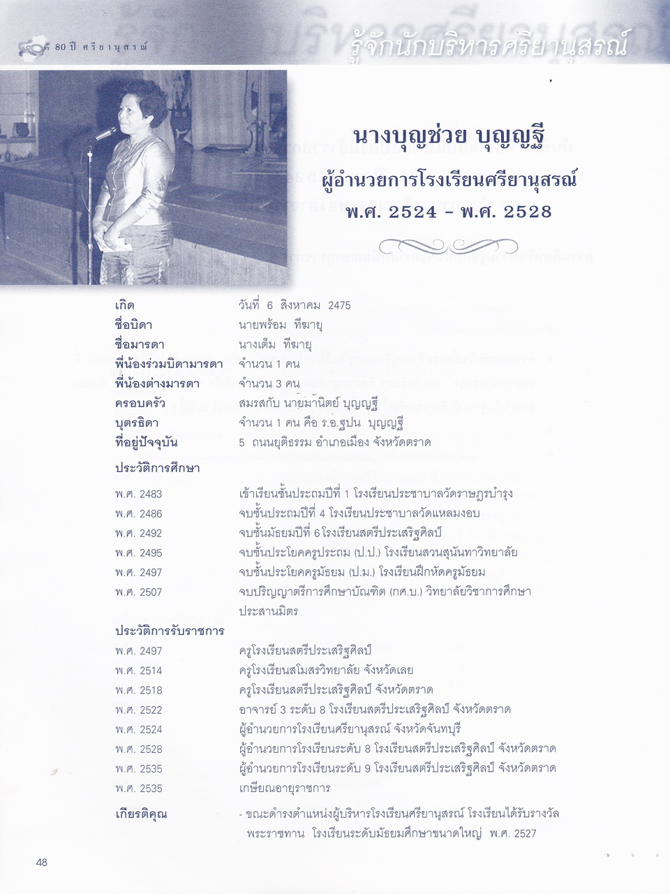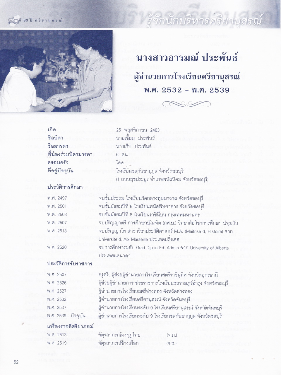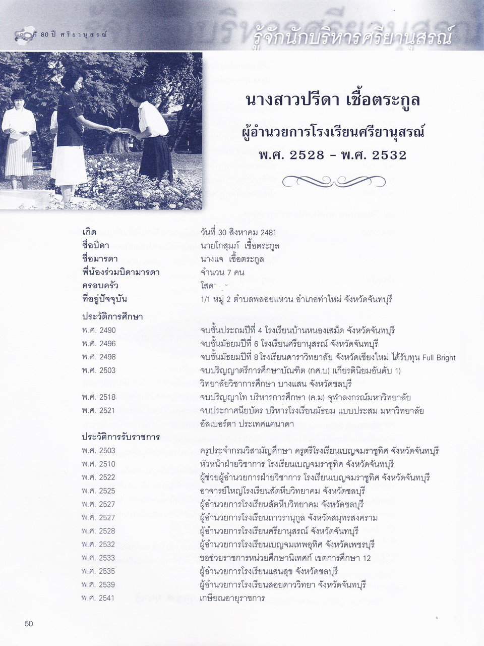 ศรียานุสรณ์, โรงเรียน, “ครบรอบการสถาปนา 80 ปี โรงเรียนศรียานุสรณ์ จันทบุรี,” D-Library | National Library of Thailand, accessed April 2, 2026, http://164.115.27.97/digital2024/items/show/7319.