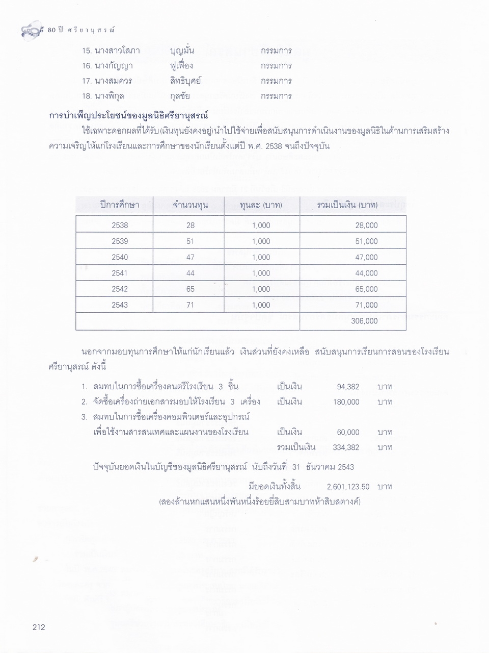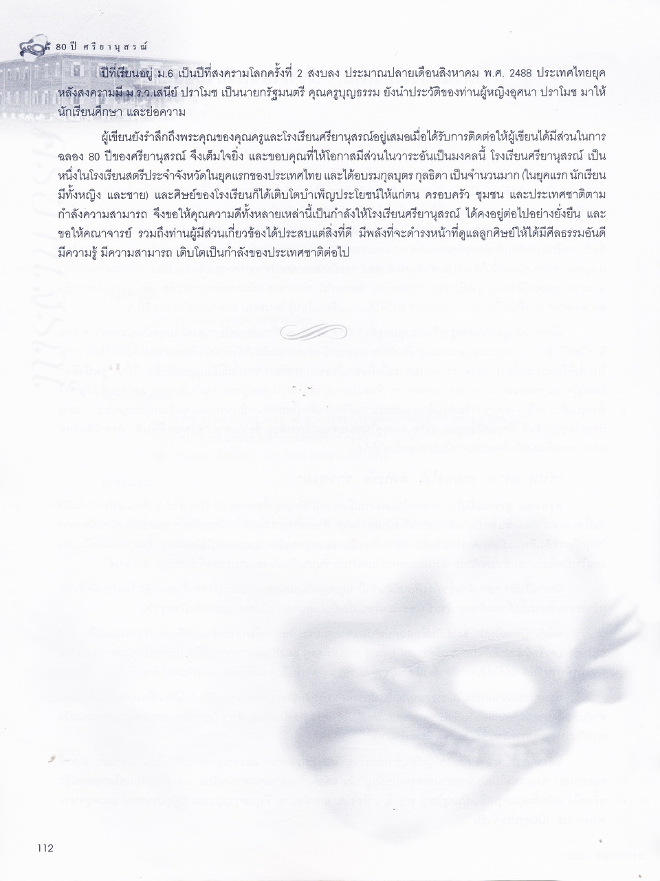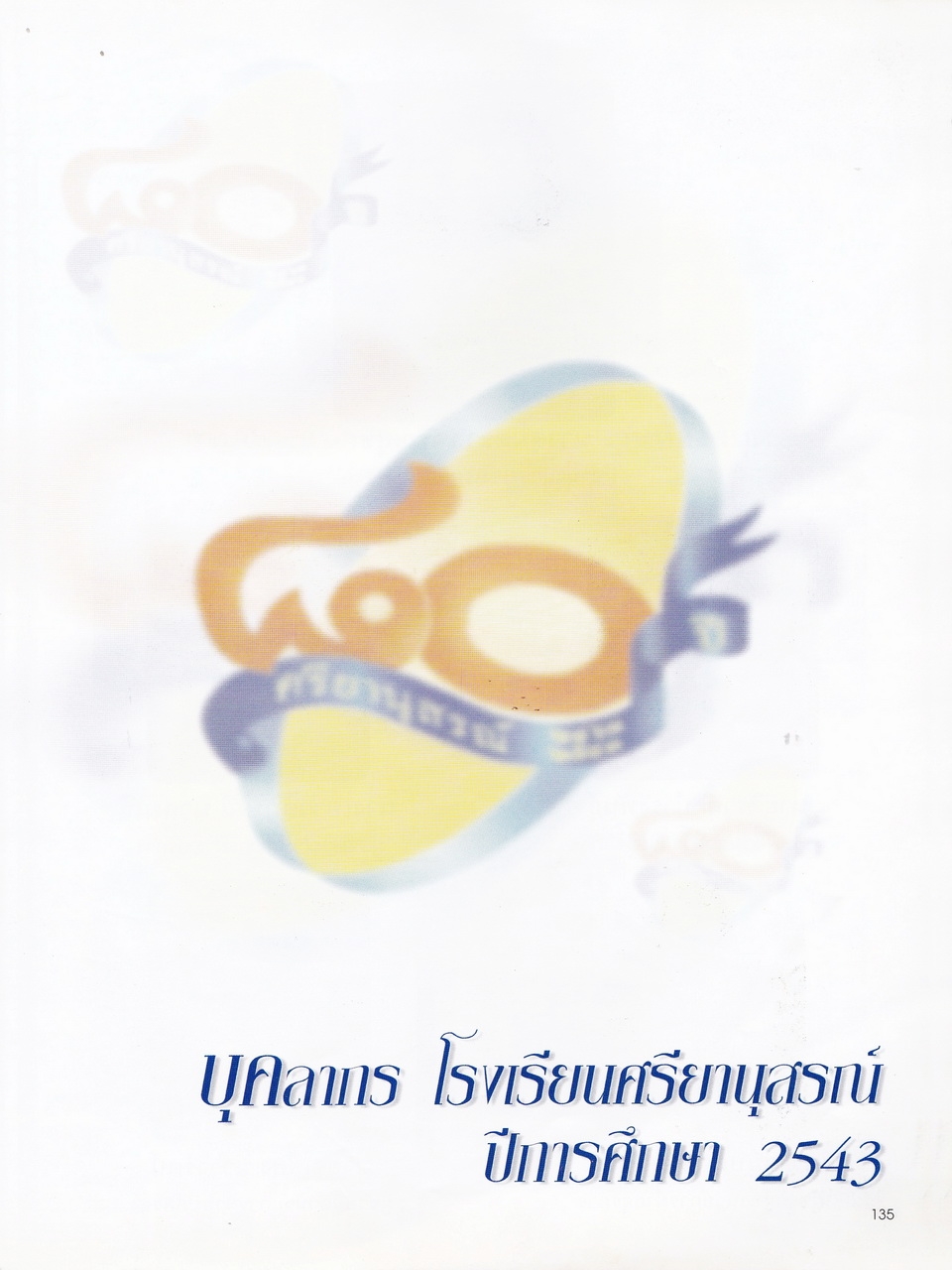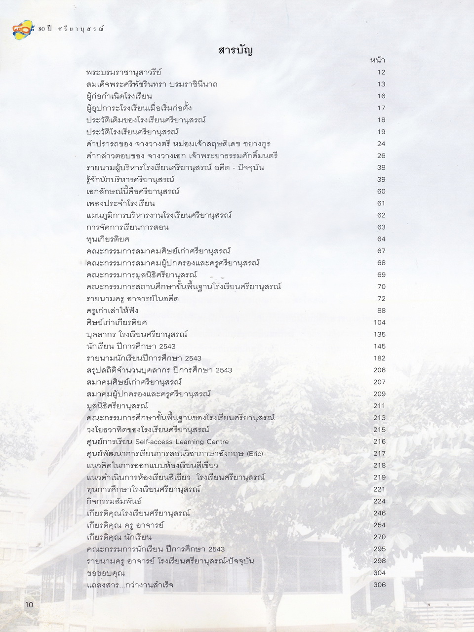 - มีเนื้อหาในเรื่อง พระบรมราชานุสาวรีย์สมเด็จพระสรีพัชรินทราฯ บรมราชินีนาถ ผู้ก่อกำเนิดโรงเรียนผู้อุกการะโรงเรียนเมื่อเริ่มก่อตั้ง ประวัติเดิมของโรงเรียนศรียานุสรณ์ คำปรารถของจางวางตรีหม่องเจ้าสฤษดิเดช ชยางกรู คำกล่าวตอบของจางวางเอกเจ้าพระยาธรรมศักดิ์มนตรี รายนามผู้บริการโรงเรียน อดีต-ปัจจุบัน รู้จักนักบริหารศรียานุสรณ์ เอกลักษณ์ เพลงประจำโรงเรียน แผนภูมิการบริหารโรงเรียน การจัดการเรียนการสอน ทุนเกียรติยศ คณะกรรมการศิษย์เก่า คณะกรรมการผู้ปกครอง คณะกรรมการมูลนิธิ คณะกรรมการสถานศึกษาขั้นพื้นฐาน รายนามครู-อาจารย์ในอดีต ครูเก่าเล่าให้ฟัง ศิษย์เก่าเกียรติยศ บุคลากรโรงเรียน นักเรียนปี2543 รายนามนักเรียนปี2543 สรุปสถิติจำนวนบุคลากรปี2543 สมาคมศิษย์เก่า สมาคมผู้ปกครอง มูลนิธิ วงโยทวาทิตฯลฯ