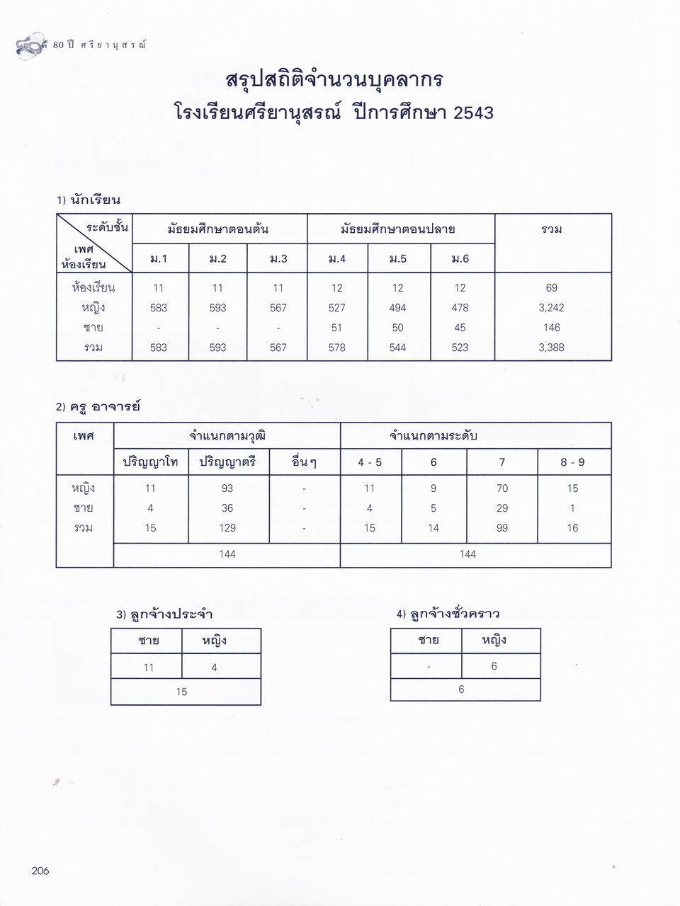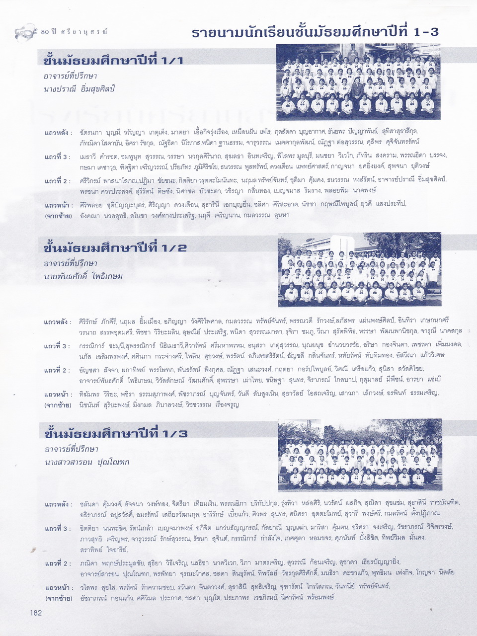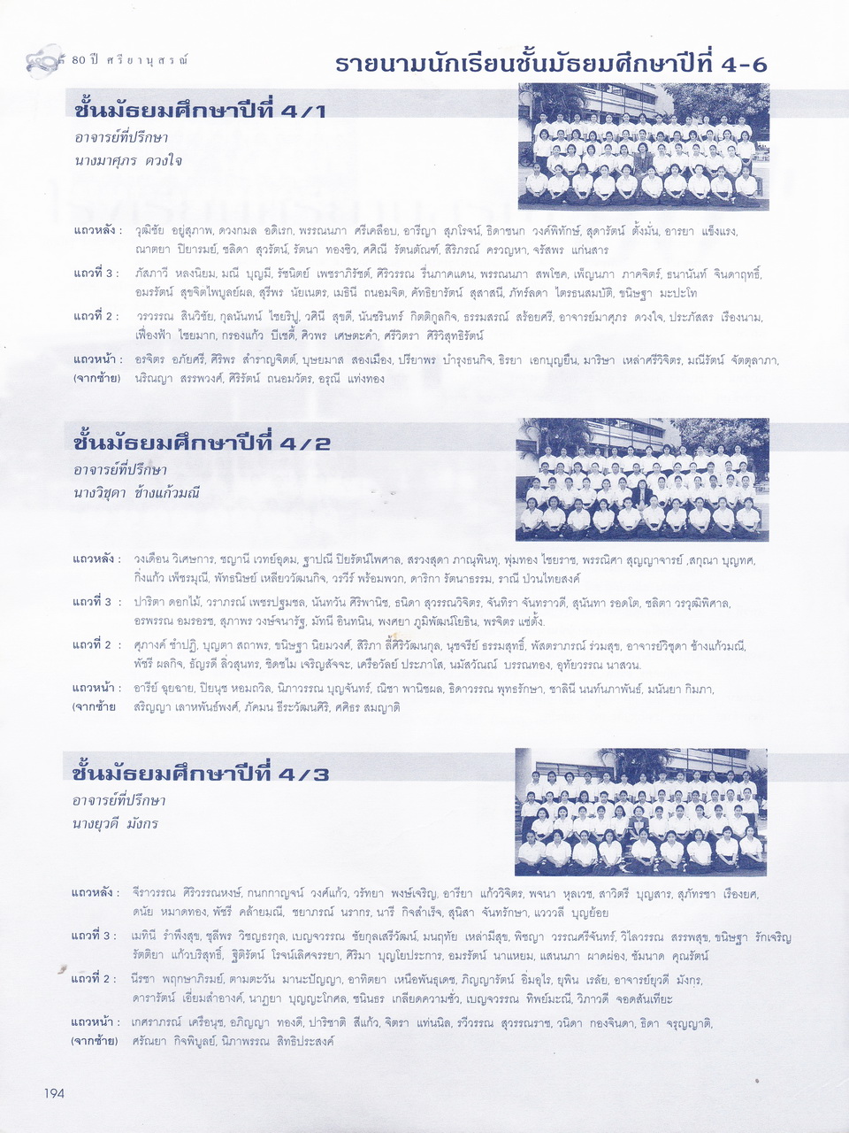 - มีเนื้อหาในเรื่อง พระบรมราชานุสาวรีย์สมเด็จพระสรีพัชรินทราฯ บรมราชินีนาถ ผู้ก่อกำเนิดโรงเรียนผู้อุกการะโรงเรียนเมื่อเริ่มก่อตั้ง ประวัติเดิมของโรงเรียนศรียานุสรณ์ คำปรารถของจางวางตรีหม่องเจ้าสฤษดิเดช ชยางกรู คำกล่าวตอบของจางวางเอกเจ้าพระยาธรรมศักดิ์มนตรี รายนามผู้บริการโรงเรียน อดีต-ปัจจุบัน รู้จักนักบริหารศรียานุสรณ์ เอกลักษณ์ เพลงประจำโรงเรียน แผนภูมิการบริหารโรงเรียน การจัดการเรียนการสอน ทุนเกียรติยศ คณะกรรมการศิษย์เก่า คณะกรรมการผู้ปกครอง คณะกรรมการมูลนิธิ คณะกรรมการสถานศึกษาขั้นพื้นฐาน รายนามครู-อาจารย์ในอดีต ครูเก่าเล่าให้ฟัง ศิษย์เก่าเกียรติยศ บุคลากรโรงเรียน นักเรียนปี2543 รายนามนักเรียนปี2543 สรุปสถิติจำนวนบุคลากรปี2543 สมาคมศิษย์เก่า สมาคมผู้ปกครอง มูลนิธิ วงโยทวาทิตฯลฯ