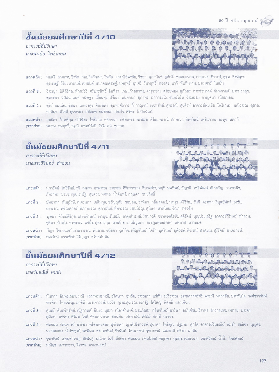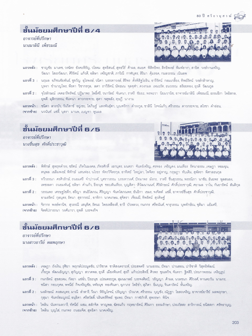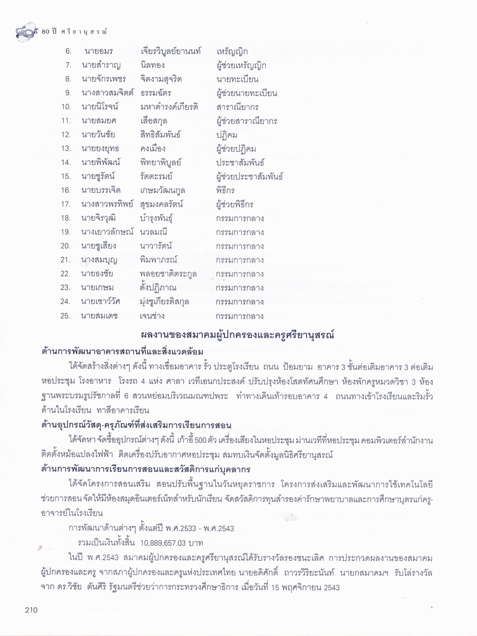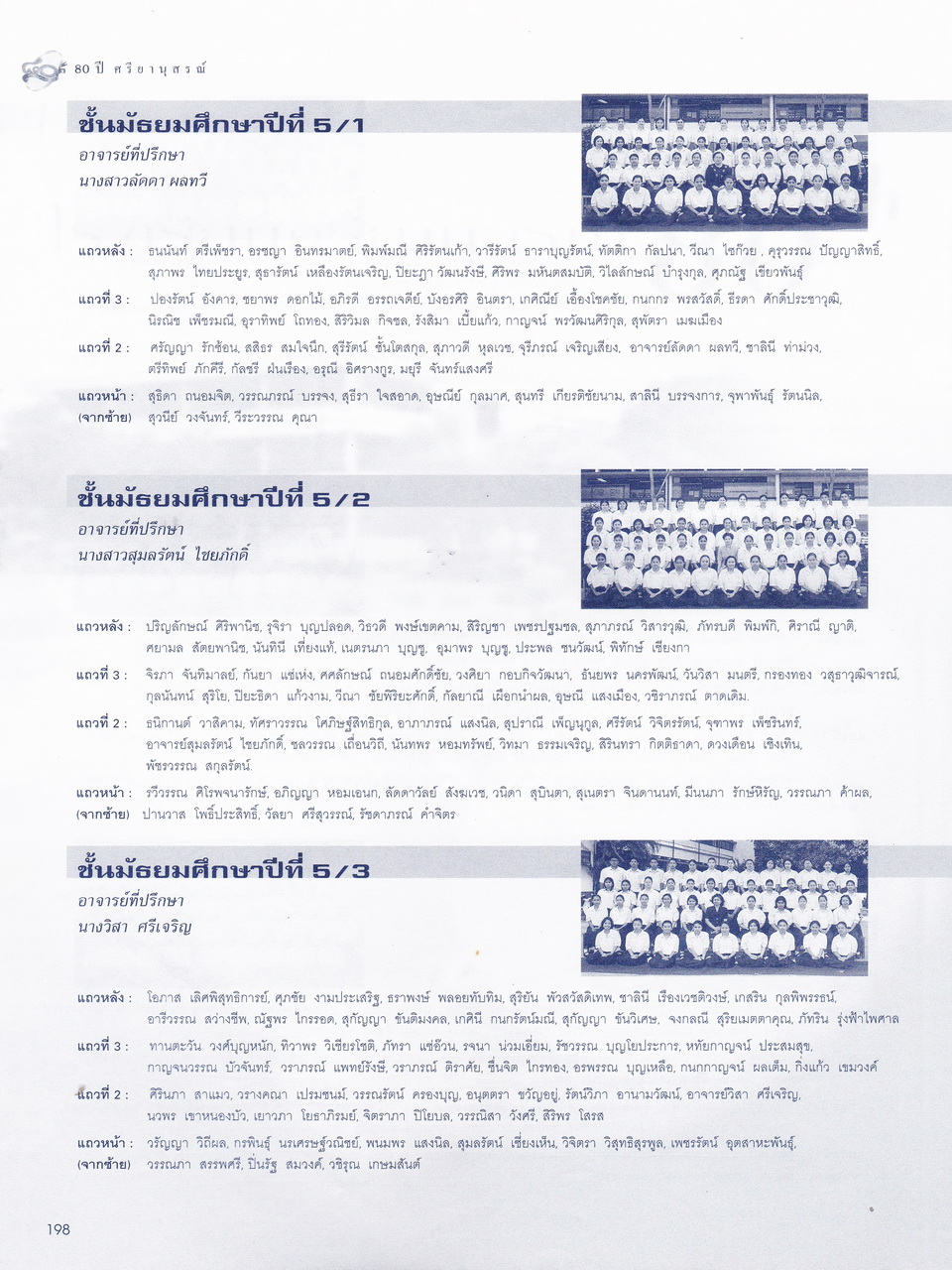 - มีเนื้อหาในเรื่อง พระบรมราชานุสาวรีย์สมเด็จพระสรีพัชรินทราฯ บรมราชินีนาถ ผู้ก่อกำเนิดโรงเรียนผู้อุกการะโรงเรียนเมื่อเริ่มก่อตั้ง ประวัติเดิมของโรงเรียนศรียานุสรณ์ คำปรารถของจางวางตรีหม่องเจ้าสฤษดิเดช ชยางกรู คำกล่าวตอบของจางวางเอกเจ้าพระยาธรรมศักดิ์มนตรี รายนามผู้บริการโรงเรียน อดีต-ปัจจุบัน รู้จักนักบริหารศรียานุสรณ์ เอกลักษณ์ เพลงประจำโรงเรียน แผนภูมิการบริหารโรงเรียน การจัดการเรียนการสอน ทุนเกียรติยศ คณะกรรมการศิษย์เก่า คณะกรรมการผู้ปกครอง คณะกรรมการมูลนิธิ คณะกรรมการสถานศึกษาขั้นพื้นฐาน รายนามครู-อาจารย์ในอดีต ครูเก่าเล่าให้ฟัง ศิษย์เก่าเกียรติยศ บุคลากรโรงเรียน นักเรียนปี2543 รายนามนักเรียนปี2543 สรุปสถิติจำนวนบุคลากรปี2543 สมาคมศิษย์เก่า สมาคมผู้ปกครอง มูลนิธิ วงโยทวาทิตฯลฯ