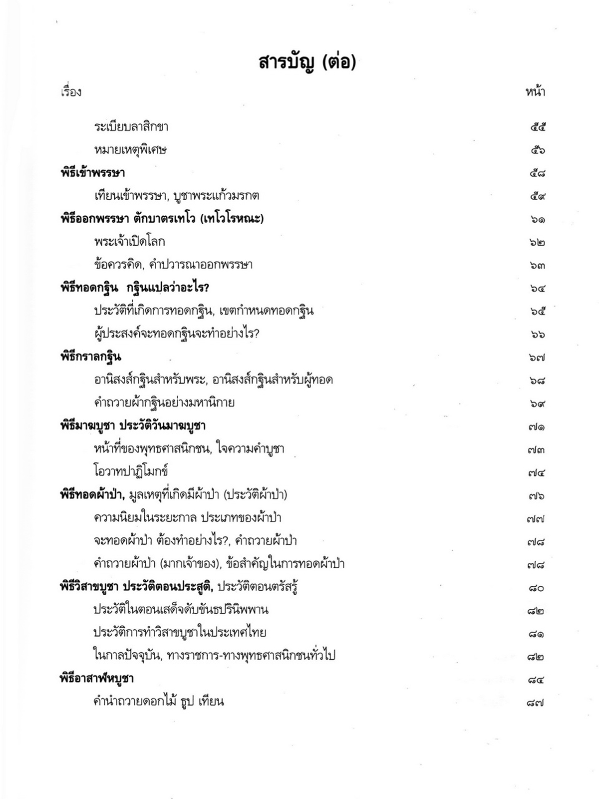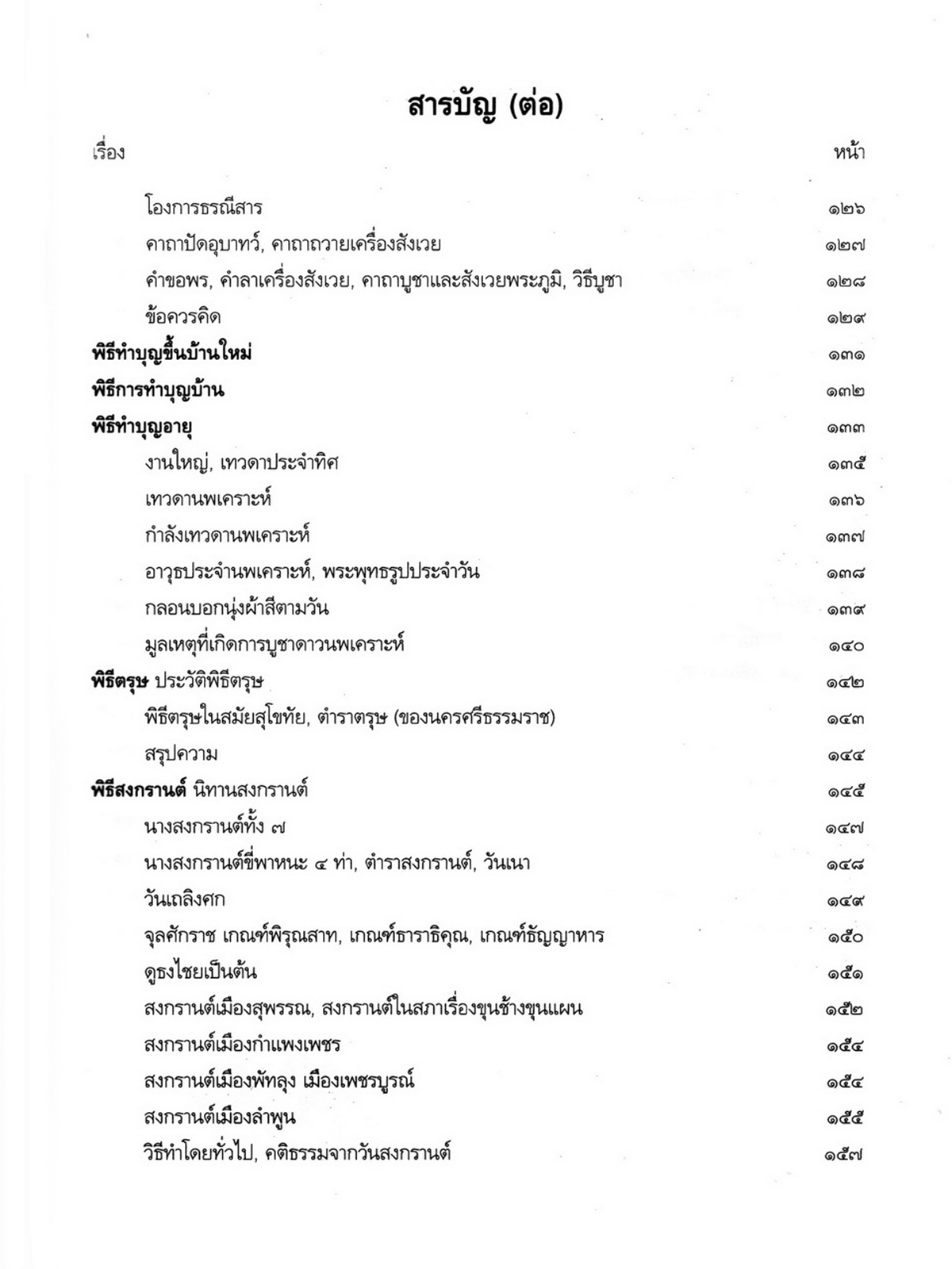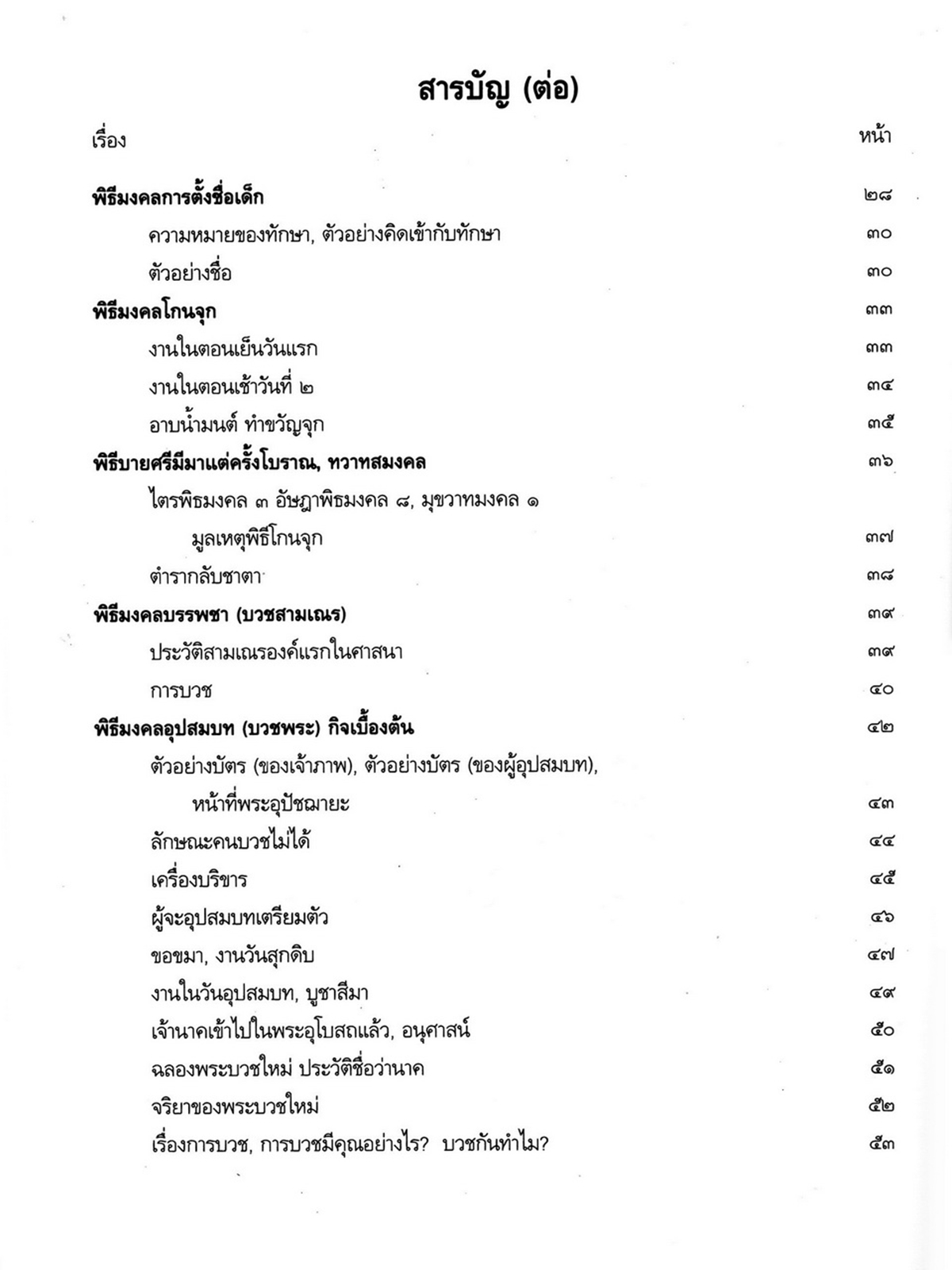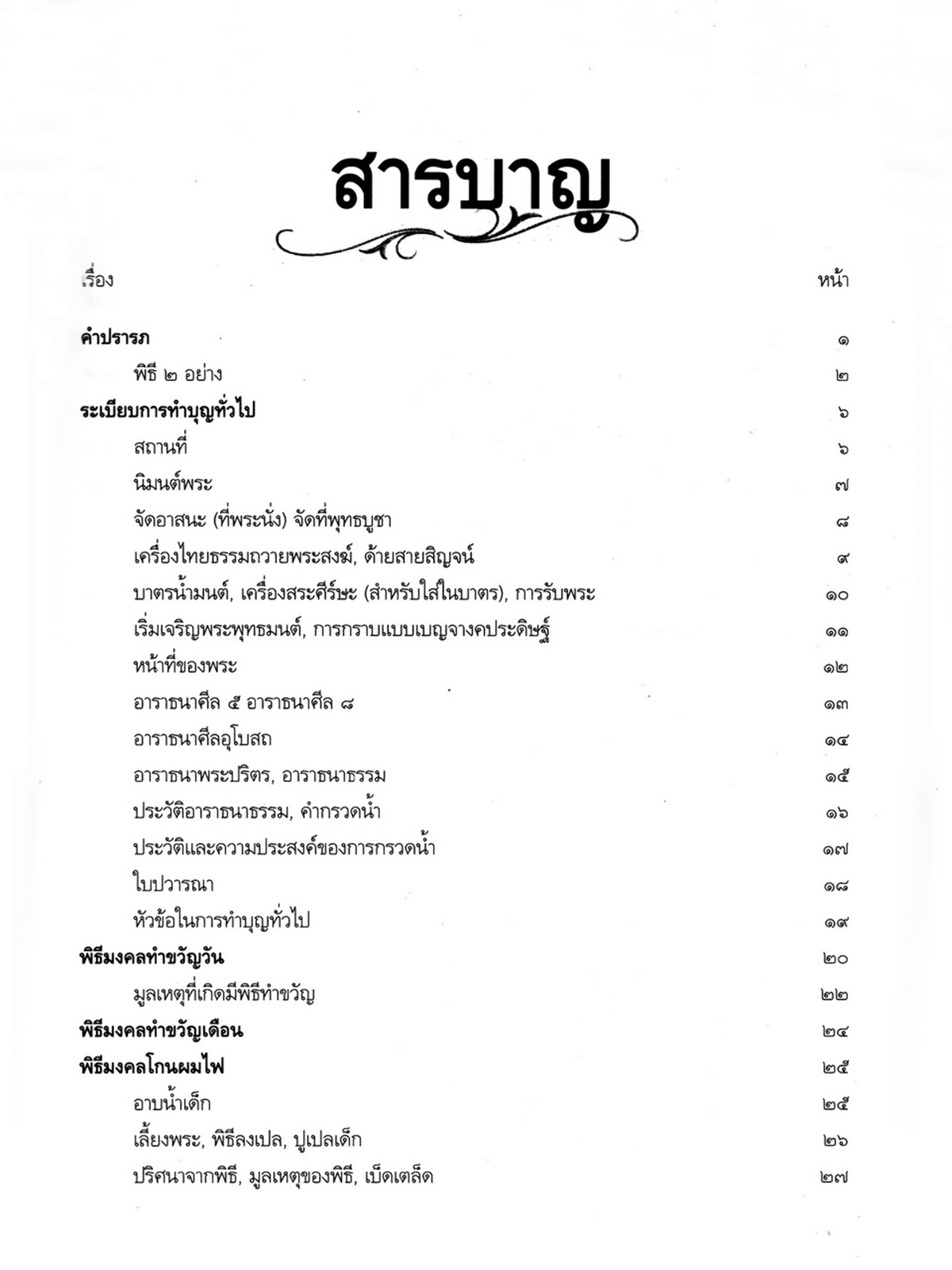 - เริ่มเรื่องเป็นประวัติของพระราชจันทโมลี(ประเสริฐ วิมโล)และต่อด้วย เรื่องประมวลพิธีมงคลไทย ได้แก่ ระเบียบการทำบุญทั่วไป พิธีมงคลทำขวัญวัน -เดือน พิธีมงคลโกนผมไฟ พิธีมงคลการตั้งชื่อ พิธีมงคลโกนจุก พิธีบายศรี พิธีมงคลบรรพชา พิธีมงคลอุปสมบท พิธีเข้าพรรษา พิธีออกพรรษา พิธีทอดกฐิน พิธีกราลกฐินพิธีมาฆบูชา พิธีทอดผ้าป่า พิธีวิสาขบูชา พิธีอาสาฬหบูชา พิธีมงคลแต่งงาน พิธีปลูกบ้าน พิธีตั้งศาลพระภูมิ พิธีทำขวัญขึ้นบ้านใหม่ พิธีการทำบุญบ้าน พิธีทำบุญอายุ พิธีตรุษ พิธีสงกรานต์ พิธีแรกนาขวัญ พิธีพืชมงคล พิธีสารท พิธีลอยกระทง พิธีทำบุญปีใหม่ พิธีสวดมนต์ พิธีทำบุญต่างๆ
