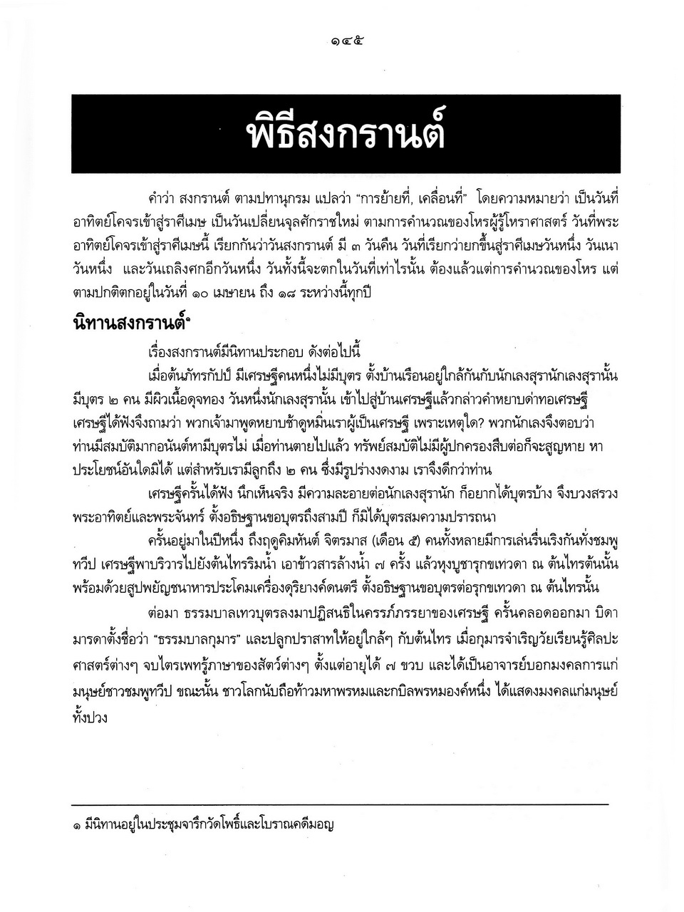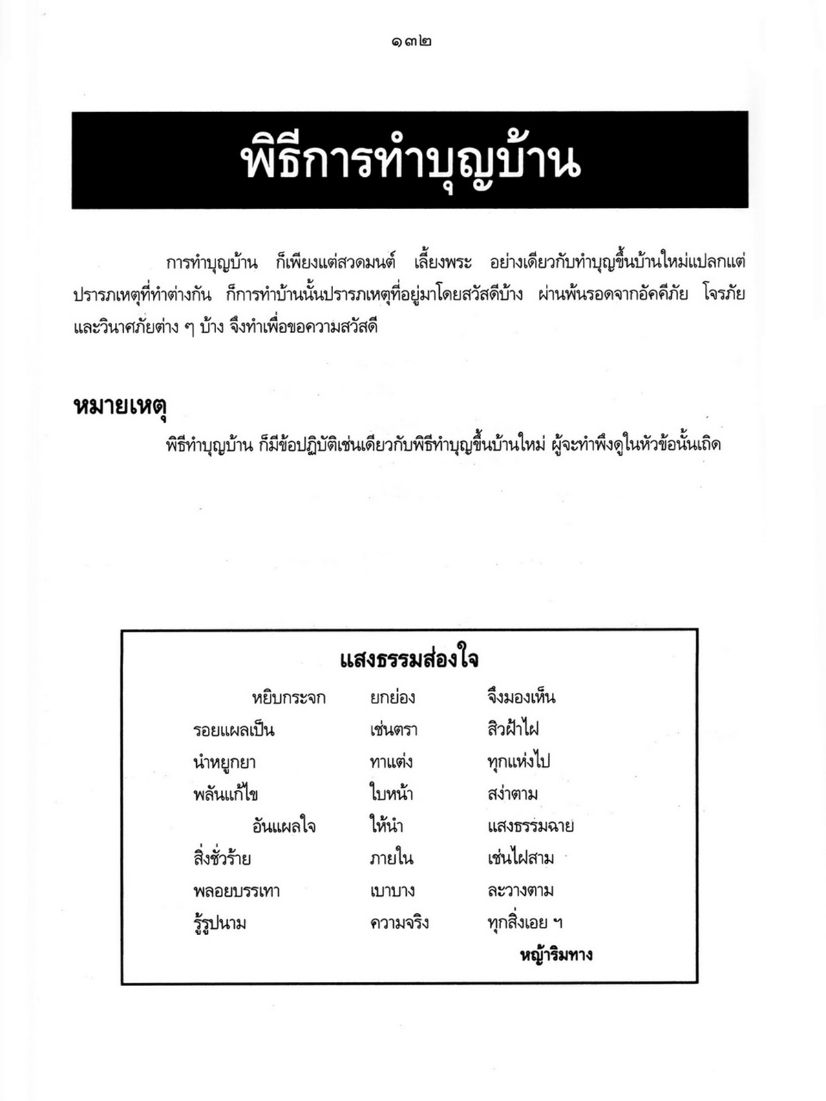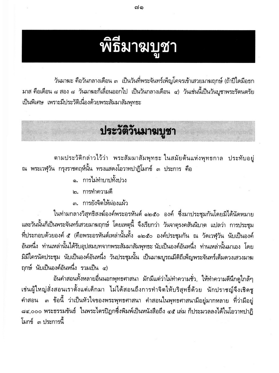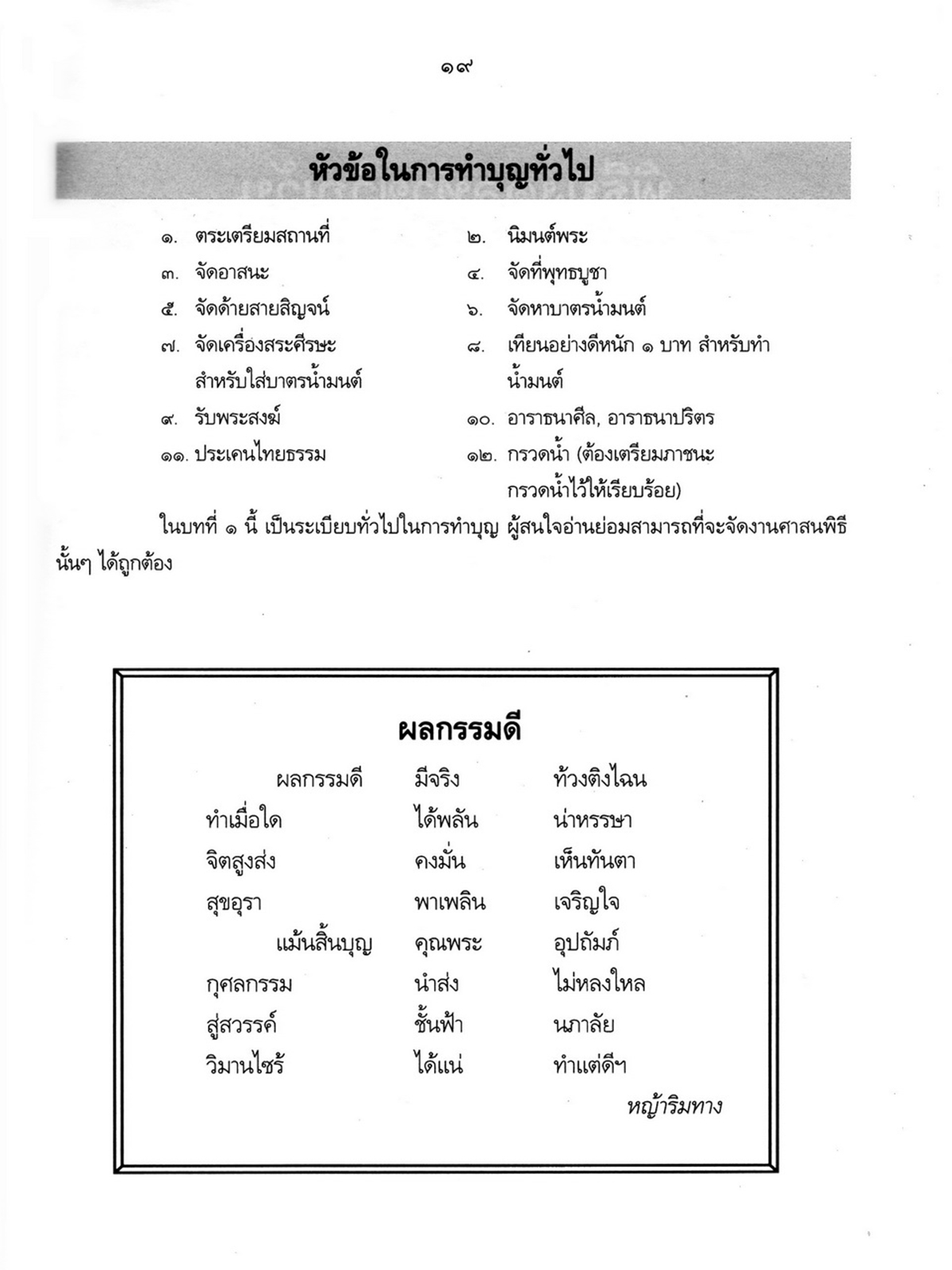 - เริ่มเรื่องเป็นประวัติของพระราชจันทโมลี(ประเสริฐ วิมโล)และต่อด้วย เรื่องประมวลพิธีมงคลไทย ได้แก่ ระเบียบการทำบุญทั่วไป พิธีมงคลทำขวัญวัน -เดือน พิธีมงคลโกนผมไฟ พิธีมงคลการตั้งชื่อ พิธีมงคลโกนจุก พิธีบายศรี พิธีมงคลบรรพชา พิธีมงคลอุปสมบท พิธีเข้าพรรษา พิธีออกพรรษา พิธีทอดกฐิน พิธีกราลกฐินพิธีมาฆบูชา พิธีทอดผ้าป่า พิธีวิสาขบูชา พิธีอาสาฬหบูชา พิธีมงคลแต่งงาน พิธีปลูกบ้าน พิธีตั้งศาลพระภูมิ พิธีทำขวัญขึ้นบ้านใหม่ พิธีการทำบุญบ้าน พิธีทำบุญอายุ พิธีตรุษ พิธีสงกรานต์ พิธีแรกนาขวัญ พิธีพืชมงคล พิธีสารท พิธีลอยกระทง พิธีทำบุญปีใหม่ พิธีสวดมนต์ พิธีทำบุญต่างๆ