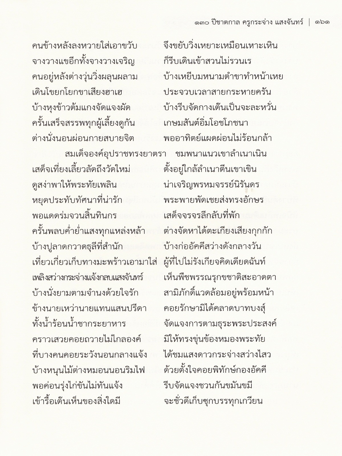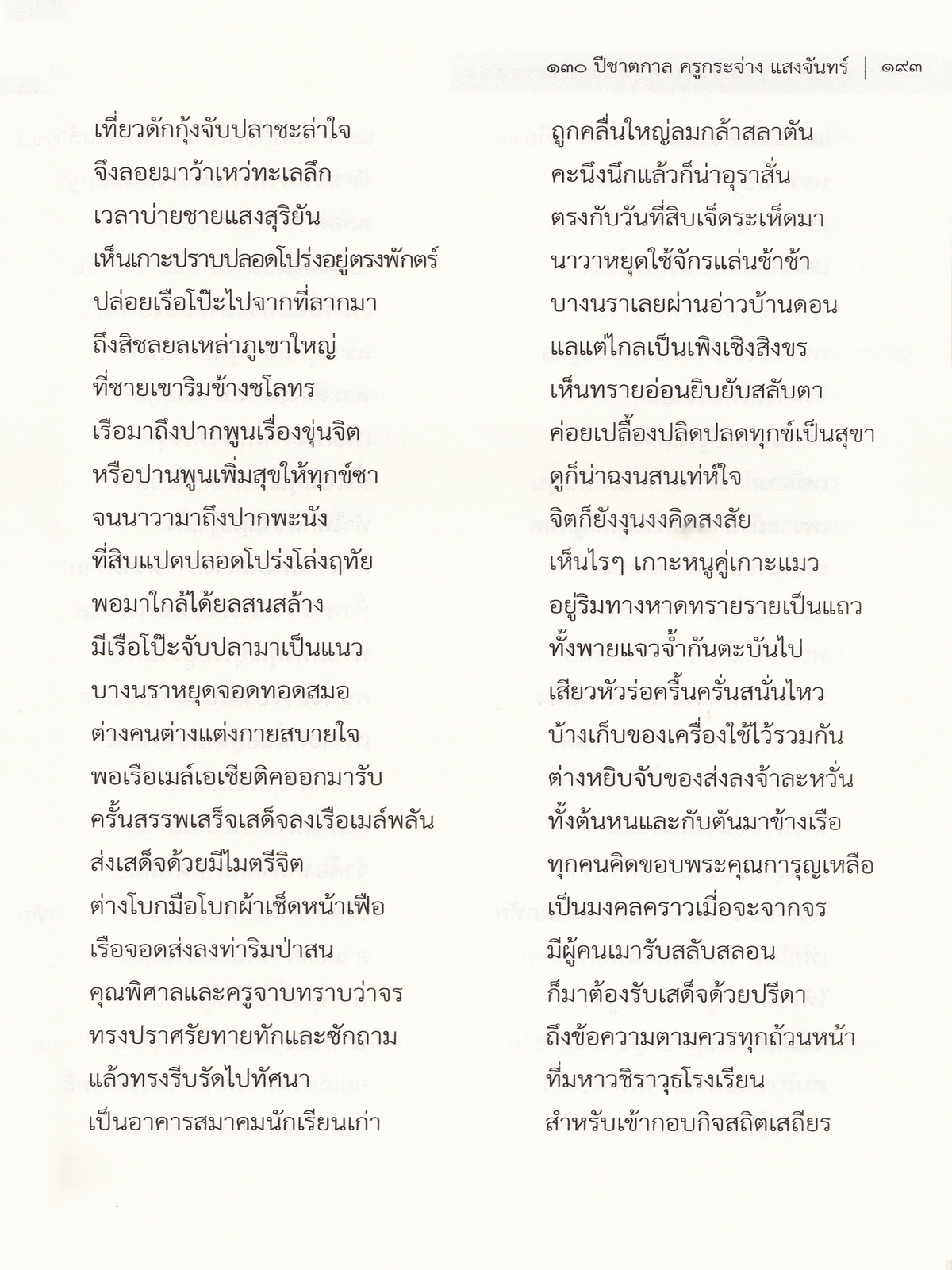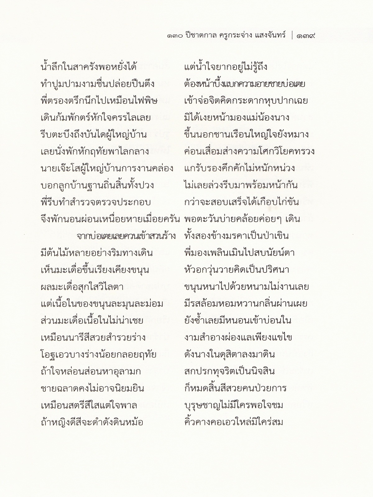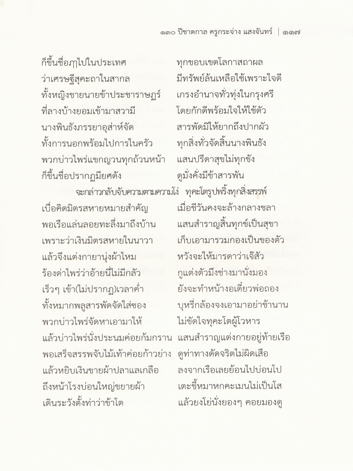 - เนื้อหาแบ่งออกเป็นหมวดๆ เริ่มจากบทนำเสนอชีวิตและผลงานของครูกระจ่าง แสงจันทร บุรพกวีจากบูรพทิศแห่งสยามประเทศ ชุมนุมนิราศและบทกวีของครูกระจ่าง แสงจันทร์ หมวดบทร้องเพลงไทย หมวดคำประพันธ์ที่ประพันธ์ในโอกาสต่างๆ หมวดนิทานคำกลอน หมวดนิราศคำกลอน ภาคผนวกเป็นรายงานตรวจราชการของหลวงคีรีเนมีทวีป ปลัดเมืองปัจจันตคีรีเขตร ร.ศ.121