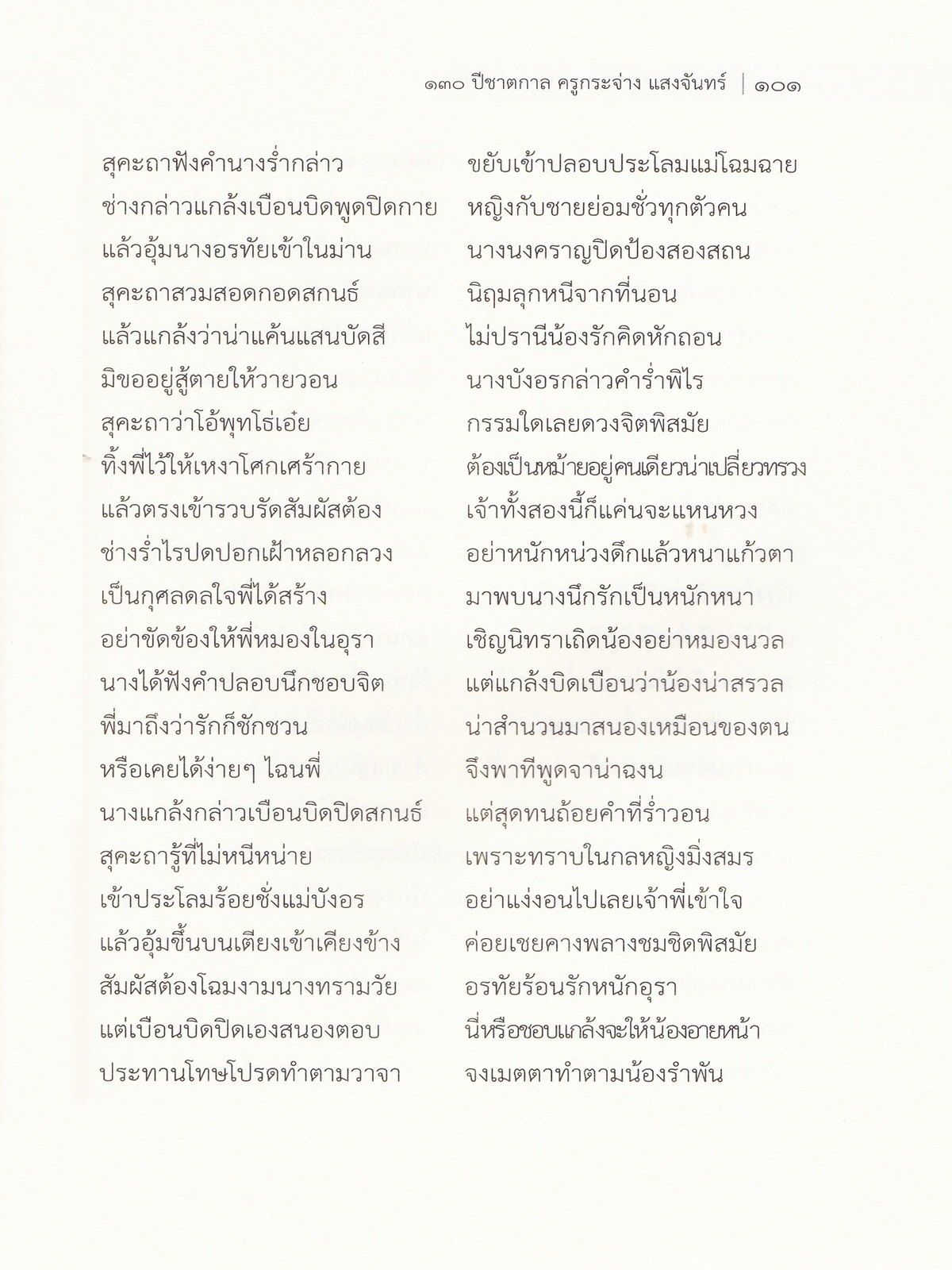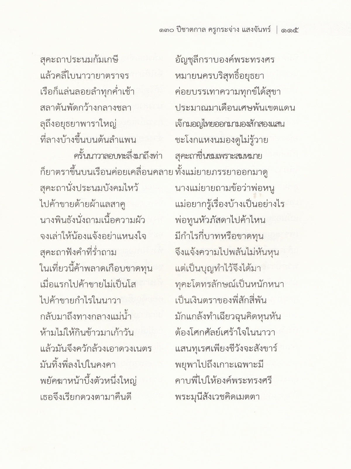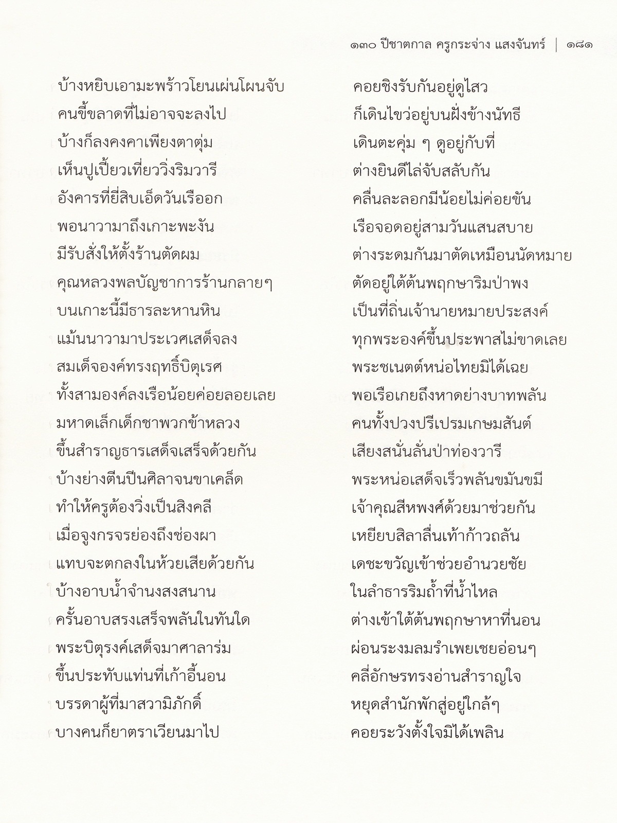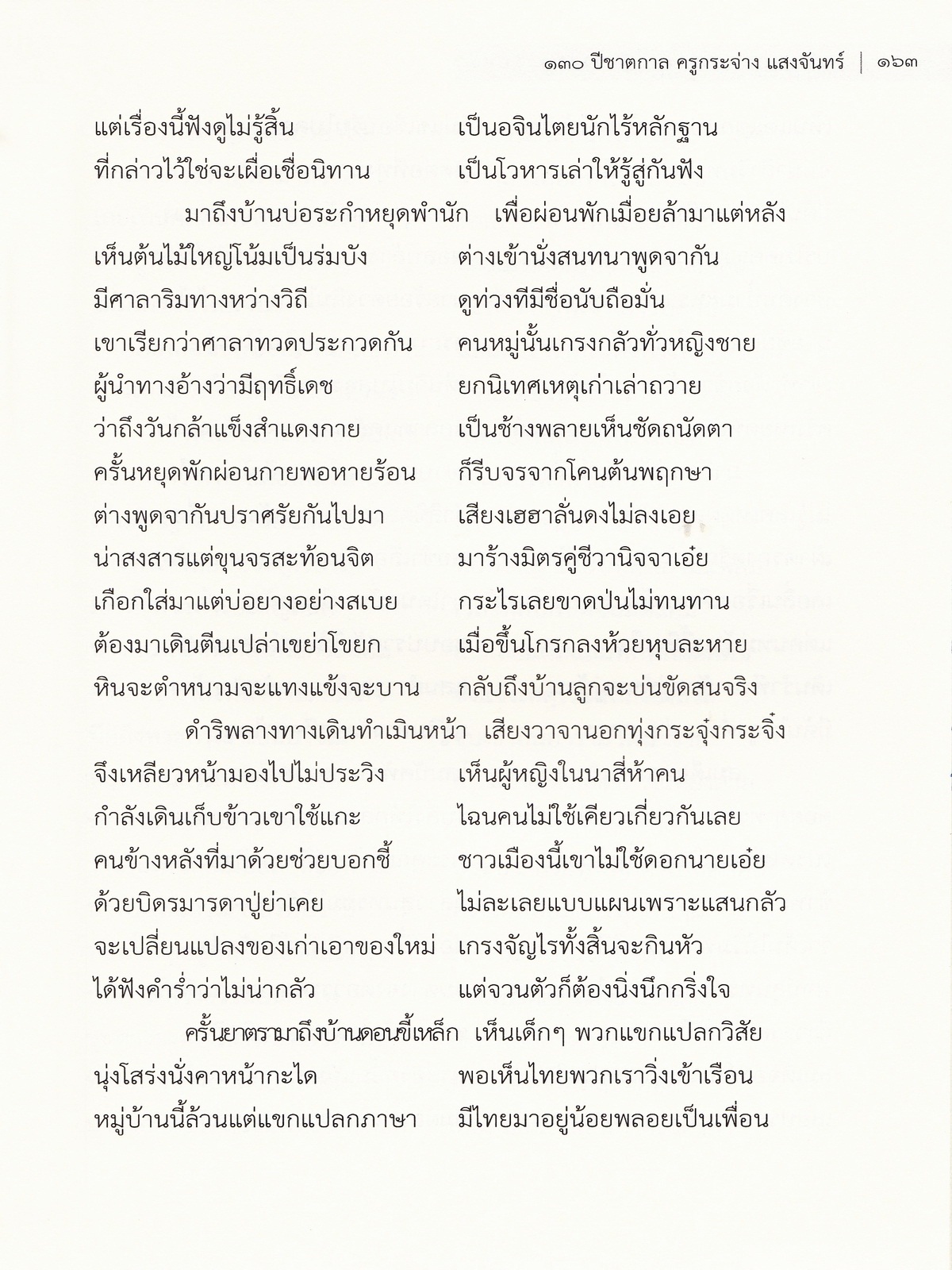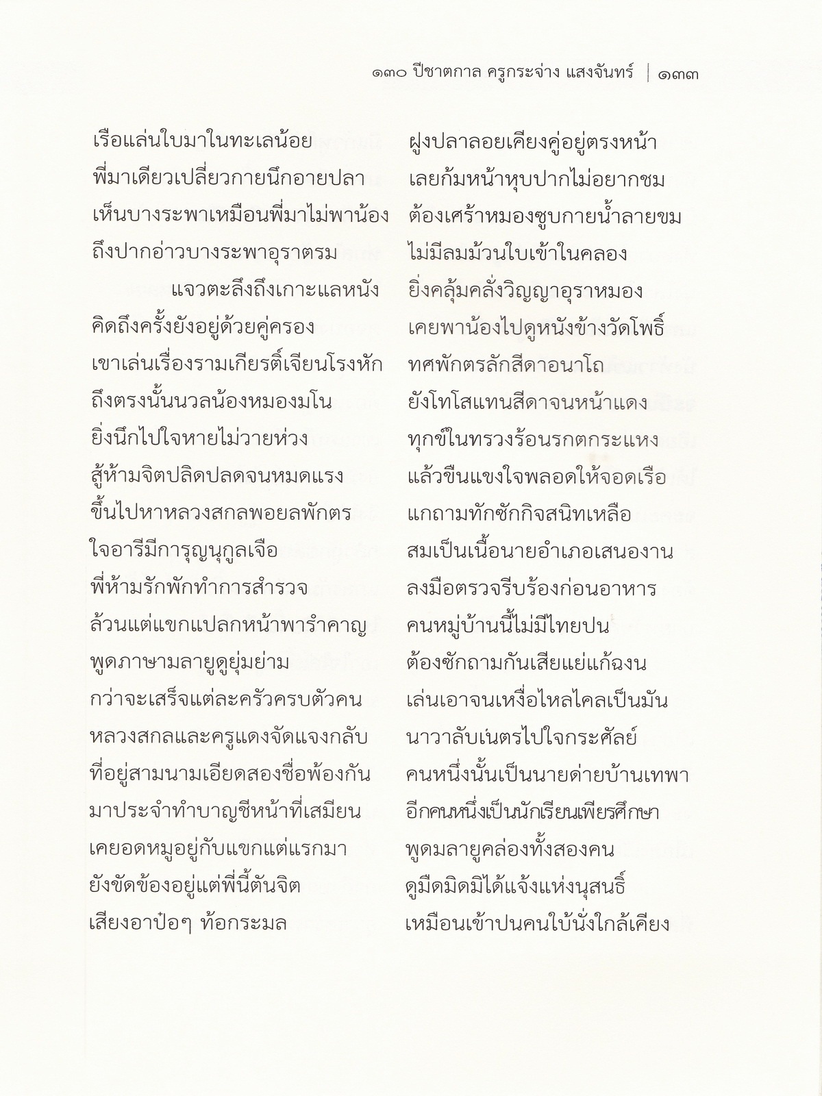 - เนื้อหาแบ่งออกเป็นหมวดๆ เริ่มจากบทนำเสนอชีวิตและผลงานของครูกระจ่าง แสงจันทร บุรพกวีจากบูรพทิศแห่งสยามประเทศ ชุมนุมนิราศและบทกวีของครูกระจ่าง แสงจันทร์ หมวดบทร้องเพลงไทย หมวดคำประพันธ์ที่ประพันธ์ในโอกาสต่างๆ หมวดนิทานคำกลอน หมวดนิราศคำกลอน ภาคผนวกเป็นรายงานตรวจราชการของหลวงคีรีเนมีทวีป ปลัดเมืองปัจจันตคีรีเขตร ร.ศ.121