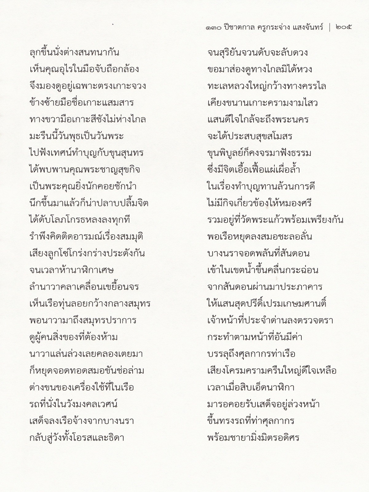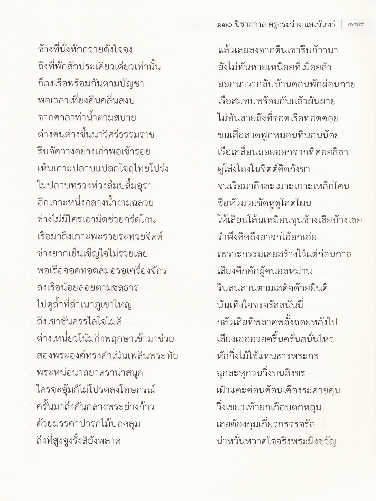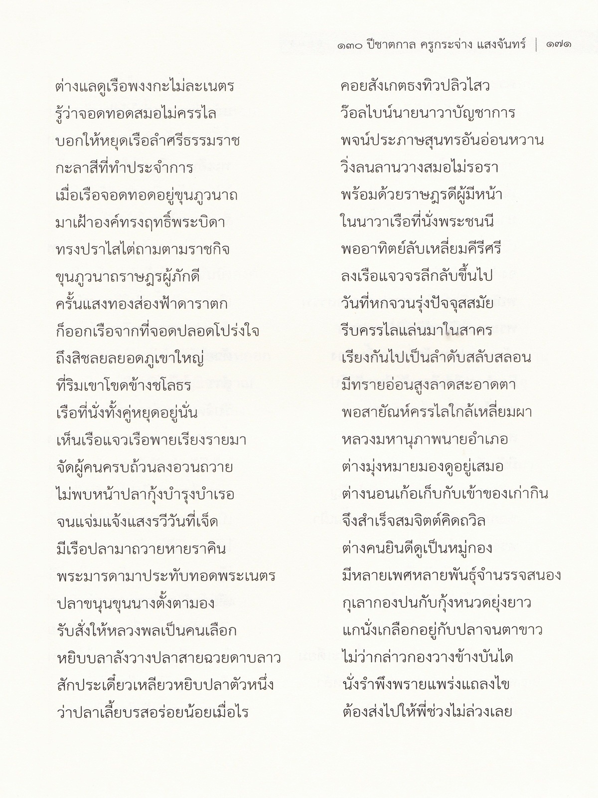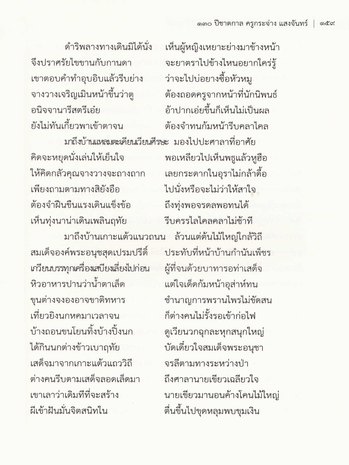 - เนื้อหาแบ่งออกเป็นหมวดๆ เริ่มจากบทนำเสนอชีวิตและผลงานของครูกระจ่าง แสงจันทร บุรพกวีจากบูรพทิศแห่งสยามประเทศ ชุมนุมนิราศและบทกวีของครูกระจ่าง แสงจันทร์ หมวดบทร้องเพลงไทย หมวดคำประพันธ์ที่ประพันธ์ในโอกาสต่างๆ หมวดนิทานคำกลอน หมวดนิราศคำกลอน ภาคผนวกเป็นรายงานตรวจราชการของหลวงคีรีเนมีทวีป ปลัดเมืองปัจจันตคีรีเขตร ร.ศ.121