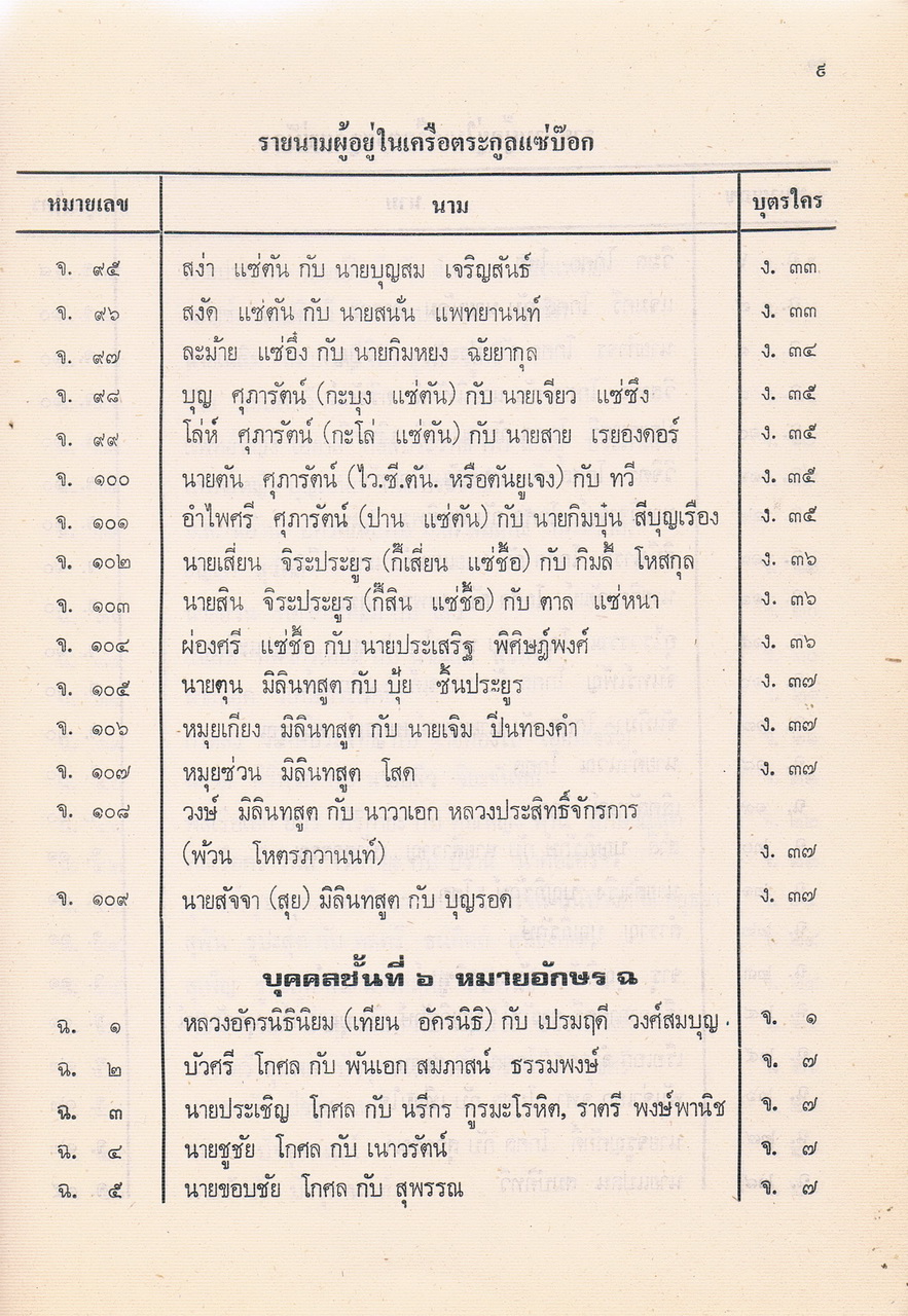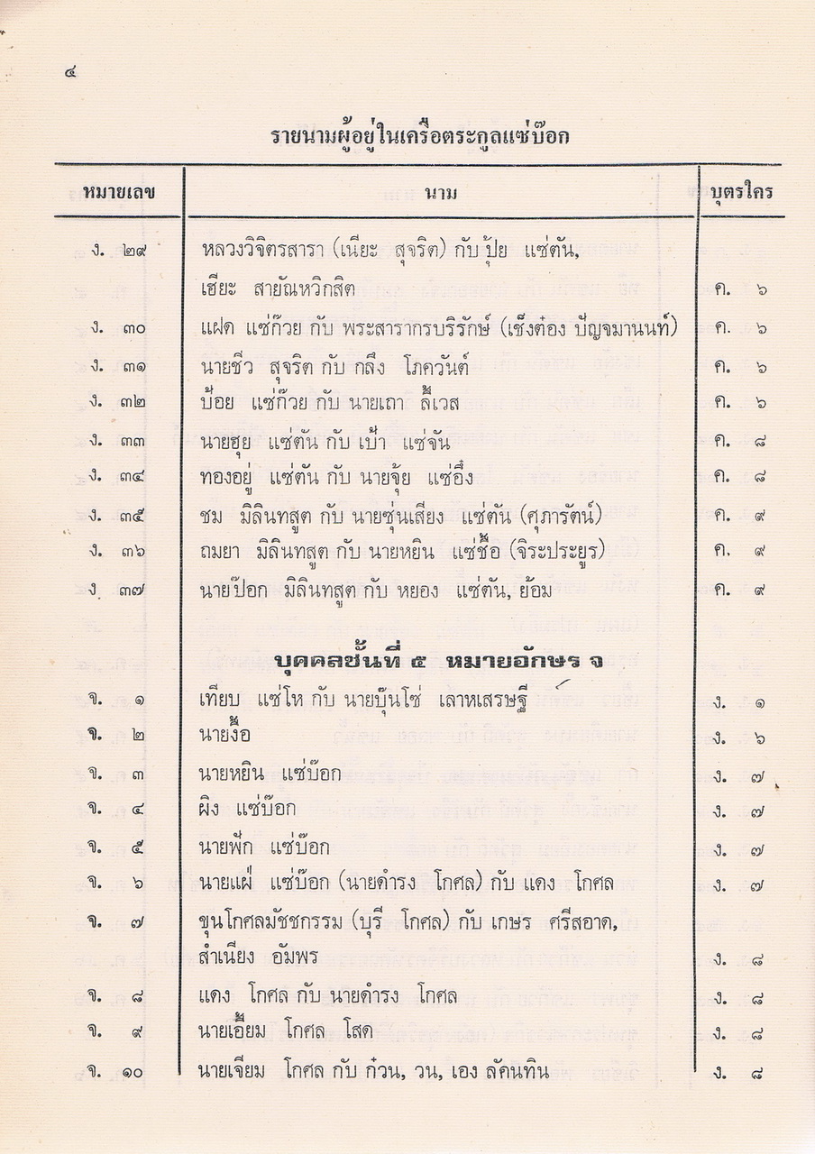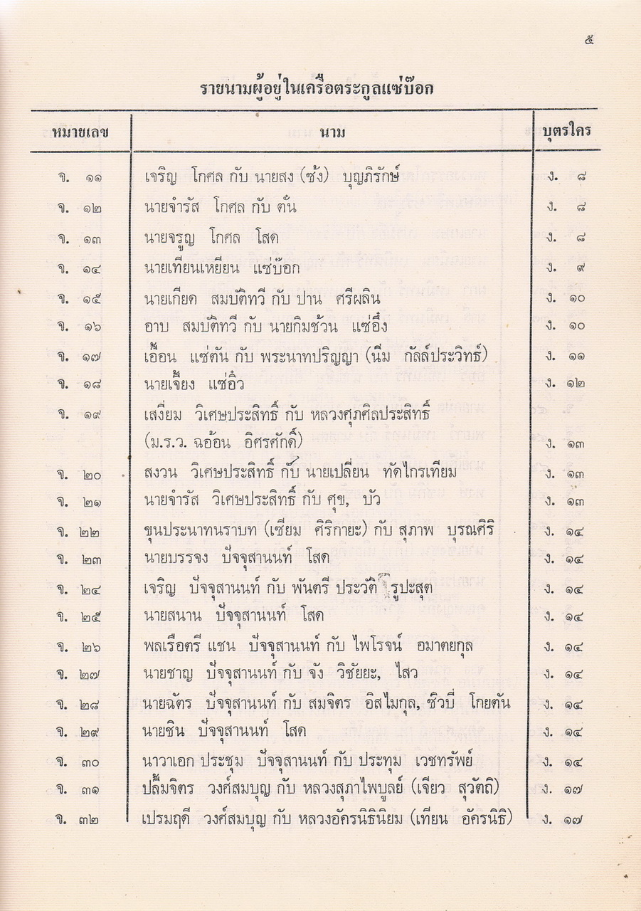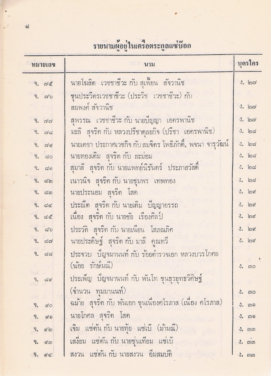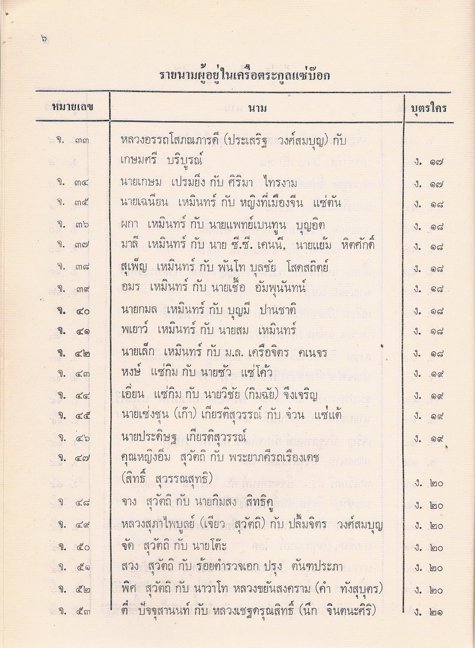 - เป็นหนังสือที่รวบรวมรายชื่อของผู้ที่อยู่ในตระกูลแซ่บ๊อก ตามที่รวบรวมและเรียบเรียงได้ในปีพศ.2521 ซึ่งต้นตระกูลคือนายโกชั้น แซ่บ๊อกชาวจีนฮกเกี้ยนกับนางยา แซ่พั้ว ชาวญวน และอพยพพากันมาตั้งรกรากทำมาหากินที่เมืองจันทบุรีสมัย รัชกาลที่3 แห่งกรุงรัตนโกสินทร์ มีลูกหลานที่รวบรวมรายนามผู้ที่อยู่ในเครือตระกูลแซ่บ๊อกได้ 48. คน