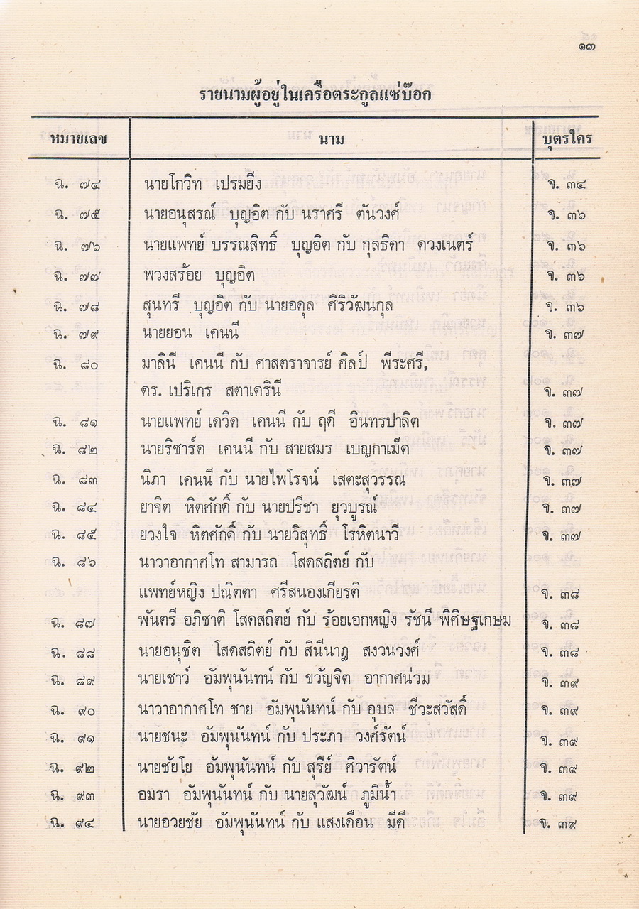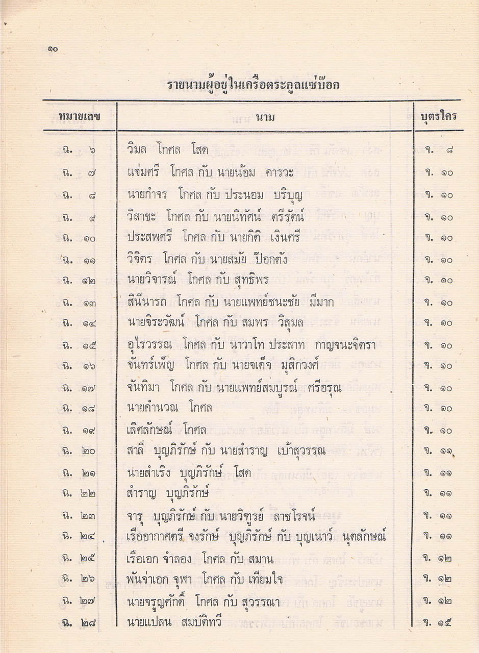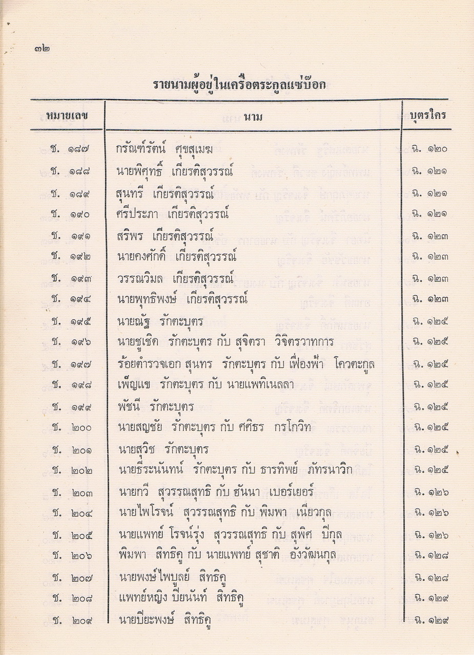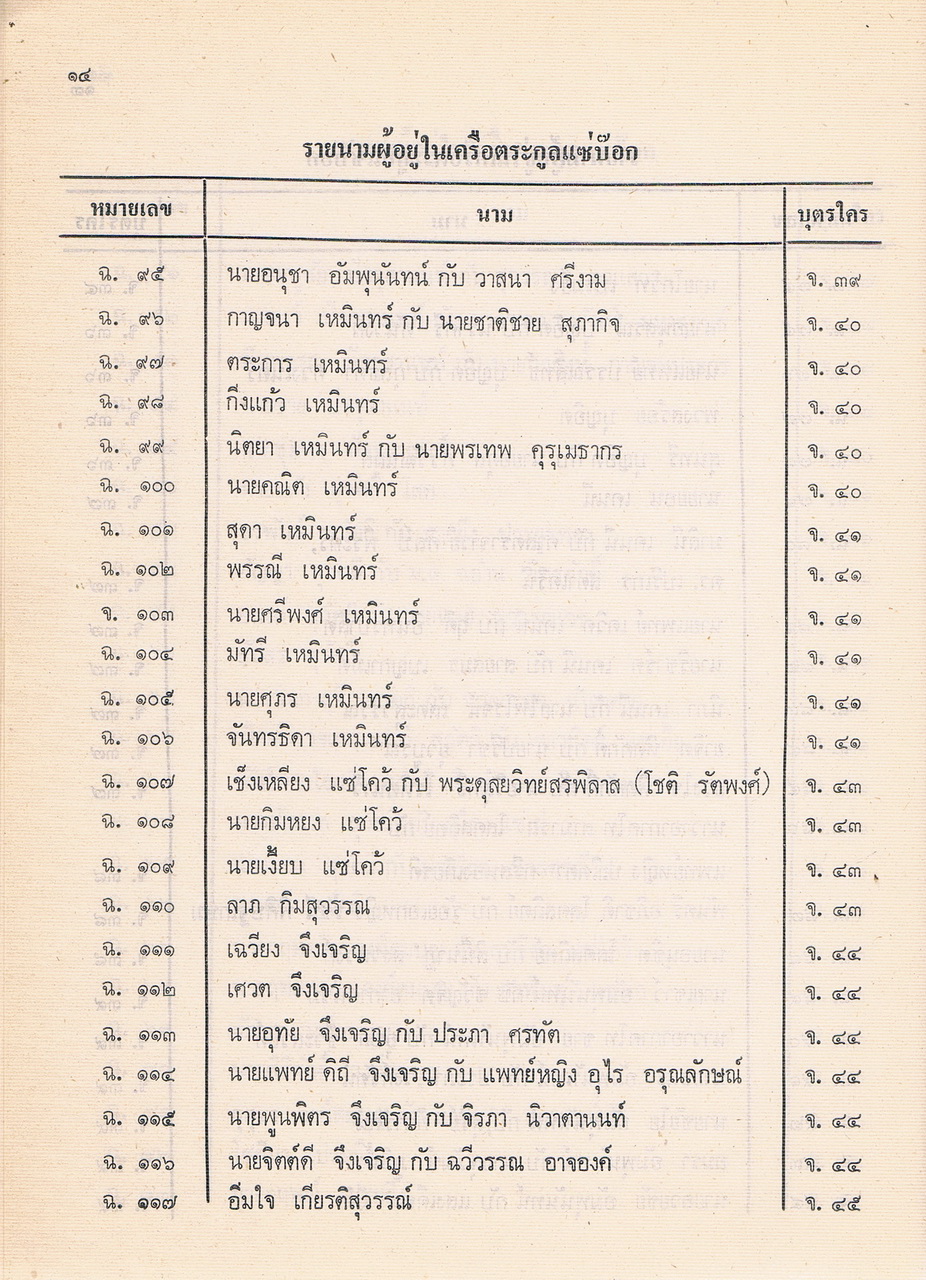 - เป็นหนังสือที่รวบรวมรายชื่อของผู้ที่อยู่ในตระกูลแซ่บ๊อก ตามที่รวบรวมและเรียบเรียงได้ในปีพศ.2521 ซึ่งต้นตระกูลคือนายโกชั้น แซ่บ๊อกชาวจีนฮกเกี้ยนกับนางยา แซ่พั้ว ชาวญวน และอพยพพากันมาตั้งรกรากทำมาหากินที่เมืองจันทบุรีสมัย รัชกาลที่3 แห่งกรุงรัตนโกสินทร์ มีลูกหลานที่รวบรวมรายนามผู้ที่อยู่ในเครือตระกูลแซ่บ๊อกได้ 48. คน