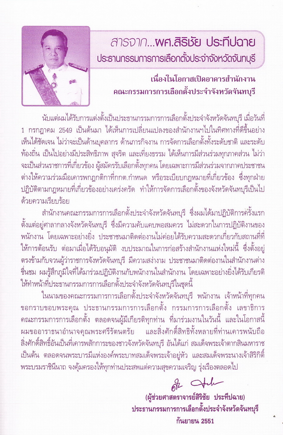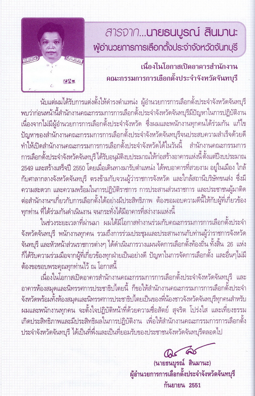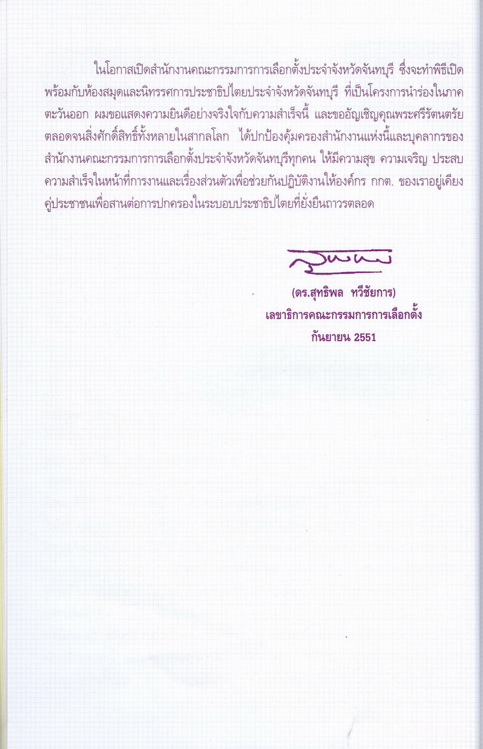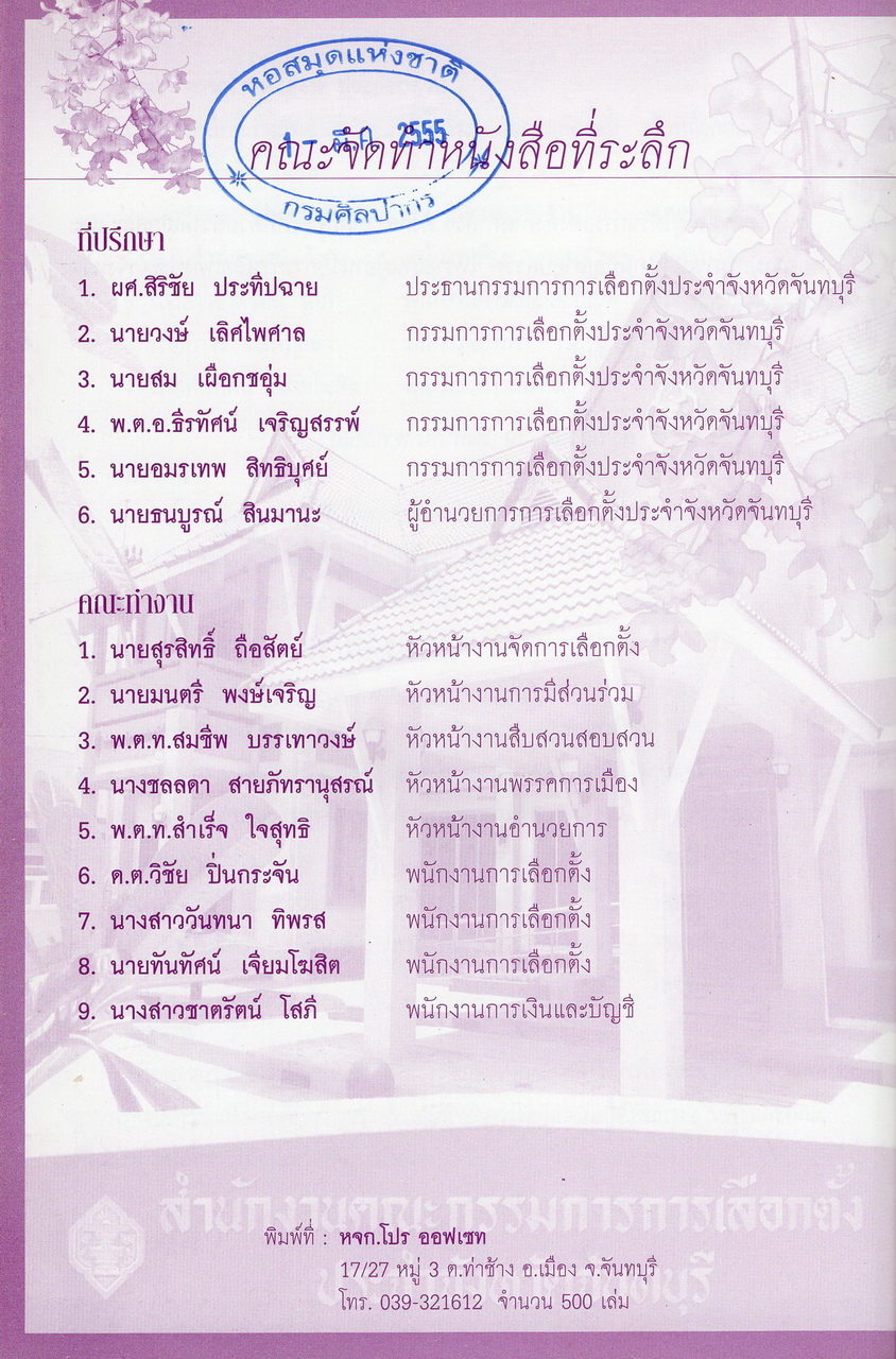 - พิมพ์เป็นที่ระลึกในพิธีเปิดสำนักงานคณะกรรมการการเลือกตั้งประจำจังหวัดจันทบุรีและห้องสมุดและนิทรรศการประชาธิปไตย 26 กันยายน 2551