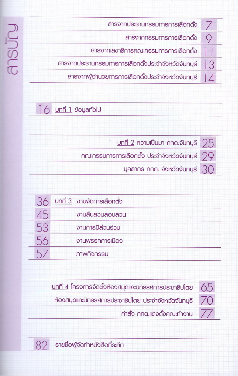 - เนื้อหาแบ่งออกเป็น 4 บท ได้แก่ 1.ข้อมูลทั่วไป 2.ความเป็นมาของกกต.จันทบุรี คณะกรรมการการเลือกตั้งประจำจังหวัดจันทบุรี บุคลากรกกต.จังหวัดจันทบุรี 3.งานจัดการเลือกตั้ง งานสืบสวนสอบสวน งานการมีส่วนร่วม งานพรรคการเมือง ภาพกิจกรรม 4.โครงการจัดตั้งห้องสมุดและนิทรรศการประชาธิปไตย ห้องสมุดและนิทรรศการประชาธิปไตยประจำจังหวัดจันทบุรี