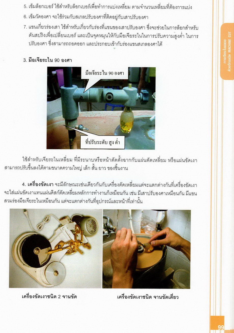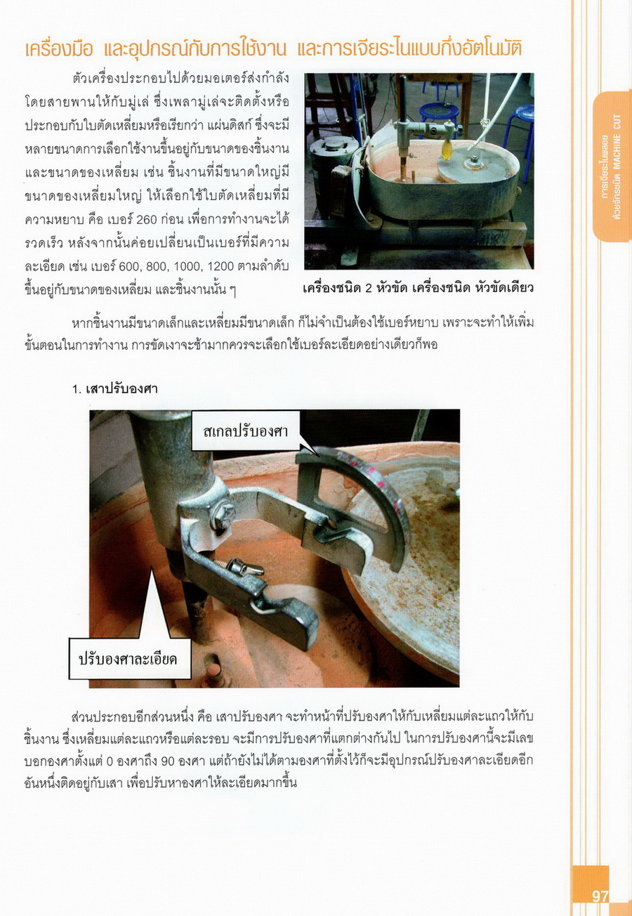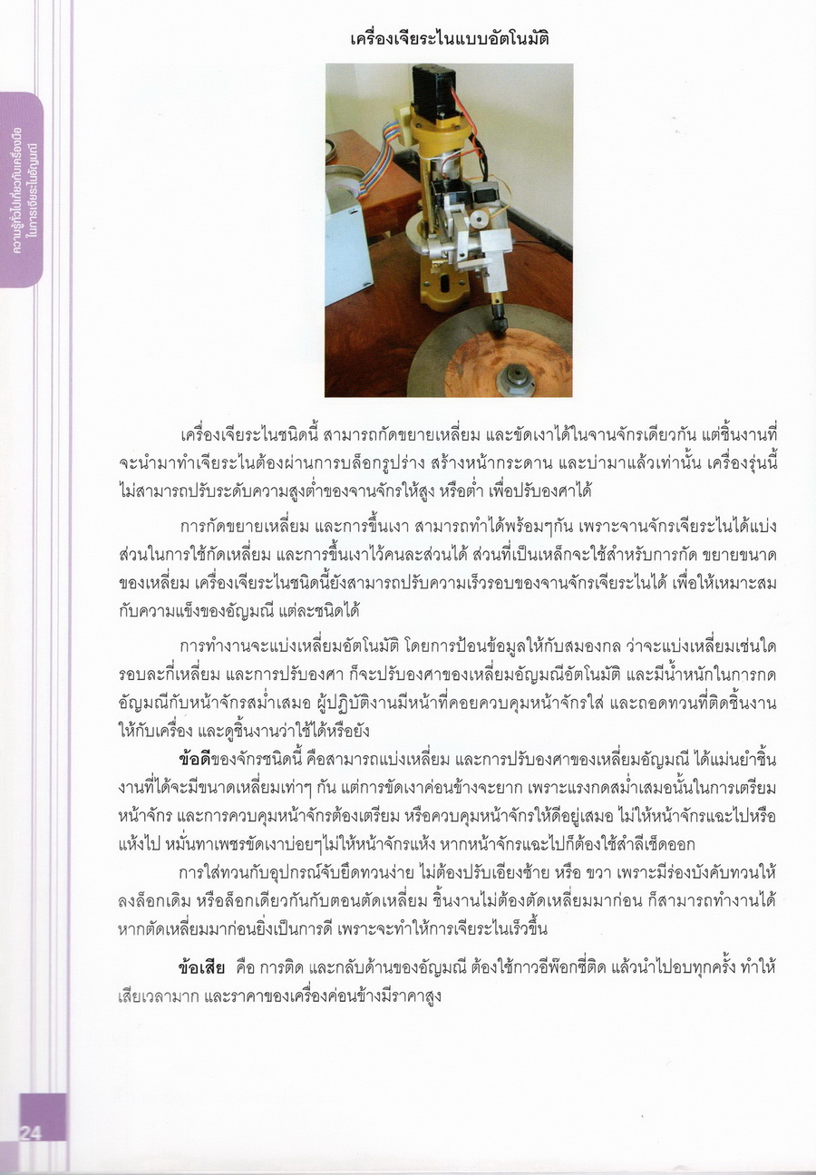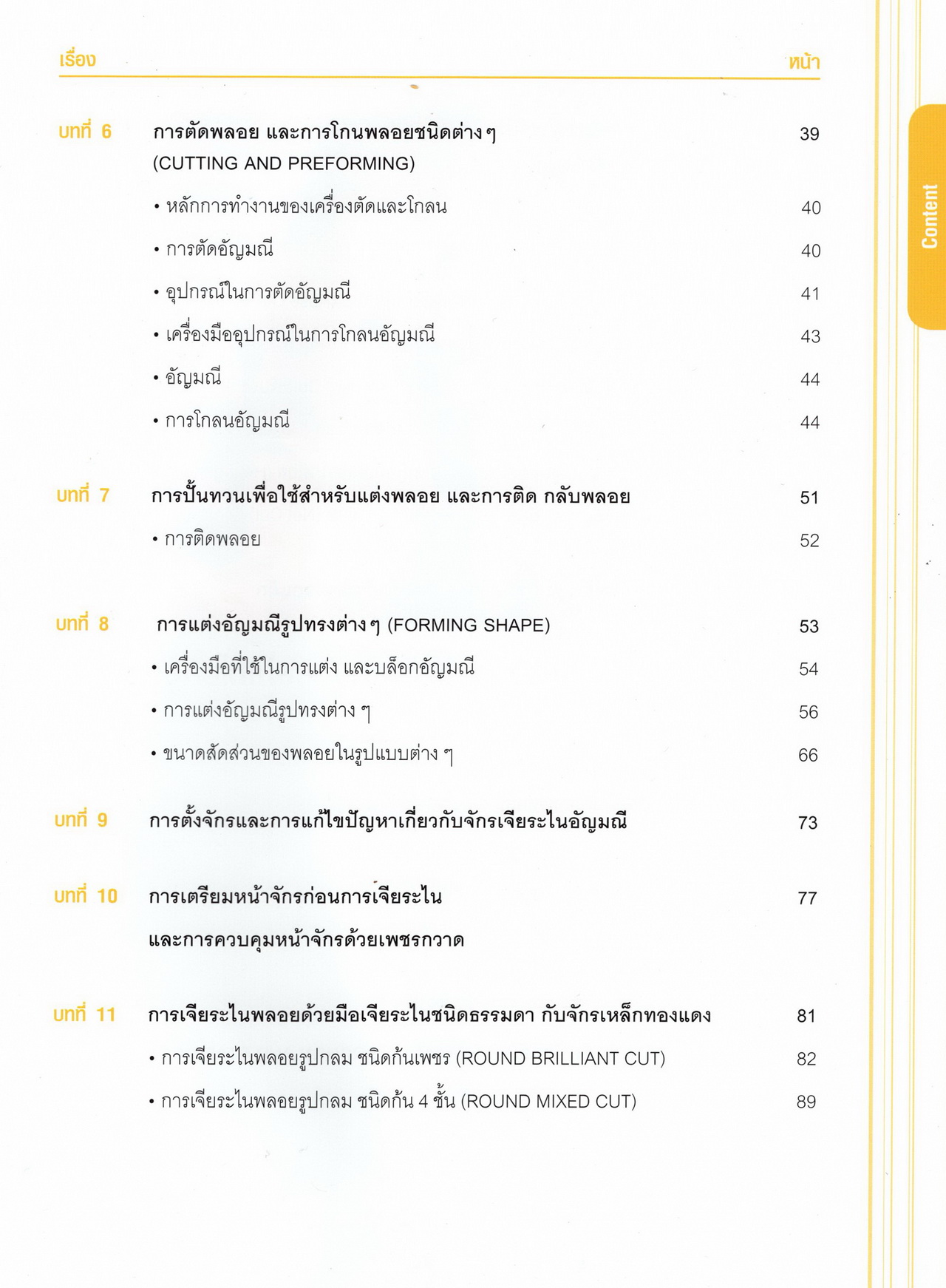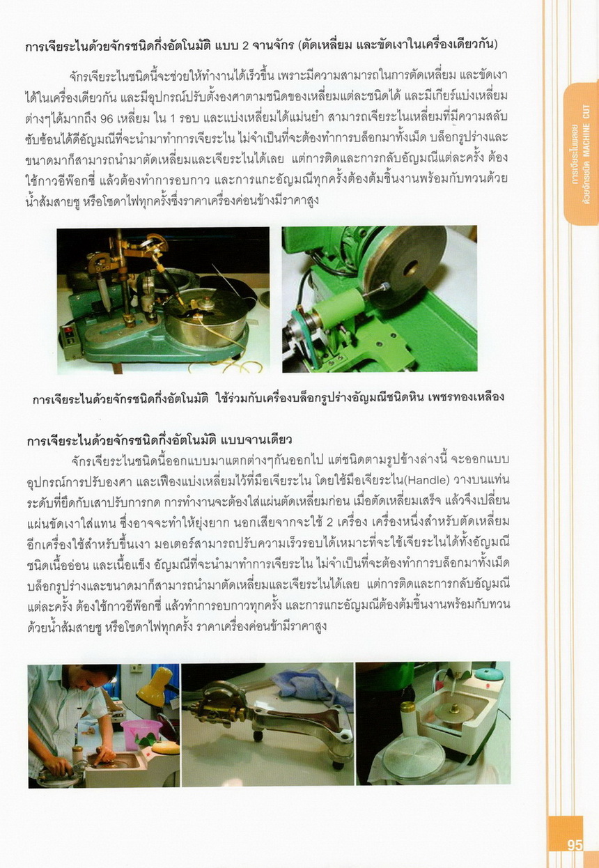 - เนื้อหาแบ่งออกเป็น 14 บท ได้แก่ ความรู้ทั่วไปเกี่ยวกับกระบวนการเจียระไนอัญมณี เครื่องมือชั่ง ตวง วัดในงานเจียระไนพลอย ความรู้ทั่วไปเกี่ยวกับเครื่องมือในการเจียระไนอัญมณี วัสดุอุปกรณ์ที่ใช้ในงานเจียระไนพลอย ความปลอดภัยในการทำงาน การตัดพลอยและการโกนพลอยชนิดต่างๆ การปั้นทวนเพื่อใช้สำหรับแต่งพลอยและการติดกลับพลอย การแต่งอัญมณีรูปทรงต่างๆ การตั้งจักรและการแก้ไขปัญหาเกี่ยวกับจักรเจียระไนอัญมณี การเตรียมหน้าจักรก่อนการเจียระไนและการควบคุมหน้าจักรด้วยเพชรกวาด การเจียระไนพลอยด้วยมือเจียระไนชนิดธรรมดา กับจักรเหล็กทองแดง การเจียระไนพลอยด้วยจักรชนิด การเจียระไนพลอยรูปกลมด้วยมือเจียระไนชนิดต๊อกแต๊ก การทำพลอยหลังเบี้ยและพลอยสตาร์