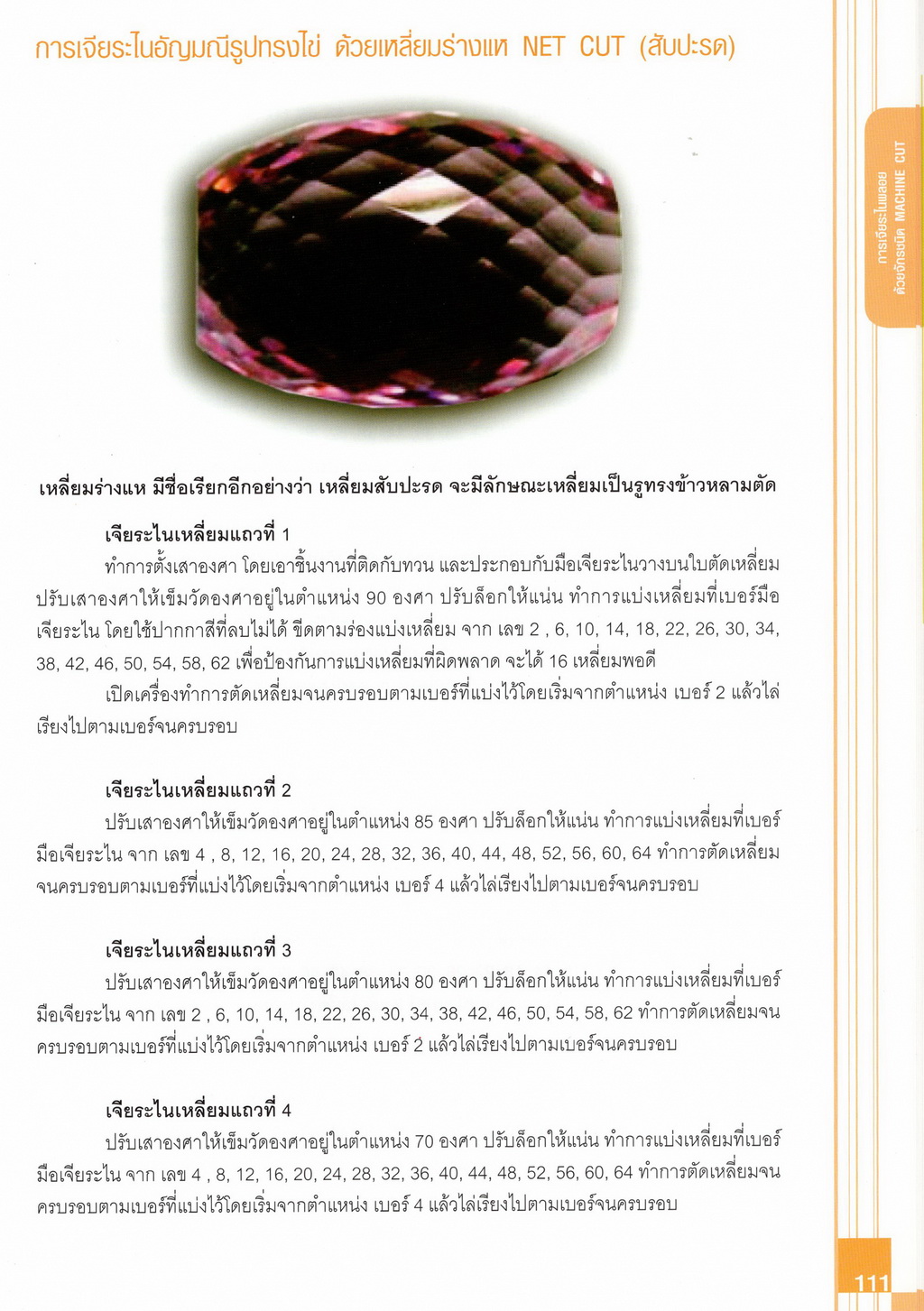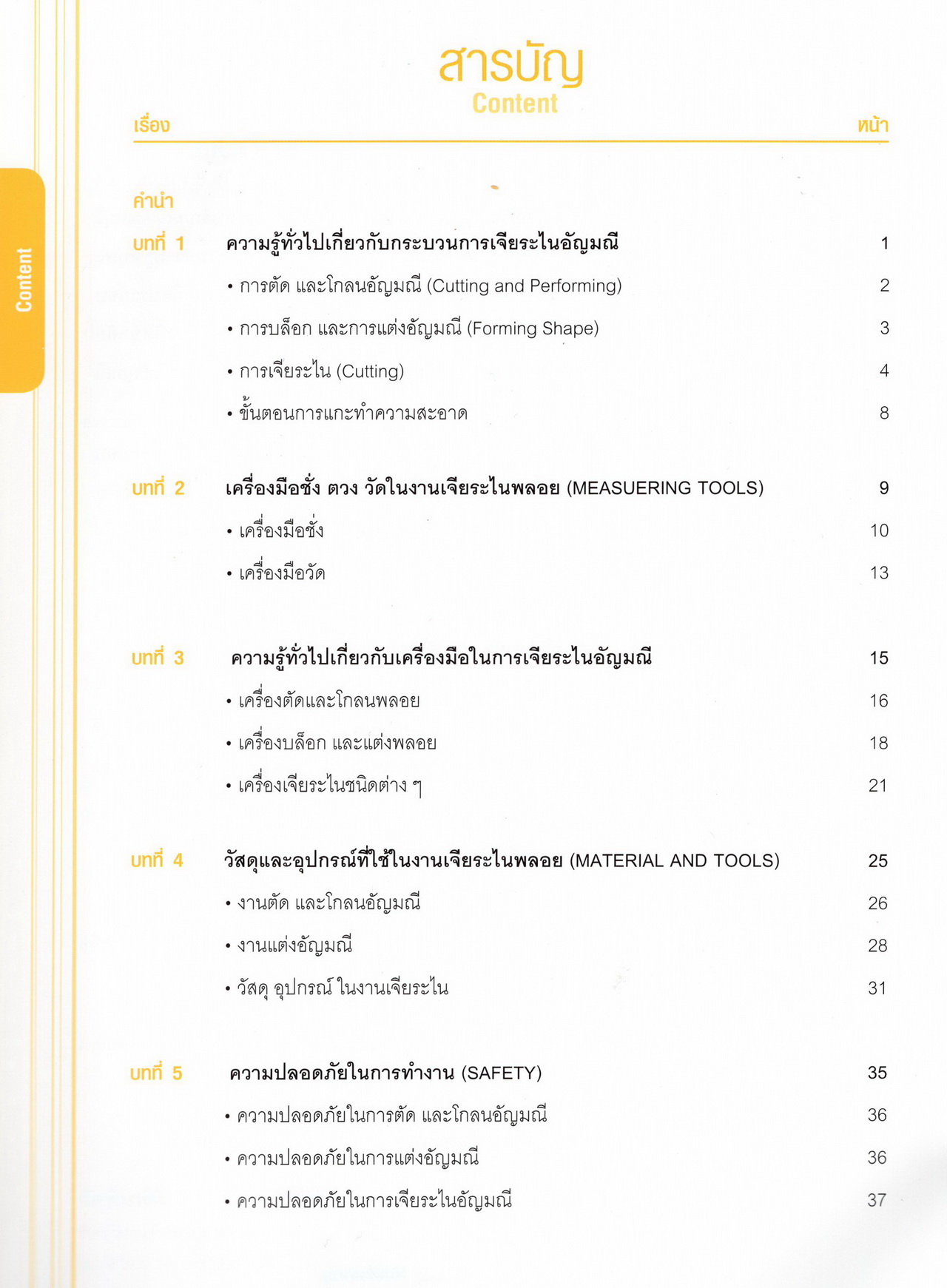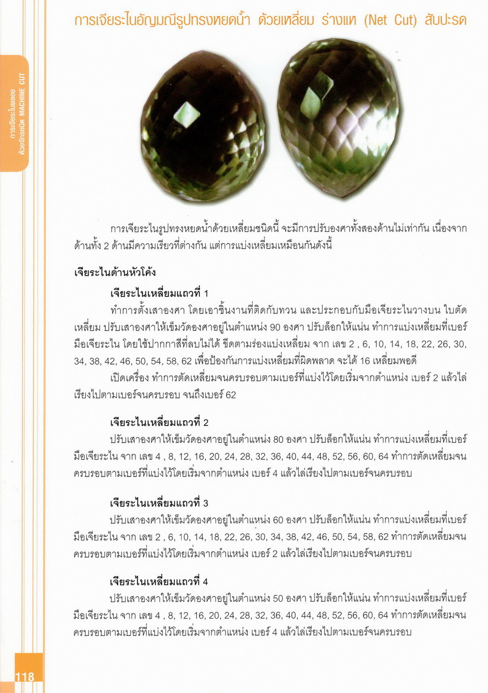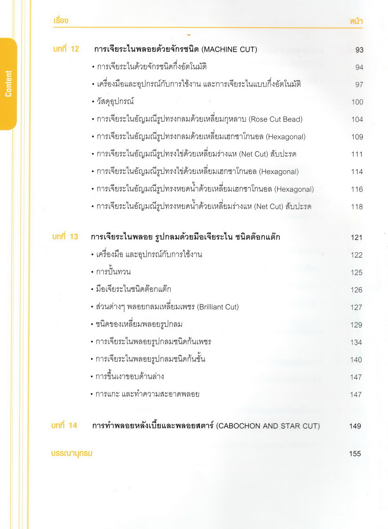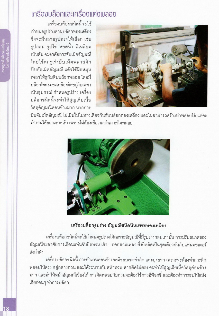 - เนื้อหาแบ่งออกเป็น 14 บท ได้แก่ ความรู้ทั่วไปเกี่ยวกับกระบวนการเจียระไนอัญมณี เครื่องมือชั่ง ตวง วัดในงานเจียระไนพลอย ความรู้ทั่วไปเกี่ยวกับเครื่องมือในการเจียระไนอัญมณี วัสดุอุปกรณ์ที่ใช้ในงานเจียระไนพลอย ความปลอดภัยในการทำงาน การตัดพลอยและการโกนพลอยชนิดต่างๆ การปั้นทวนเพื่อใช้สำหรับแต่งพลอยและการติดกลับพลอย การแต่งอัญมณีรูปทรงต่างๆ การตั้งจักรและการแก้ไขปัญหาเกี่ยวกับจักรเจียระไนอัญมณี การเตรียมหน้าจักรก่อนการเจียระไนและการควบคุมหน้าจักรด้วยเพชรกวาด การเจียระไนพลอยด้วยมือเจียระไนชนิดธรรมดา กับจักรเหล็กทองแดง การเจียระไนพลอยด้วยจักรชนิด การเจียระไนพลอยรูปกลมด้วยมือเจียระไนชนิดต๊อกแต๊ก การทำพลอยหลังเบี้ยและพลอยสตาร์