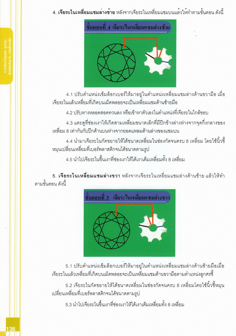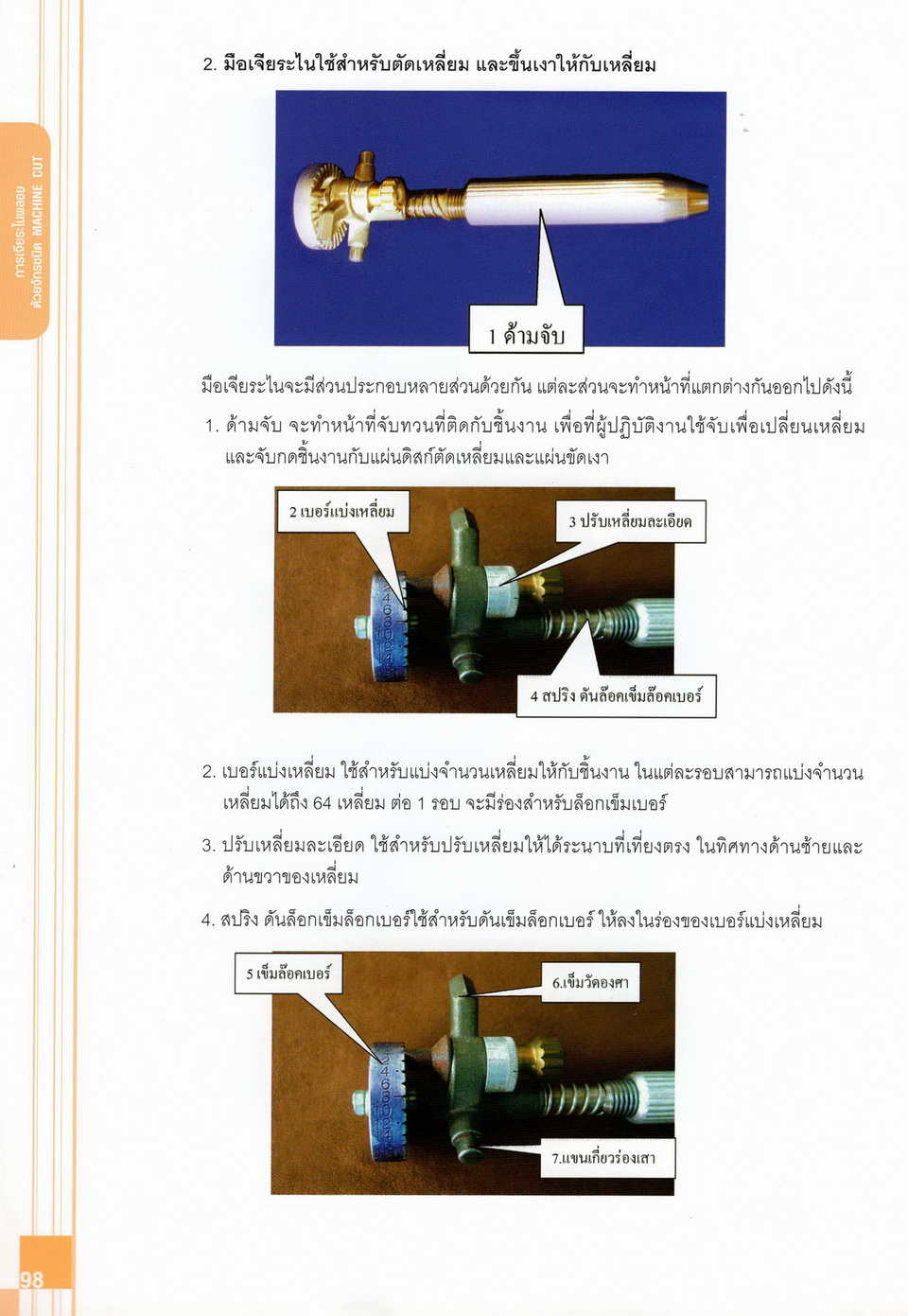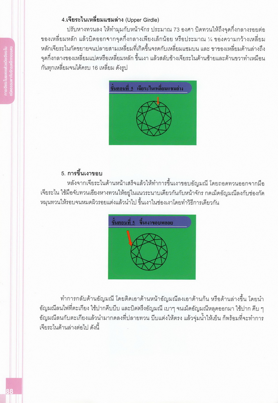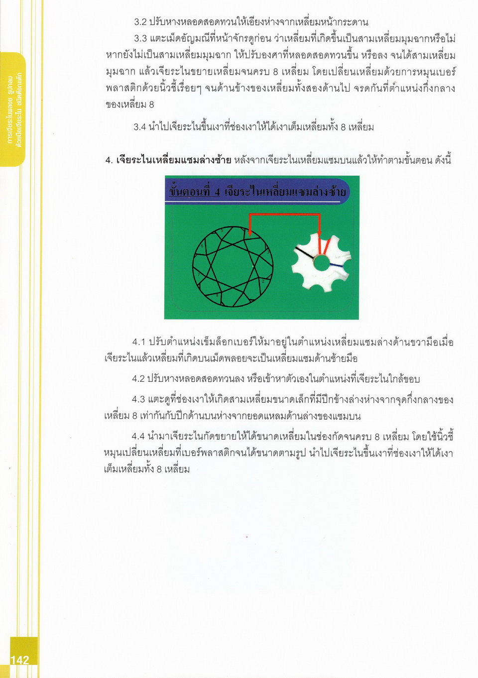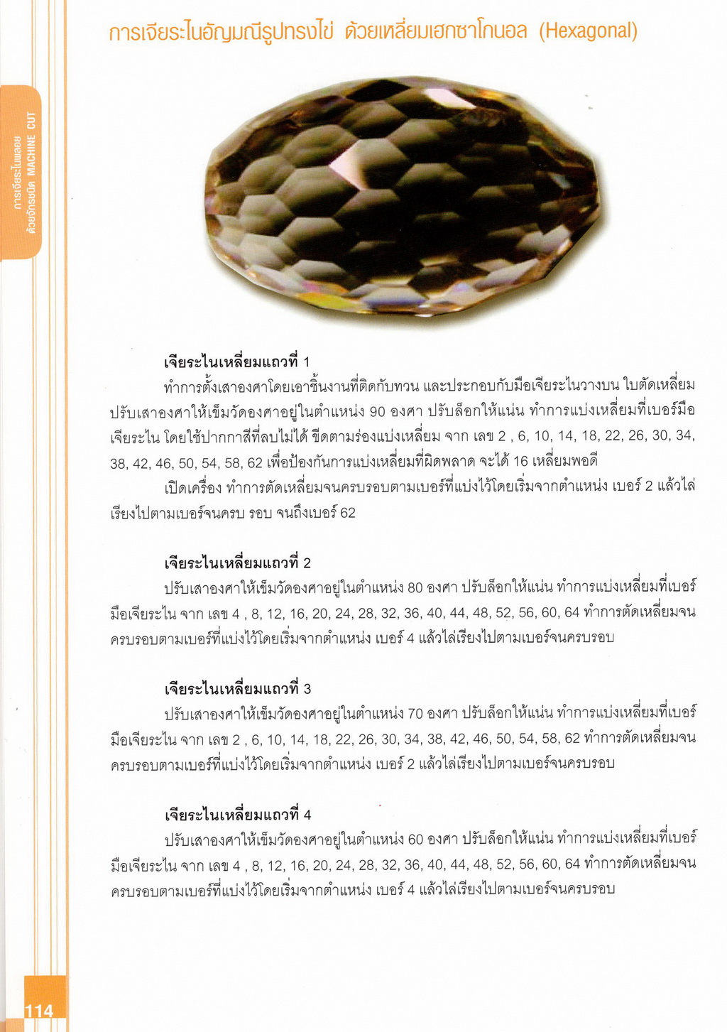 - เนื้อหาแบ่งออกเป็น 14 บท ได้แก่ ความรู้ทั่วไปเกี่ยวกับกระบวนการเจียระไนอัญมณี เครื่องมือชั่ง ตวง วัดในงานเจียระไนพลอย ความรู้ทั่วไปเกี่ยวกับเครื่องมือในการเจียระไนอัญมณี วัสดุอุปกรณ์ที่ใช้ในงานเจียระไนพลอย ความปลอดภัยในการทำงาน การตัดพลอยและการโกนพลอยชนิดต่างๆ การปั้นทวนเพื่อใช้สำหรับแต่งพลอยและการติดกลับพลอย การแต่งอัญมณีรูปทรงต่างๆ การตั้งจักรและการแก้ไขปัญหาเกี่ยวกับจักรเจียระไนอัญมณี การเตรียมหน้าจักรก่อนการเจียระไนและการควบคุมหน้าจักรด้วยเพชรกวาด การเจียระไนพลอยด้วยมือเจียระไนชนิดธรรมดา กับจักรเหล็กทองแดง การเจียระไนพลอยด้วยจักรชนิด การเจียระไนพลอยรูปกลมด้วยมือเจียระไนชนิดต๊อกแต๊ก การทำพลอยหลังเบี้ยและพลอยสตาร์