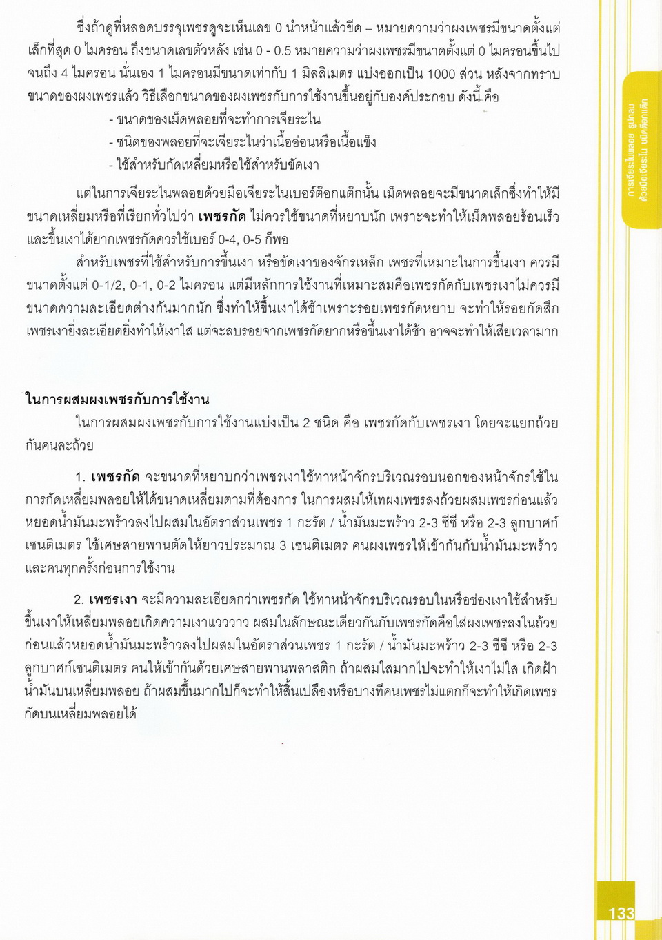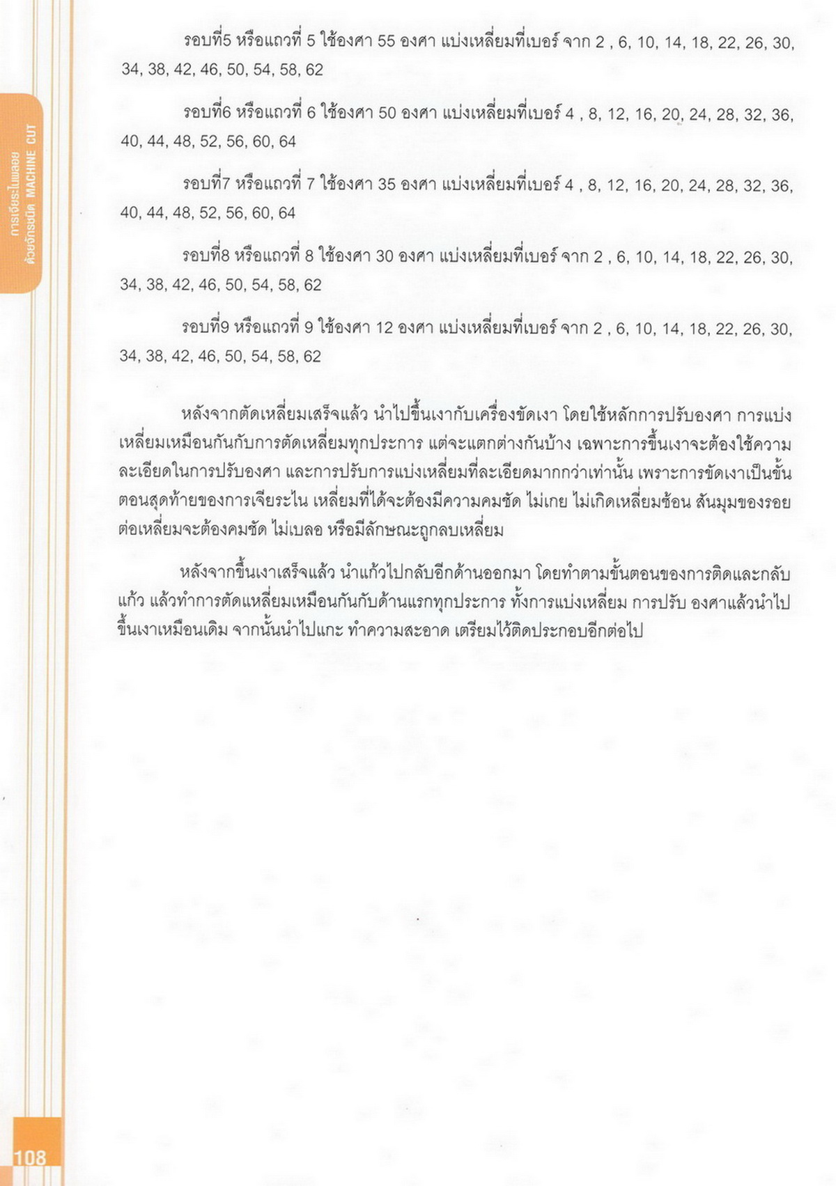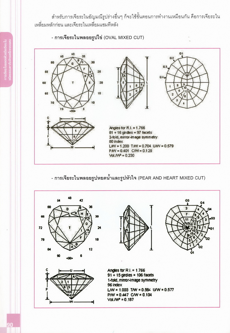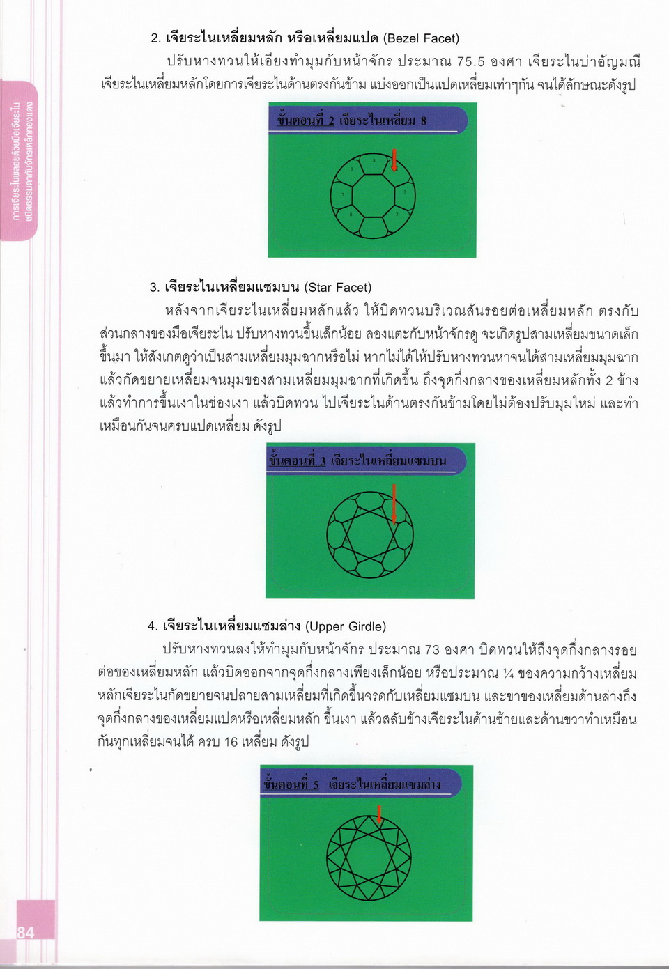 - เนื้อหาแบ่งออกเป็น 14 บท ได้แก่ ความรู้ทั่วไปเกี่ยวกับกระบวนการเจียระไนอัญมณี เครื่องมือชั่ง ตวง วัดในงานเจียระไนพลอย ความรู้ทั่วไปเกี่ยวกับเครื่องมือในการเจียระไนอัญมณี วัสดุอุปกรณ์ที่ใช้ในงานเจียระไนพลอย ความปลอดภัยในการทำงาน การตัดพลอยและการโกนพลอยชนิดต่างๆ การปั้นทวนเพื่อใช้สำหรับแต่งพลอยและการติดกลับพลอย การแต่งอัญมณีรูปทรงต่างๆ การตั้งจักรและการแก้ไขปัญหาเกี่ยวกับจักรเจียระไนอัญมณี การเตรียมหน้าจักรก่อนการเจียระไนและการควบคุมหน้าจักรด้วยเพชรกวาด การเจียระไนพลอยด้วยมือเจียระไนชนิดธรรมดา กับจักรเหล็กทองแดง การเจียระไนพลอยด้วยจักรชนิด การเจียระไนพลอยรูปกลมด้วยมือเจียระไนชนิดต๊อกแต๊ก การทำพลอยหลังเบี้ยและพลอยสตาร์
