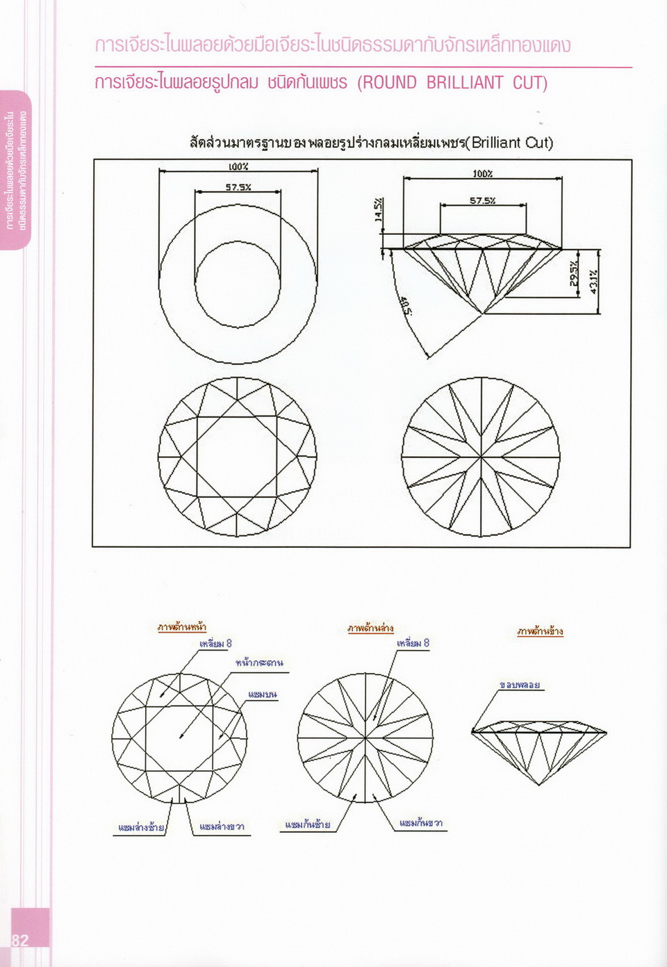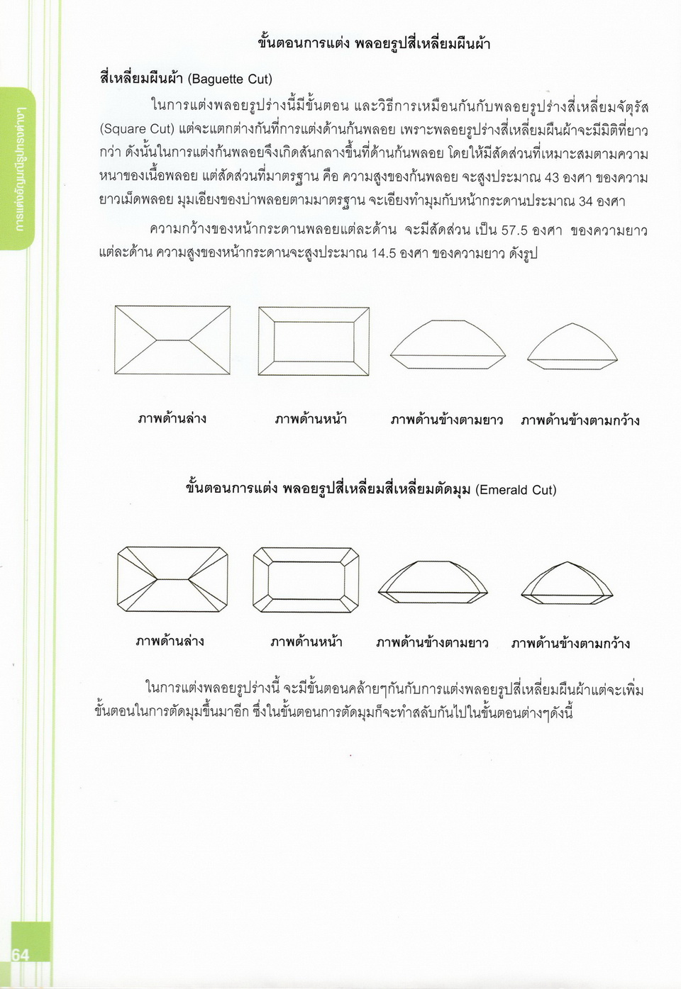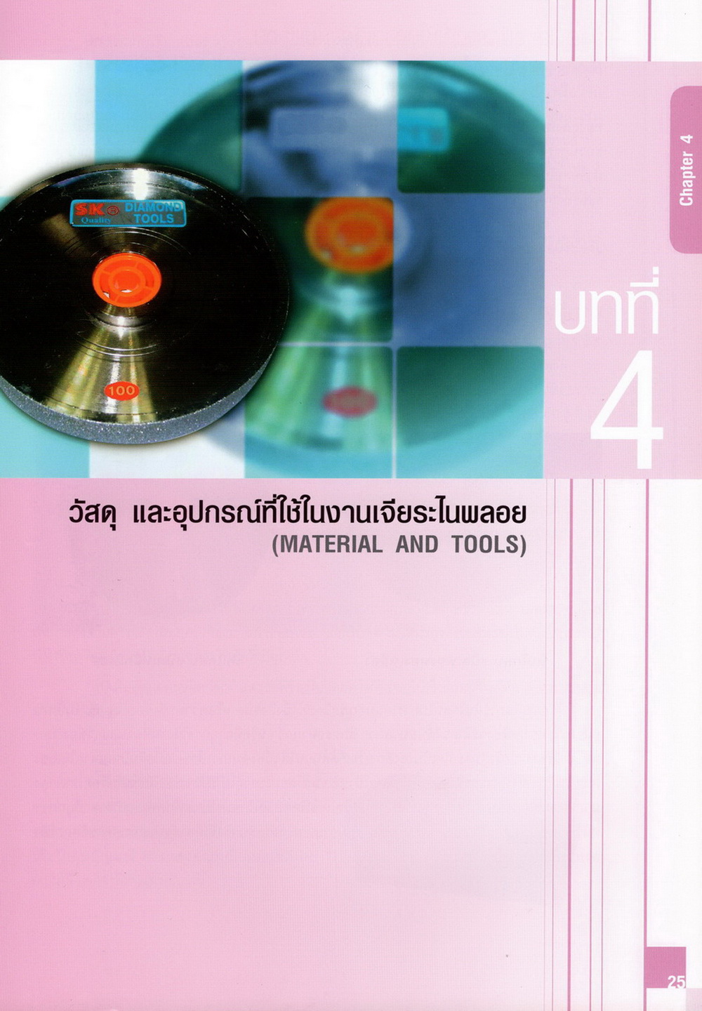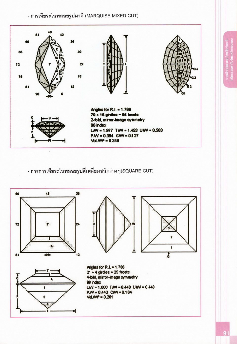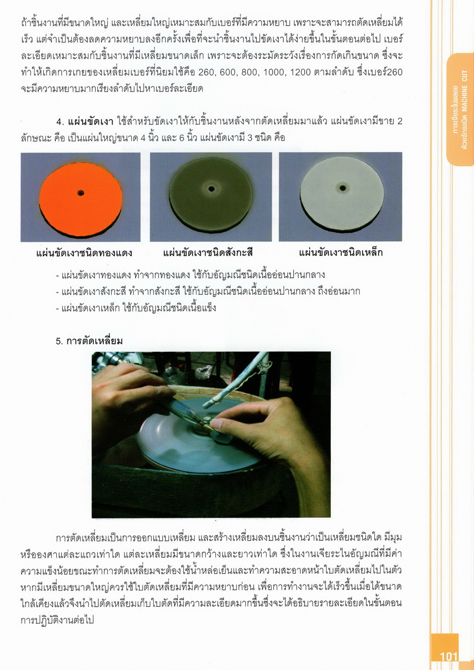 - เนื้อหาแบ่งออกเป็น 14 บท ได้แก่ ความรู้ทั่วไปเกี่ยวกับกระบวนการเจียระไนอัญมณี เครื่องมือชั่ง ตวง วัดในงานเจียระไนพลอย ความรู้ทั่วไปเกี่ยวกับเครื่องมือในการเจียระไนอัญมณี วัสดุอุปกรณ์ที่ใช้ในงานเจียระไนพลอย ความปลอดภัยในการทำงาน การตัดพลอยและการโกนพลอยชนิดต่างๆ การปั้นทวนเพื่อใช้สำหรับแต่งพลอยและการติดกลับพลอย การแต่งอัญมณีรูปทรงต่างๆ การตั้งจักรและการแก้ไขปัญหาเกี่ยวกับจักรเจียระไนอัญมณี การเตรียมหน้าจักรก่อนการเจียระไนและการควบคุมหน้าจักรด้วยเพชรกวาด การเจียระไนพลอยด้วยมือเจียระไนชนิดธรรมดา กับจักรเหล็กทองแดง การเจียระไนพลอยด้วยจักรชนิด การเจียระไนพลอยรูปกลมด้วยมือเจียระไนชนิดต๊อกแต๊ก การทำพลอยหลังเบี้ยและพลอยสตาร์