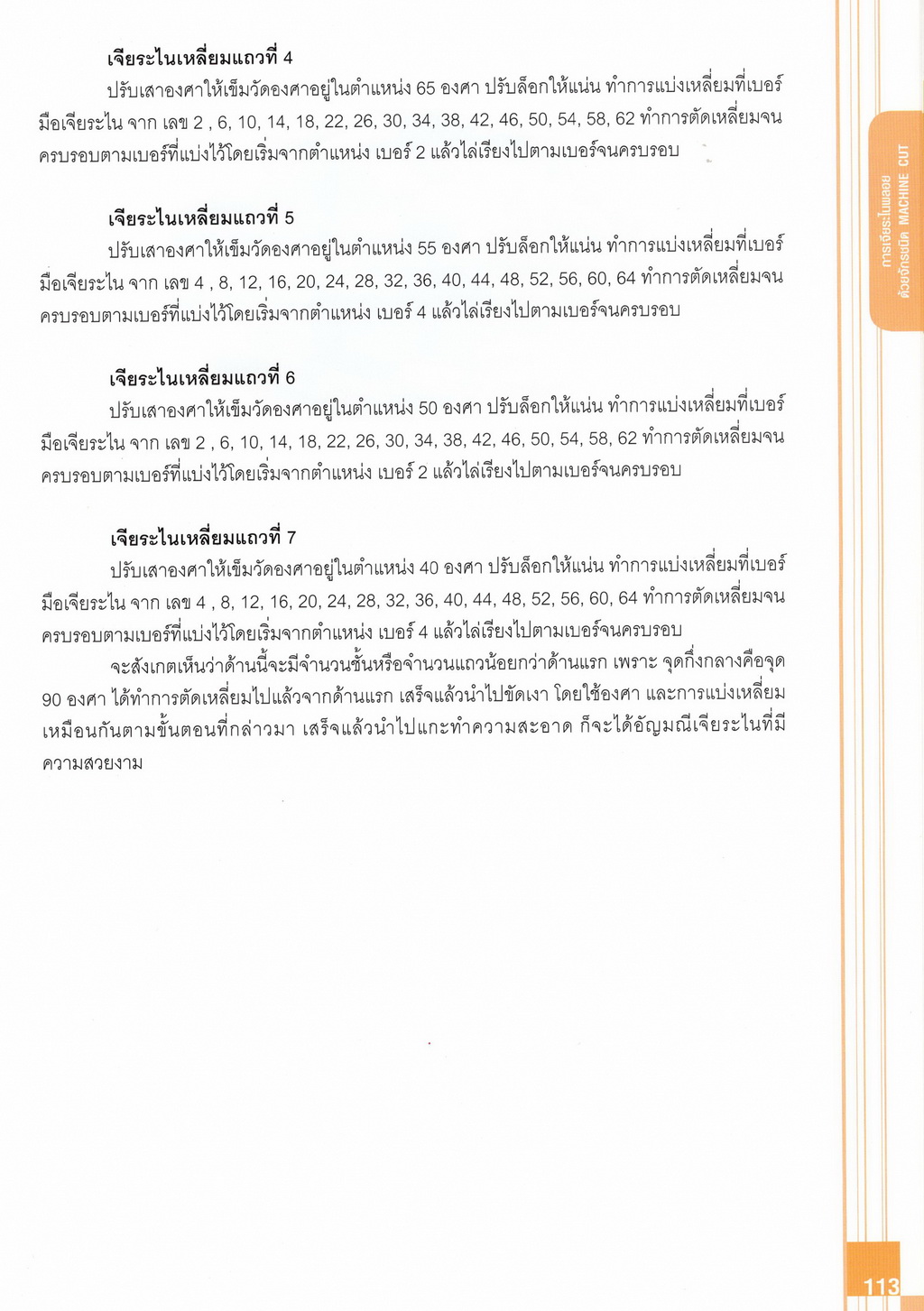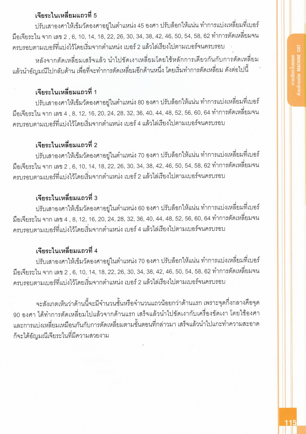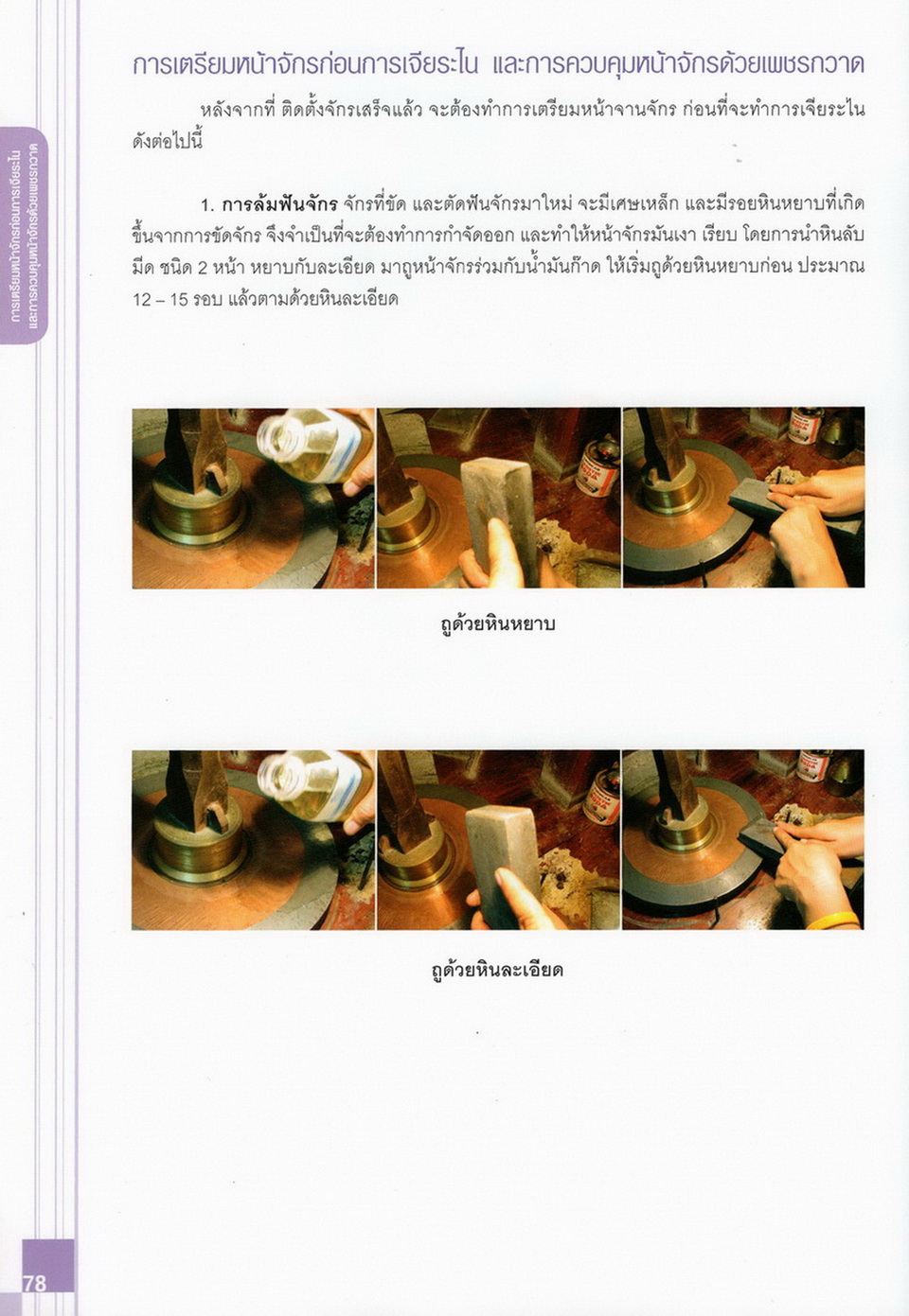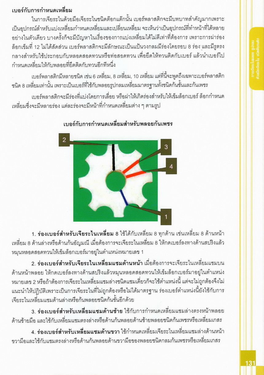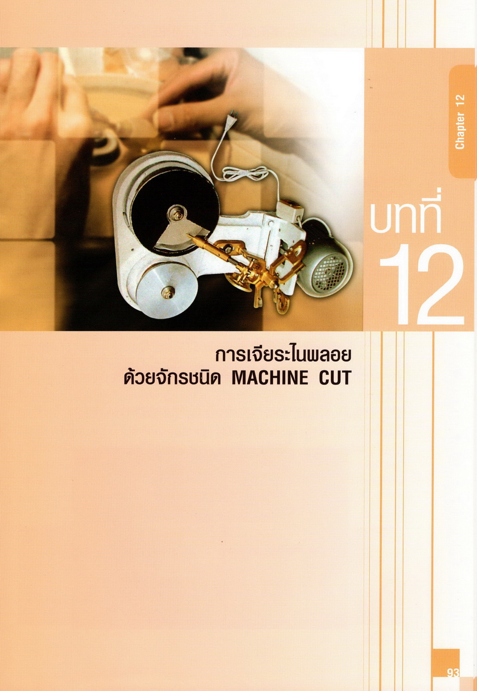 - เนื้อหาแบ่งออกเป็น 14 บท ได้แก่ ความรู้ทั่วไปเกี่ยวกับกระบวนการเจียระไนอัญมณี เครื่องมือชั่ง ตวง วัดในงานเจียระไนพลอย ความรู้ทั่วไปเกี่ยวกับเครื่องมือในการเจียระไนอัญมณี วัสดุอุปกรณ์ที่ใช้ในงานเจียระไนพลอย ความปลอดภัยในการทำงาน การตัดพลอยและการโกนพลอยชนิดต่างๆ การปั้นทวนเพื่อใช้สำหรับแต่งพลอยและการติดกลับพลอย การแต่งอัญมณีรูปทรงต่างๆ การตั้งจักรและการแก้ไขปัญหาเกี่ยวกับจักรเจียระไนอัญมณี การเตรียมหน้าจักรก่อนการเจียระไนและการควบคุมหน้าจักรด้วยเพชรกวาด การเจียระไนพลอยด้วยมือเจียระไนชนิดธรรมดา กับจักรเหล็กทองแดง การเจียระไนพลอยด้วยจักรชนิด การเจียระไนพลอยรูปกลมด้วยมือเจียระไนชนิดต๊อกแต๊ก การทำพลอยหลังเบี้ยและพลอยสตาร์