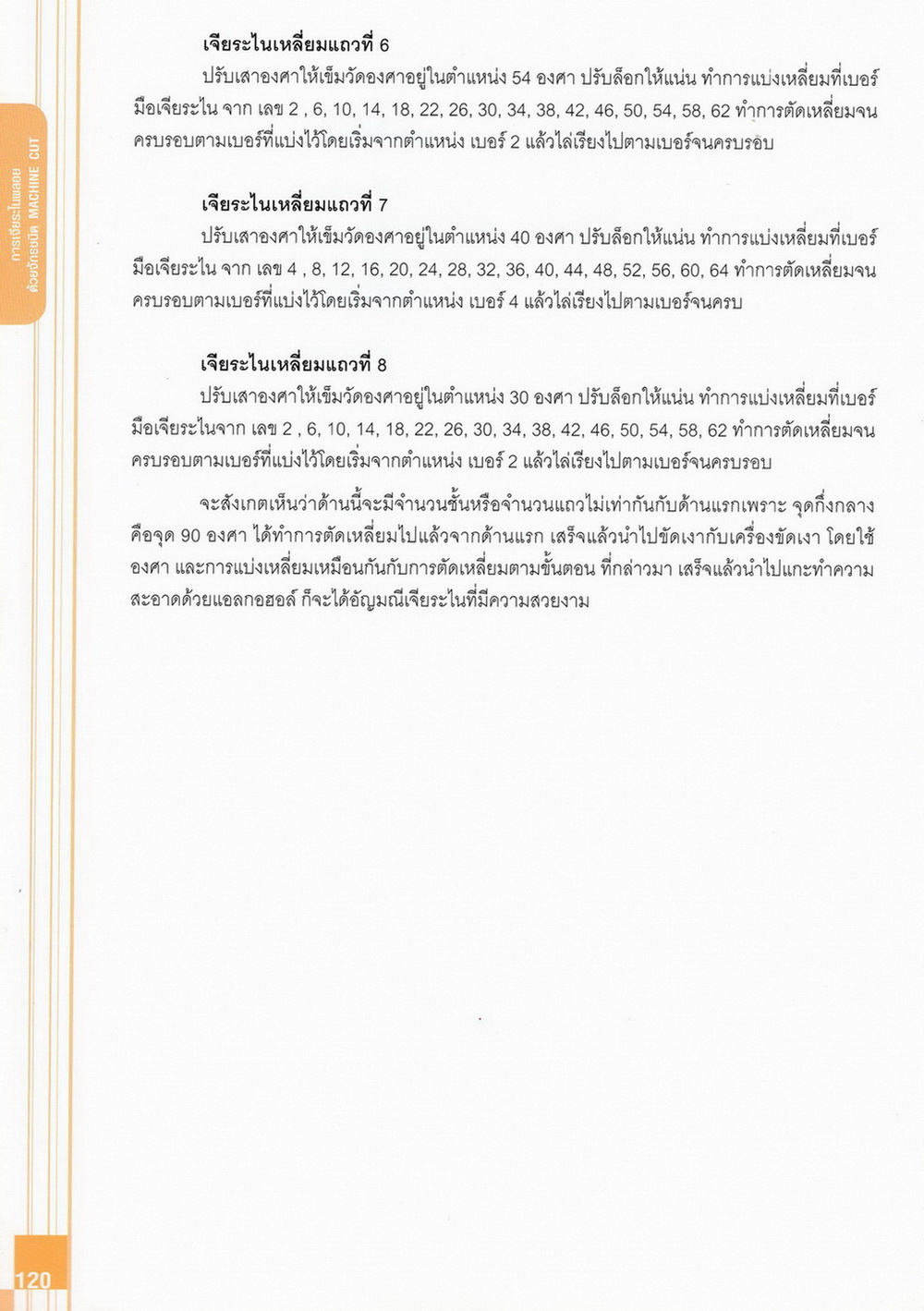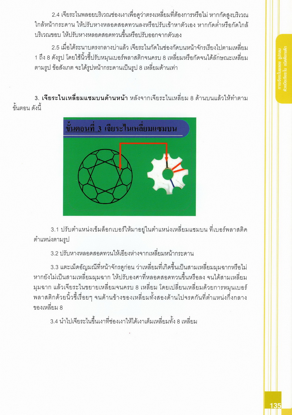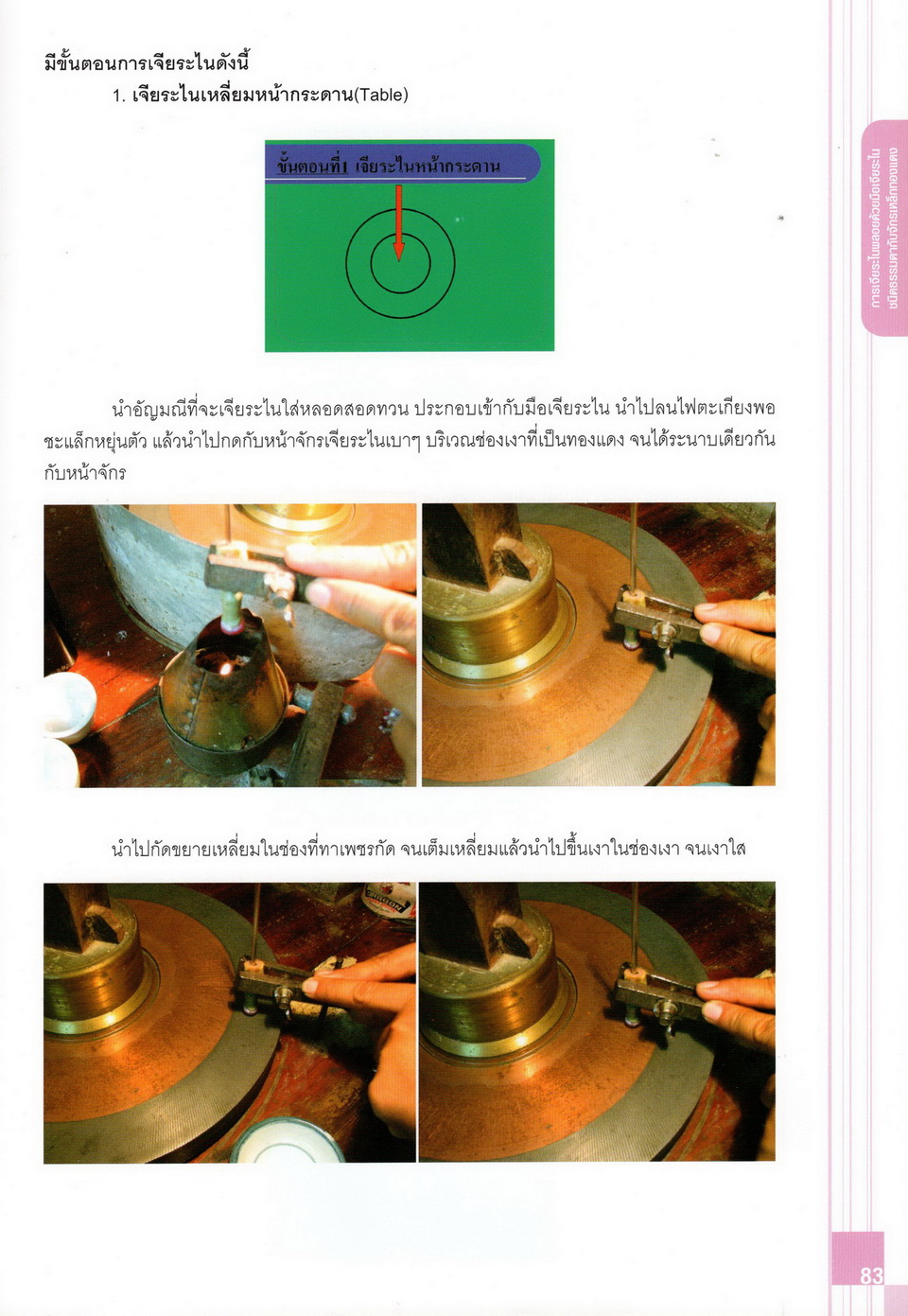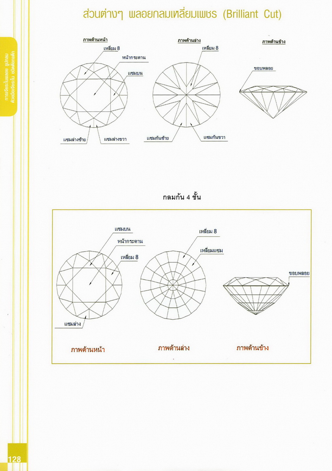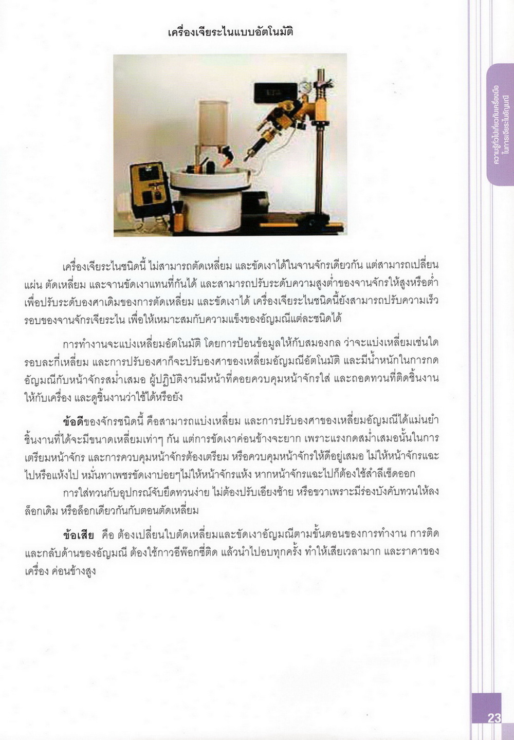 - เนื้อหาแบ่งออกเป็น 14 บท ได้แก่ ความรู้ทั่วไปเกี่ยวกับกระบวนการเจียระไนอัญมณี เครื่องมือชั่ง ตวง วัดในงานเจียระไนพลอย ความรู้ทั่วไปเกี่ยวกับเครื่องมือในการเจียระไนอัญมณี วัสดุอุปกรณ์ที่ใช้ในงานเจียระไนพลอย ความปลอดภัยในการทำงาน การตัดพลอยและการโกนพลอยชนิดต่างๆ การปั้นทวนเพื่อใช้สำหรับแต่งพลอยและการติดกลับพลอย การแต่งอัญมณีรูปทรงต่างๆ การตั้งจักรและการแก้ไขปัญหาเกี่ยวกับจักรเจียระไนอัญมณี การเตรียมหน้าจักรก่อนการเจียระไนและการควบคุมหน้าจักรด้วยเพชรกวาด การเจียระไนพลอยด้วยมือเจียระไนชนิดธรรมดา กับจักรเหล็กทองแดง การเจียระไนพลอยด้วยจักรชนิด การเจียระไนพลอยรูปกลมด้วยมือเจียระไนชนิดต๊อกแต๊ก การทำพลอยหลังเบี้ยและพลอยสตาร์