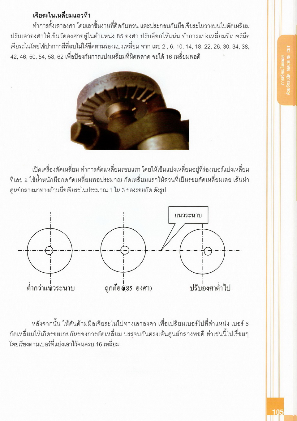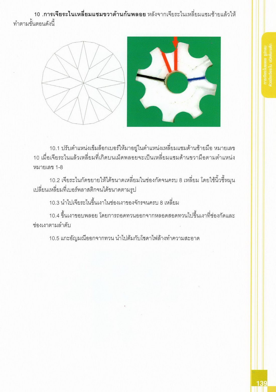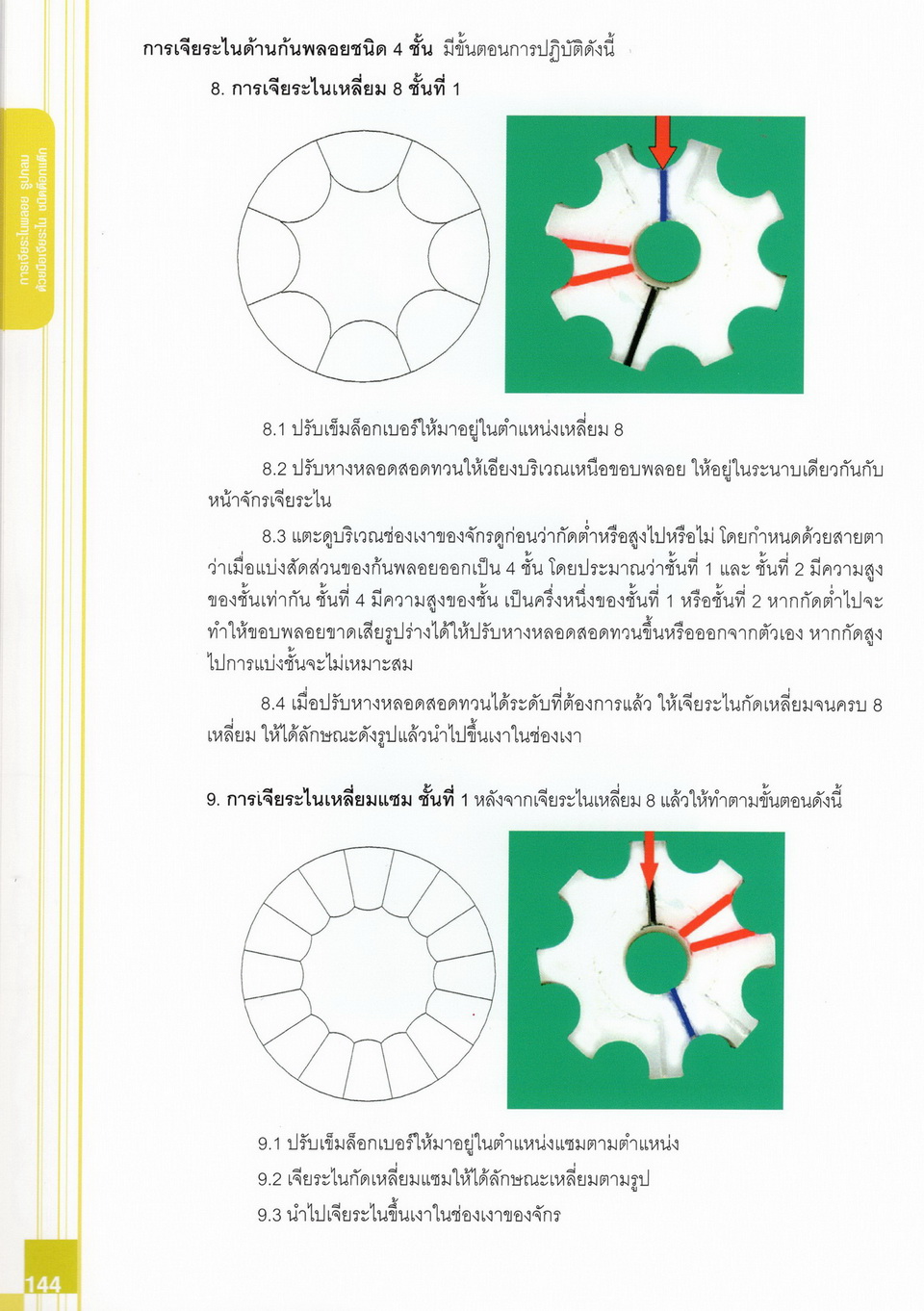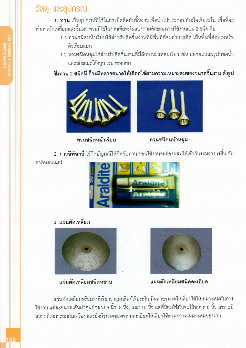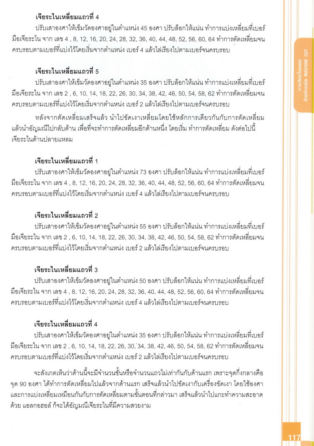 - เนื้อหาแบ่งออกเป็น 14 บท ได้แก่ ความรู้ทั่วไปเกี่ยวกับกระบวนการเจียระไนอัญมณี เครื่องมือชั่ง ตวง วัดในงานเจียระไนพลอย ความรู้ทั่วไปเกี่ยวกับเครื่องมือในการเจียระไนอัญมณี วัสดุอุปกรณ์ที่ใช้ในงานเจียระไนพลอย ความปลอดภัยในการทำงาน การตัดพลอยและการโกนพลอยชนิดต่างๆ การปั้นทวนเพื่อใช้สำหรับแต่งพลอยและการติดกลับพลอย การแต่งอัญมณีรูปทรงต่างๆ การตั้งจักรและการแก้ไขปัญหาเกี่ยวกับจักรเจียระไนอัญมณี การเตรียมหน้าจักรก่อนการเจียระไนและการควบคุมหน้าจักรด้วยเพชรกวาด การเจียระไนพลอยด้วยมือเจียระไนชนิดธรรมดา กับจักรเหล็กทองแดง การเจียระไนพลอยด้วยจักรชนิด การเจียระไนพลอยรูปกลมด้วยมือเจียระไนชนิดต๊อกแต๊ก การทำพลอยหลังเบี้ยและพลอยสตาร์