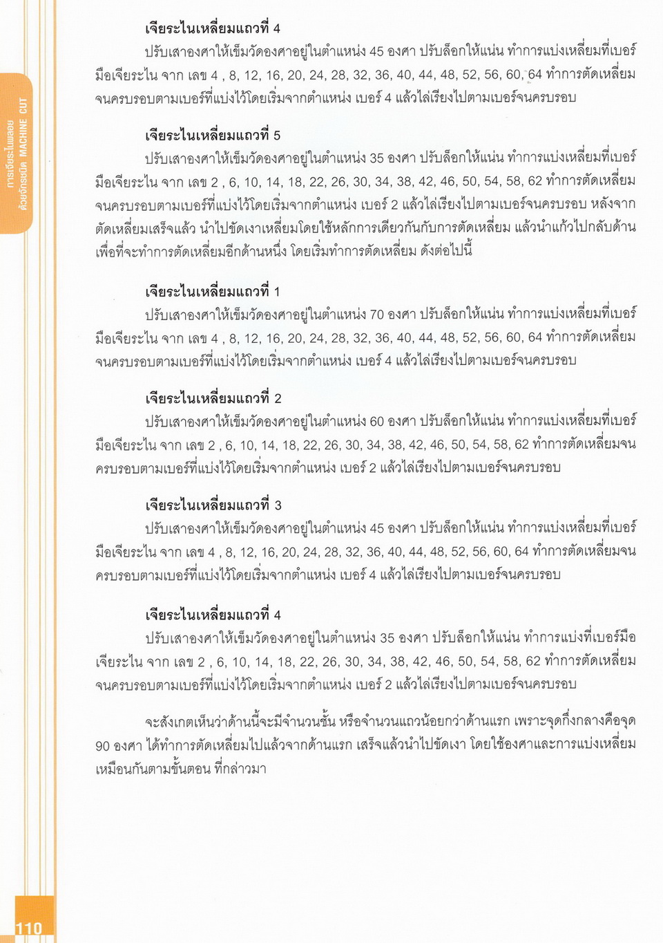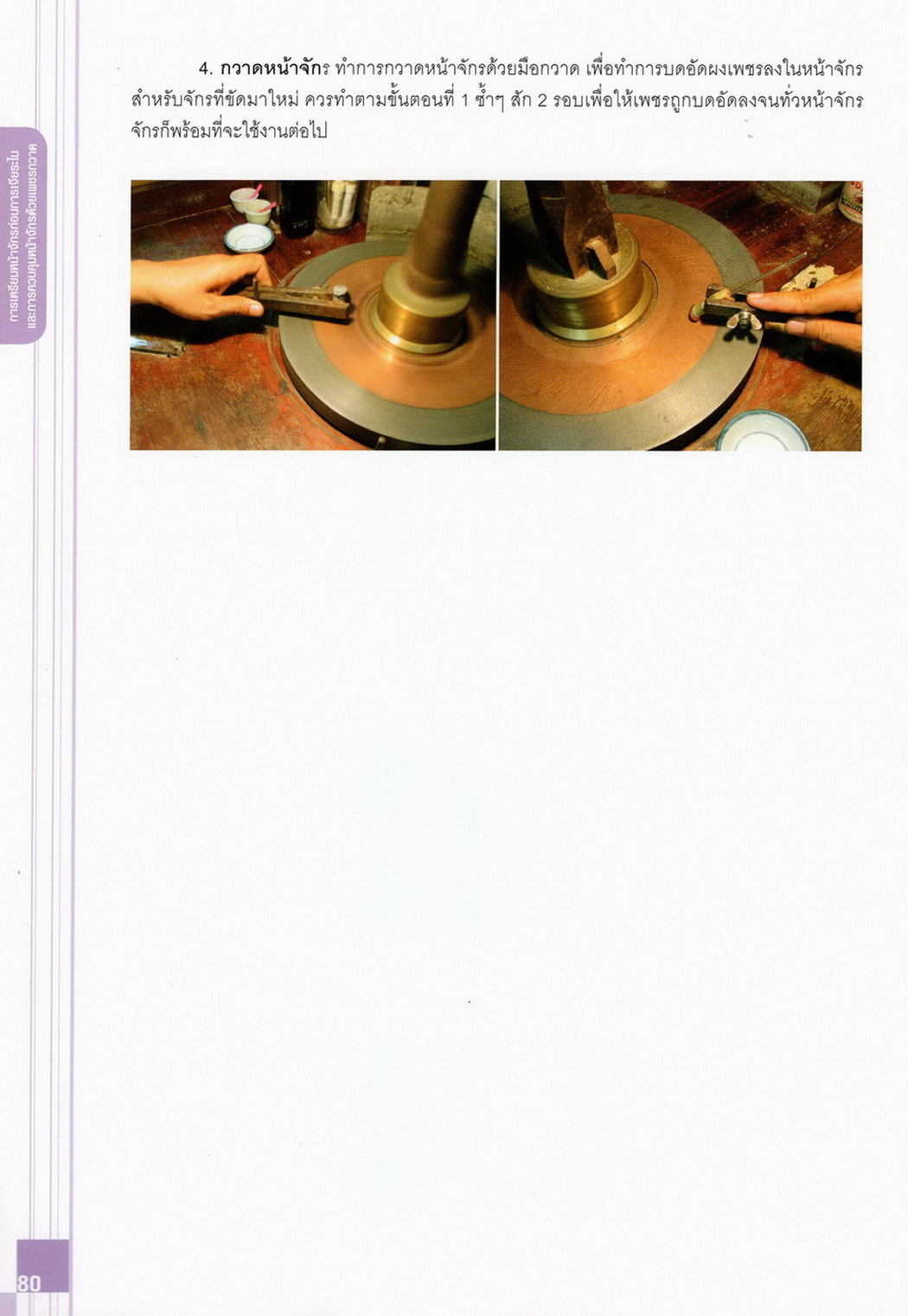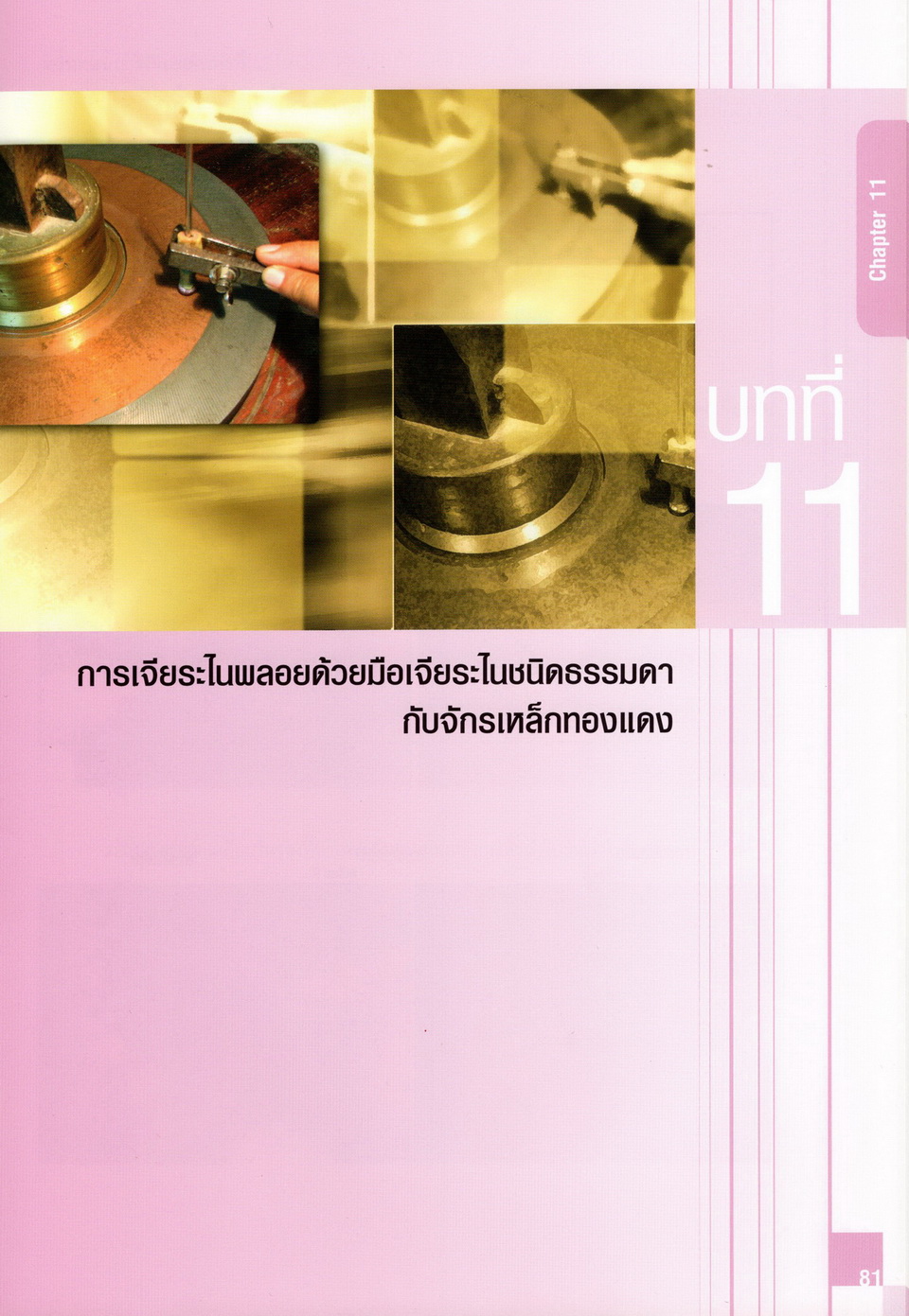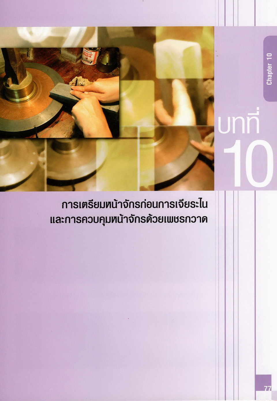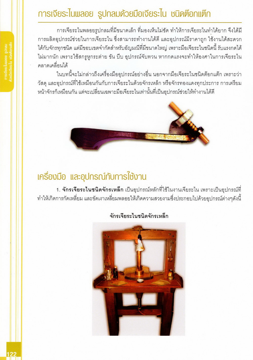 - เนื้อหาแบ่งออกเป็น 14 บท ได้แก่ ความรู้ทั่วไปเกี่ยวกับกระบวนการเจียระไนอัญมณี เครื่องมือชั่ง ตวง วัดในงานเจียระไนพลอย ความรู้ทั่วไปเกี่ยวกับเครื่องมือในการเจียระไนอัญมณี วัสดุอุปกรณ์ที่ใช้ในงานเจียระไนพลอย ความปลอดภัยในการทำงาน การตัดพลอยและการโกนพลอยชนิดต่างๆ การปั้นทวนเพื่อใช้สำหรับแต่งพลอยและการติดกลับพลอย การแต่งอัญมณีรูปทรงต่างๆ การตั้งจักรและการแก้ไขปัญหาเกี่ยวกับจักรเจียระไนอัญมณี การเตรียมหน้าจักรก่อนการเจียระไนและการควบคุมหน้าจักรด้วยเพชรกวาด การเจียระไนพลอยด้วยมือเจียระไนชนิดธรรมดา กับจักรเหล็กทองแดง การเจียระไนพลอยด้วยจักรชนิด การเจียระไนพลอยรูปกลมด้วยมือเจียระไนชนิดต๊อกแต๊ก การทำพลอยหลังเบี้ยและพลอยสตาร์