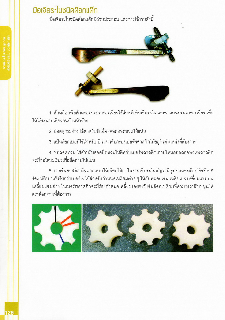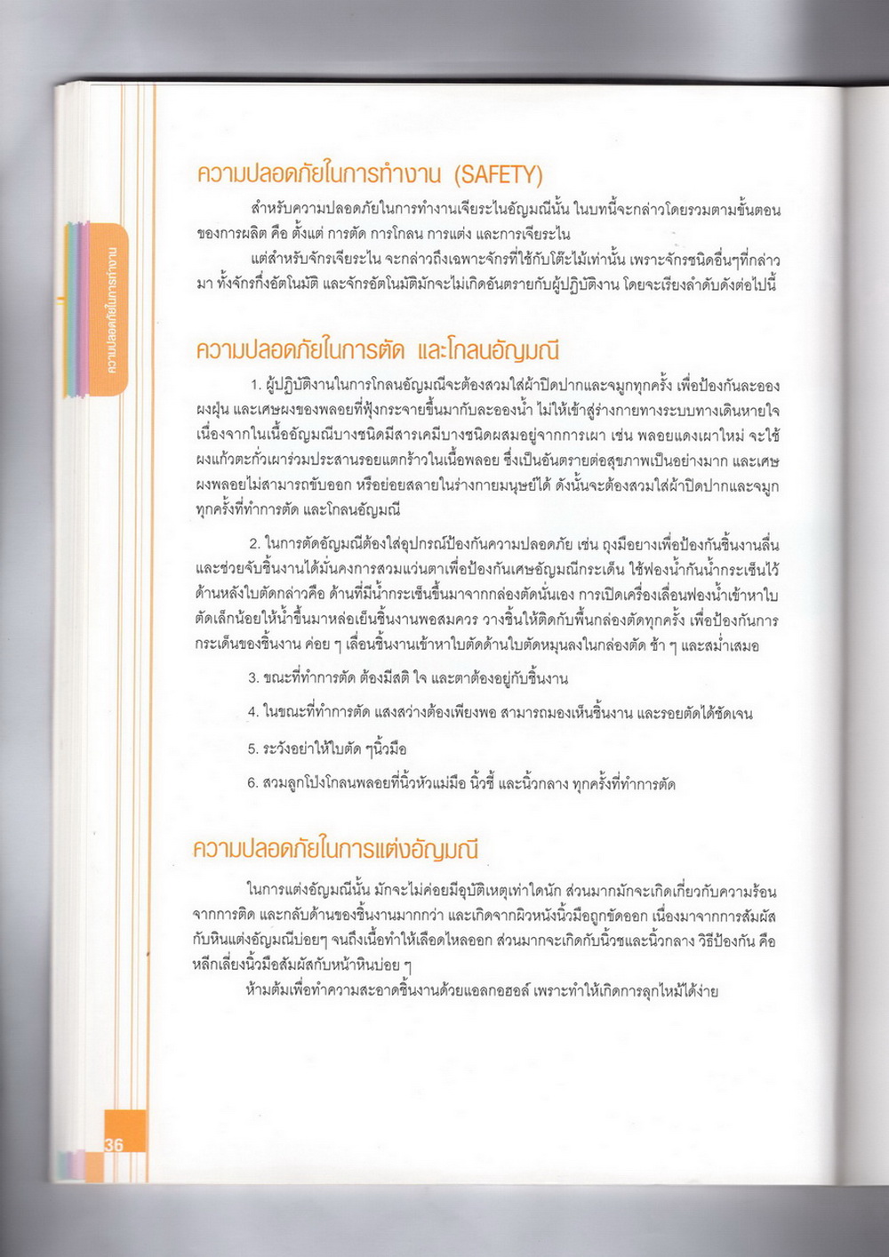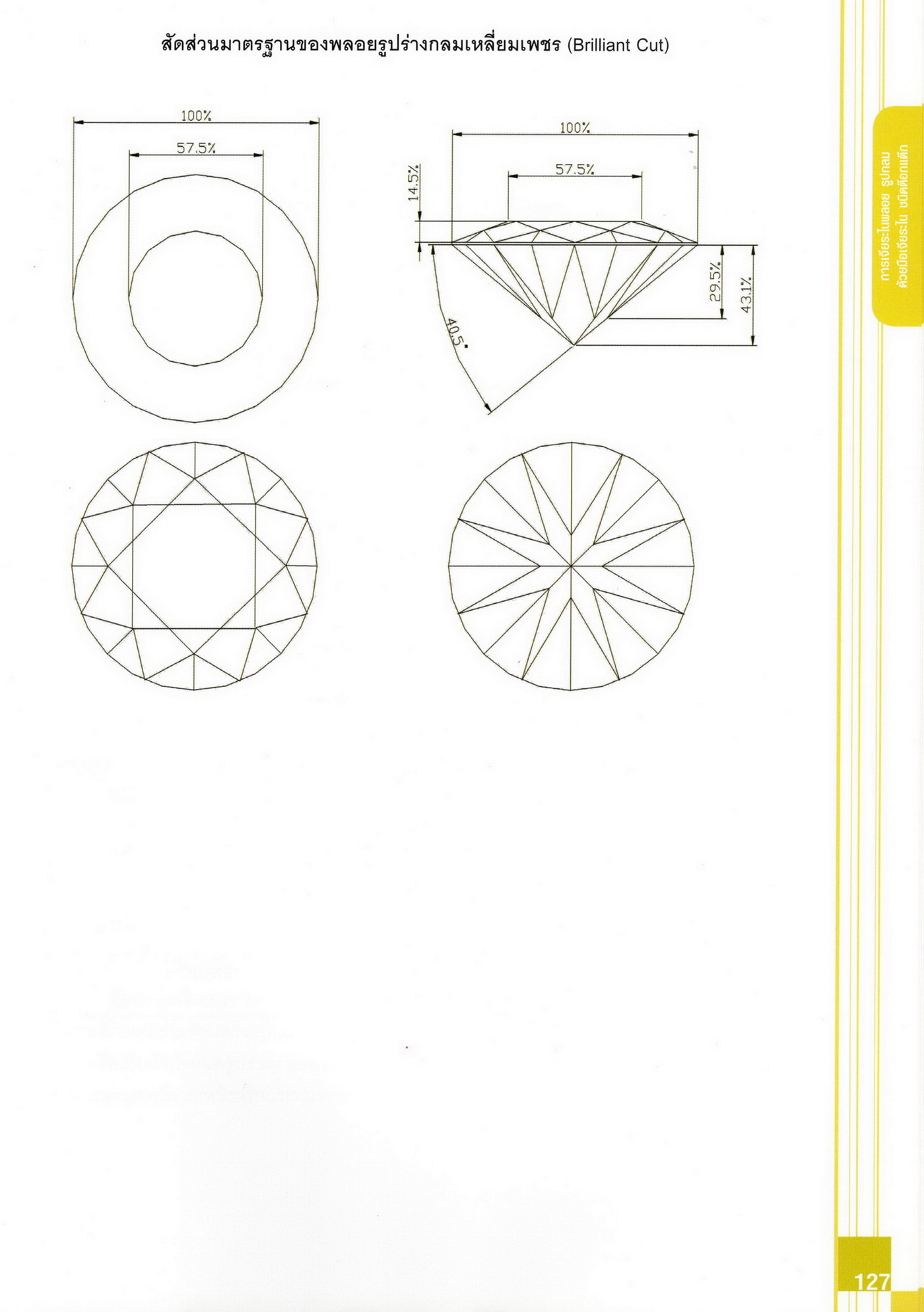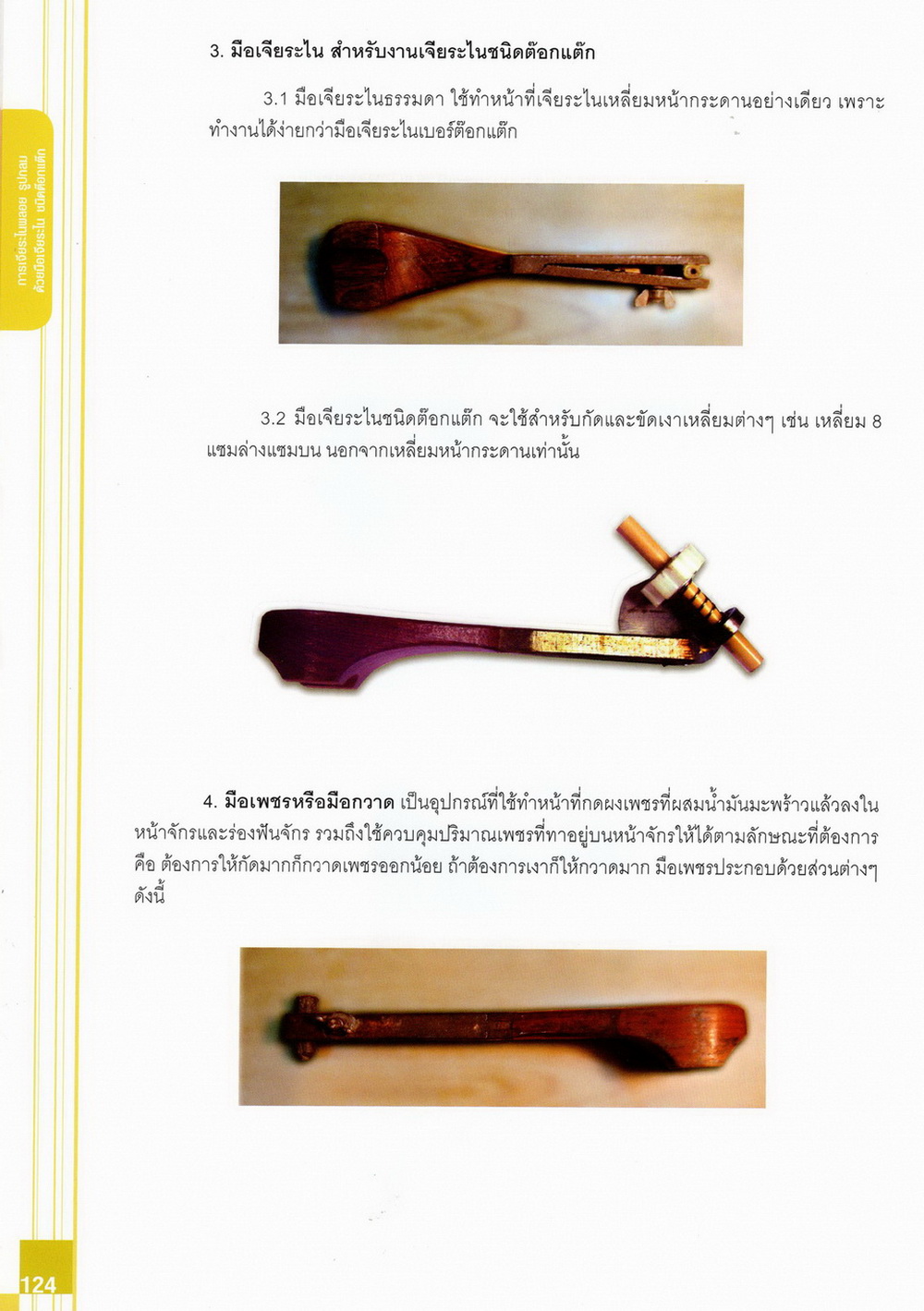 - เนื้อหาแบ่งออกเป็น 14 บท ได้แก่ ความรู้ทั่วไปเกี่ยวกับกระบวนการเจียระไนอัญมณี เครื่องมือชั่ง ตวง วัดในงานเจียระไนพลอย ความรู้ทั่วไปเกี่ยวกับเครื่องมือในการเจียระไนอัญมณี วัสดุอุปกรณ์ที่ใช้ในงานเจียระไนพลอย ความปลอดภัยในการทำงาน การตัดพลอยและการโกนพลอยชนิดต่างๆ การปั้นทวนเพื่อใช้สำหรับแต่งพลอยและการติดกลับพลอย การแต่งอัญมณีรูปทรงต่างๆ การตั้งจักรและการแก้ไขปัญหาเกี่ยวกับจักรเจียระไนอัญมณี การเตรียมหน้าจักรก่อนการเจียระไนและการควบคุมหน้าจักรด้วยเพชรกวาด การเจียระไนพลอยด้วยมือเจียระไนชนิดธรรมดา กับจักรเหล็กทองแดง การเจียระไนพลอยด้วยจักรชนิด การเจียระไนพลอยรูปกลมด้วยมือเจียระไนชนิดต๊อกแต๊ก การทำพลอยหลังเบี้ยและพลอยสตาร์