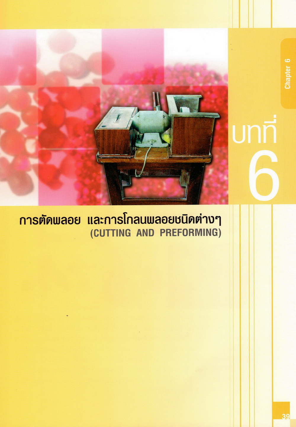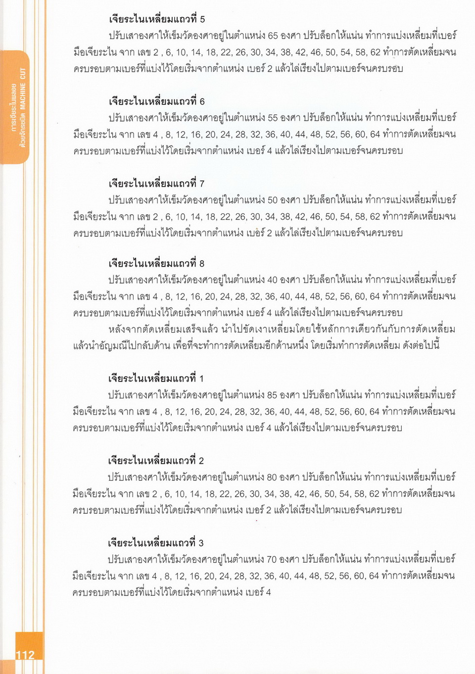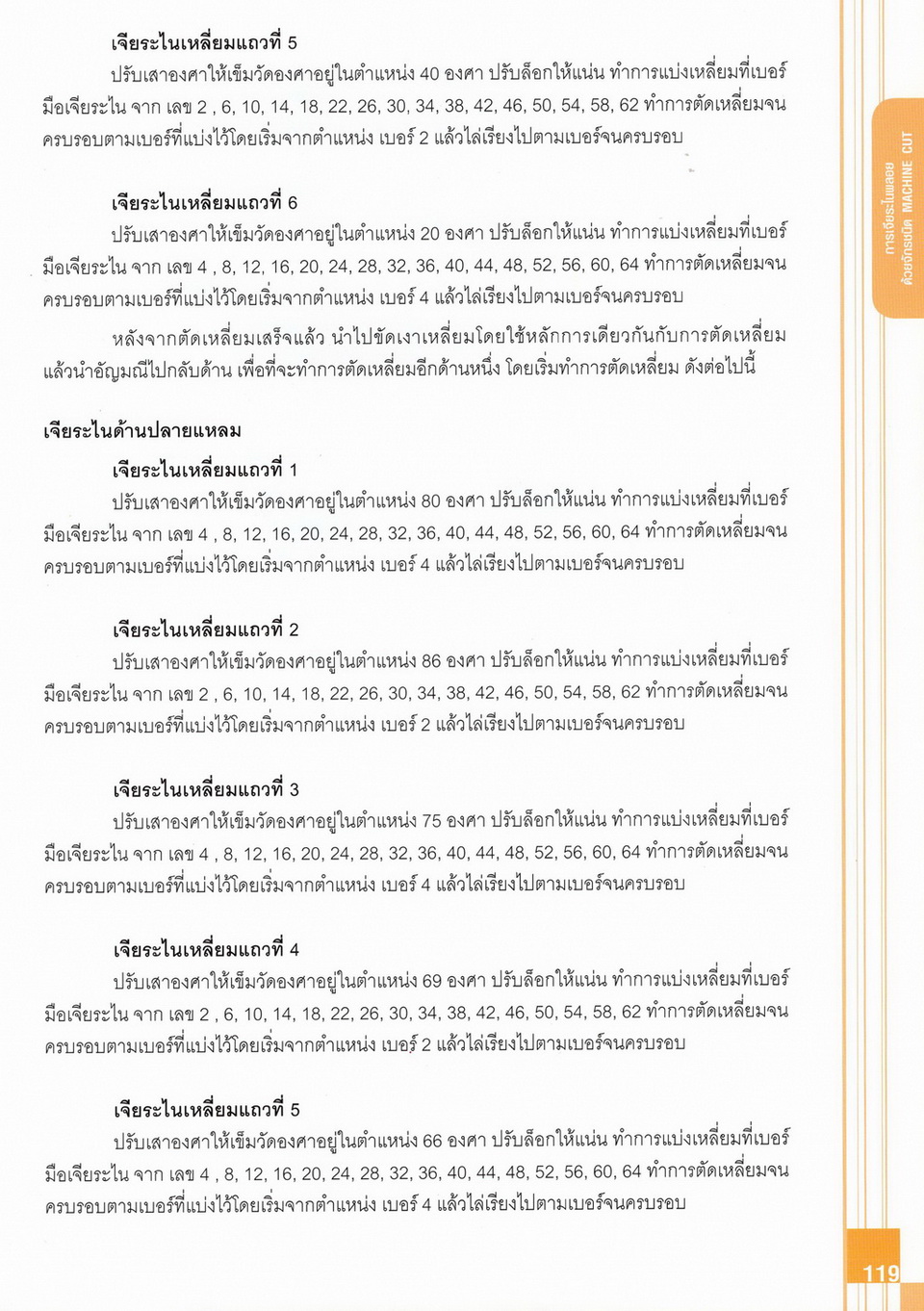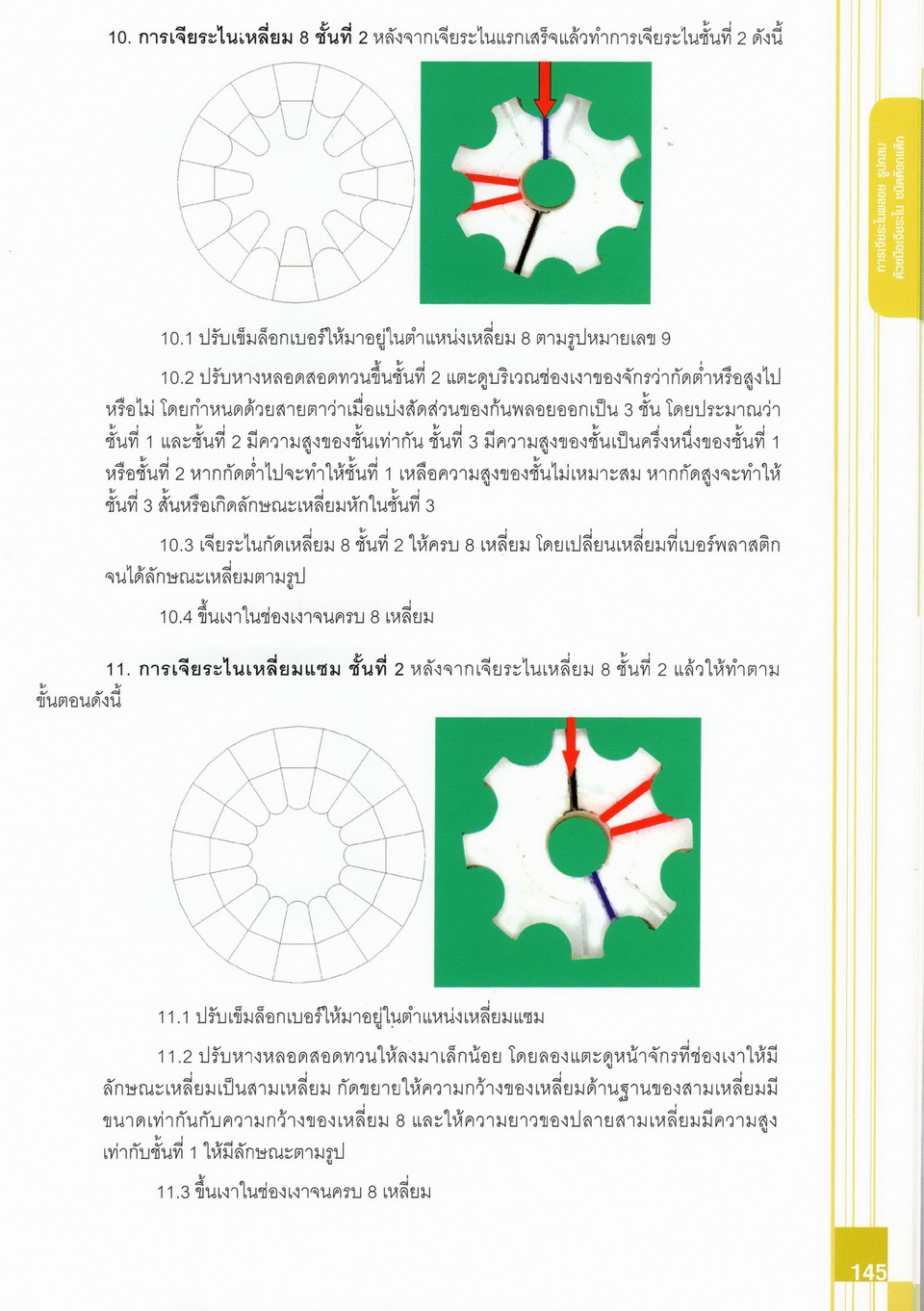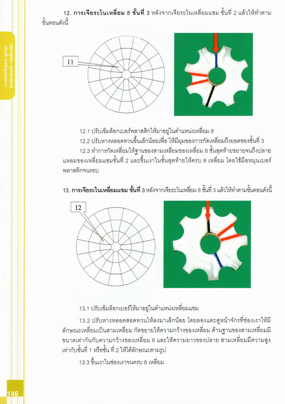 - เนื้อหาแบ่งออกเป็น 14 บท ได้แก่ ความรู้ทั่วไปเกี่ยวกับกระบวนการเจียระไนอัญมณี เครื่องมือชั่ง ตวง วัดในงานเจียระไนพลอย ความรู้ทั่วไปเกี่ยวกับเครื่องมือในการเจียระไนอัญมณี วัสดุอุปกรณ์ที่ใช้ในงานเจียระไนพลอย ความปลอดภัยในการทำงาน การตัดพลอยและการโกนพลอยชนิดต่างๆ การปั้นทวนเพื่อใช้สำหรับแต่งพลอยและการติดกลับพลอย การแต่งอัญมณีรูปทรงต่างๆ การตั้งจักรและการแก้ไขปัญหาเกี่ยวกับจักรเจียระไนอัญมณี การเตรียมหน้าจักรก่อนการเจียระไนและการควบคุมหน้าจักรด้วยเพชรกวาด การเจียระไนพลอยด้วยมือเจียระไนชนิดธรรมดา กับจักรเหล็กทองแดง การเจียระไนพลอยด้วยจักรชนิด การเจียระไนพลอยรูปกลมด้วยมือเจียระไนชนิดต๊อกแต๊ก การทำพลอยหลังเบี้ยและพลอยสตาร์