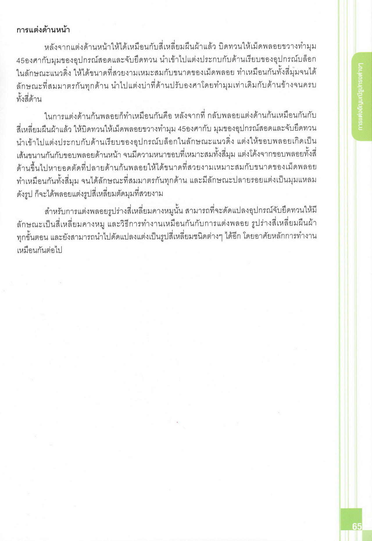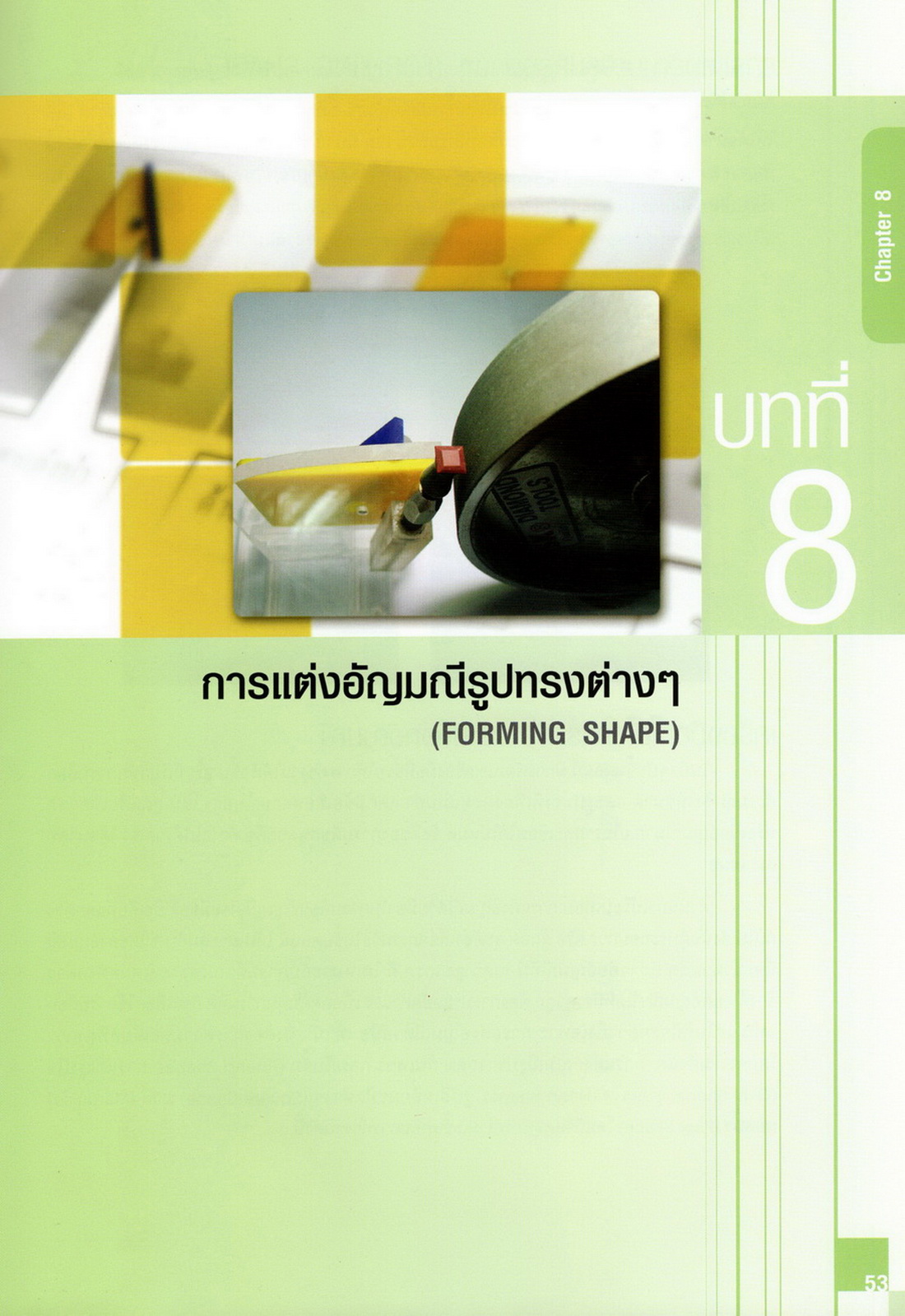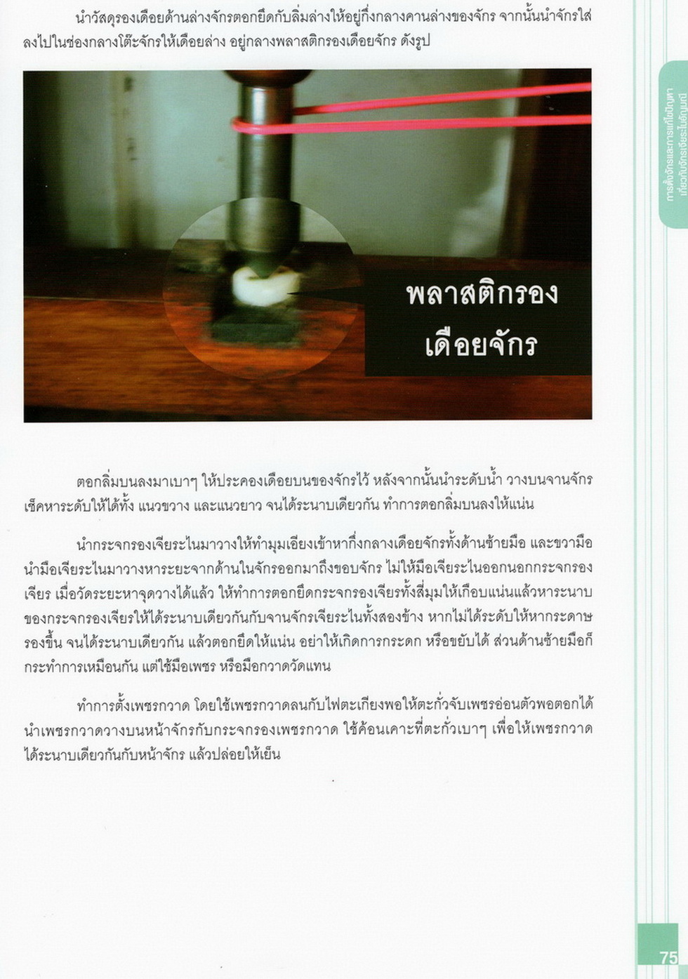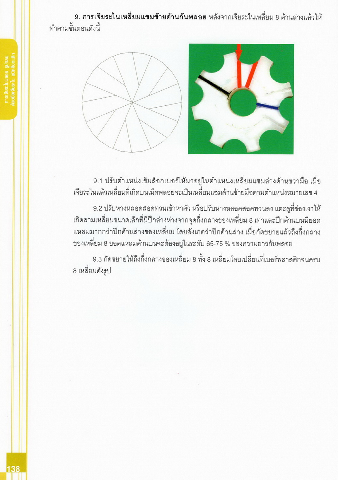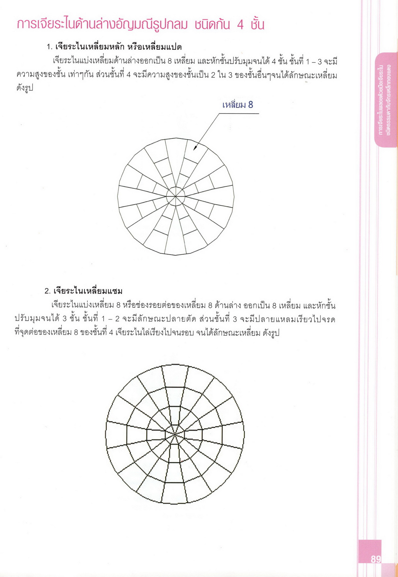 - เนื้อหาแบ่งออกเป็น 14 บท ได้แก่ ความรู้ทั่วไปเกี่ยวกับกระบวนการเจียระไนอัญมณี เครื่องมือชั่ง ตวง วัดในงานเจียระไนพลอย ความรู้ทั่วไปเกี่ยวกับเครื่องมือในการเจียระไนอัญมณี วัสดุอุปกรณ์ที่ใช้ในงานเจียระไนพลอย ความปลอดภัยในการทำงาน การตัดพลอยและการโกนพลอยชนิดต่างๆ การปั้นทวนเพื่อใช้สำหรับแต่งพลอยและการติดกลับพลอย การแต่งอัญมณีรูปทรงต่างๆ การตั้งจักรและการแก้ไขปัญหาเกี่ยวกับจักรเจียระไนอัญมณี การเตรียมหน้าจักรก่อนการเจียระไนและการควบคุมหน้าจักรด้วยเพชรกวาด การเจียระไนพลอยด้วยมือเจียระไนชนิดธรรมดา กับจักรเหล็กทองแดง การเจียระไนพลอยด้วยจักรชนิด การเจียระไนพลอยรูปกลมด้วยมือเจียระไนชนิดต๊อกแต๊ก การทำพลอยหลังเบี้ยและพลอยสตาร์