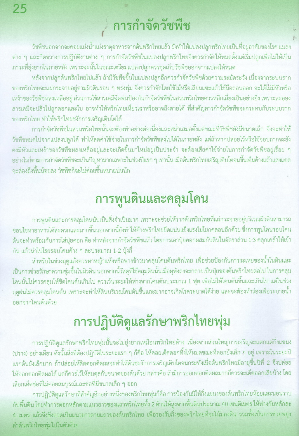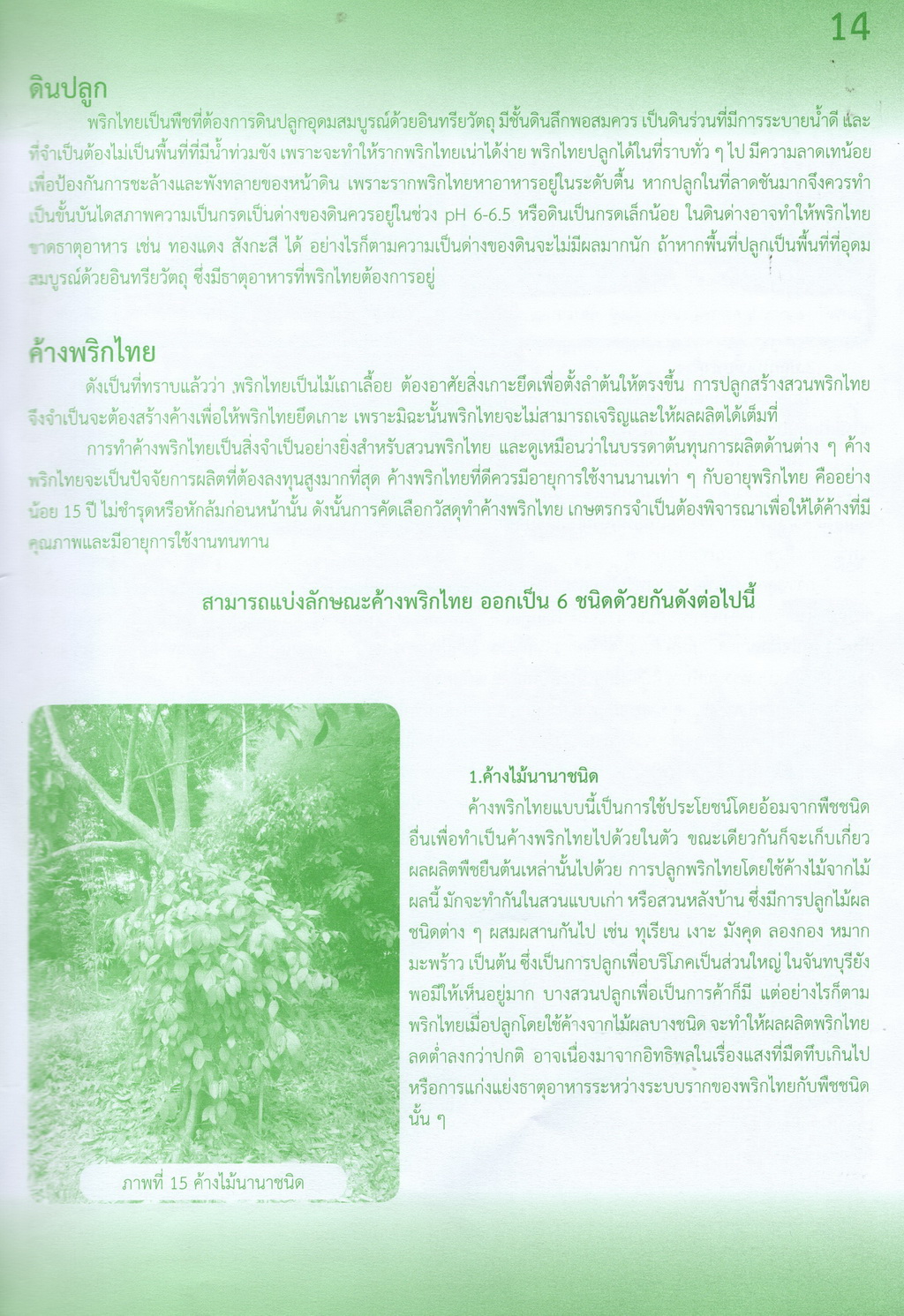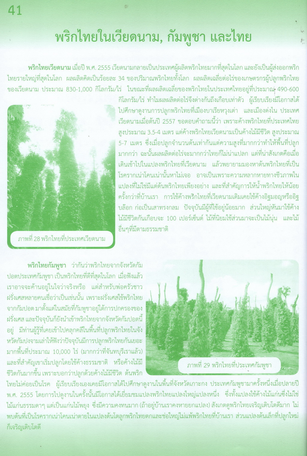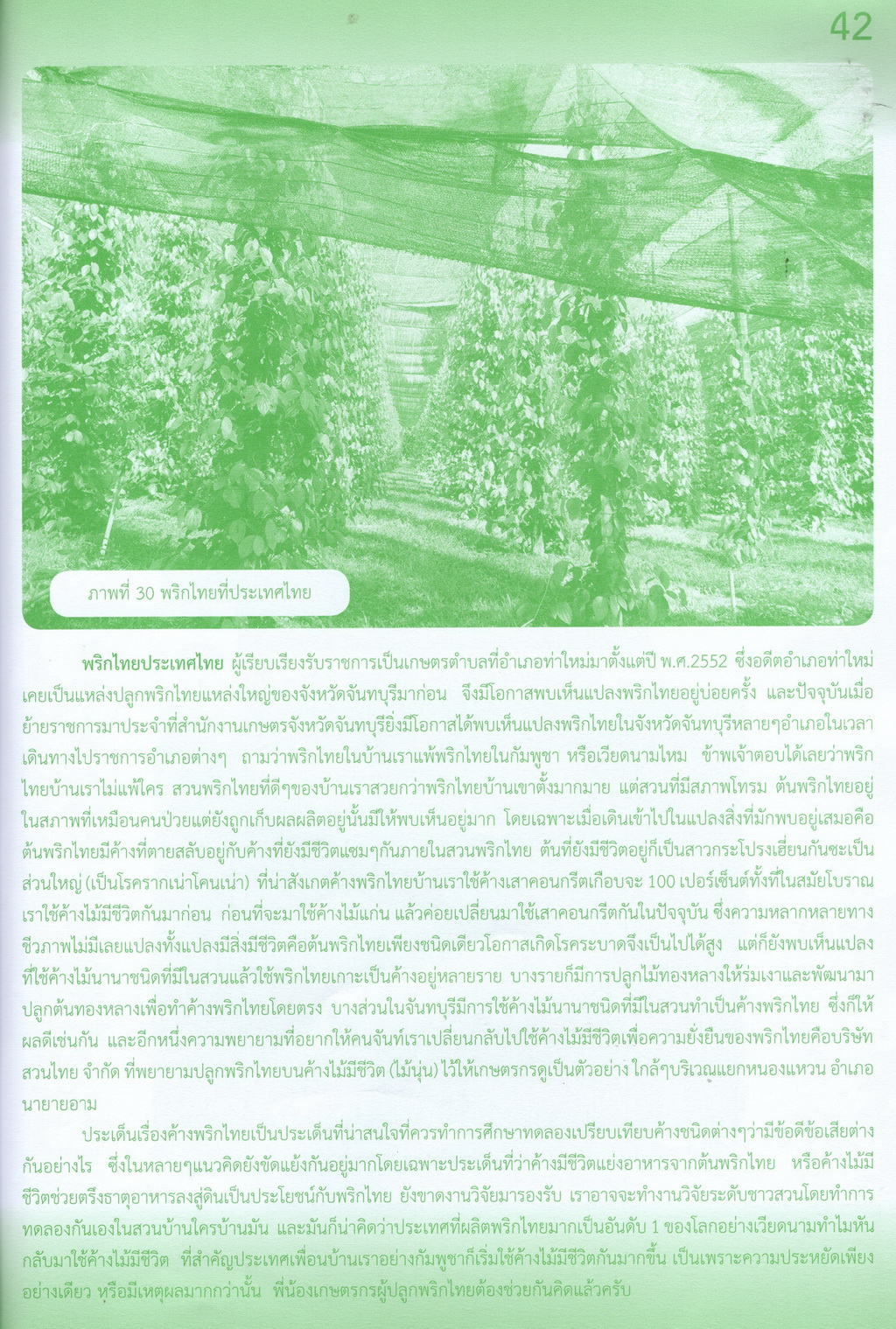 - เป็นเรื่องราวรายละเอียดของพริกไทยครบทุกด้าน ได้แก่ ลักษณะทางพฤกษศาสตร์ของพริกไทย พันธุ์พริกไทย การขยายพันธุ์ ภูมิอากาศที่เหมาะสมกับการปลูกพริกไทย ค้างพริกไทย การเตรียมพื้นที่และหลุมปลูก การปลูกพริกไทย การเลี้ยงเถาและผูกเถาพริกไทย การดูแลรักษาและตัดแต่ง การให้ปุ๋ย การให้น้ำ การกำจัดวัชพืช การพูนดินและคลุมโคน การดูแลพริกไทยพุ่ม การออกดอกและติดผล การเก็บเกี่ยวผลผลิต การกำจัดแมลงศัตรูพริกไทย โรคพริกไทย องค์ความรู้การผลิตพริกไทยในจันทบุรี พริกไทยในเวียดนาม กัมพูชา และไทย