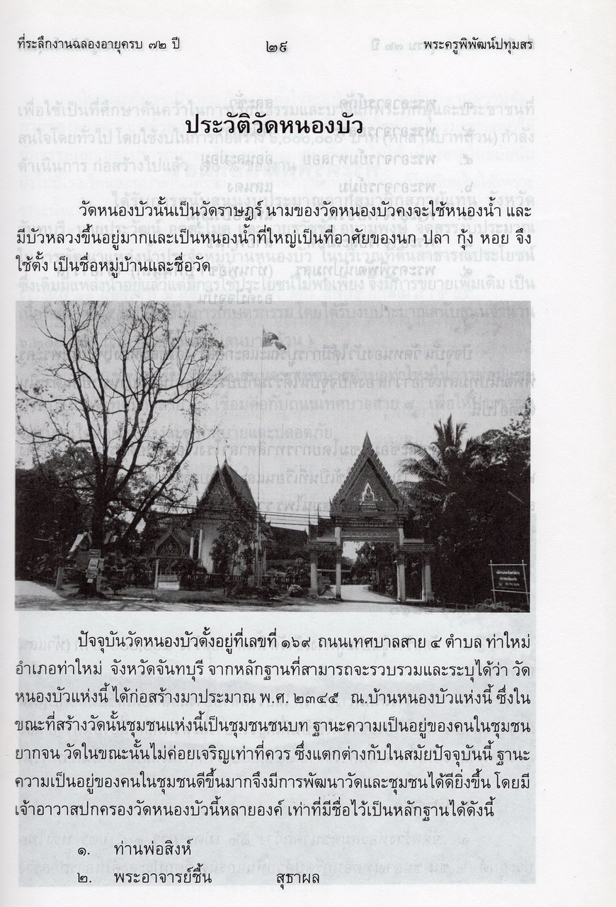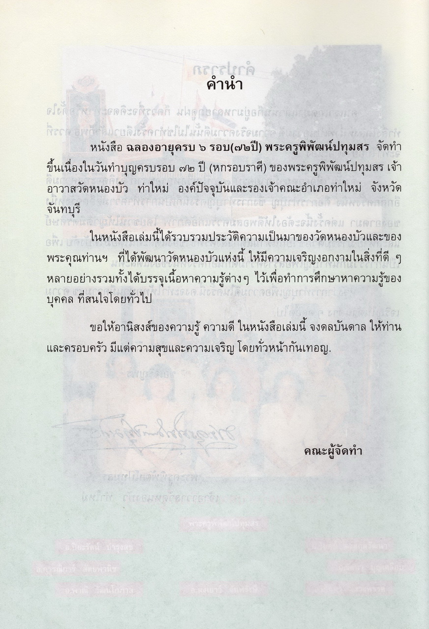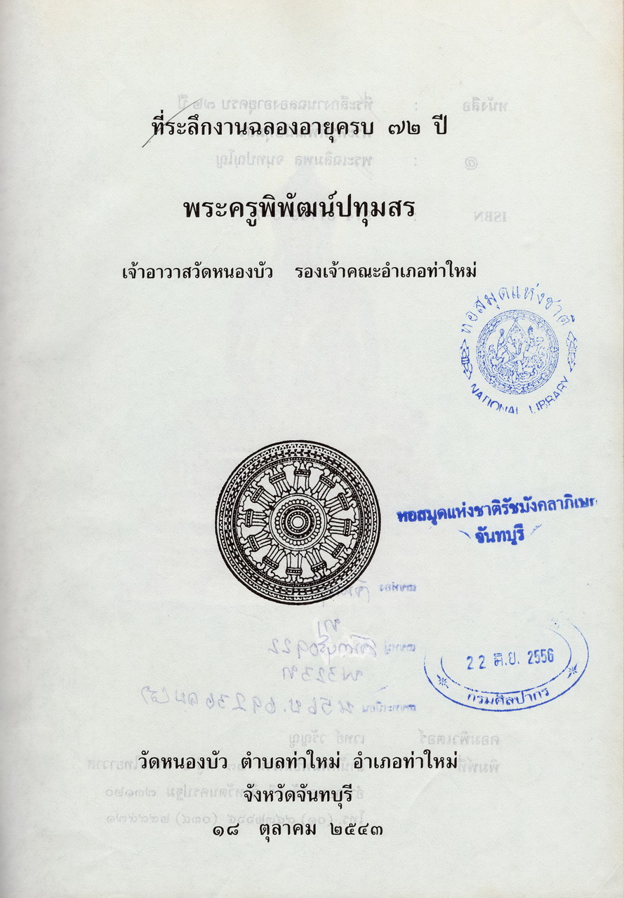 - ที่ระลึกงานฉลองอายุครบ 72 ปี พระครูพิพัฒน์ปทุมสร เจ้าอาวาสวัดหนองบัว รองเจ้าคณะอำเภอท่าใหม่ ตำบลท่าใหม่ จังหวัดสระบุรี 18 ตุลาคม 2543