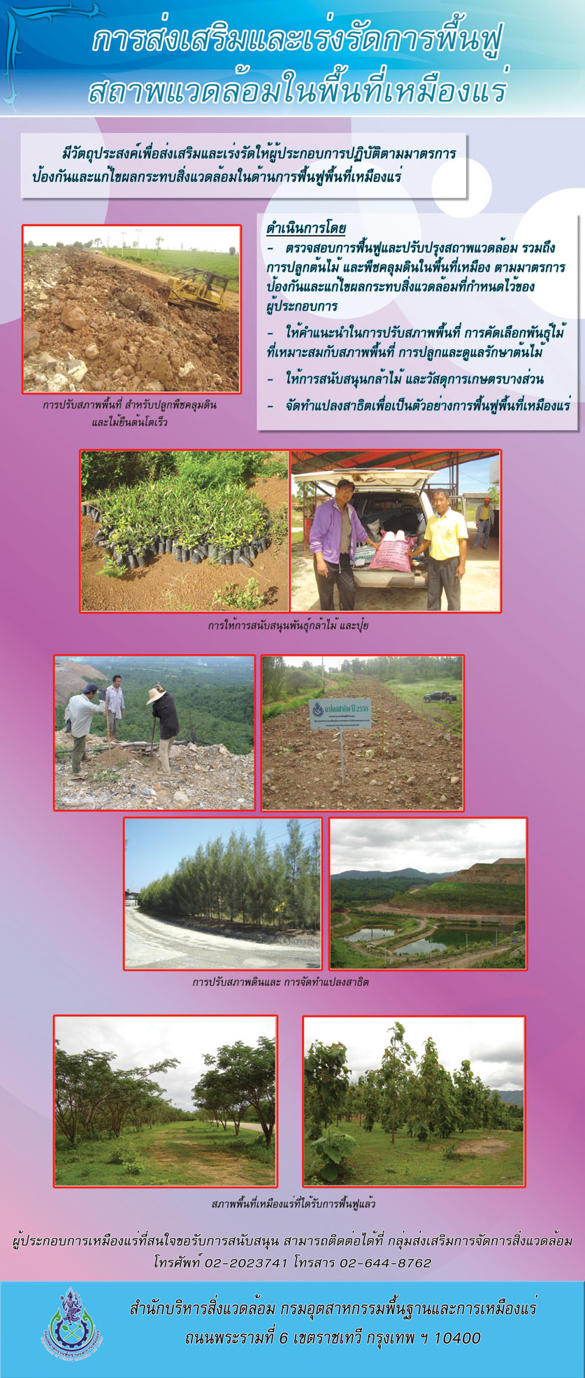 - การส่งเสริมและเร่งรัดการฟื้นฟูสภาพแวดล้อมในพื้นที่เหมืองแร่